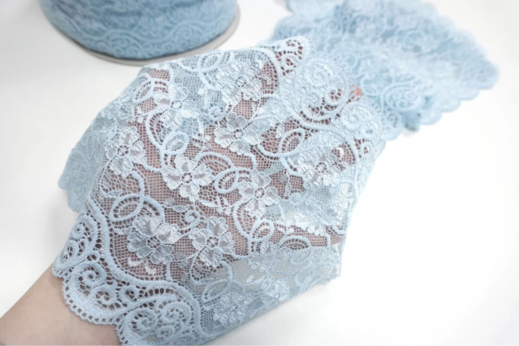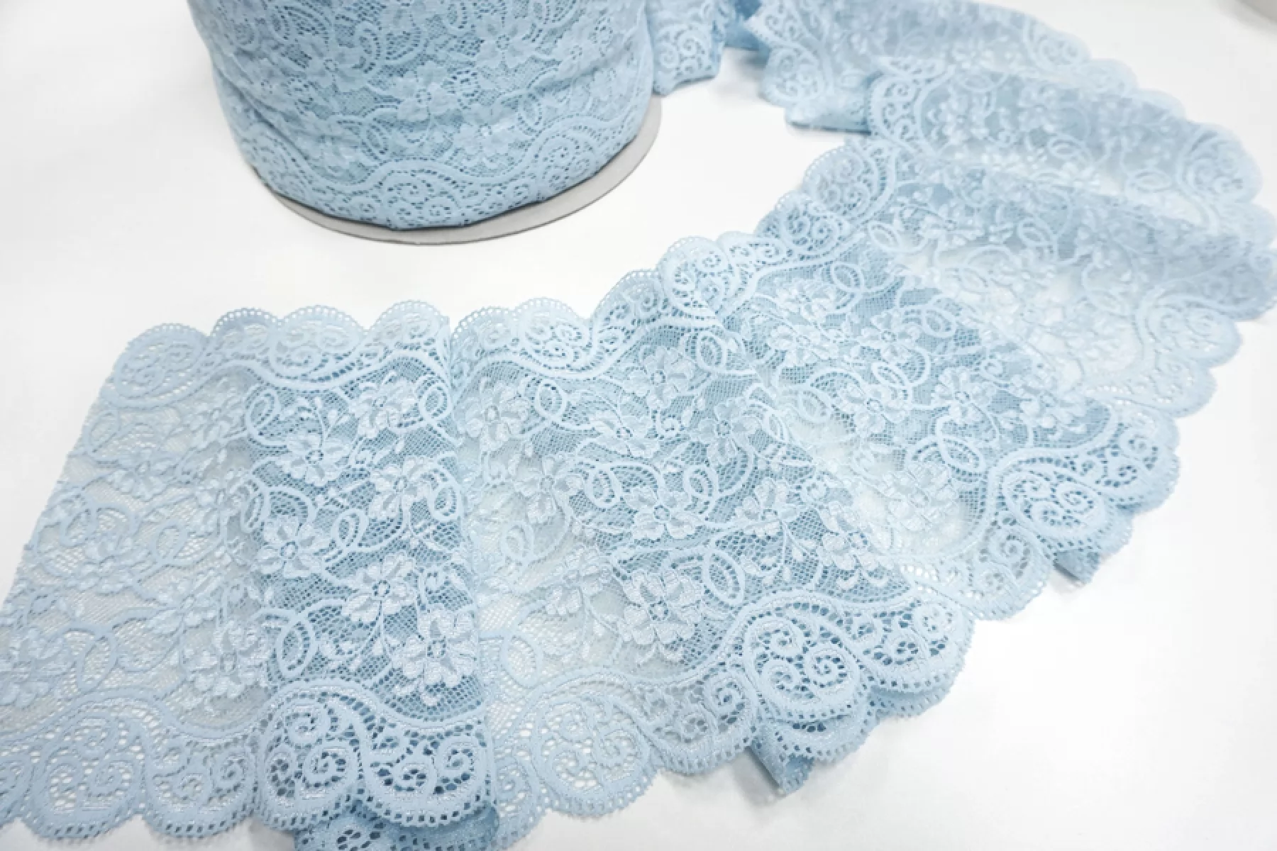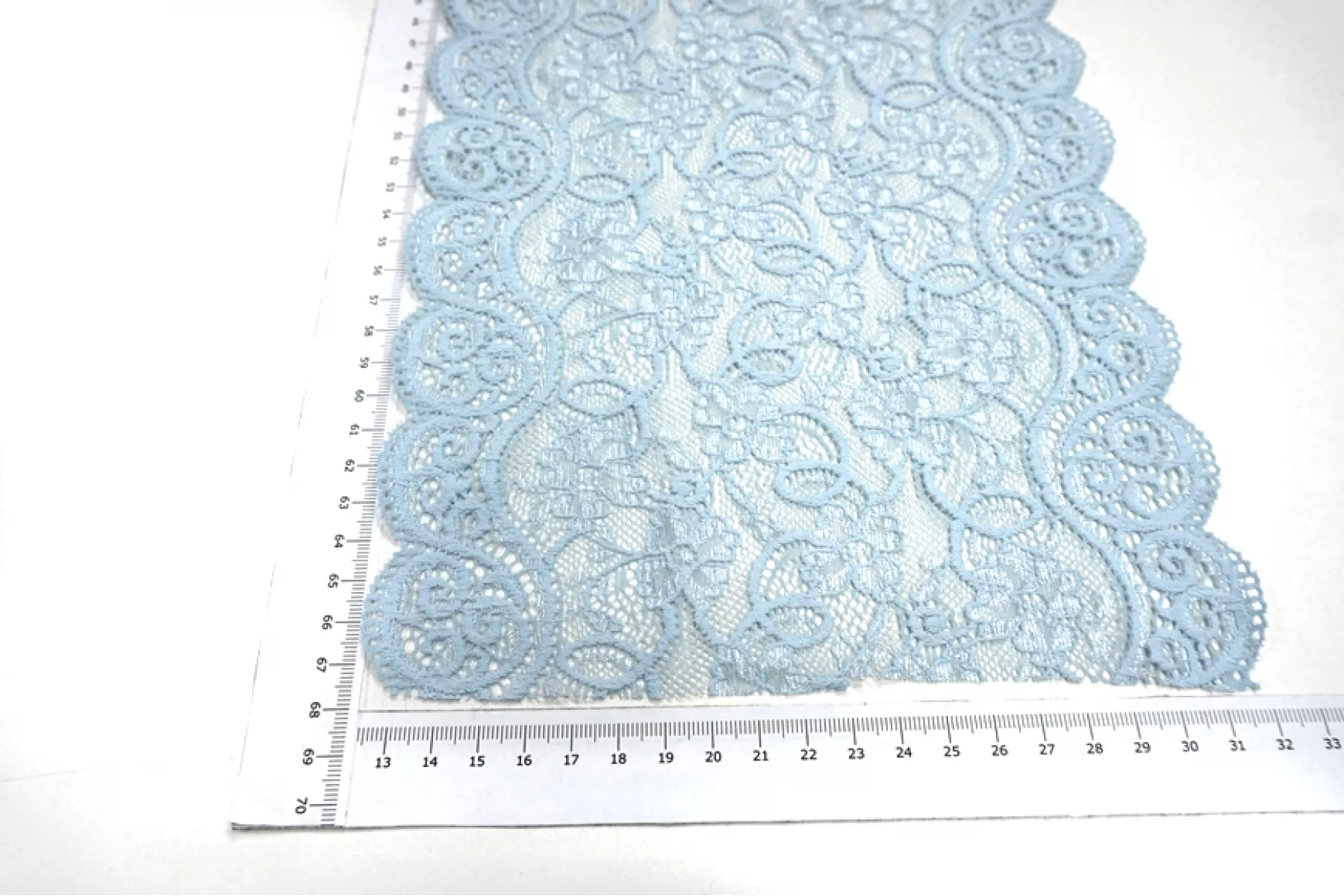 Итальянское кружево бледно-василькового цвета. Мягкое, пластичное. Отлично подойдет для пошива нижнего белья, отделки одежды и аксессуаров.
