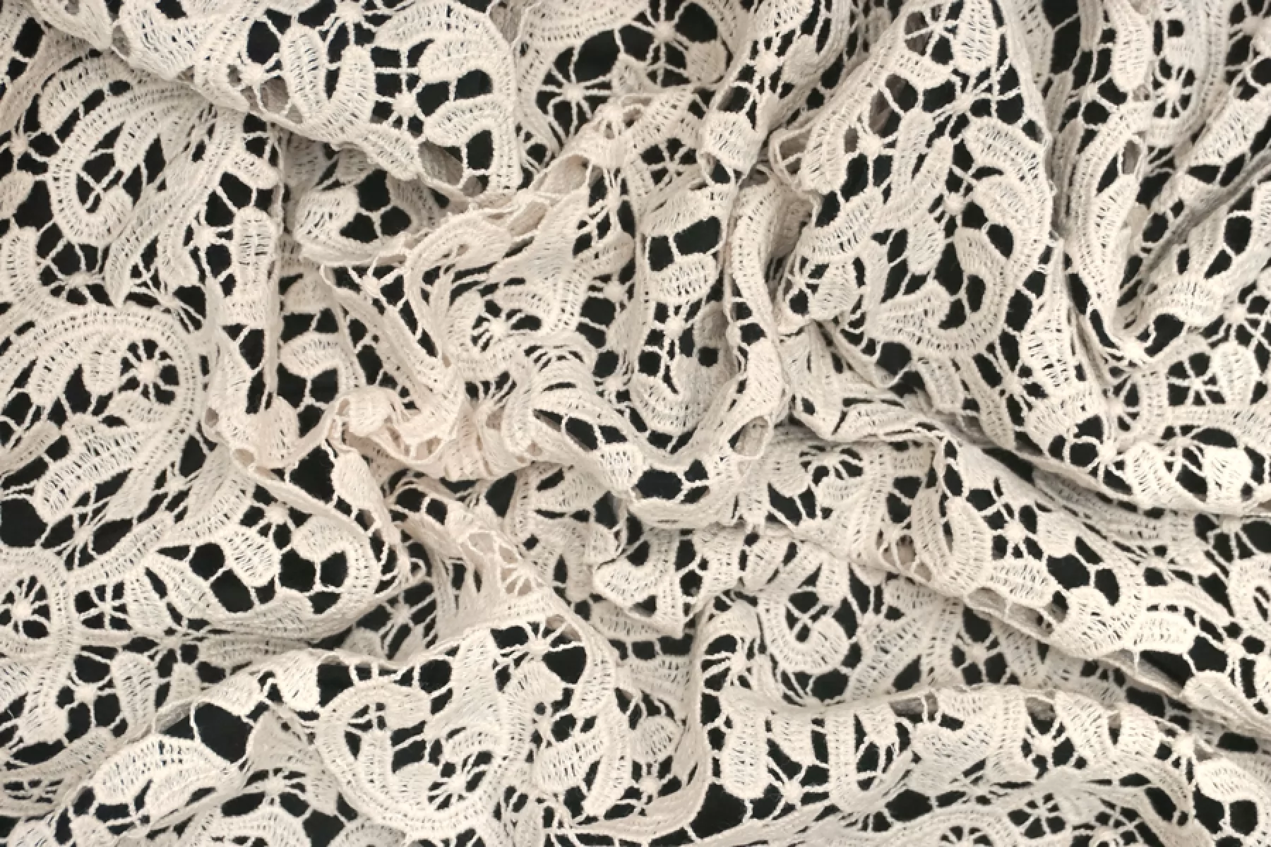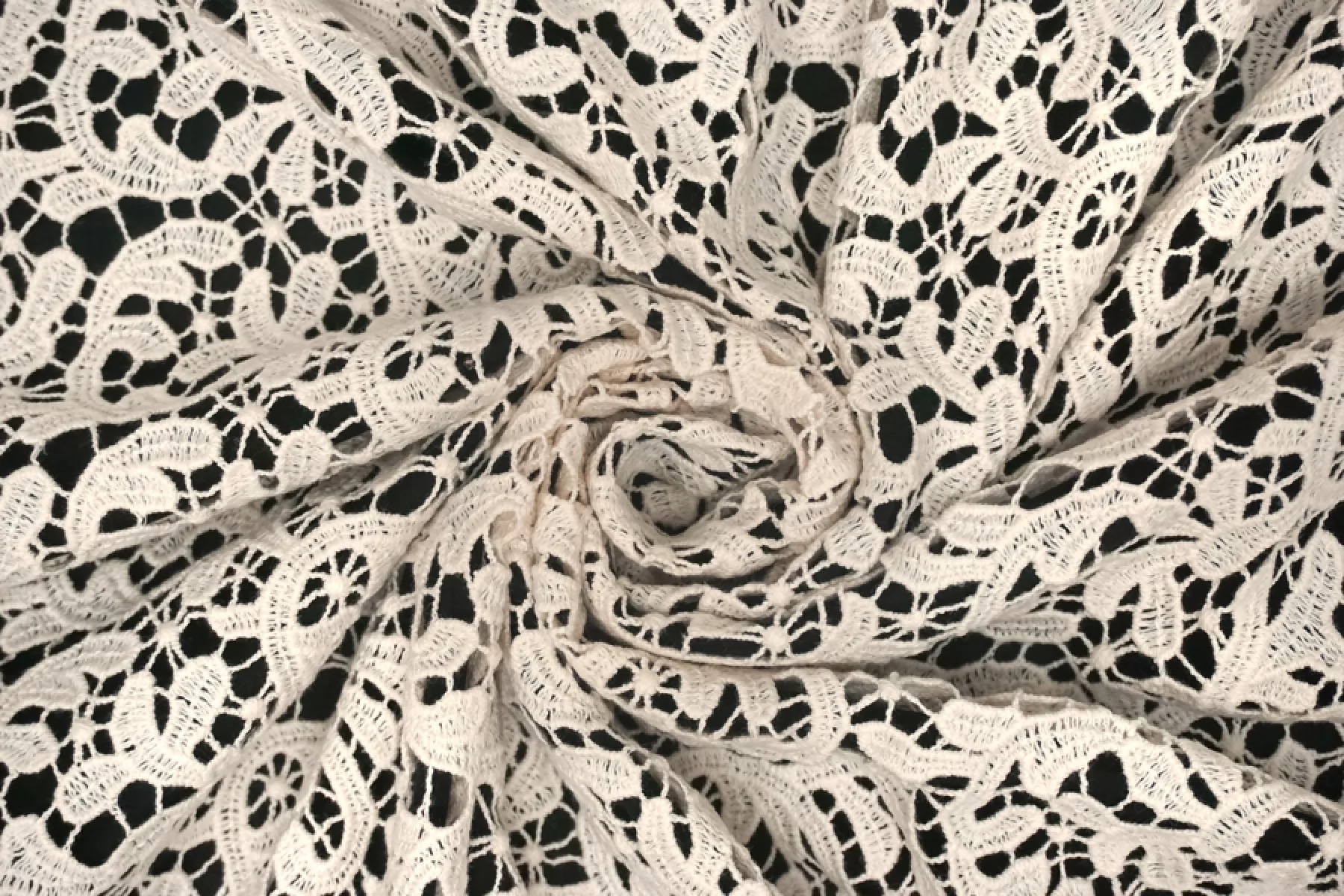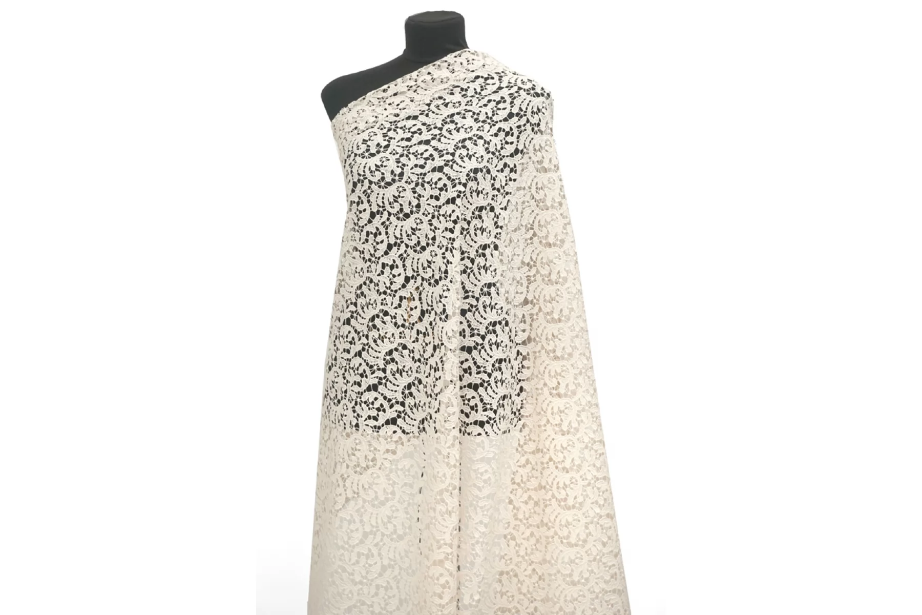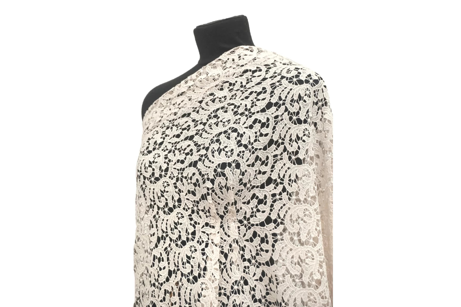 Шикарное нарядное макраме из хлопка в красивом оттенке топленого молока с абстрактными узорами веточек. Тактильно ощущается плетение. Мягкое, форму практически не держит. Толщиной примерно 1 мм. Слегка тянется. Не мнется. Хорошо драпируется. Прекрасный вариант для пошива самостоятельного изделия (на подкладе), или отделки отдельных элементов одежды и аксессуаров.