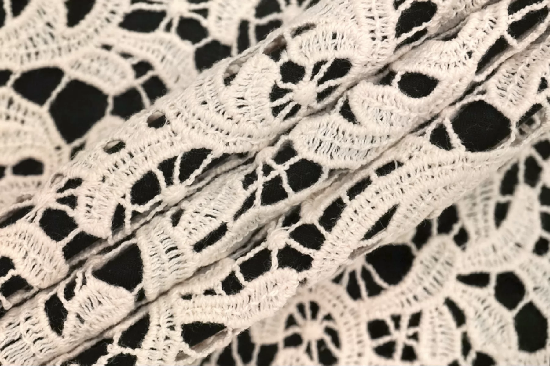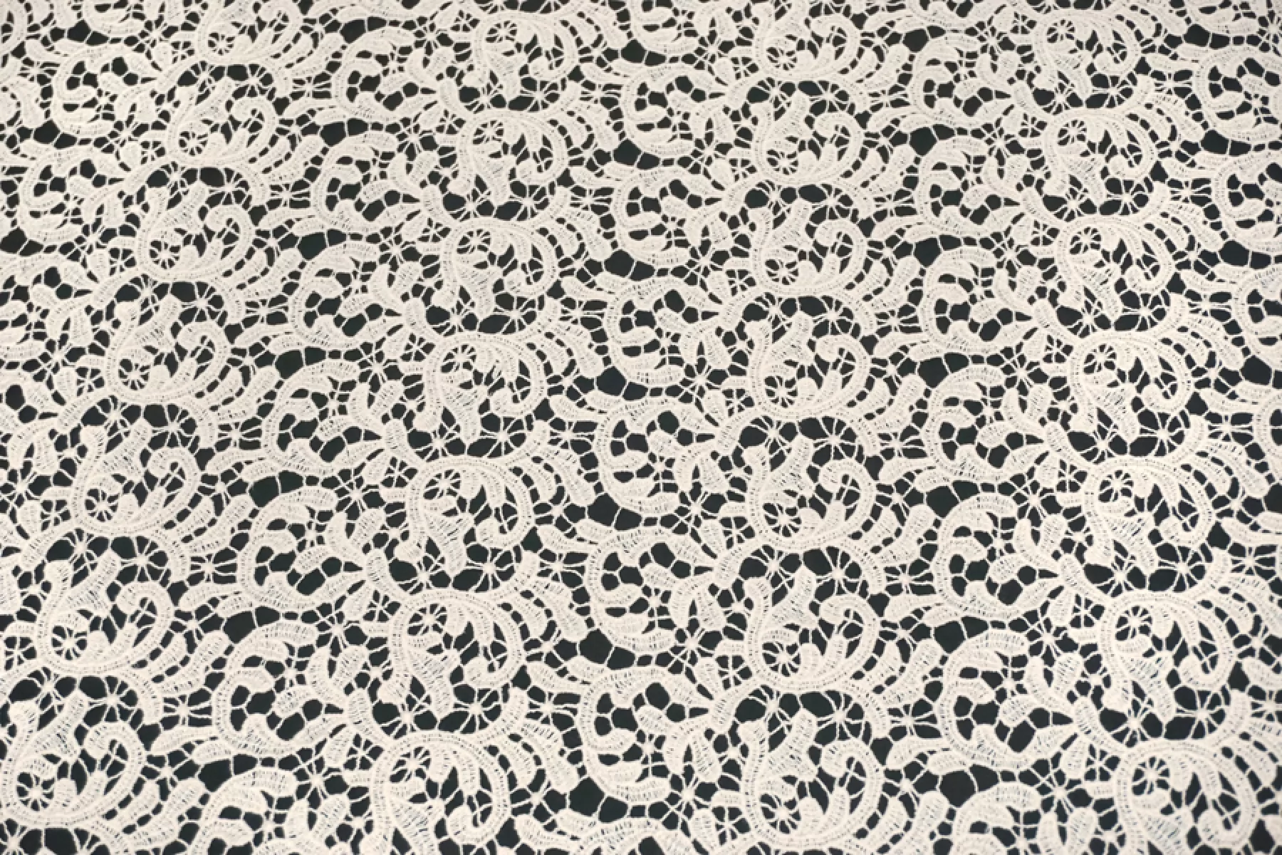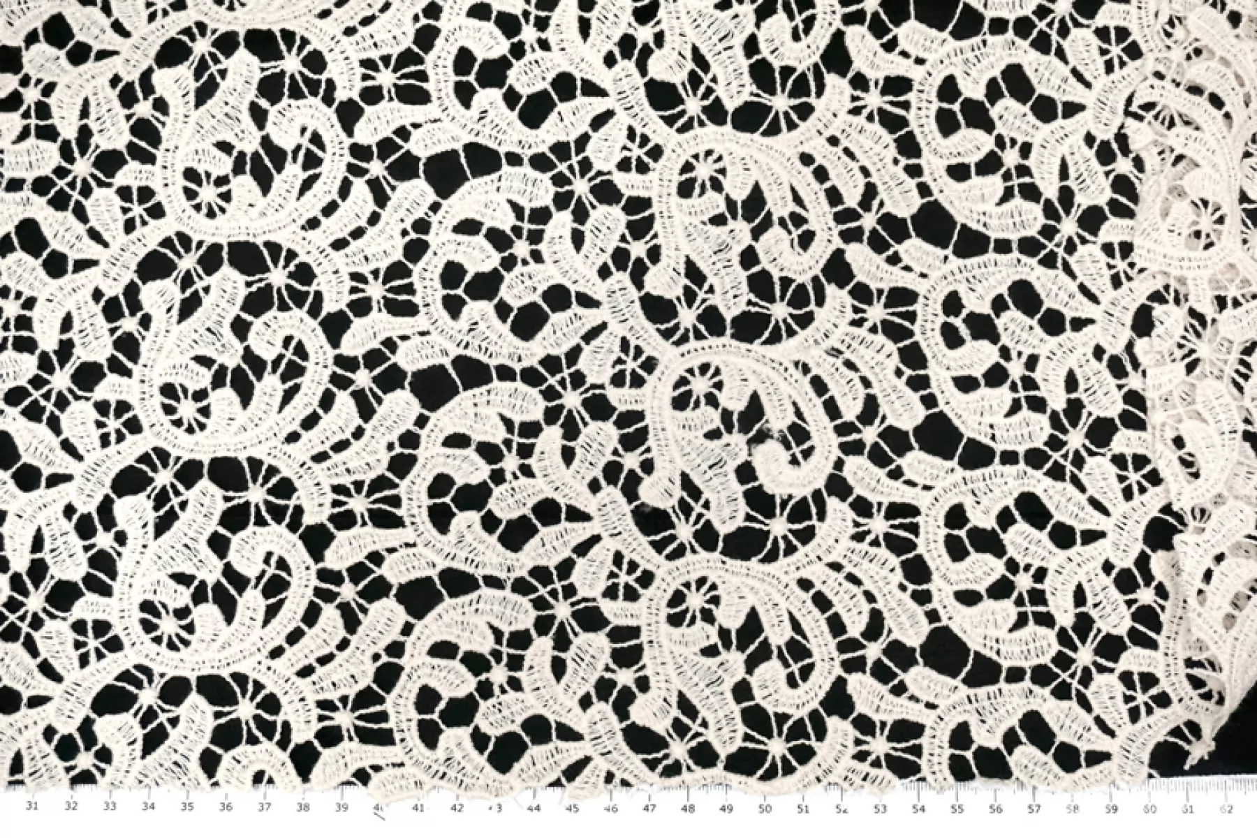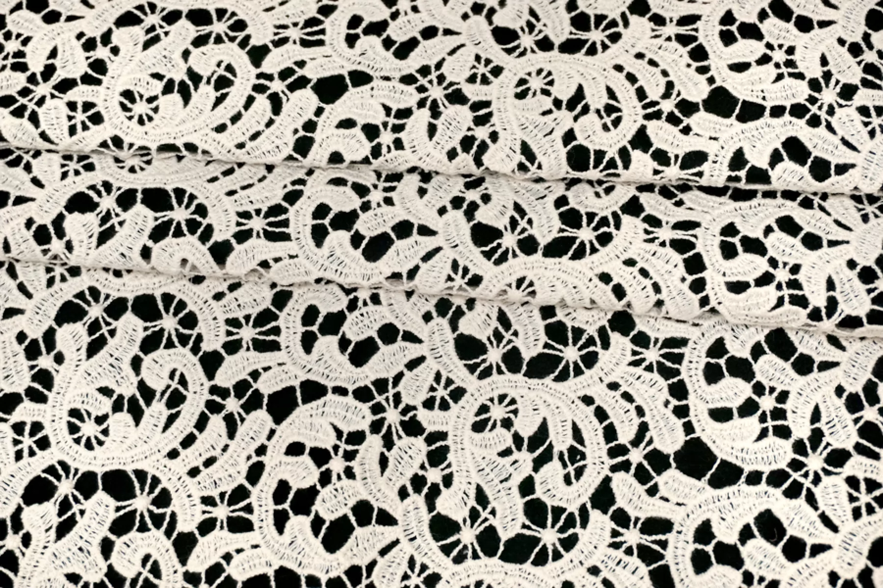 Шикарное нарядное макраме из хлопка в красивом оттенке топленого молока с абстрактными узорами веточек. Тактильно ощущается плетение. Мягкое, форму практически не держит. Толщиной примерно 1 мм. Слегка тянется. Не мнется. Хорошо драпируется. Прекрасный вариант для пошива самостоятельного изделия (на подкладе), или отделки отдельных элементов одежды и аксессуаров.