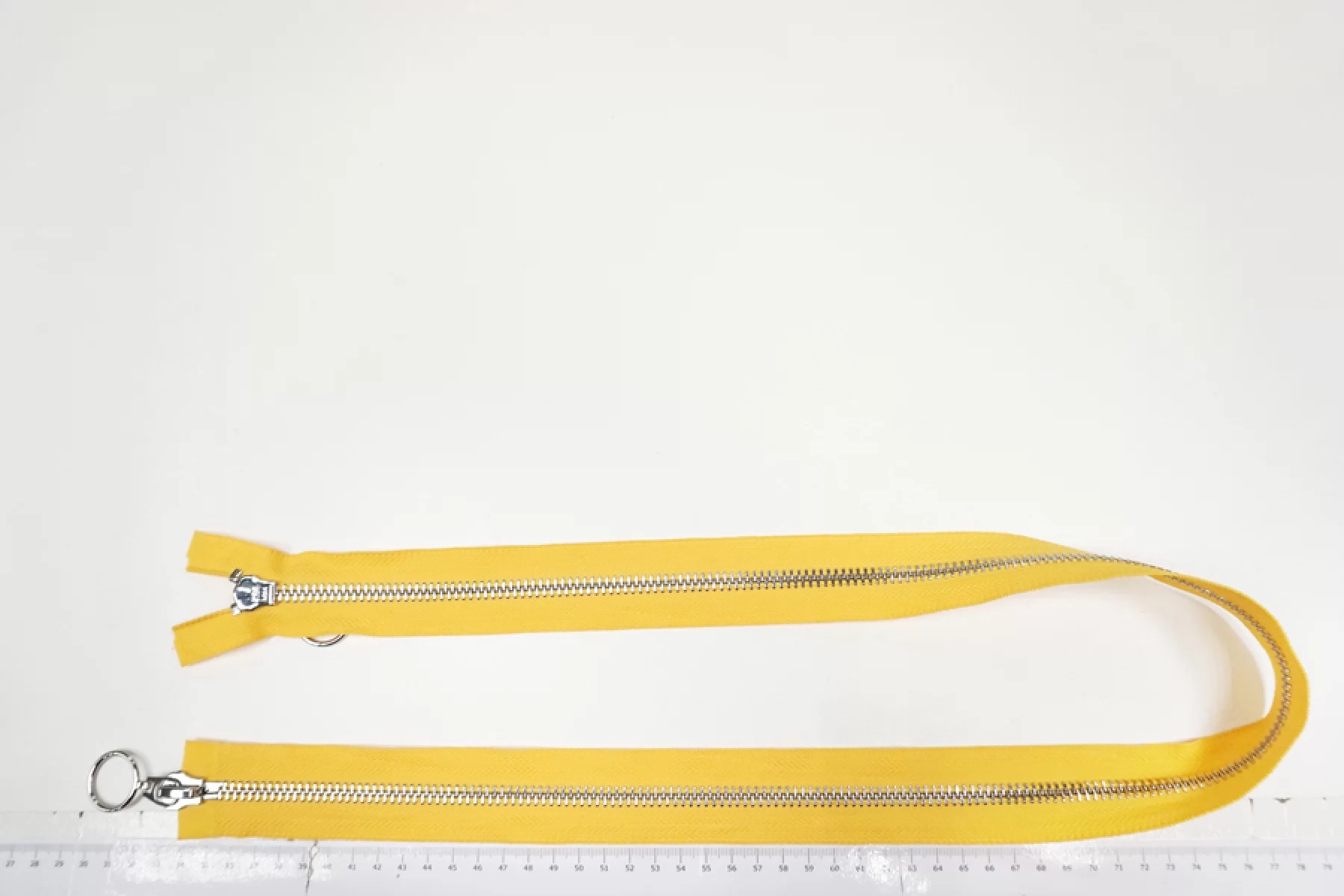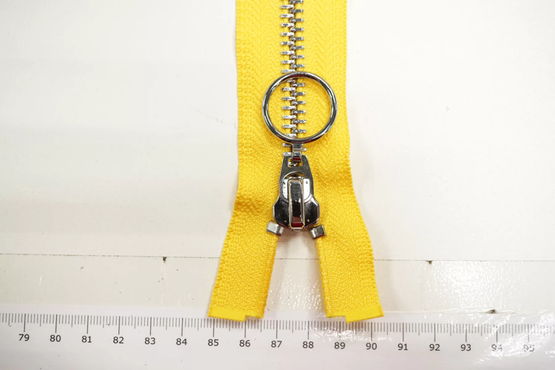 Молния металлическая двухзамковая разъёмная желтого цвета с серебристыми зубцами. Длина молнии 90 см, ширина зубьев 8 мм, вес 95 г. Подходит для пальто, курток и пуховиков.