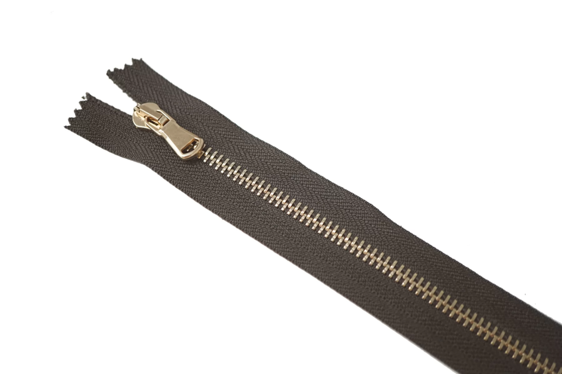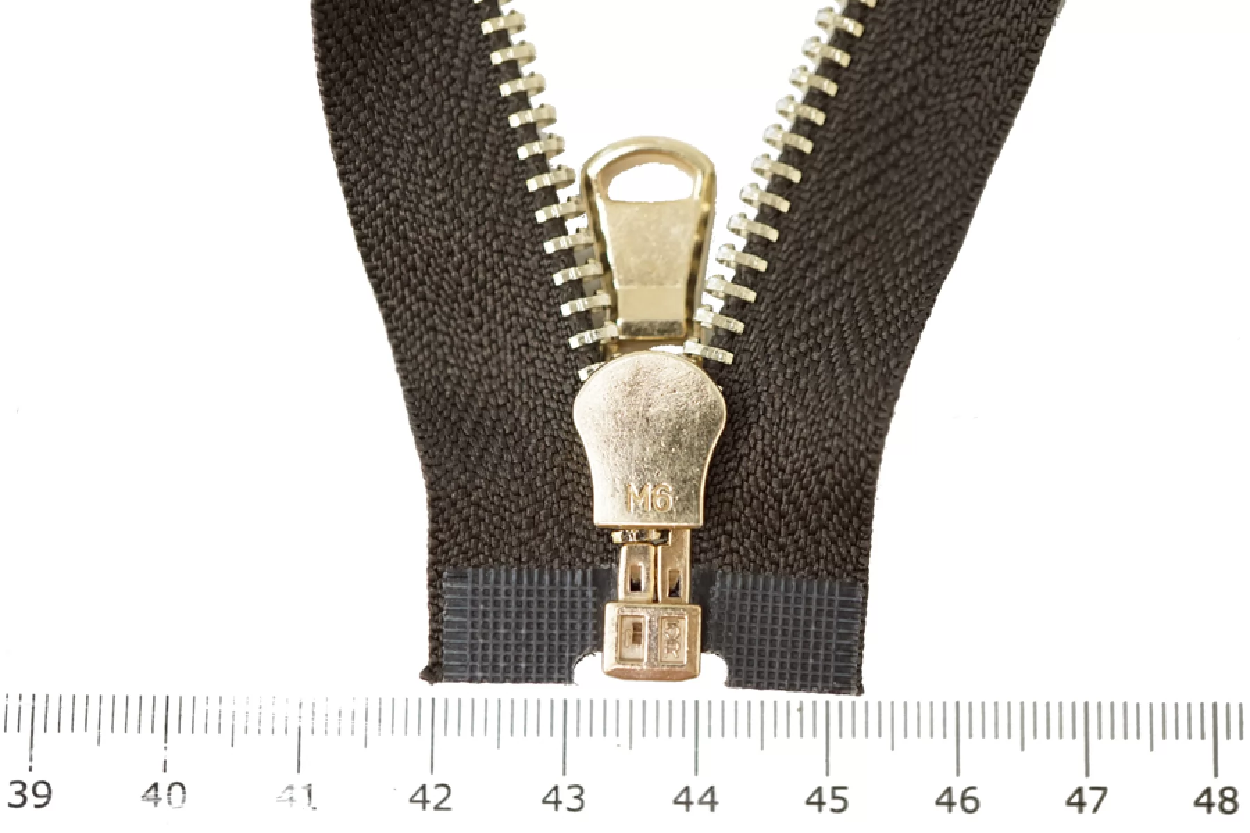 Молния металлическая разъемная, один замок. Цвет молнии коричневый, цвет зубцов, пуллера и слайдера золото. Длина 45см. Ширина молнии 3,1 см, ширина зубцов 5мм.