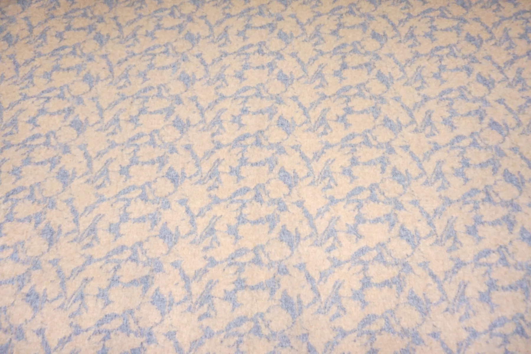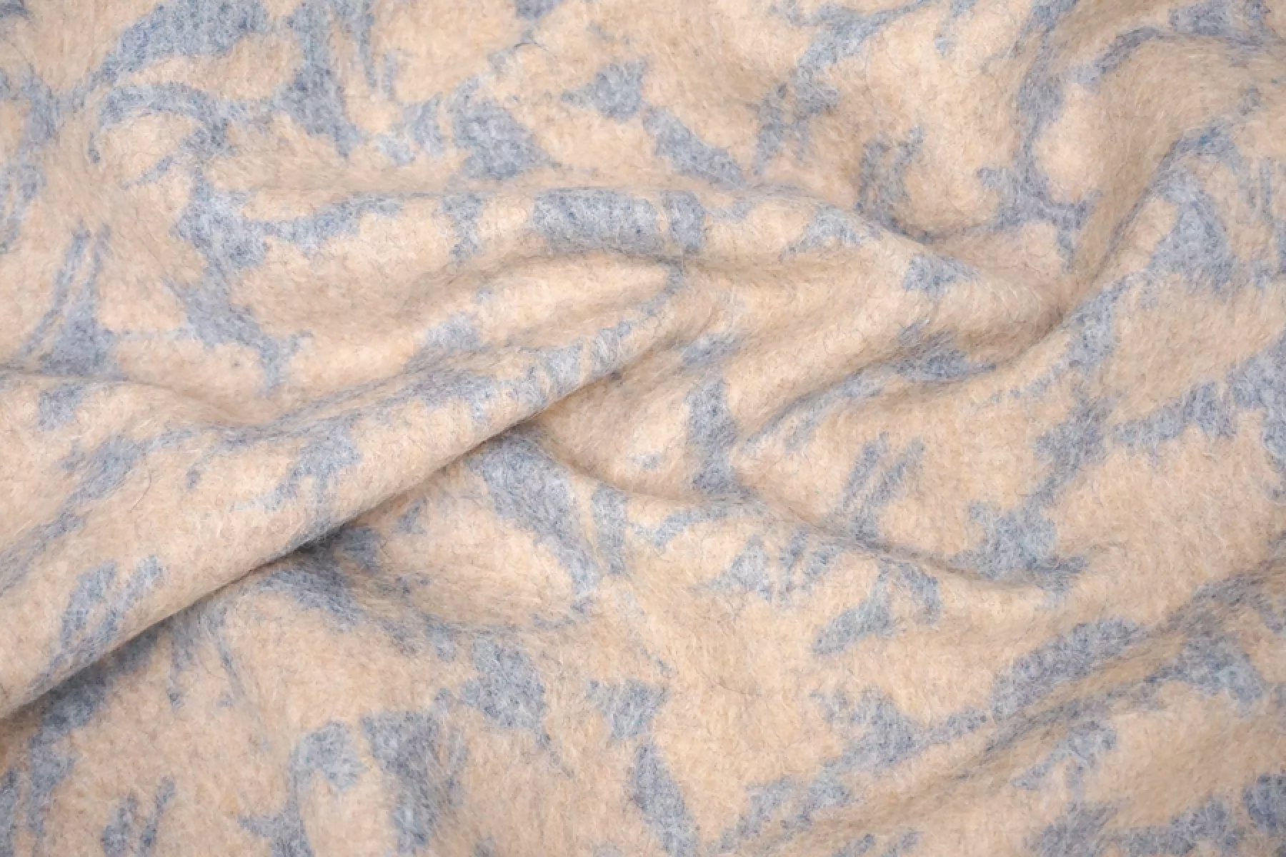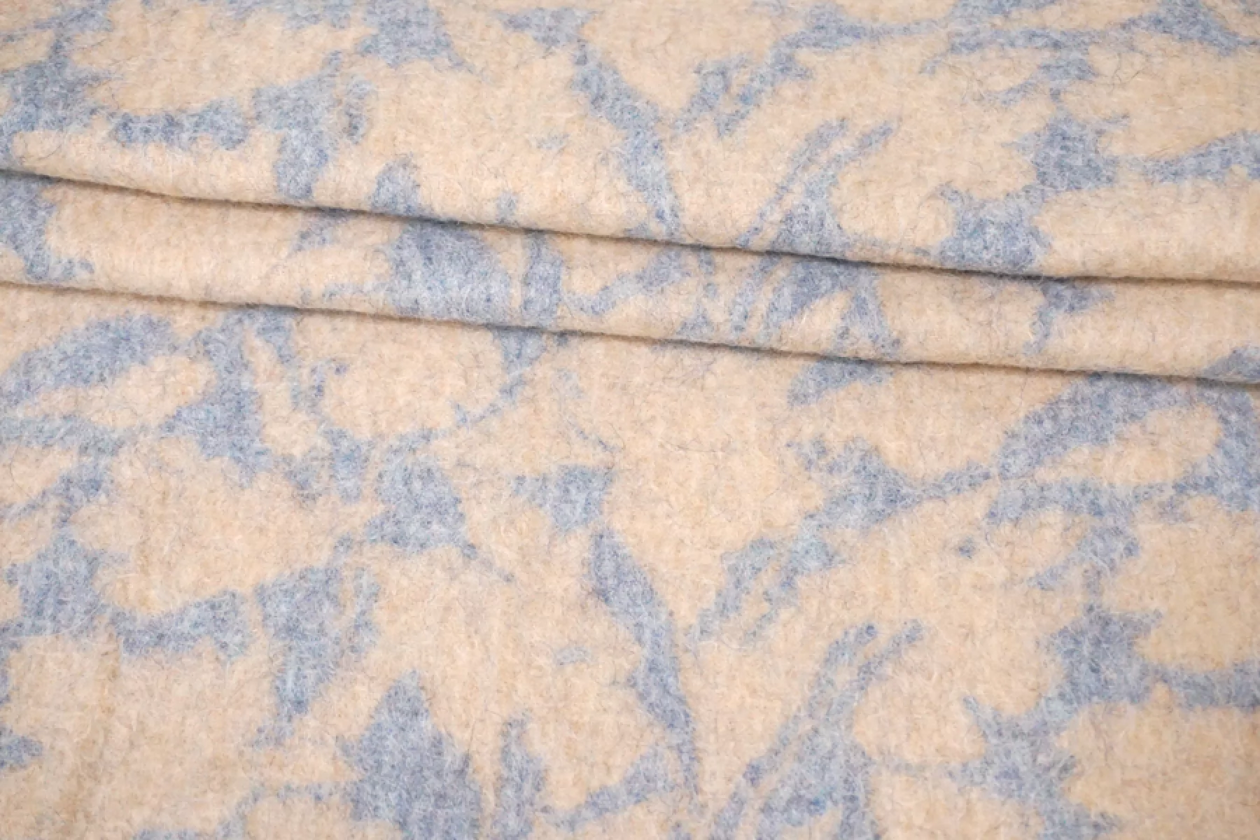 Шикарная пальтовая альпака от бренда Max Mara в бежево-голубом цвете с принтом в виде силуэта цветов. с длинным не направленным ворсом. Тактильно очень приятная, нежная и мягкая. Не колется. Красиво выглядит в сгибах и складках. Хорошо держит форму, не очень пластична. Не тянется и не просвечивает. Толщина около 2 мм. Не мнется. Отлично подойдет как на классические модели пальто, халата, двубортного пальто, так и для современной вариации пальто-рубашки или бомбера. Уход за материалом деликатный. Рекомендуется химчистка.