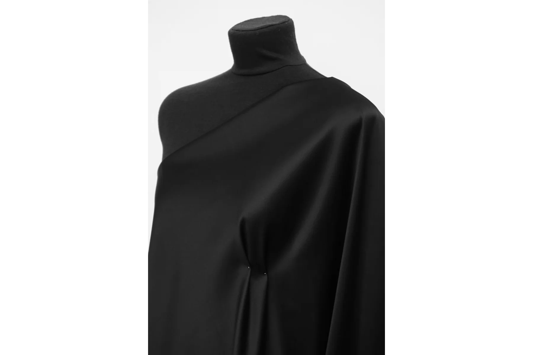 Шикарный двусторонний атлас от TOM FORD в классическом черном цвете. Обладает красивым блеском. Тактильно приятный, мягкий, гладкий и скользящий. Довольно плотный. Не просвечивает. Форму не держит. Немного мнется. Не тянется. Смотрится шикарно! Прекрасен в сборке и своей пластике. Отличный вариант на платье, жакет, юбку и различные варианты нарядной группы. Обязательно учитывайте небольшую усадку.