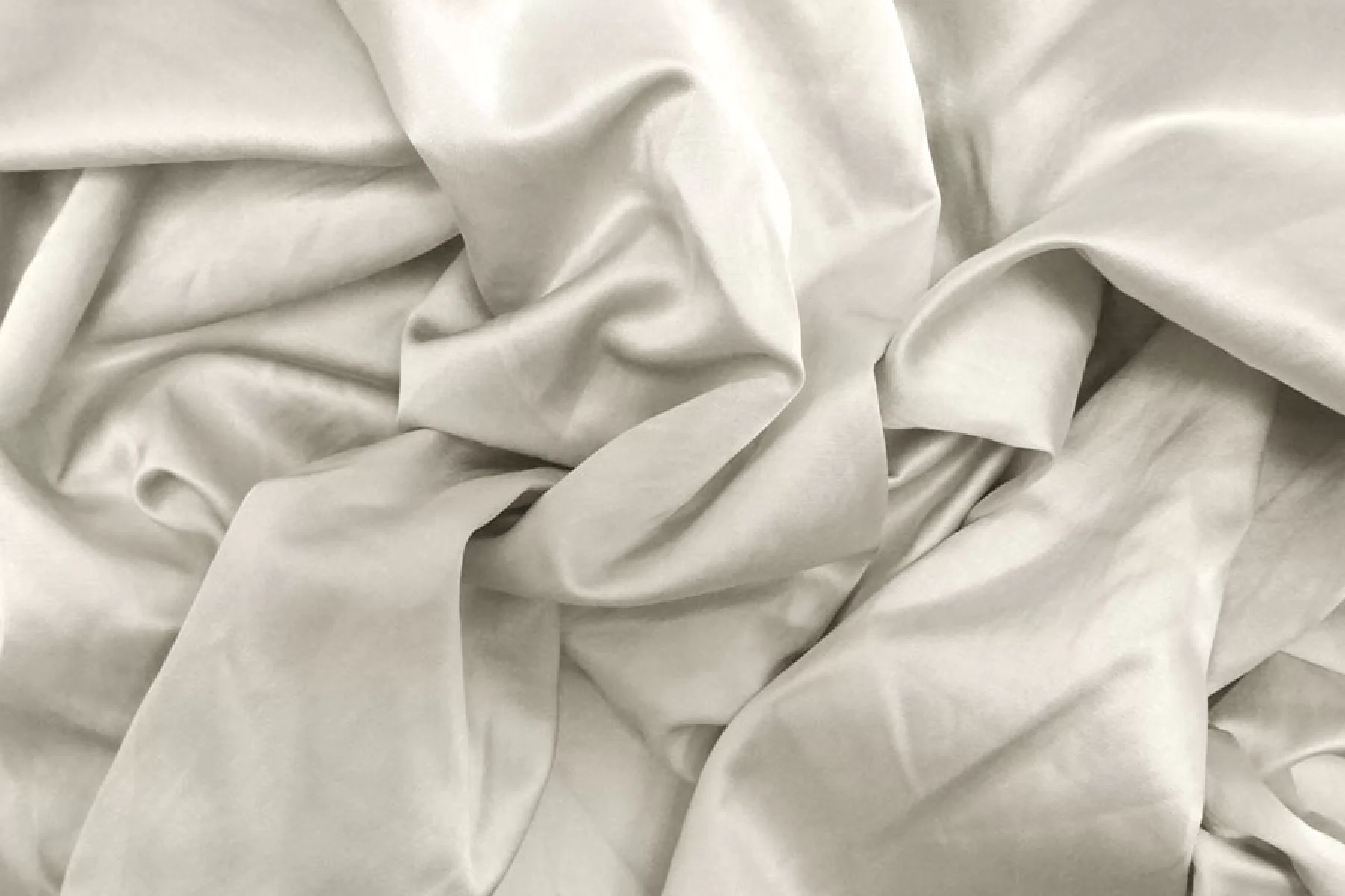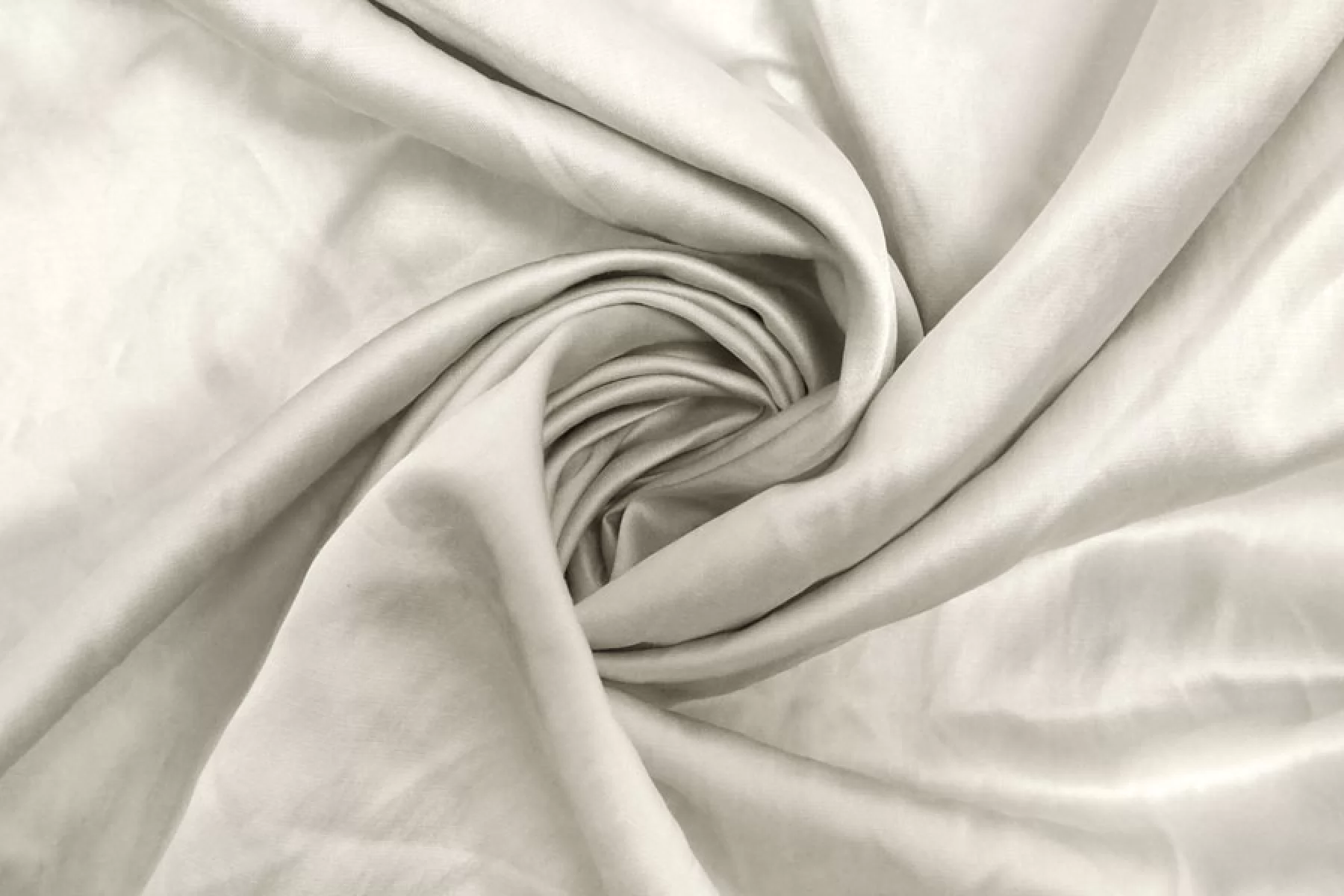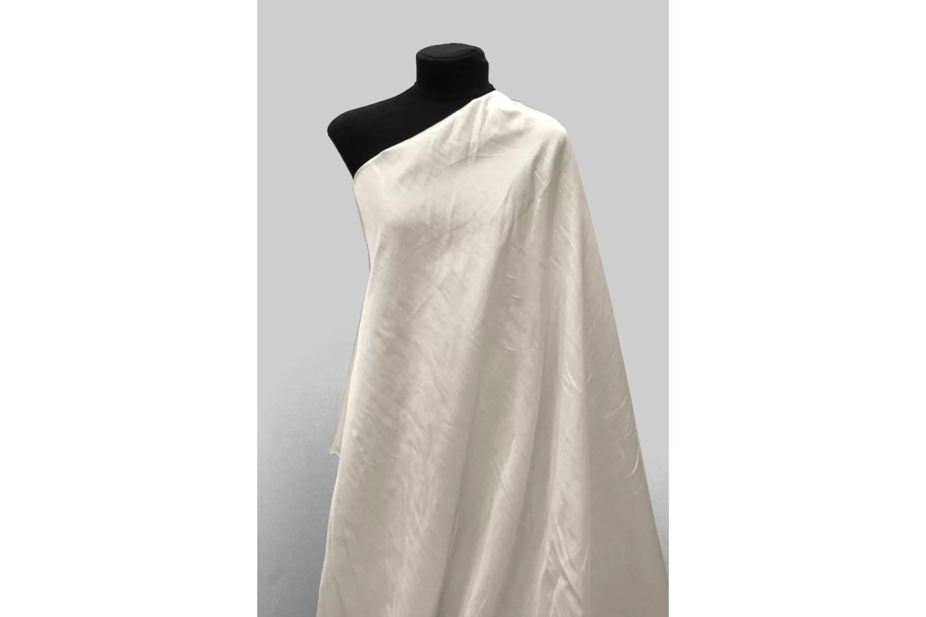 Изысканный атлас из вискозы с хлопком в нежном жемчужно-бежевом оттенке. Мягкий, пластичный, очень приятный. Лицевая сторона гладкая, скользящая с красивым блеском. Тонкий, но при этом плотненький. Не просвечивает. Не тянется. Мнется. Форму немного держит. Вариант на платья, костюмы, мягкие жакеты, юбки и кимоно. При необходимости используйте подкладочный материал. Обязательно учитывайте возможную усадку 5-10%