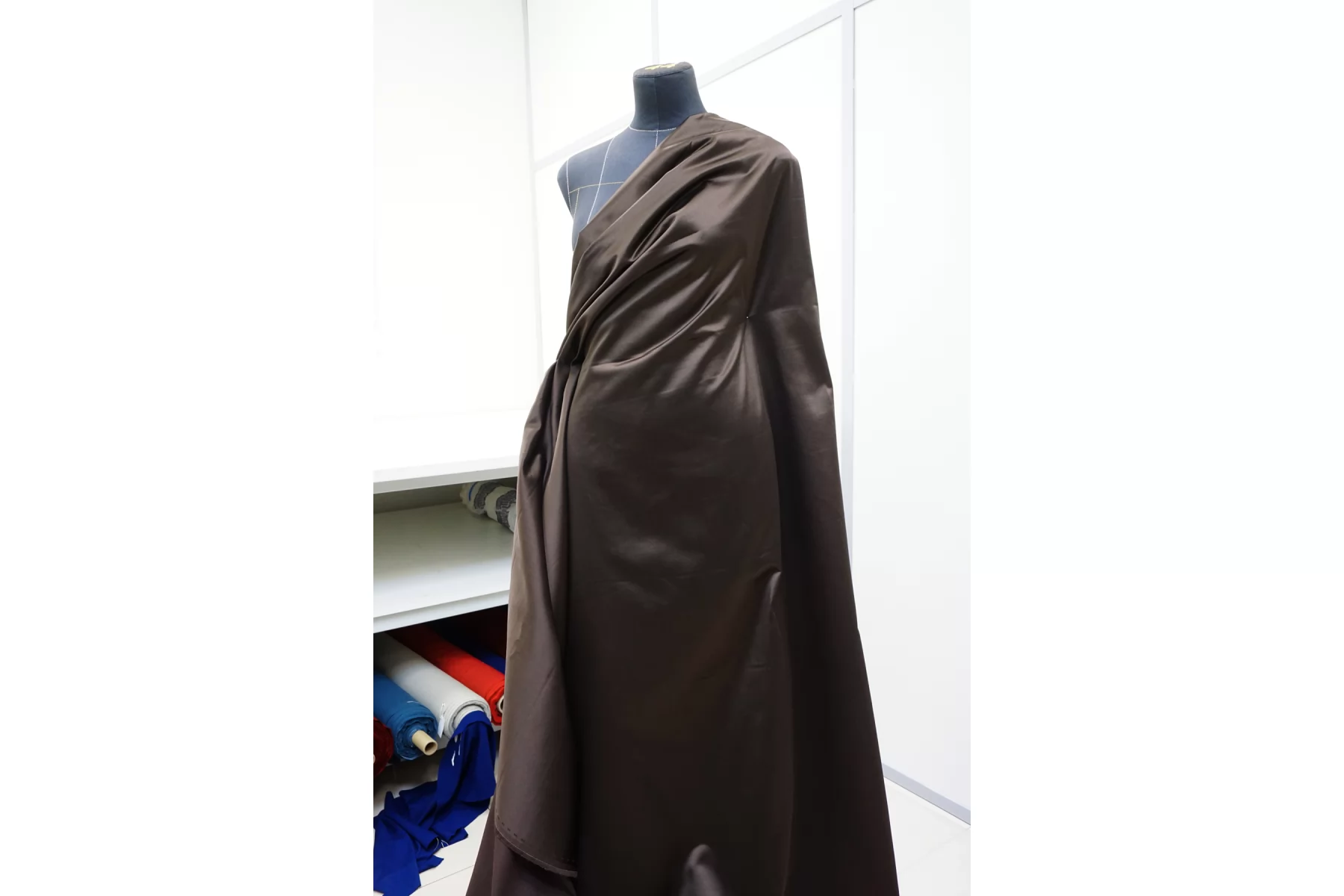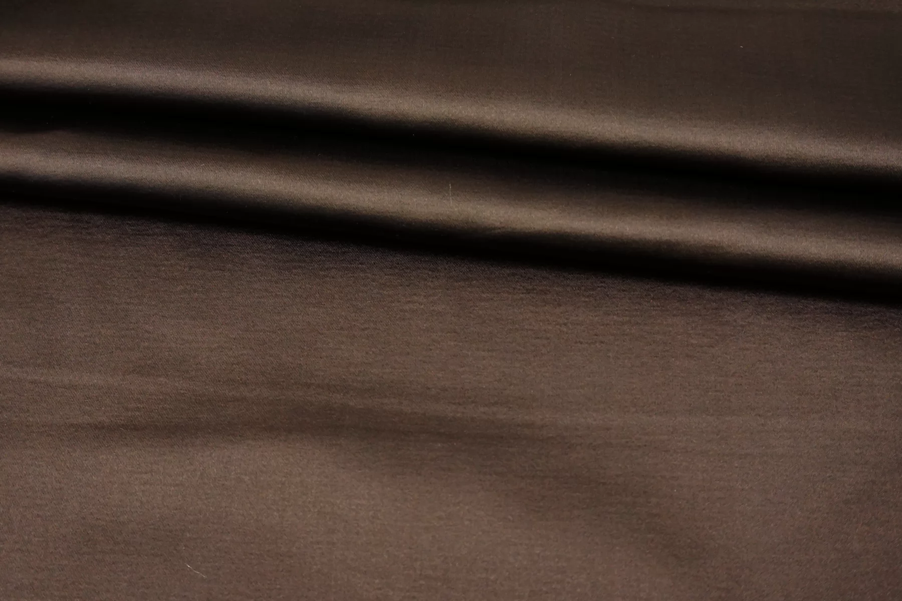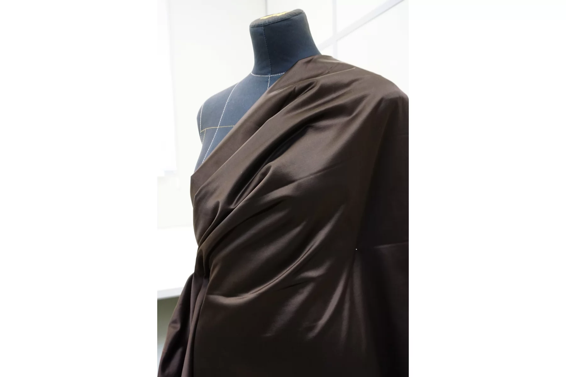 Прекрасный атлас из хлопка, ацетата и вискозы от бренда Tom Ford, тёмный, глубокий оттенок горького шоколада. Лицевая сторона гладкая, скользящая с красивым блеском. Довольно плотный. Формодержащий и умеренный по пластичности. Мнется умеренно, не тянется, не просвечивает. Вариант на платья, костюмы, жакеты, юбки. При необходимости используйте подкладочный материал. Обязательно учитывайте возможную усадку 5-10%