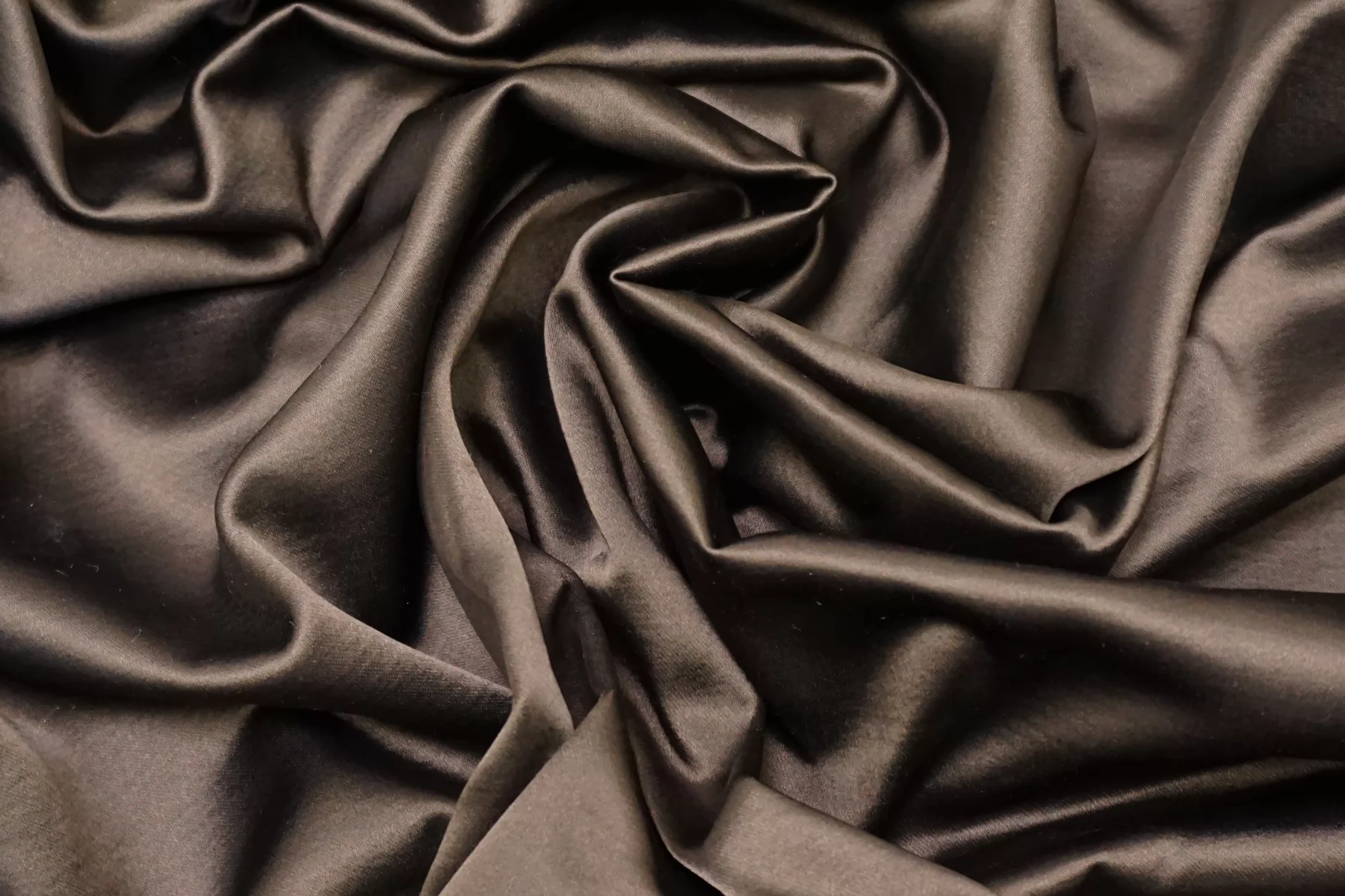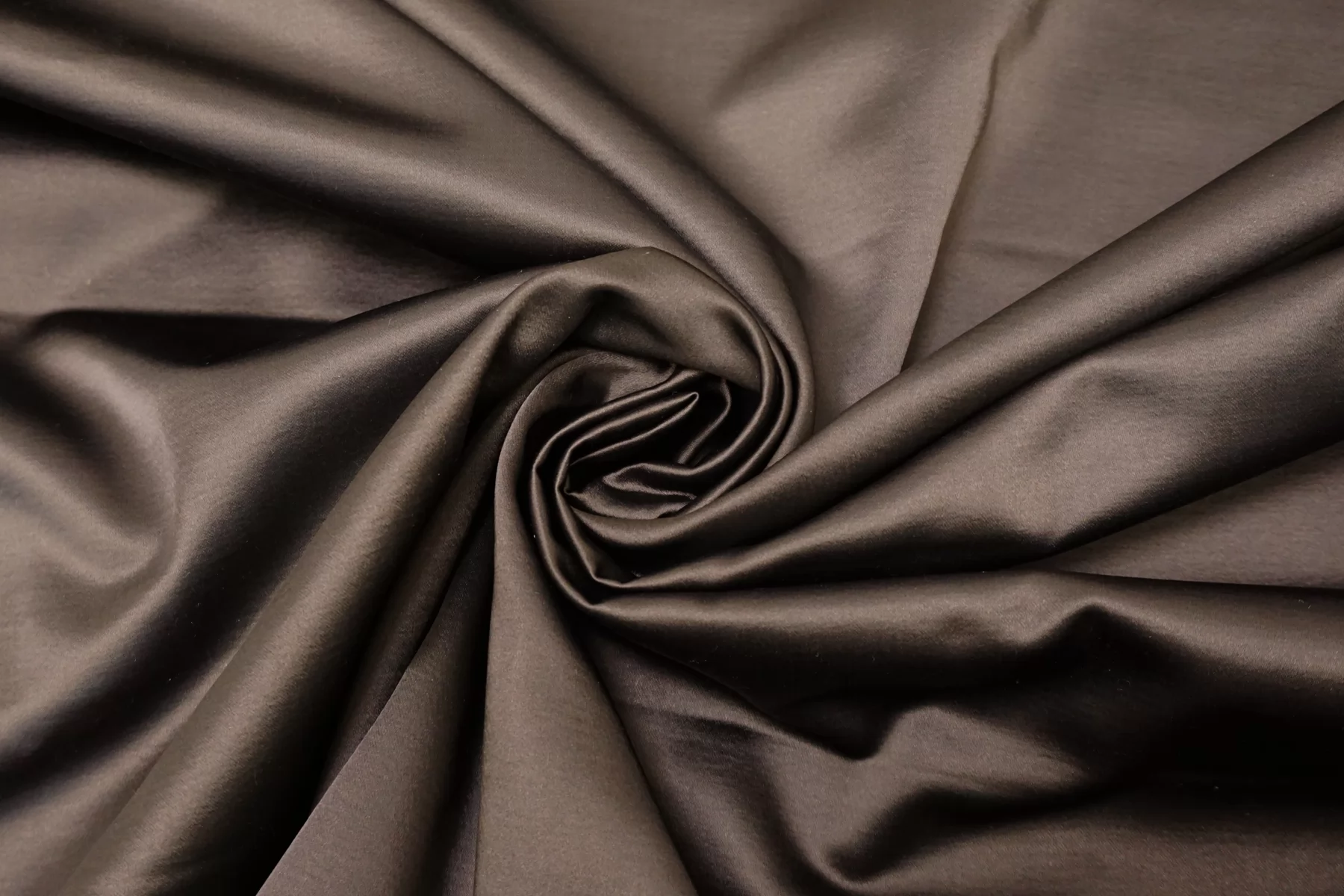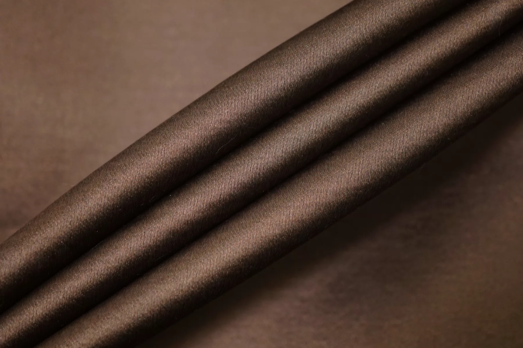 Прекрасный атлас из хлопка, ацетата и вискозы от бренда Tom Ford, тёмный, глубокий оттенок горького шоколада. Лицевая сторона гладкая, скользящая с красивым блеском. Довольно плотный. Формодержащий и умеренный по пластичности. Мнется умеренно, не тянется, не просвечивает. Вариант на платья, костюмы, жакеты, юбки. При необходимости используйте подкладочный материал. Обязательно учитывайте возможную усадку 5-10%