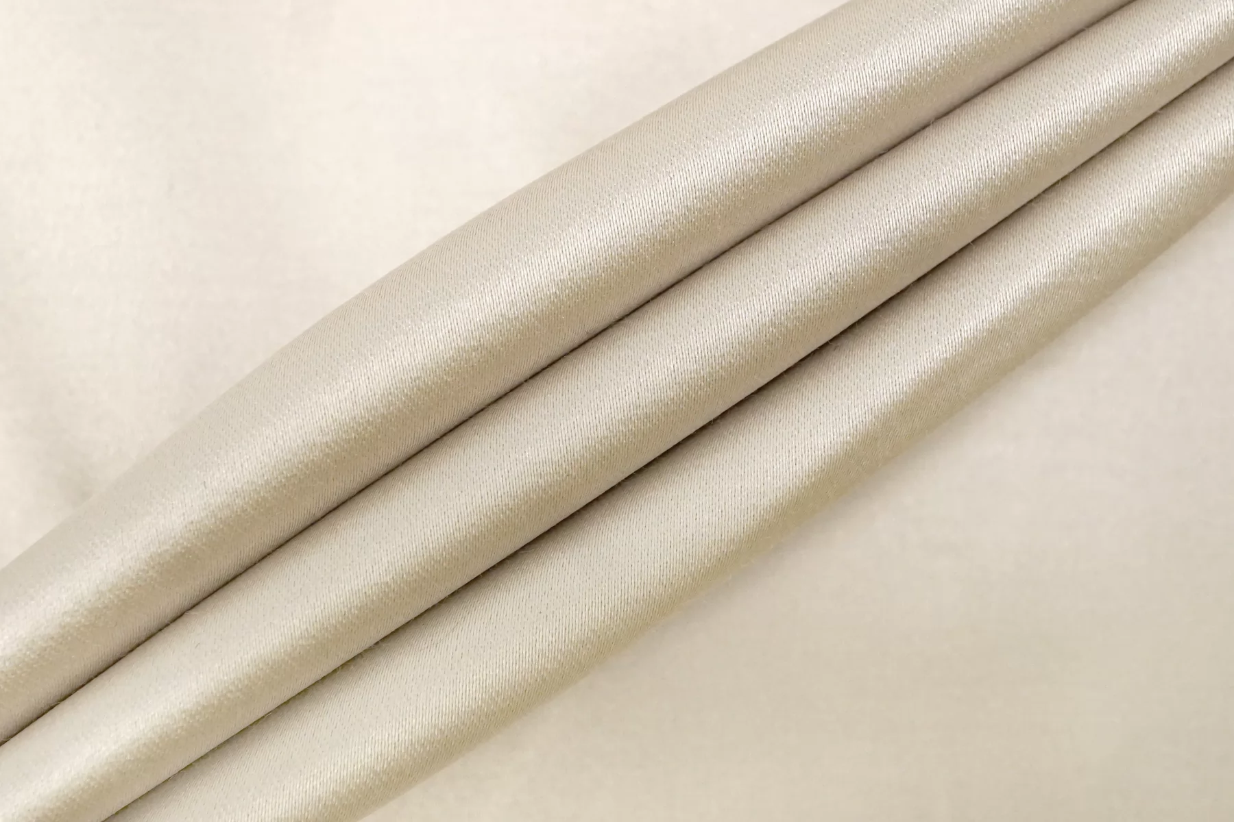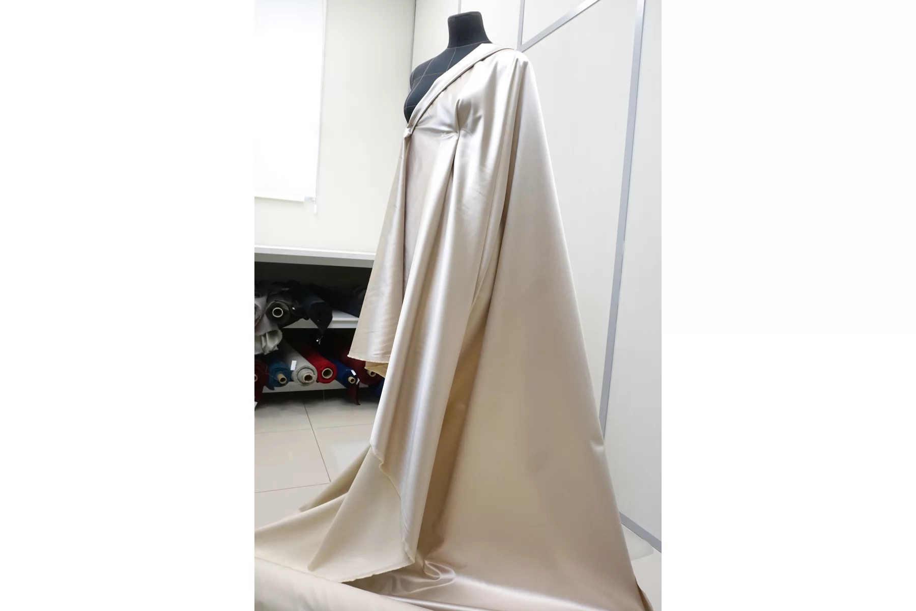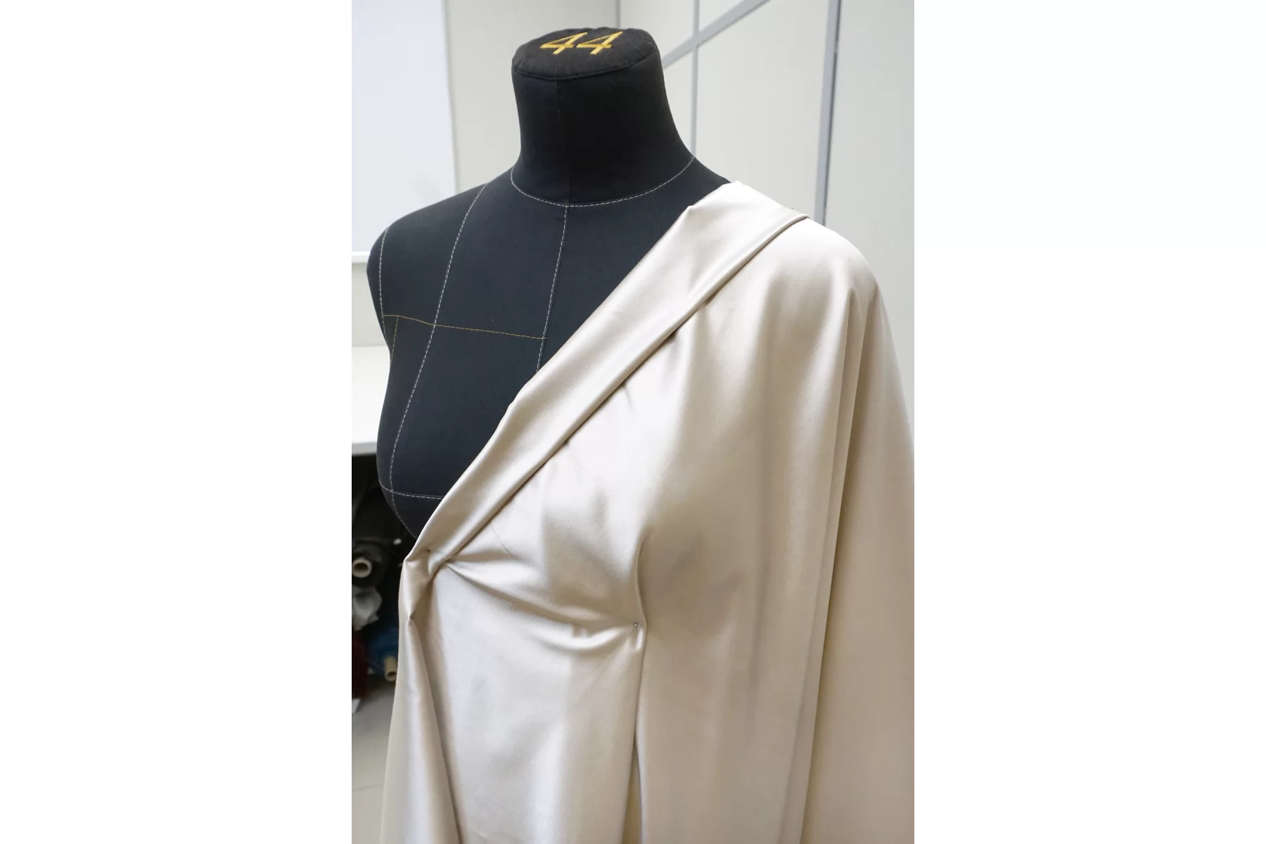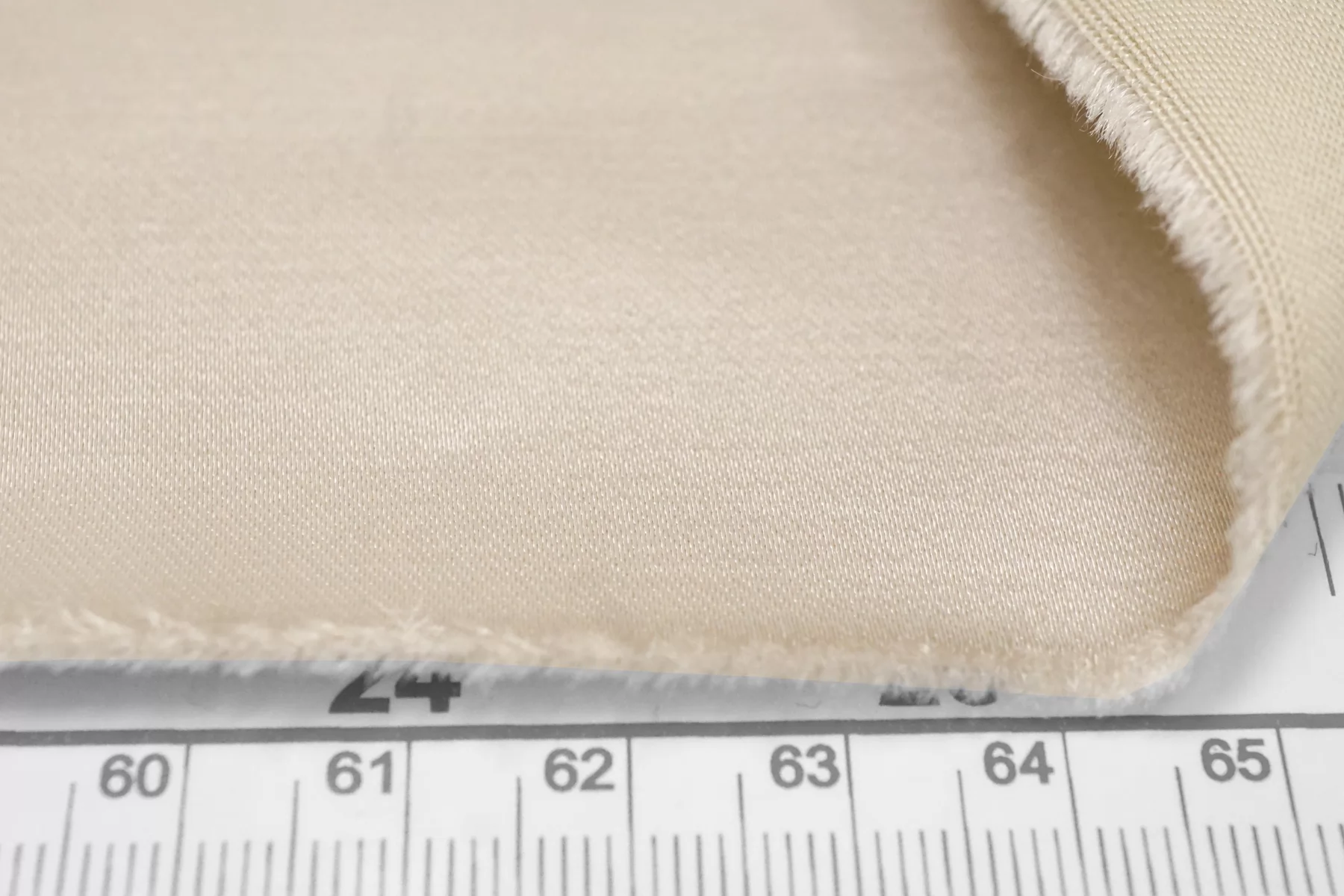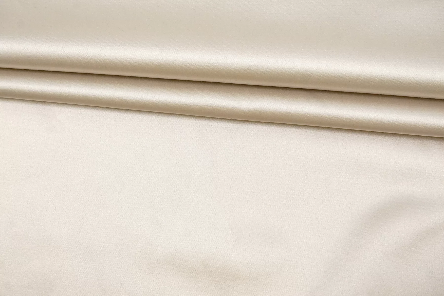 Прекрасный атлас из хлопка, ацетата и вискозы от бренда Tom Ford, красивый оттенок шампань. Лицевая сторона гладкая, скользящая с красивым блеском. Довольно плотный. Формодержащий и умеренный по пластичности. Мнется умеренно, не тянется, не просвечивает. Вариант на платья, костюмы, жакеты, юбки. При необходимости используйте подкладочный материал. Обязательно учитывайте возможную усадку 5-10%
