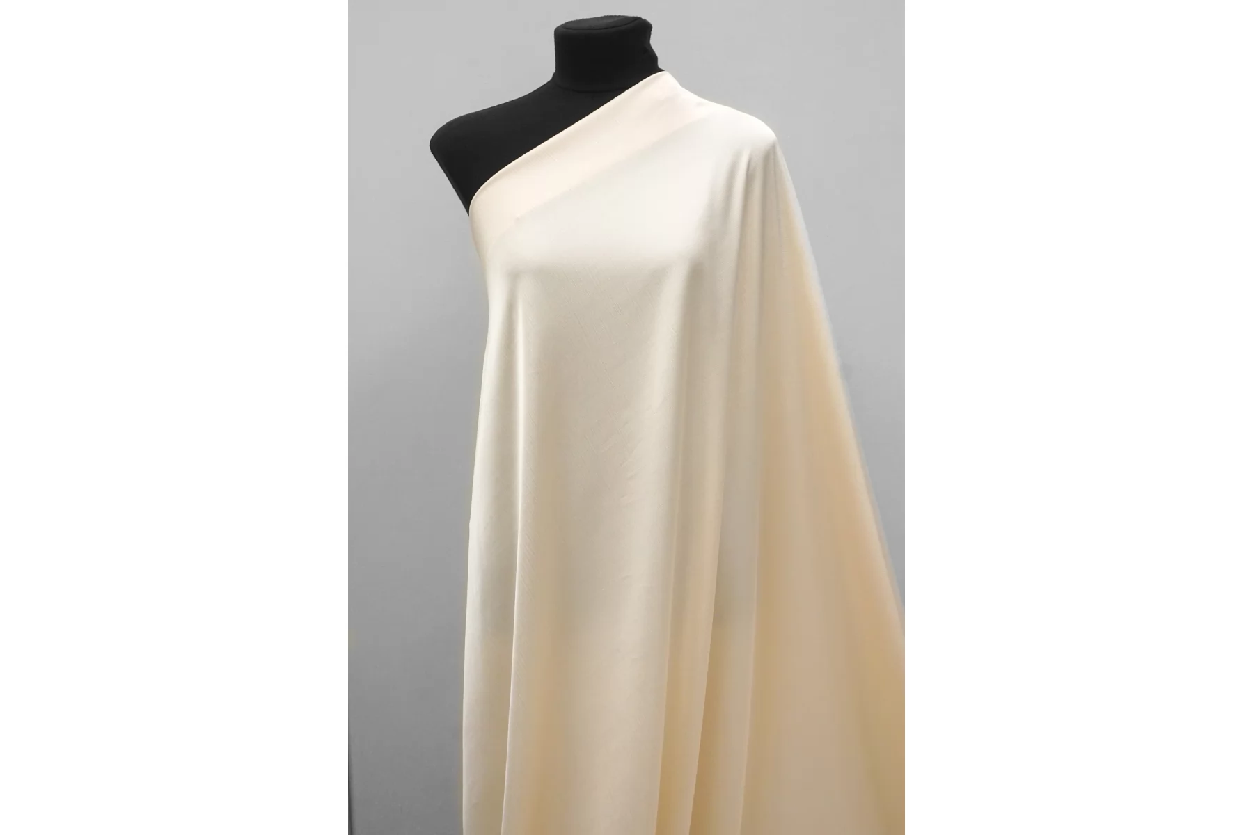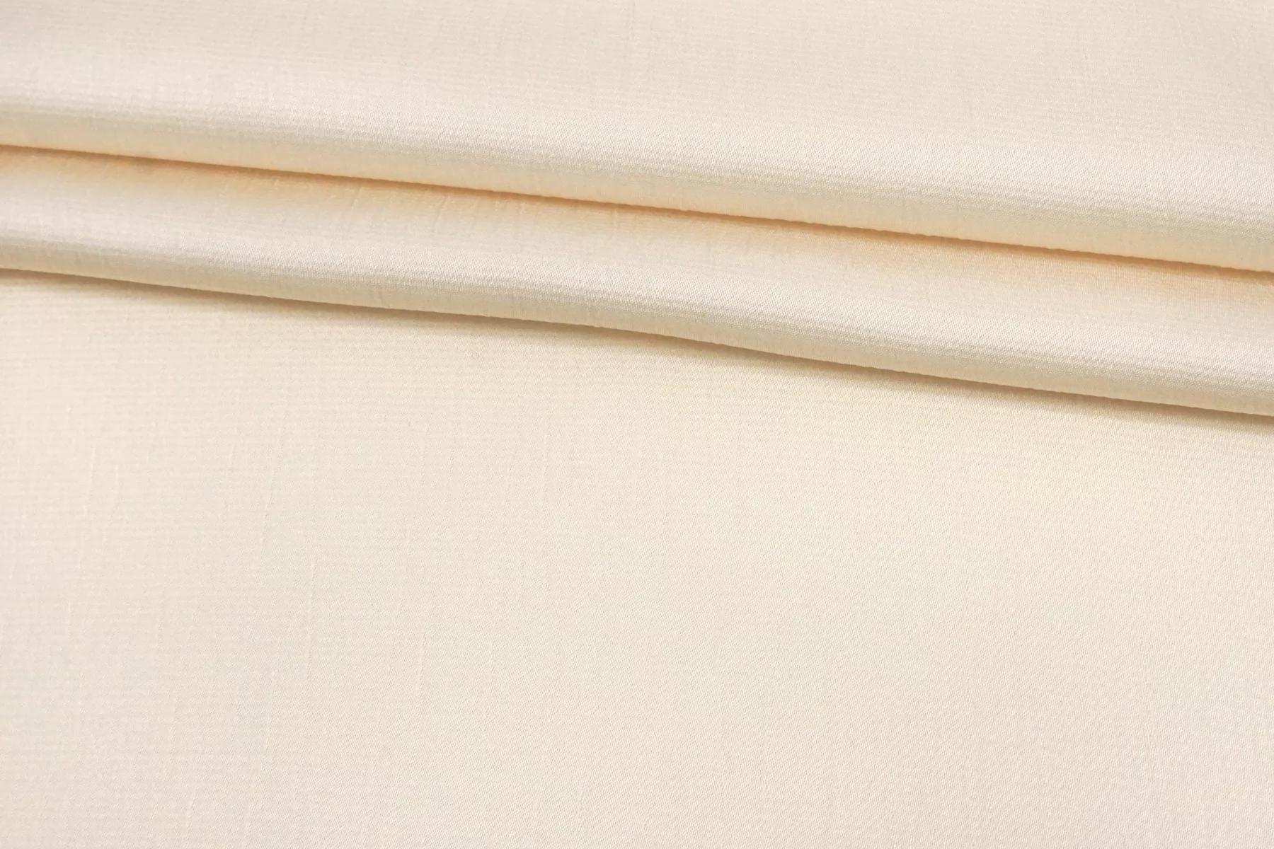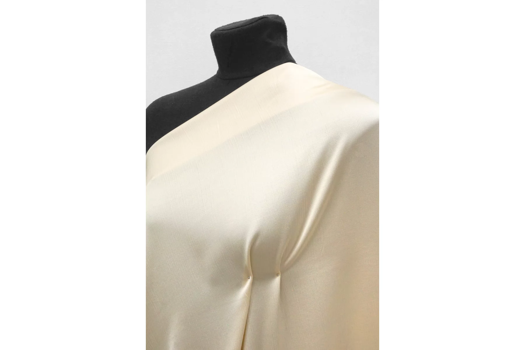Очень красивый атлас с крешированной структурой, в благородном оттенке шампань. Напоминает по пластике и плотности кади. Материал пластичный, мягкий. Смотрится элегантно. Не тянется, но слегка пружинит за счет плетения. Форму не держит, но красиво смотрится в складках и движении, ниспадает. Мнется слабо. Немного просвечивает силуэт в один слой. Отличный вариант на платья, юбки, брюки, кимоно и одежду в пижамном стиле. Обязательно учитывайте возможную усадку 5-10%