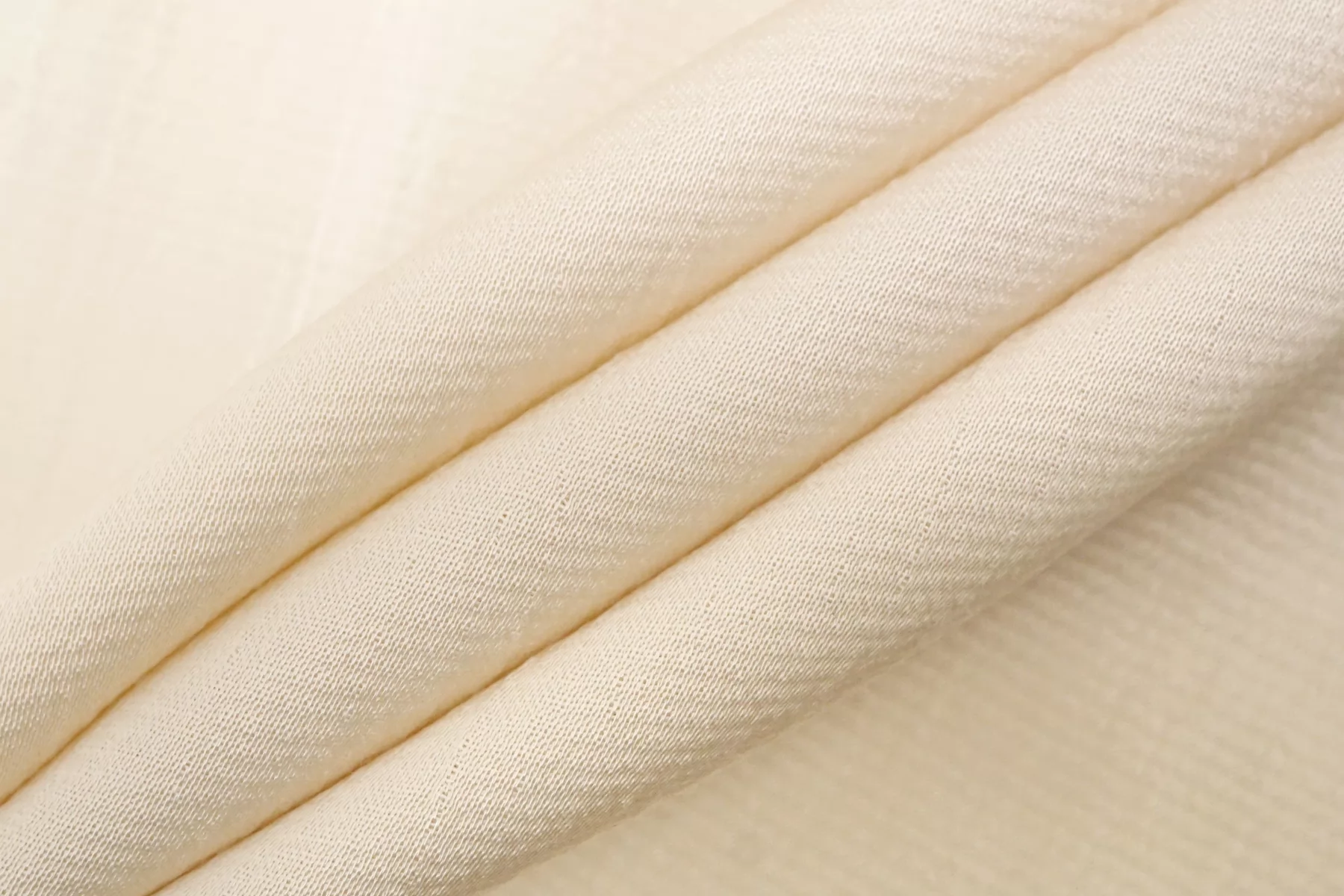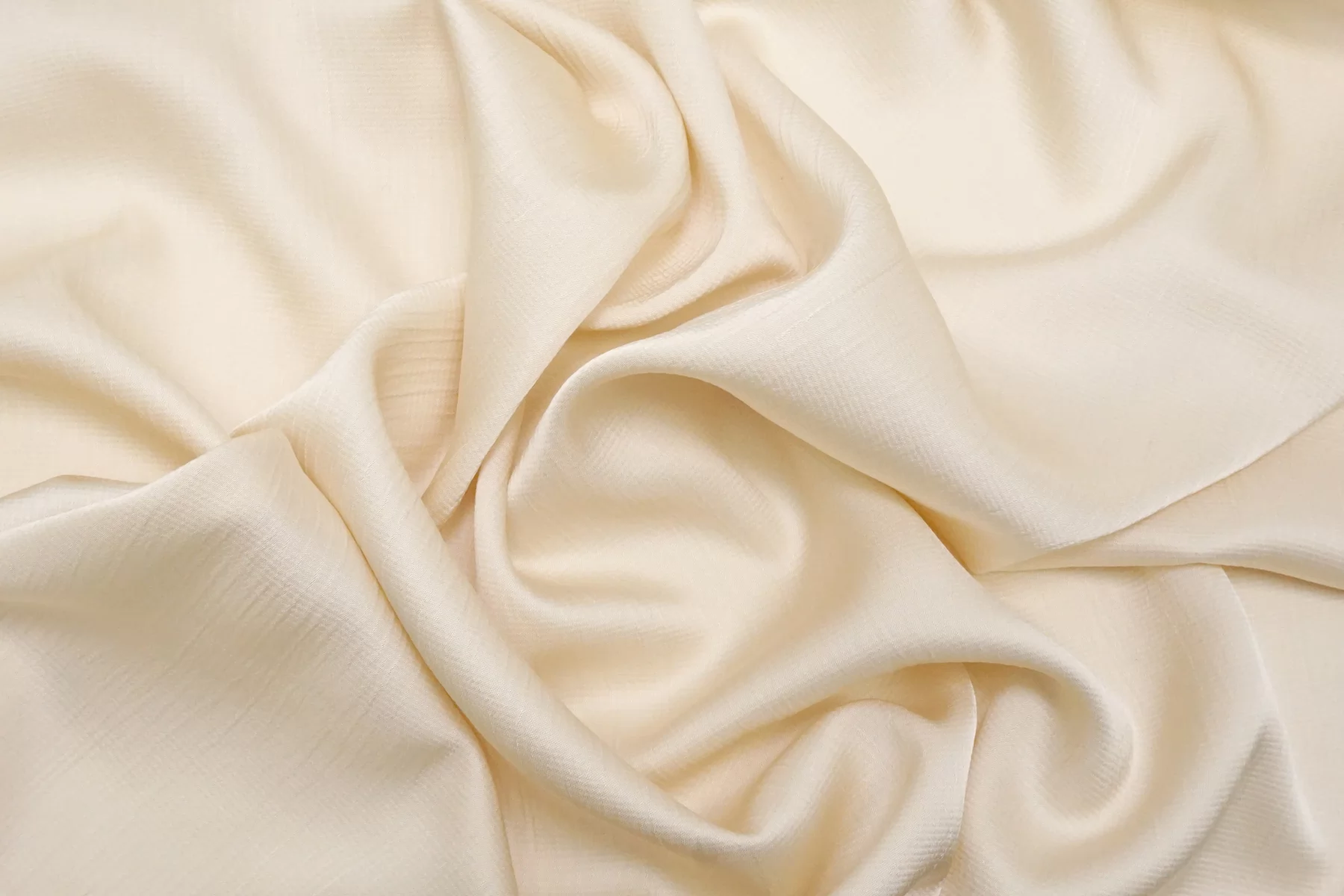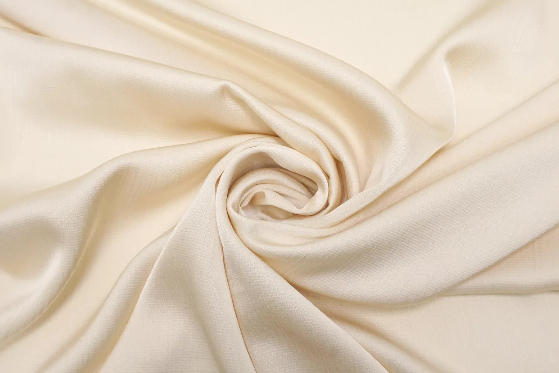 Очень красивый атлас с крешированной структурой, в благородном оттенке шампань. Напоминает по пластике и плотности кади. Материал пластичный, мягкий. Смотрится элегантно. Не тянется, но слегка пружинит за счет плетения. Форму не держит, но красиво смотрится в складках и движении, ниспадает. Мнется слабо. Немного просвечивает силуэт в один слой. Отличный вариант на платья, юбки, брюки, кимоно и одежду в пижамном стиле. Обязательно учитывайте возможную усадку 5-10%