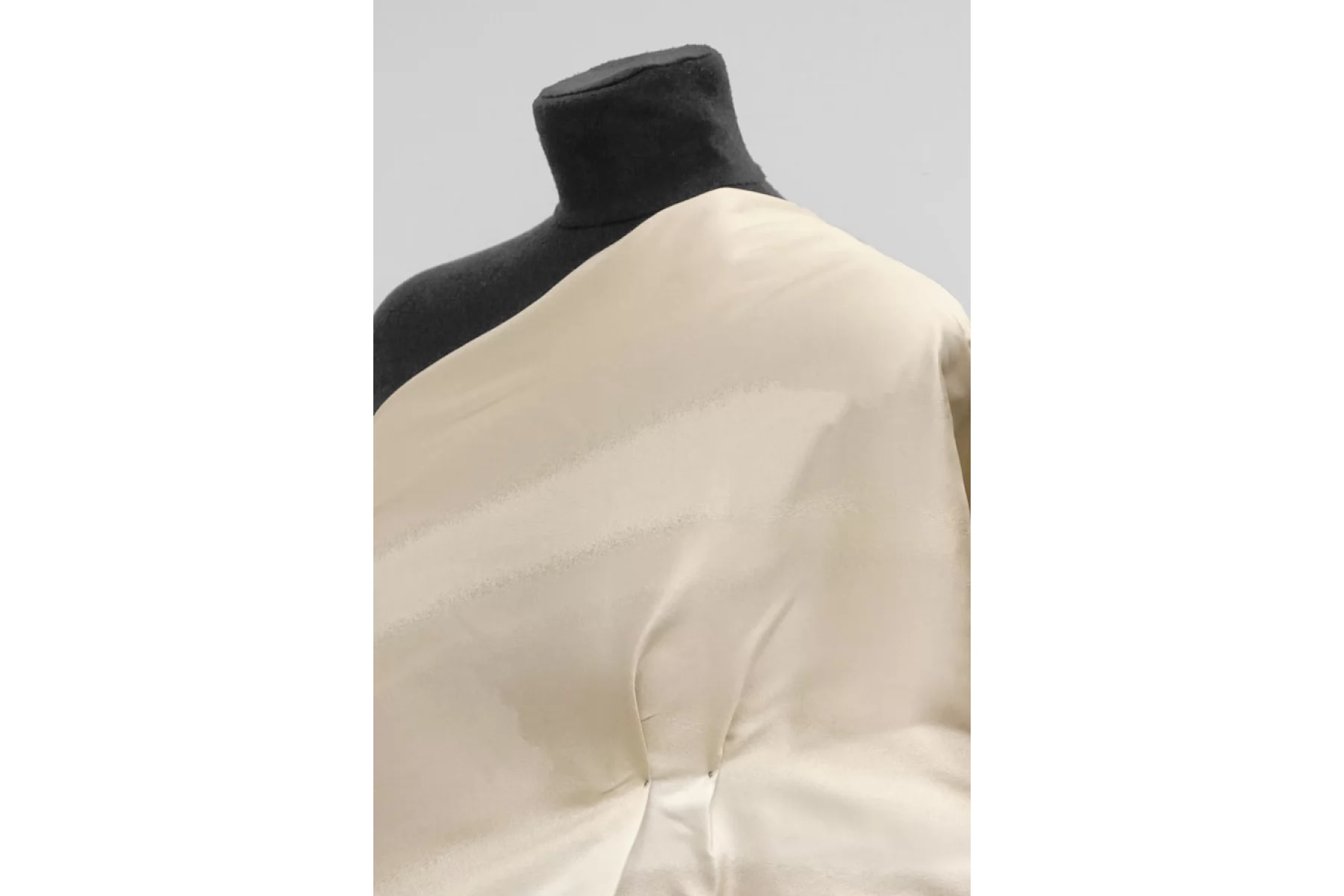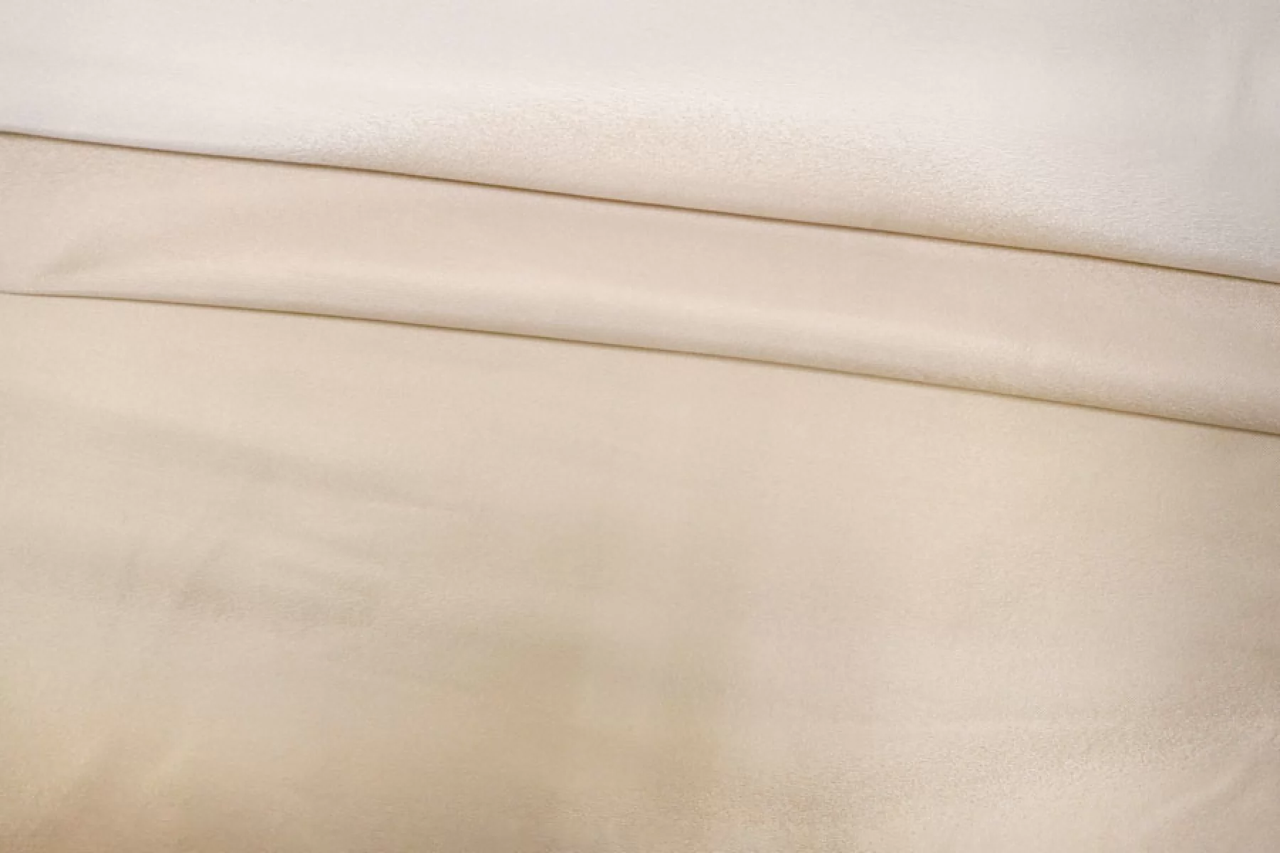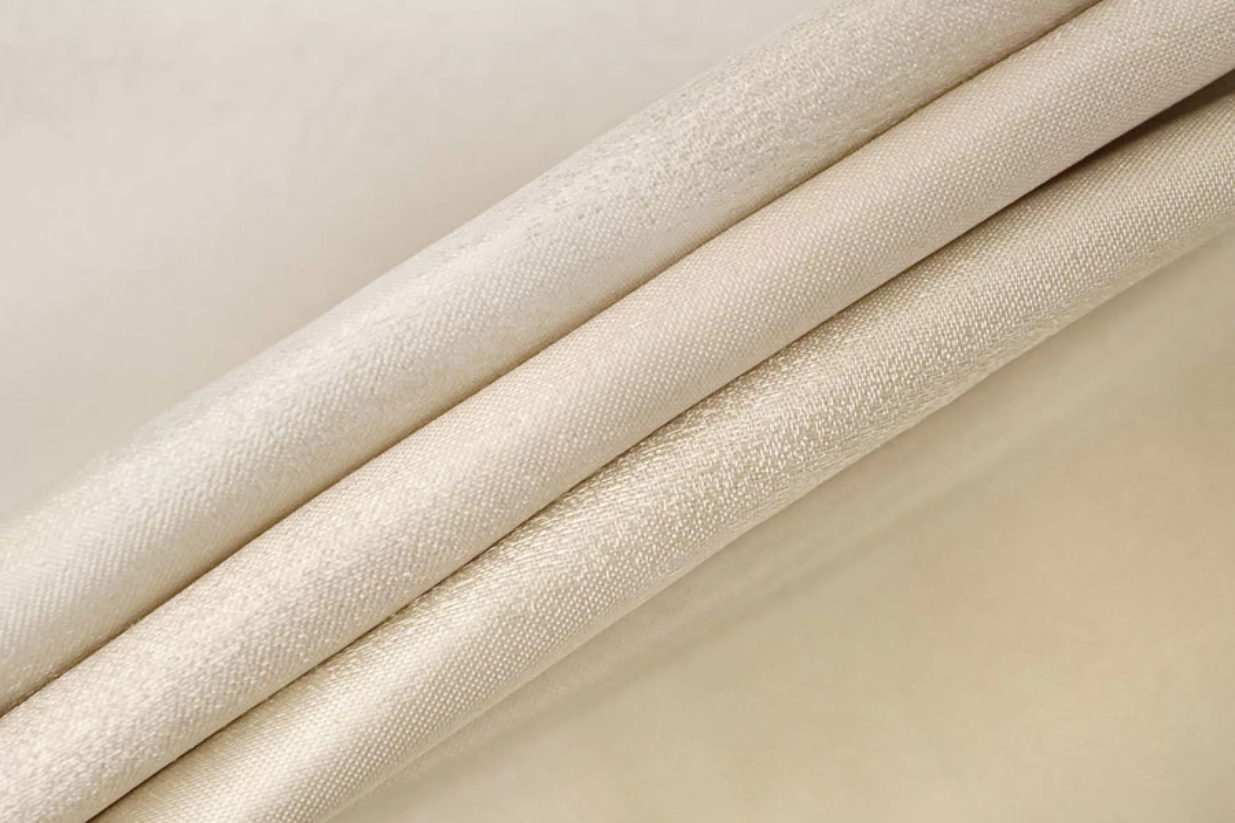 Великолепный шелковый жаккард костюмно-плательной плотности, двусторонний, одна сторона молочная, другая - по цвету между белым золотом и оттенком шампань. У ткани есть рапорт - 75 см. Материал тонкий но плотный. Не тянется. Мнется. Красиво держит складки и формы. По пластике близок к тафте. Прекрасный вариант на нарядные платья, юбки, жакеты и рубашки. Уход деликатный.