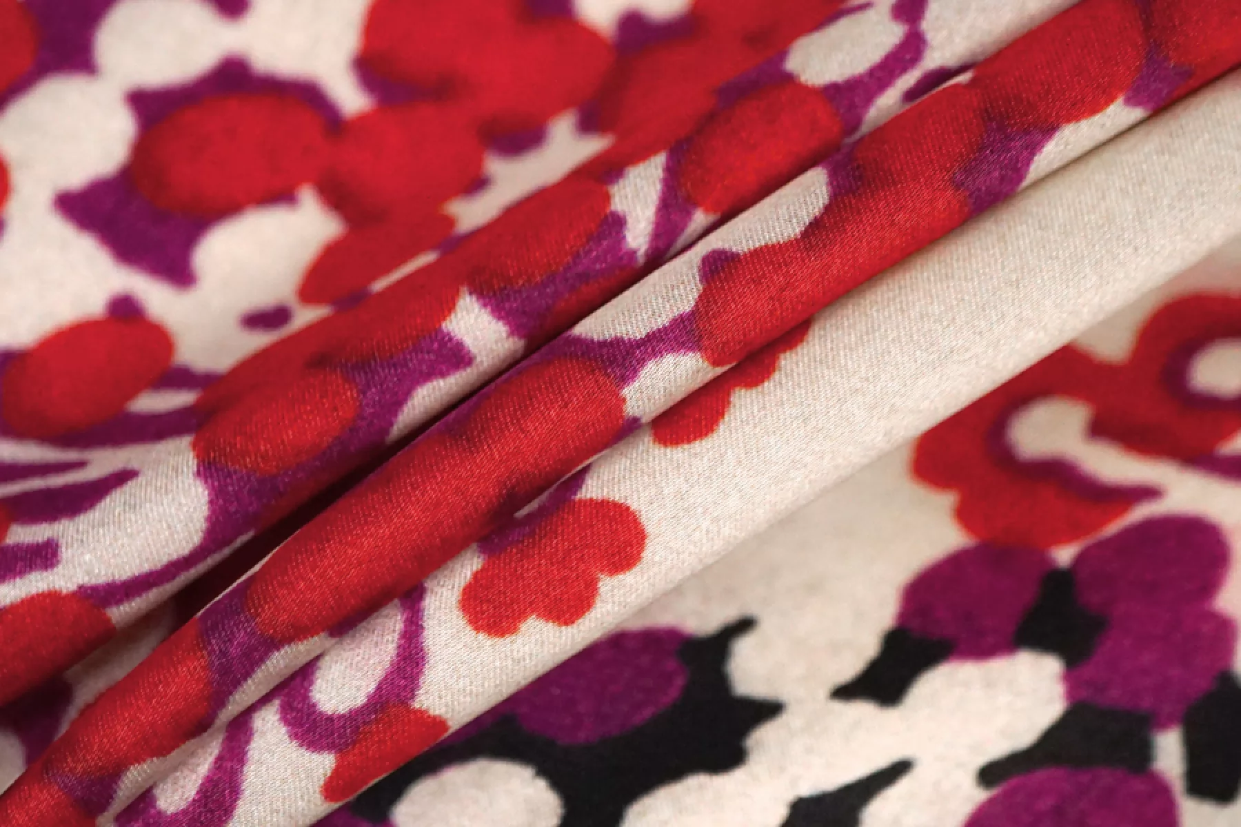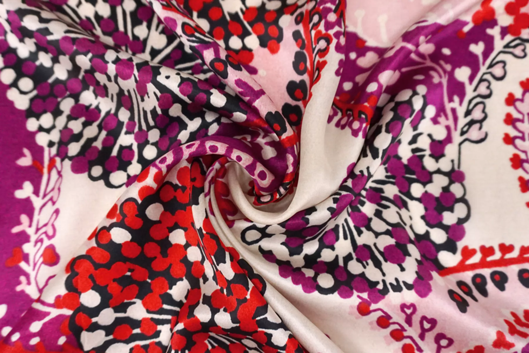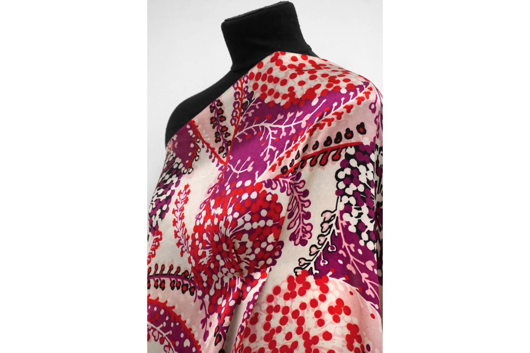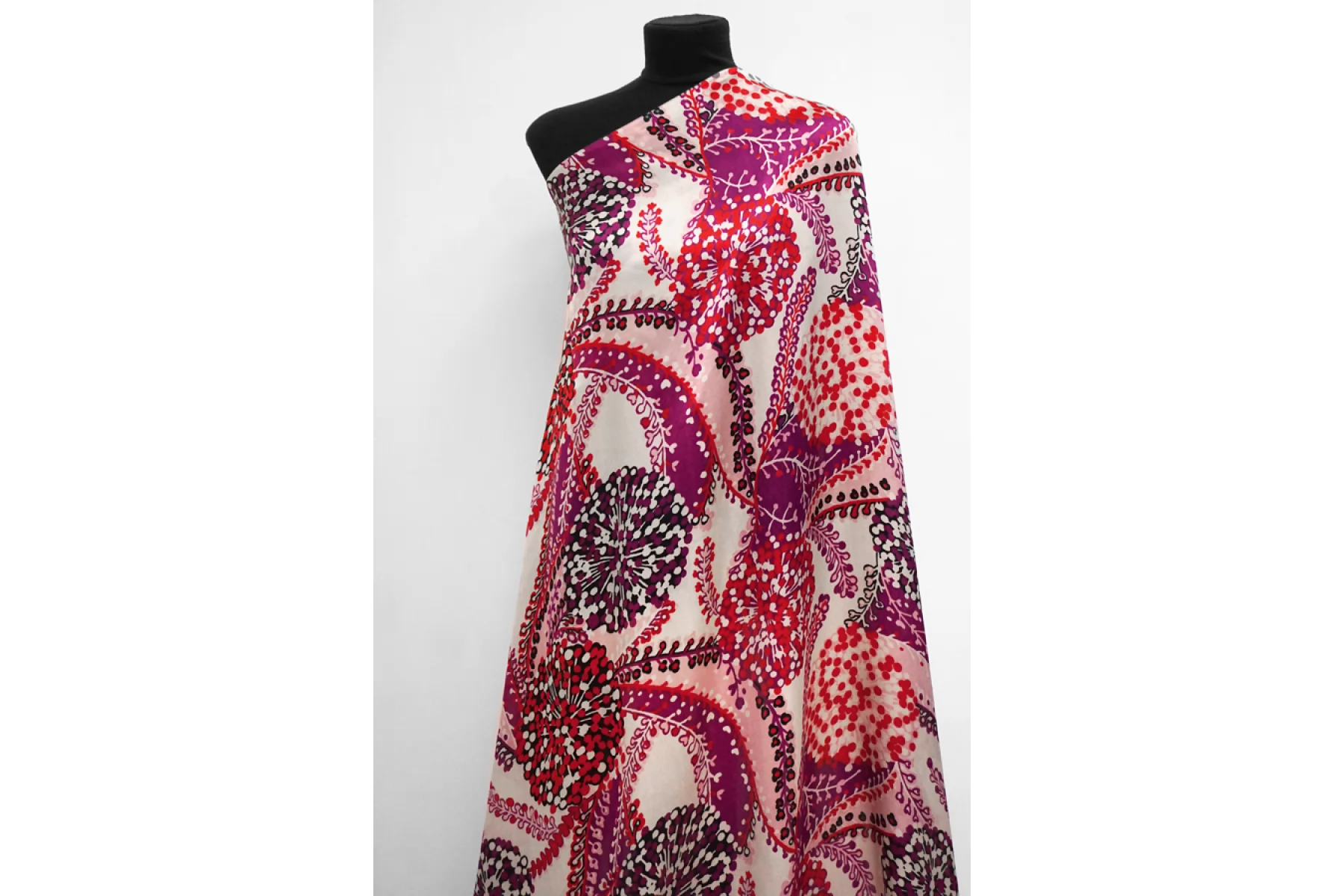Итальянский шелковый атлас сатинового плетения от Max Mara с принтом в виде асбтрактных цветов и листьев довольно крупного размера в цветах: фуксия, черный, розовый, красный. Поверхность материала гладкая и скользящая. Ткань легкая и летящая. Форму не держит. Не тянется, но слегка пружинит за счет плетения. Красиво струится. Просвечивает силуэт на просвет. Практически не мнется. Отличный вариант на летние платья, блузки и юбки. При необходимости используйте подкладочный материал. Уход, как и за любым шелком, деликатный.