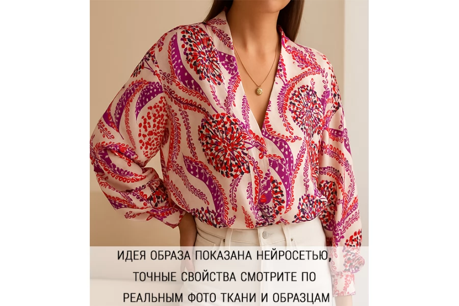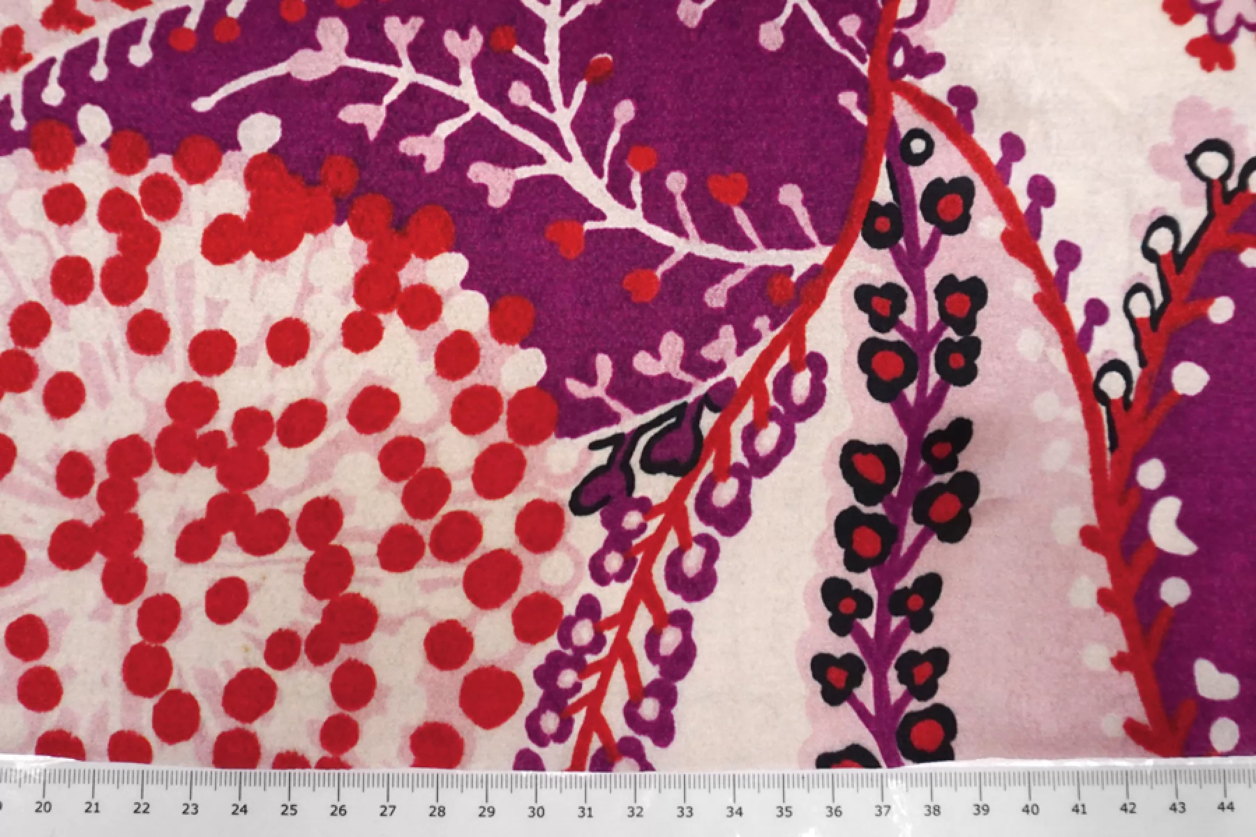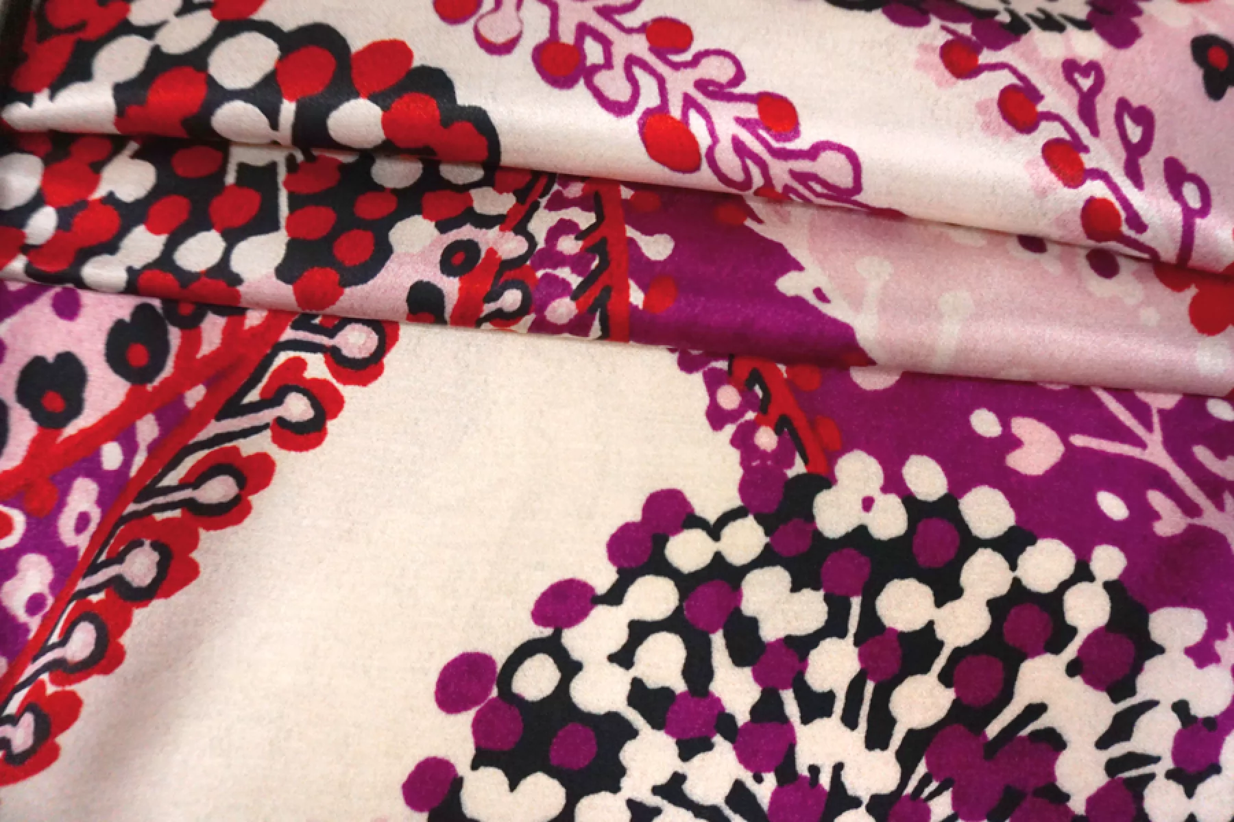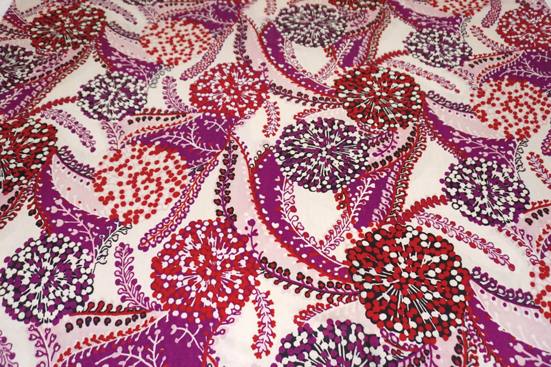 Итальянский шелковый атлас сатинового плетения от Max Mara с принтом в виде асбтрактных цветов и листьев довольно крупного размера в цветах: фуксия, черный, розовый, красный. Поверхность материала гладкая и скользящая. Ткань легкая и летящая. Форму не держит. Не тянется, но слегка пружинит за счет плетения. Красиво струится. Просвечивает силуэт на просвет. Практически не мнется. Отличный вариант на летние платья, блузки и юбки. При необходимости используйте подкладочный материал. Уход, как и за любым шелком, деликатный.
