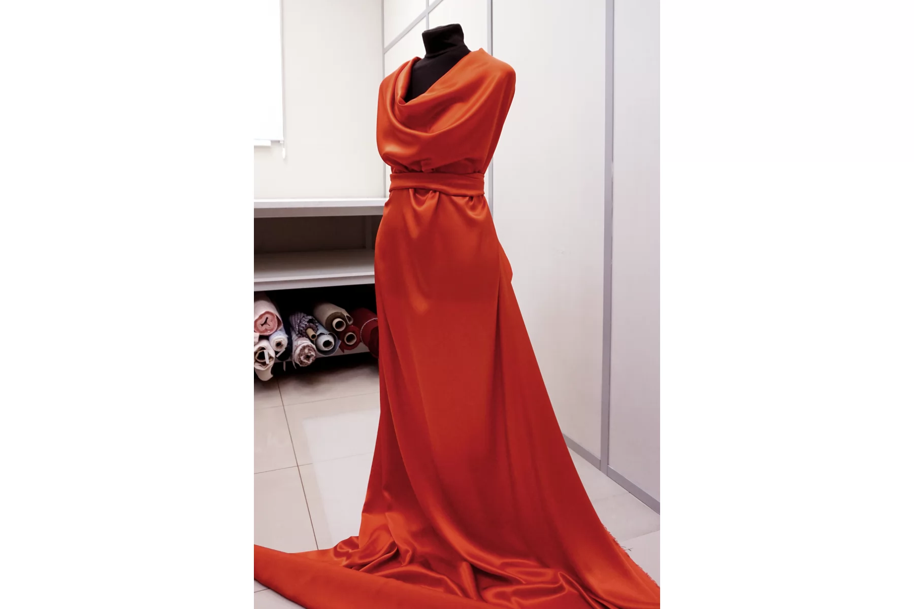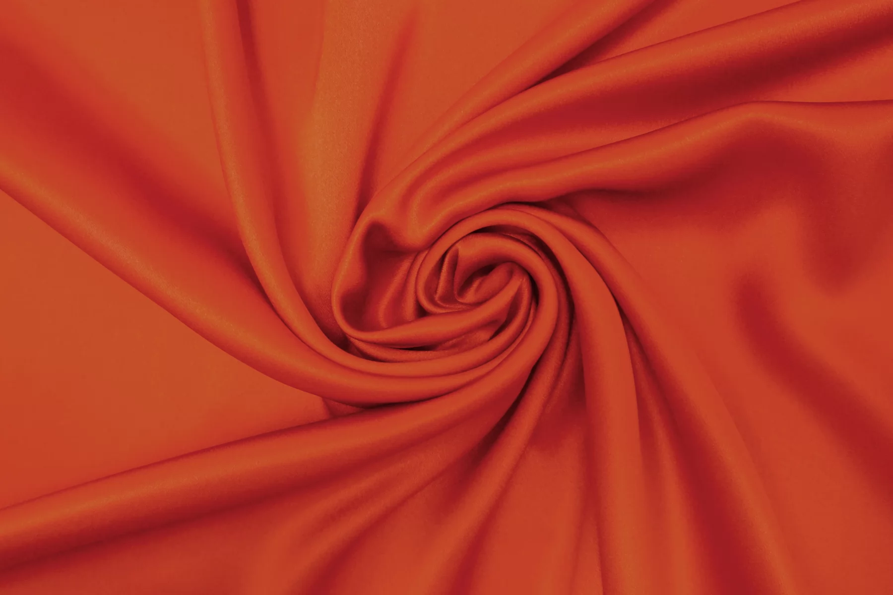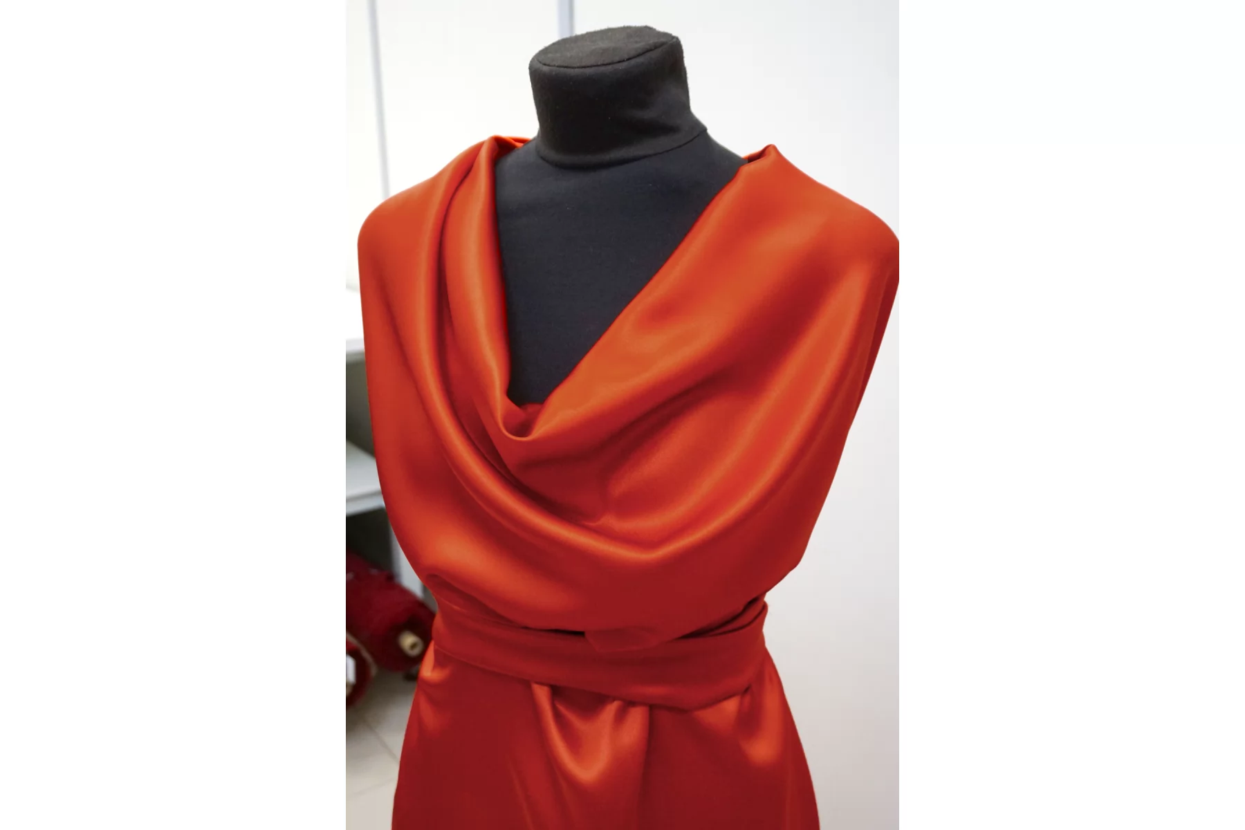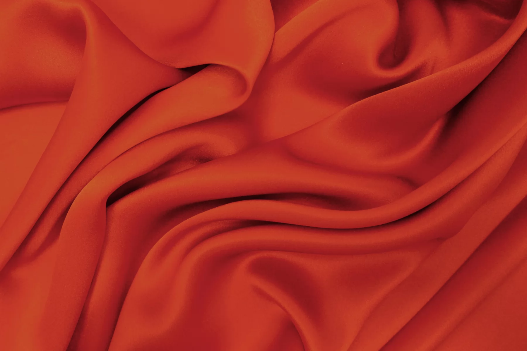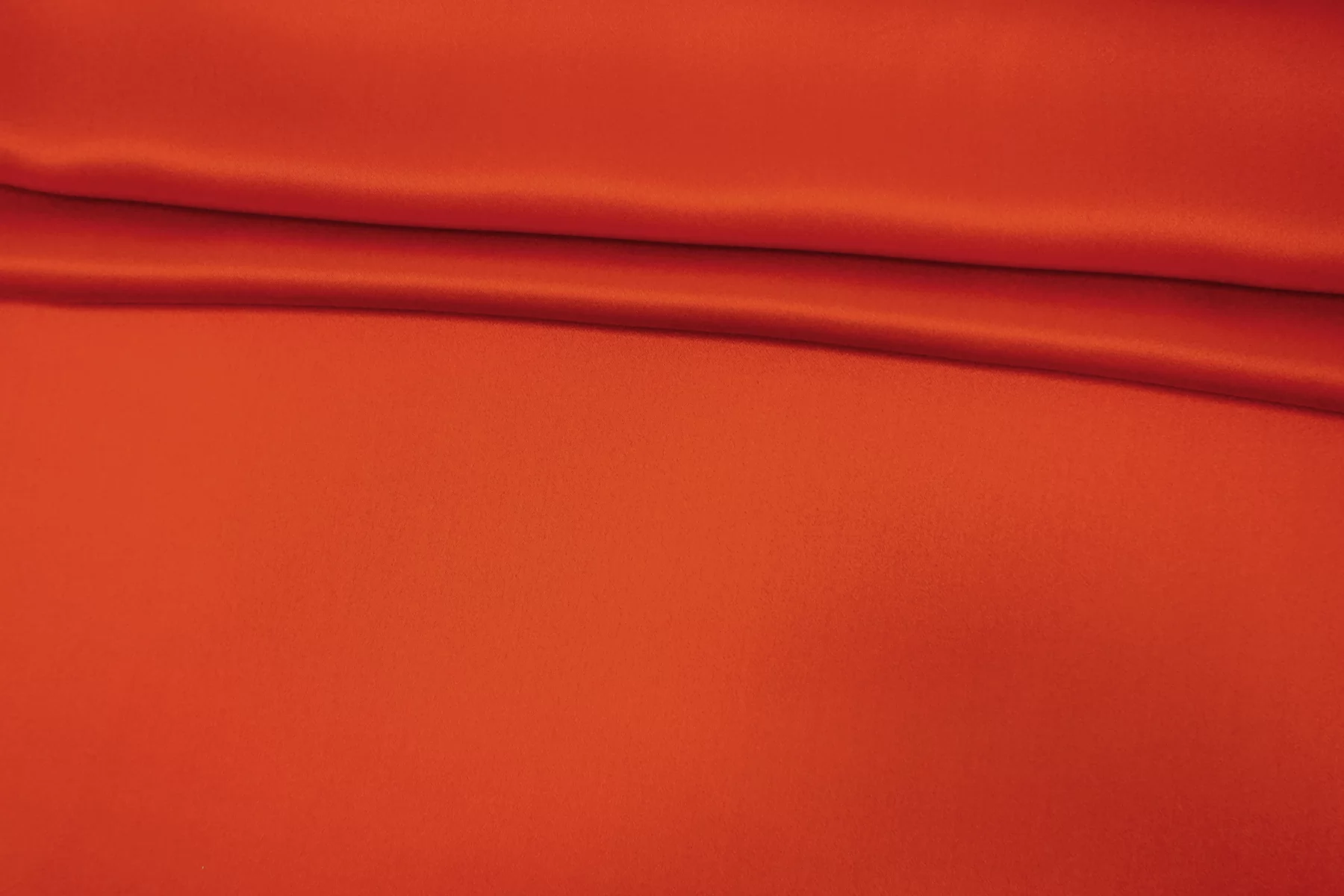 Шикарный плательно-блузочный атлас из шелка в ярком, насыщенном красном цвете с тёплым, оранжевым подтоном. Гладкая, скользящая, очень приятная тактильно лицевая сторона. Не тянется. Немного просвечивает. Практически не мнется. Форму не держит. Шьем нарядные платья, топы, нарядные блузки. Обязательно учитывайте усадку 5-10%