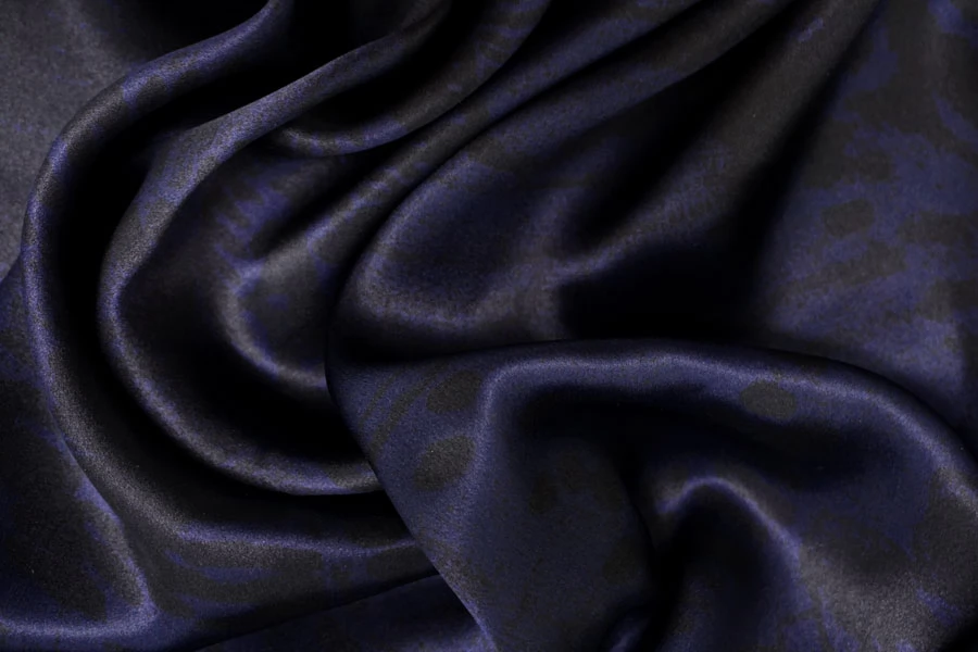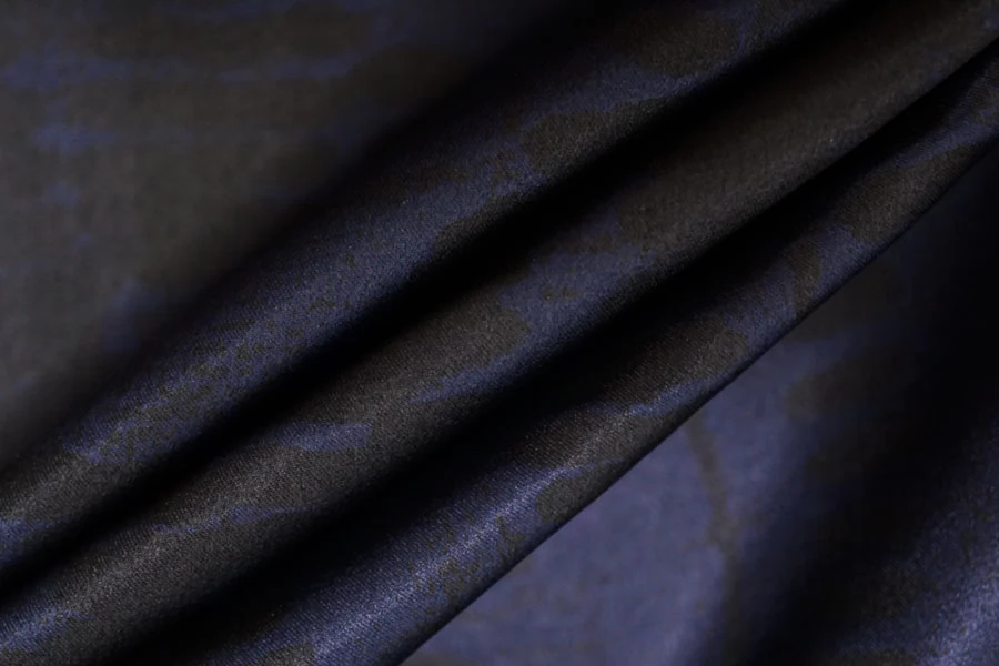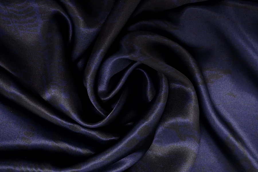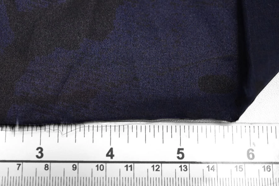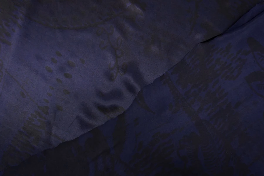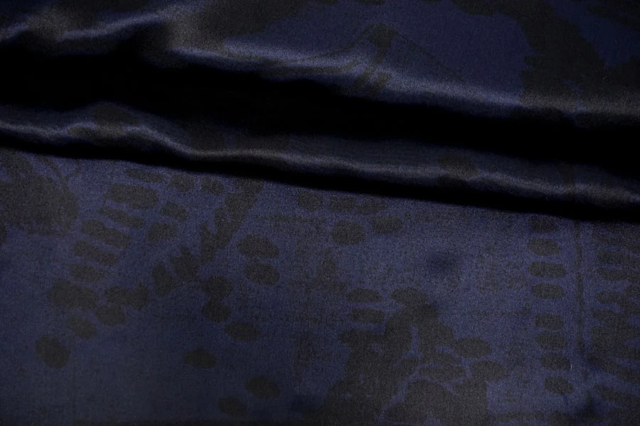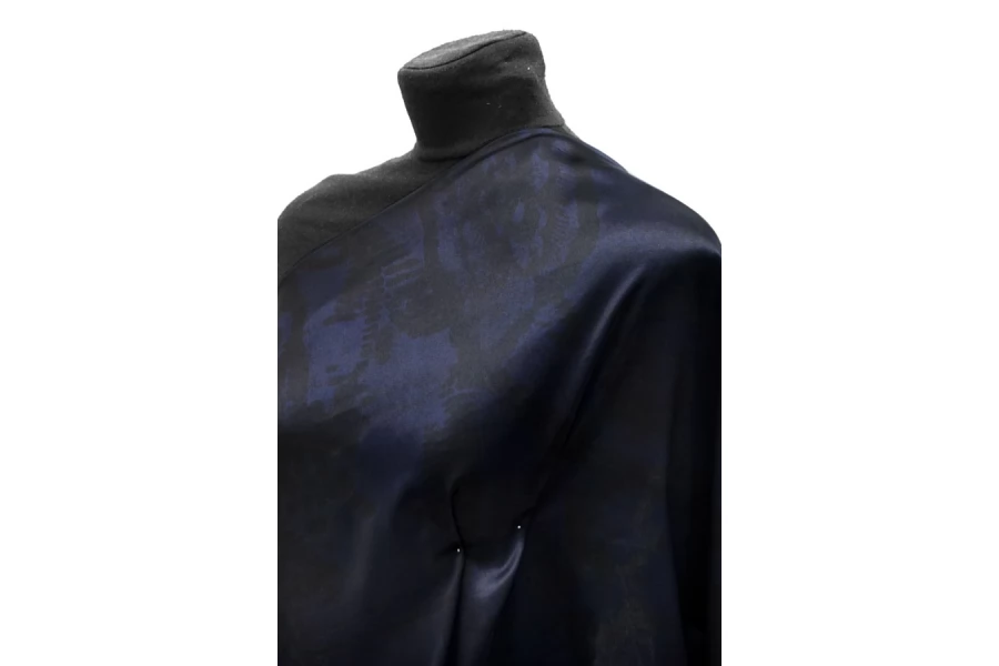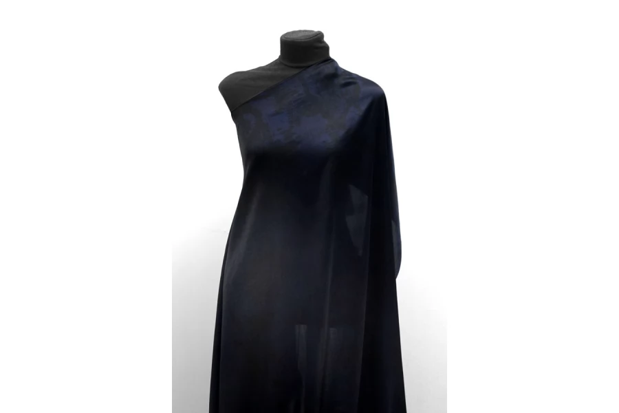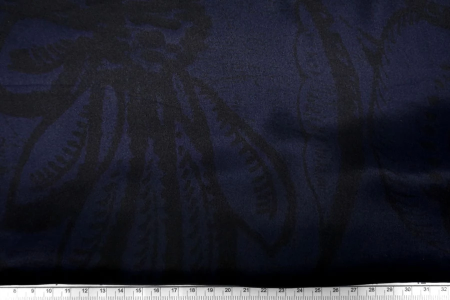 Шикарный шёлк с цветочным принтом чёрного цвета на тёмном синем фоне (принт еле заметен). Блеск между атласом и сатином. Очень приятный и мягкий, гладкий. Струящийся, пластичный. Не тянется. Просвечивает в один слой. Мнется слабо. Форму не держит, но красиво смотрится в драпировке. Прекрасный легкий вариант на блузки, платья и юбки, костюмы в пижамном стиле, кимоно. Уход за шёлком деликатный.