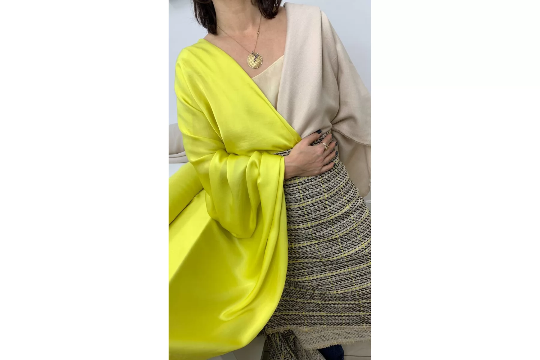 Плательно-блузочный вискозный атлас лимонного оттенка с легким салатовым подтоном. Тонкий, мягкий, пластичный, гладкий и приятный. Красиво струится. Прослеживается силуэт. С нежным лоском. Не тянется. Сминается, но не слишком сильно. Форму не держит. Шьем платья в бельевом стиле, юбки, блузки и не только. Обязательно учитывайте усадку 5-10%.
