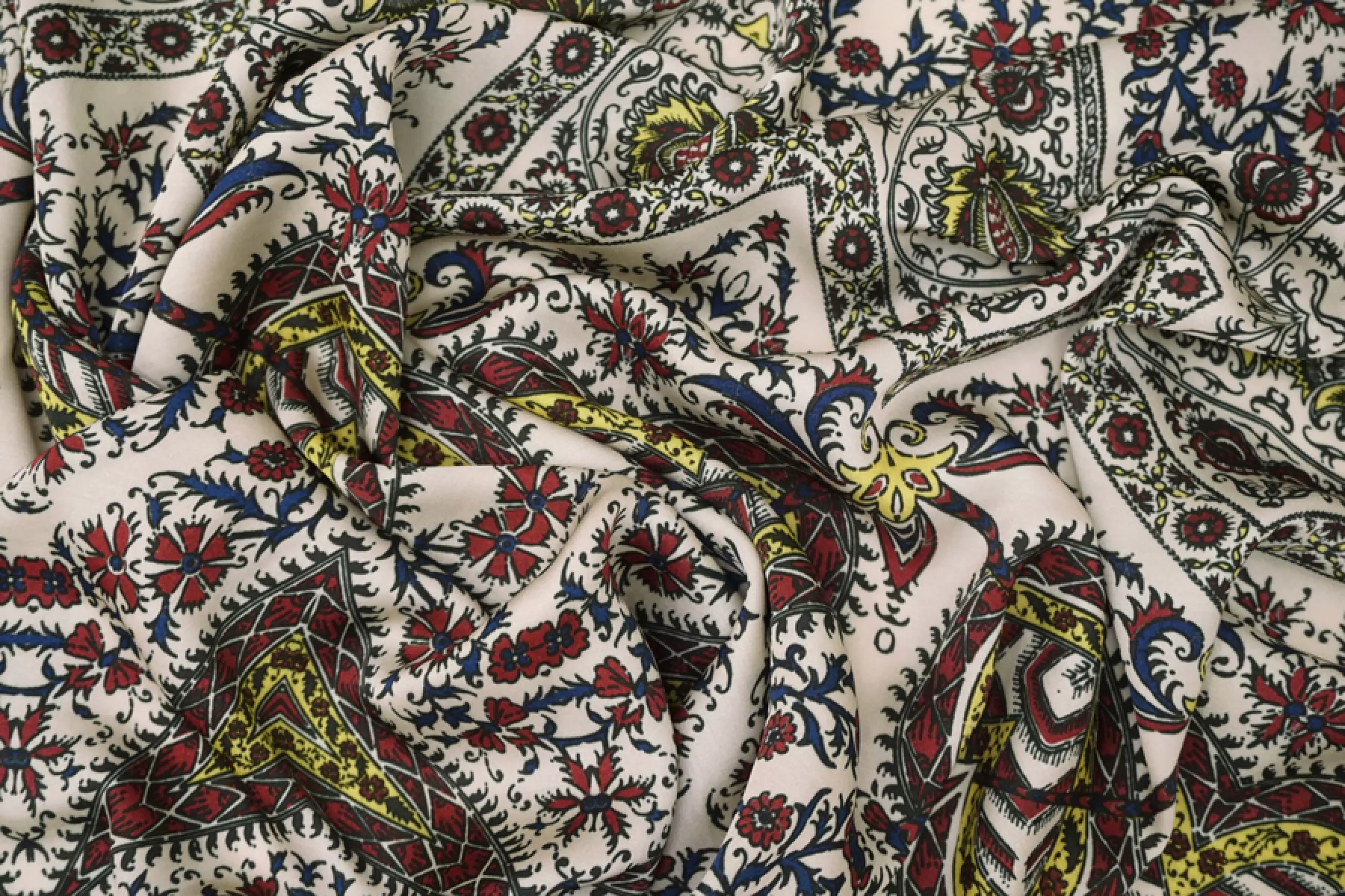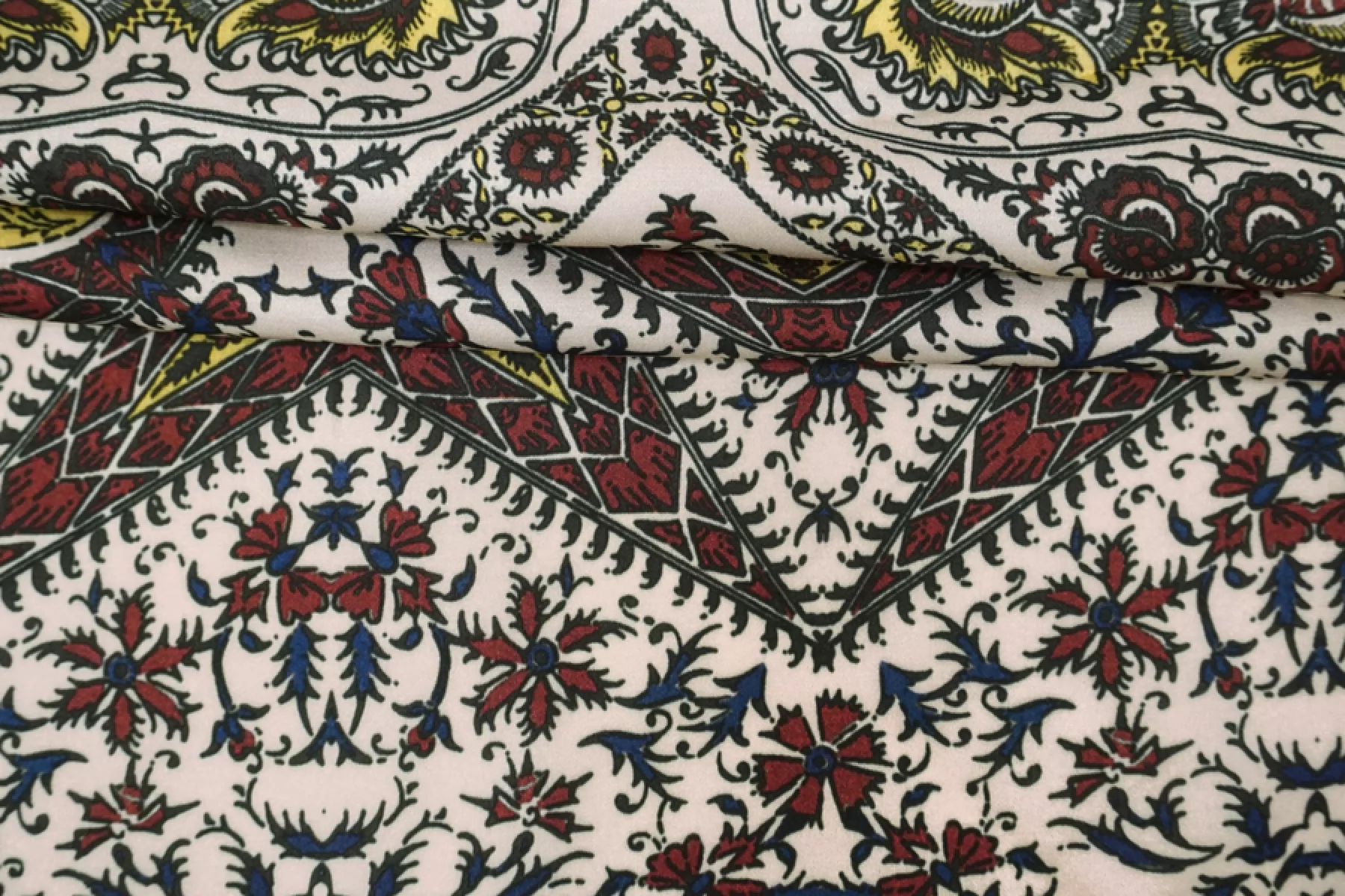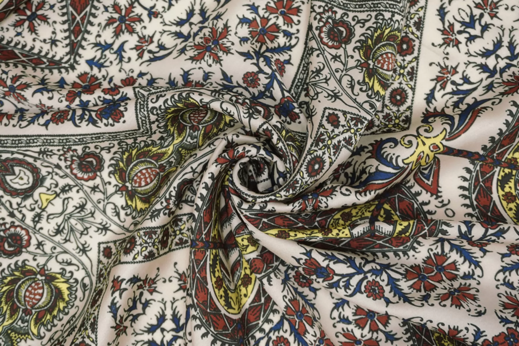 Красивый блузочный вискозный атлас молочно-бежевого цвета с принтом отличного качества, напоминающий геральдический орнамент, в черно-сине-бордовой цветовой гамме. Тактильно приятный, гладкий и очень мягкий. Струящийся, легкий и летящий. Не тянется. Лицевая сторона обладает красивым лоском, обратная - матовая. Слегка просвечивает силуэт, если смотреть прямо на просвет. Шьем платья, блузки, юбки и одежду в бельевом стиле. Смотрится очень стильно! При необходимости используйте подкладочный материал. Обязательно учитывайте усадку 5-10%. Советуем шить тонкой иглой