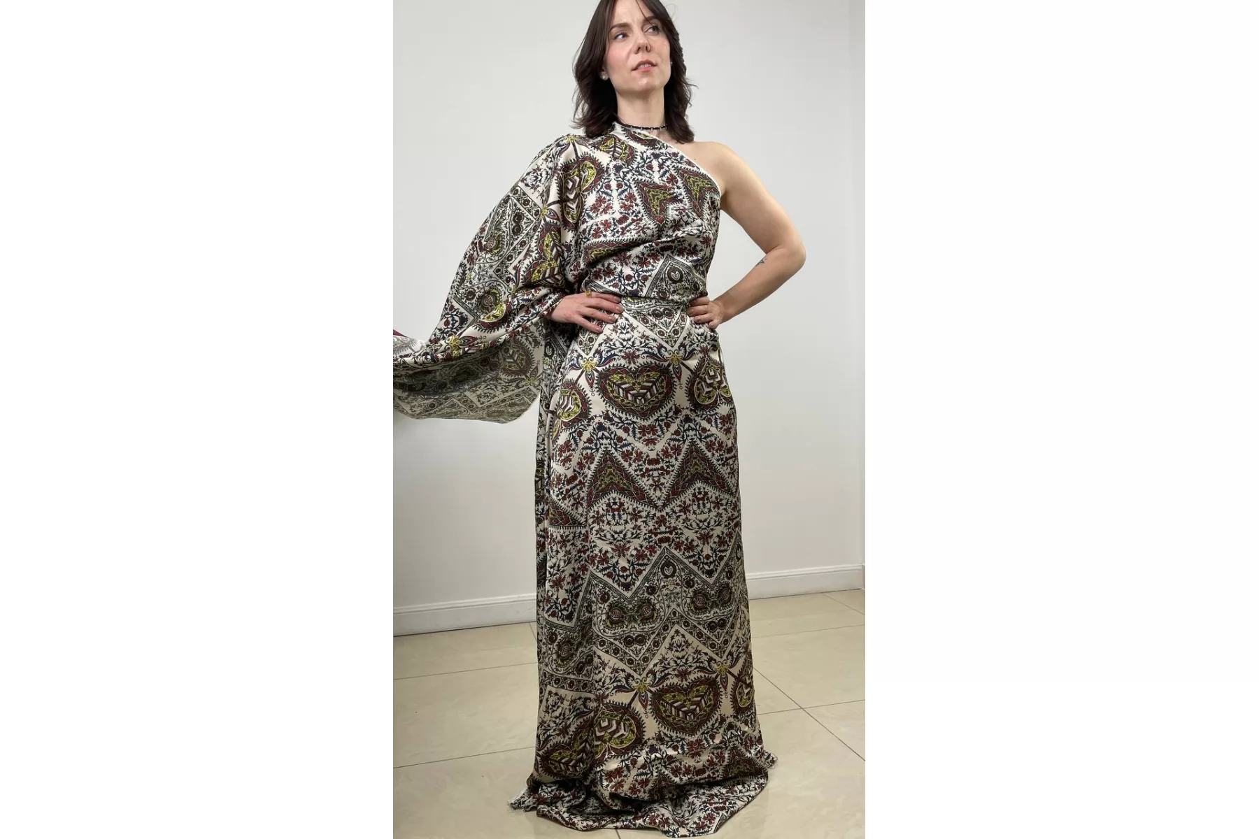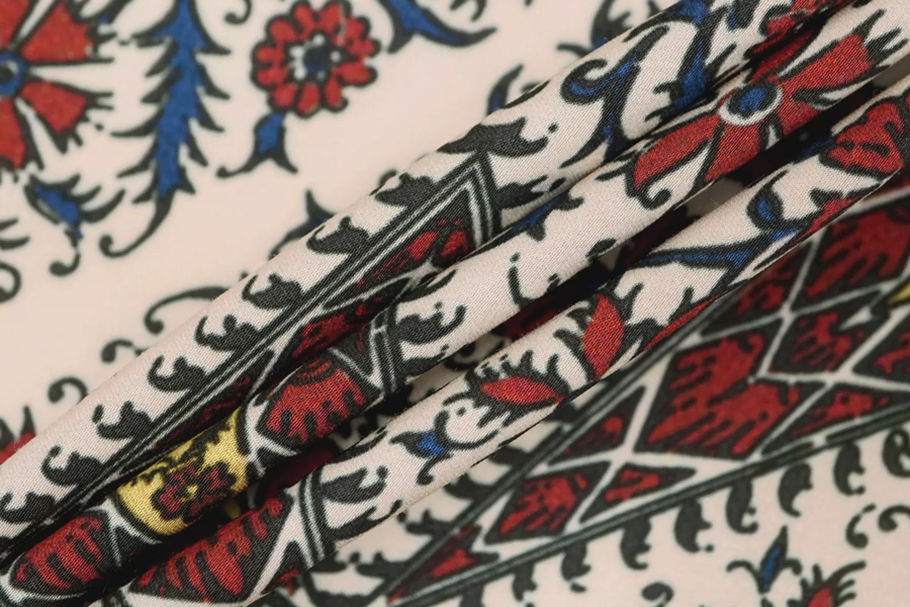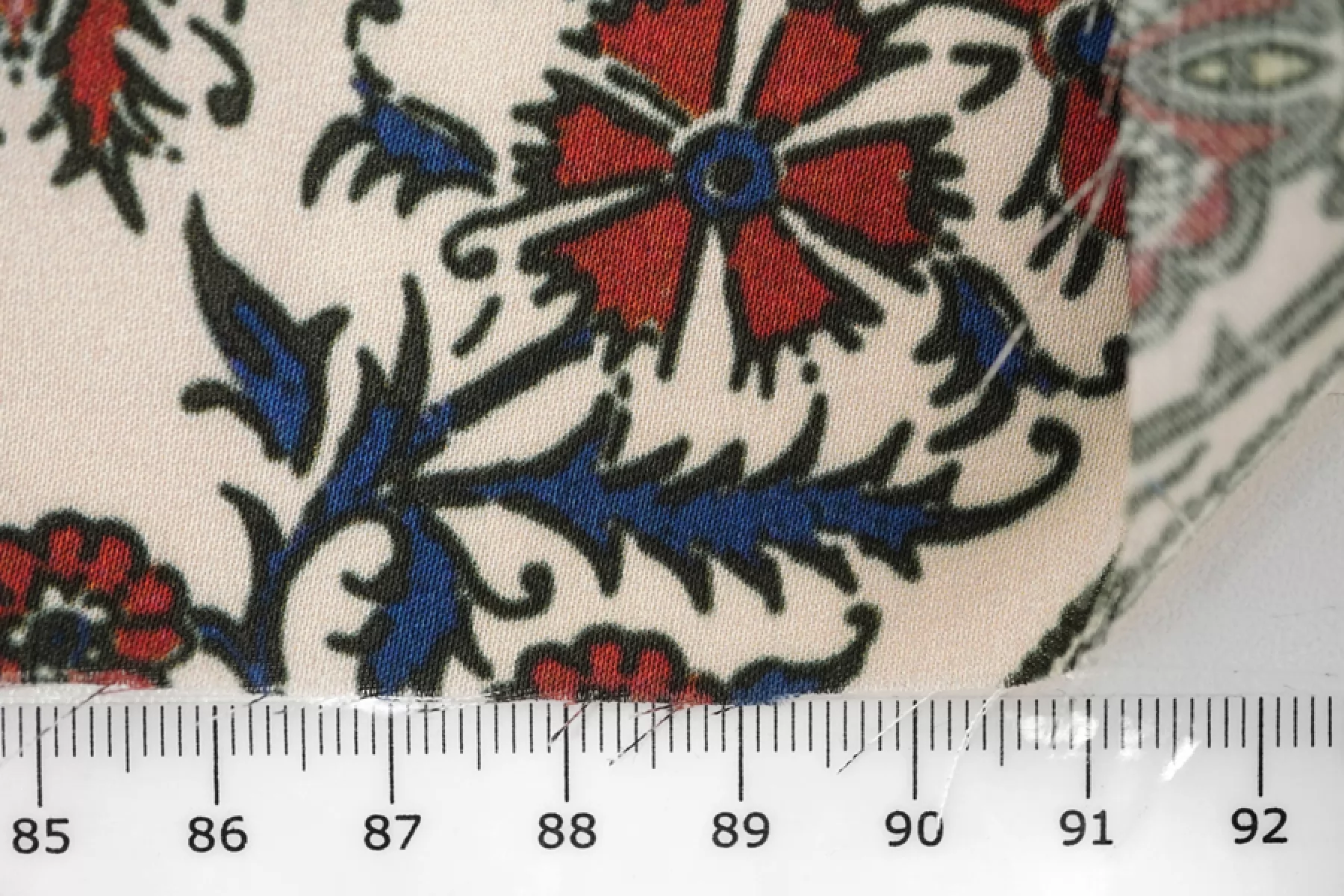 Красивый блузочный вискозный атлас молочно-бежевого цвета с принтом отличного качества, напоминающий геральдический орнамент, в черно-сине-бордовой цветовой гамме. Тактильно приятный, гладкий и очень мягкий. Струящийся, легкий и летящий. Не тянется. Лицевая сторона обладает красивым лоском, обратная - матовая. Слегка просвечивает силуэт, если смотреть прямо на просвет. Шьем платья, блузки, юбки и одежду в бельевом стиле. Смотрится очень стильно! При необходимости используйте подкладочный материал. Обязательно учитывайте усадку 5-10%. Советуем шить тонкой иглой