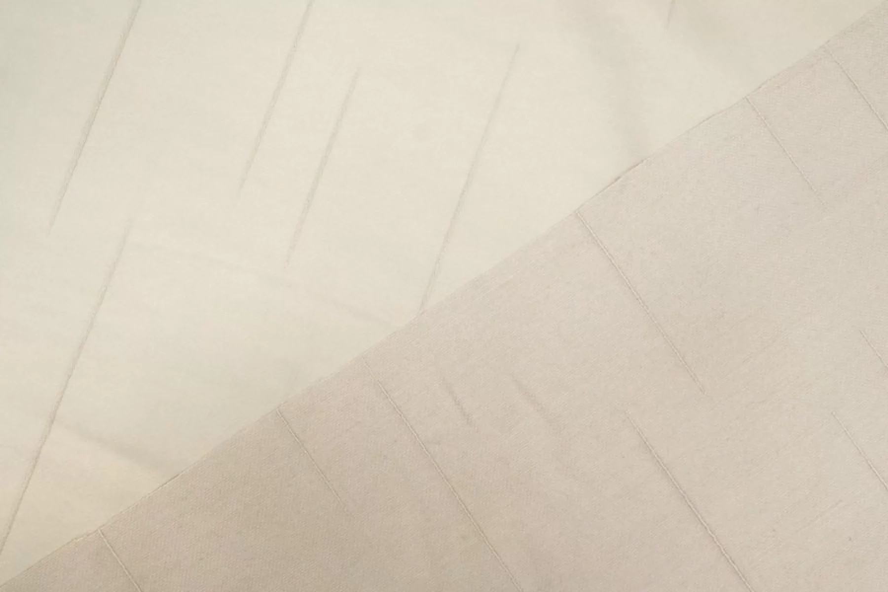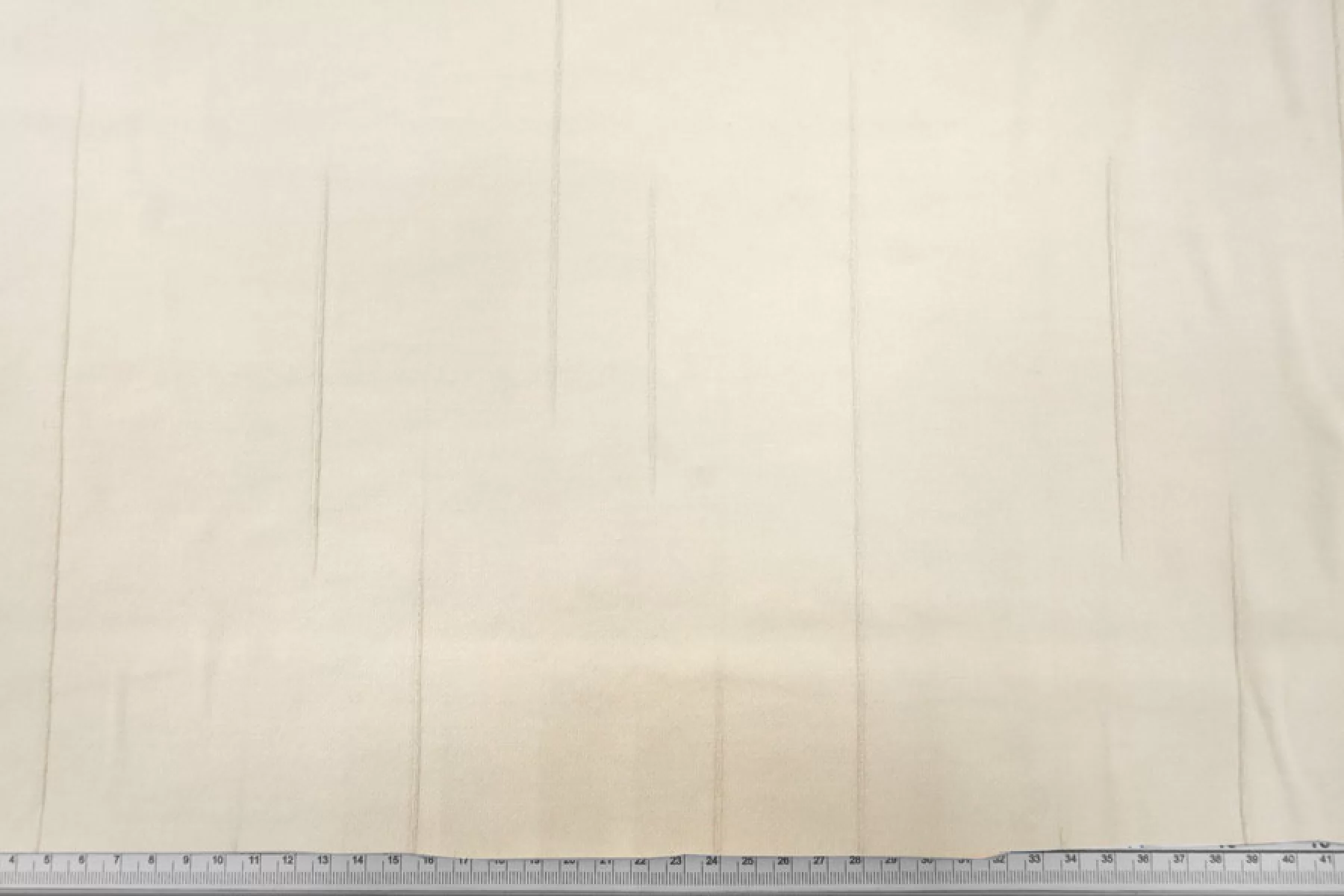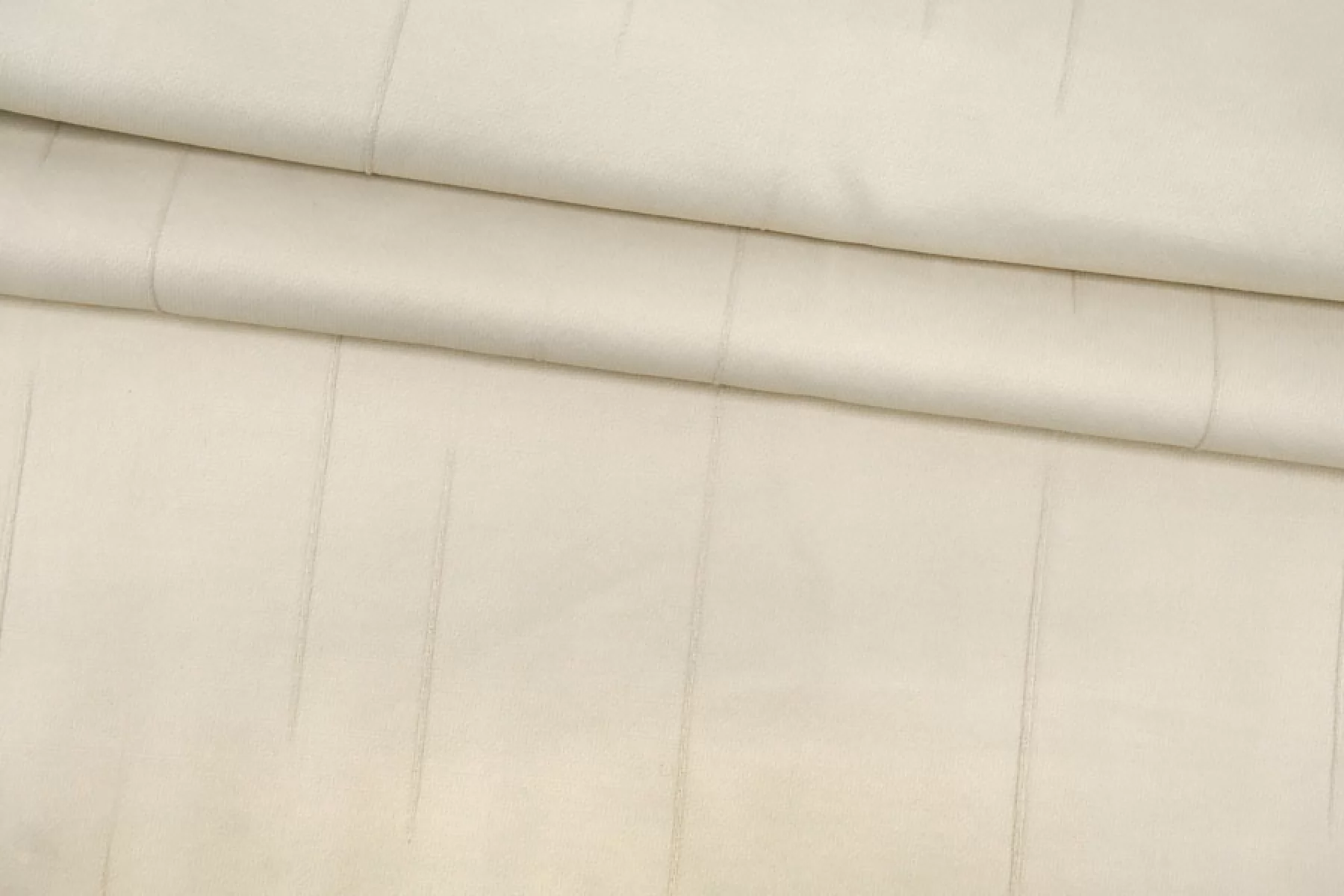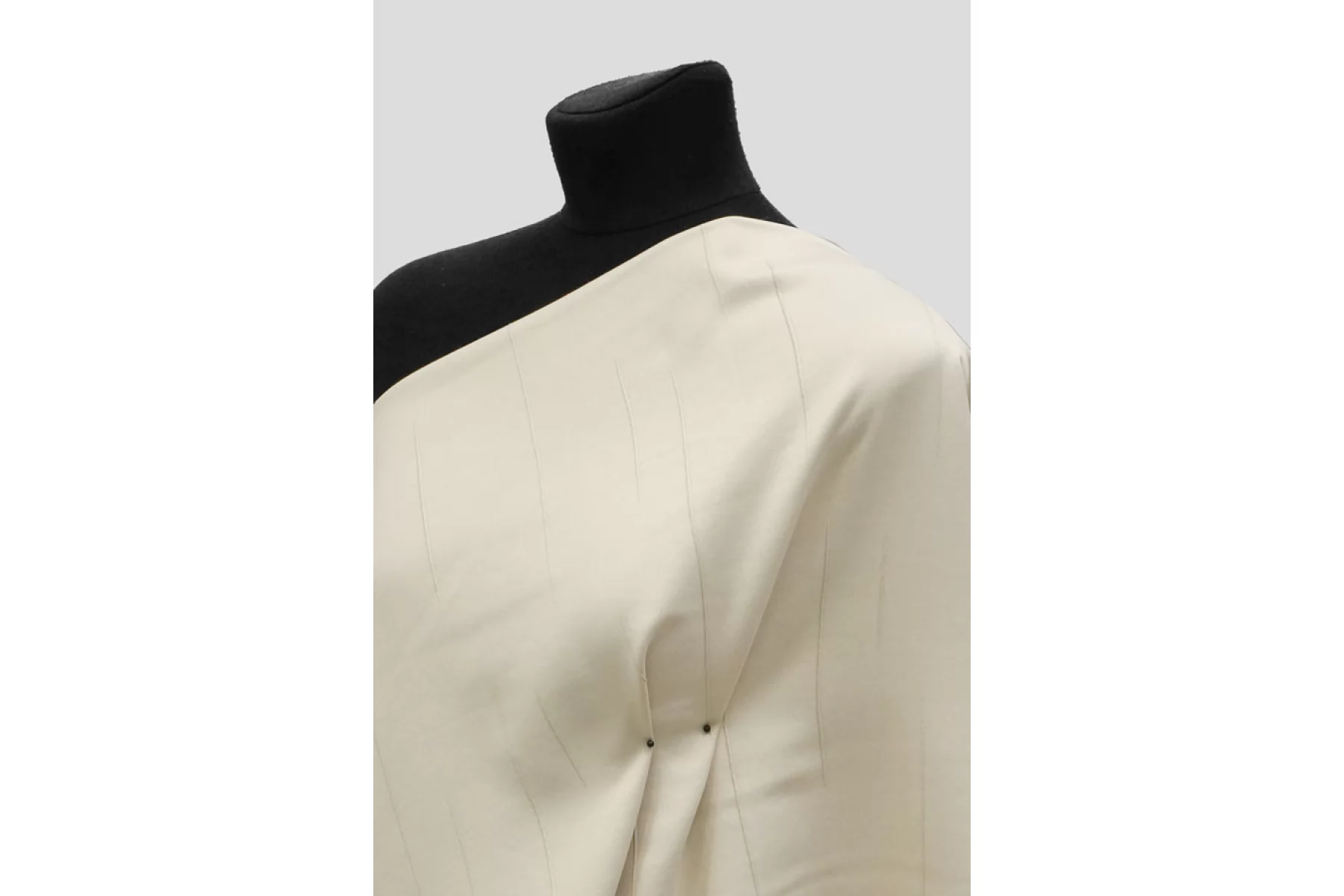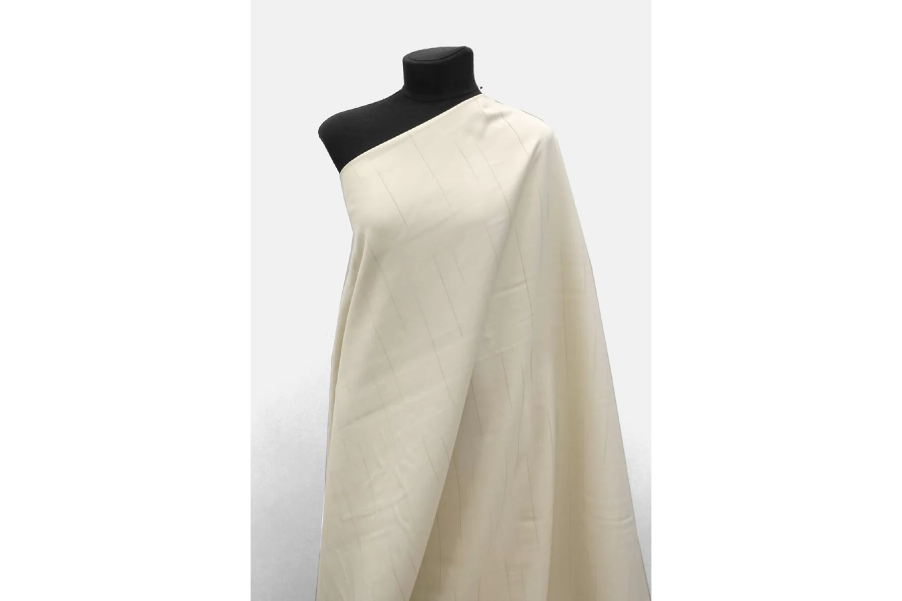 Необычная фактурная вискоза на шерсти в красивом оттенке молочный экрю (светлый бежевато-молочный). С выступающими рельефными узкими полосами. Лицевая часть это вискоза по плетению близкая к атласу, изнанка шерстяная. Изнанка суховатая, лицевая сторона гладкая. С легким лоском. Не колется. Красив в пластике. Не тянется. Плотненький. Не просвечивает. Отлично держит форму и красив в складке. Практически не мнется. Шьем костюмы, пиджаки, жакеты, платья и не только. Уход деликатный.