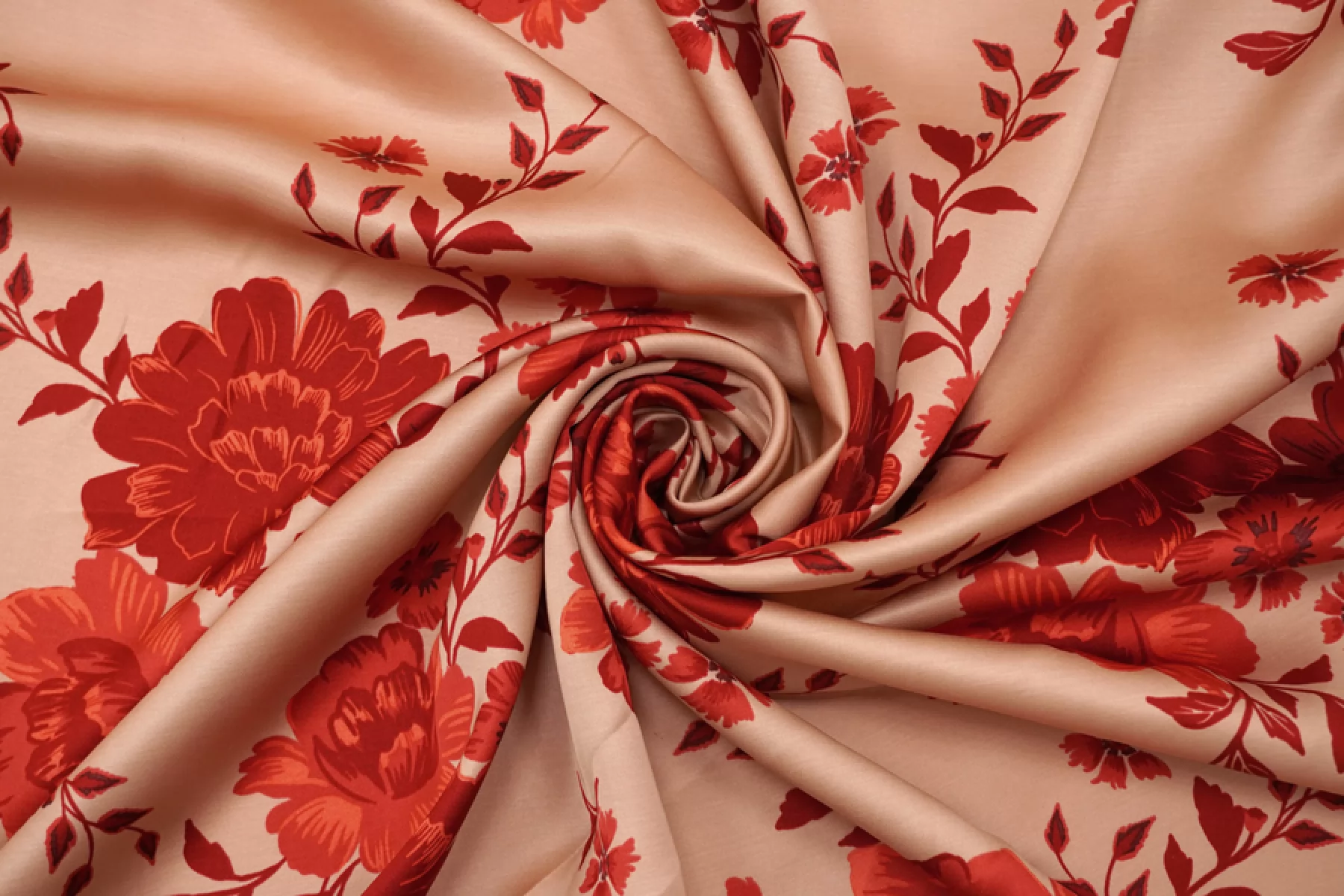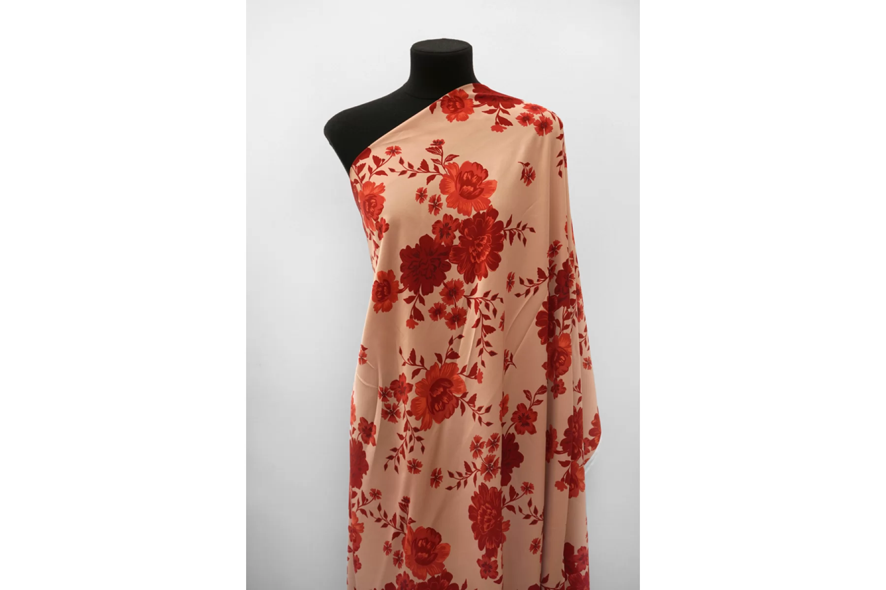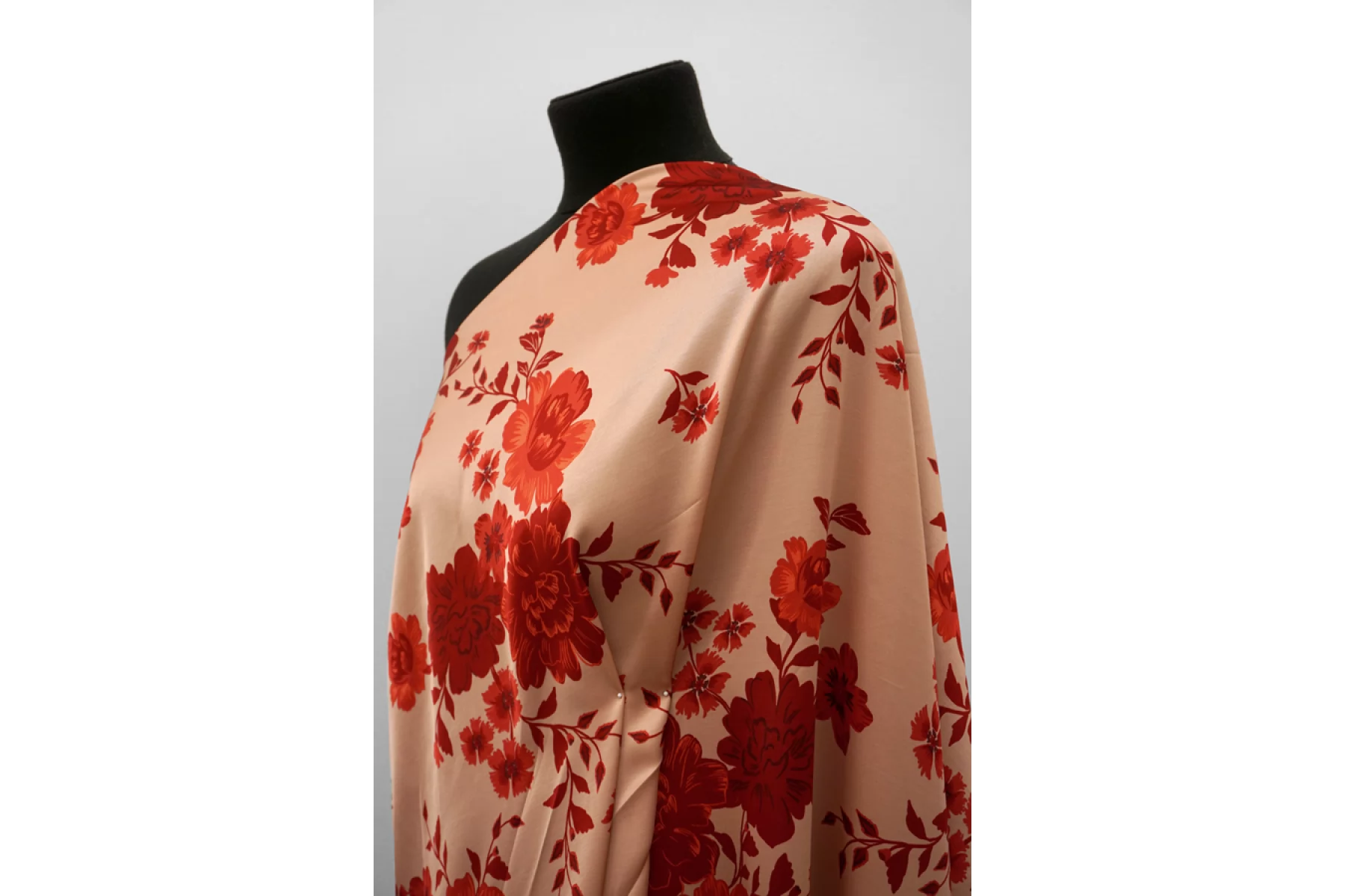 Итальянская вискоза с атласным плетением, принт цветочный в бежево-красных оттенках. Красиво струится, хорошо драпируется, имеет легкий блеск. Пластичная, не тянется. Подойдет на платье (особенно в бельевом стиле), топ, юбку, блузку.