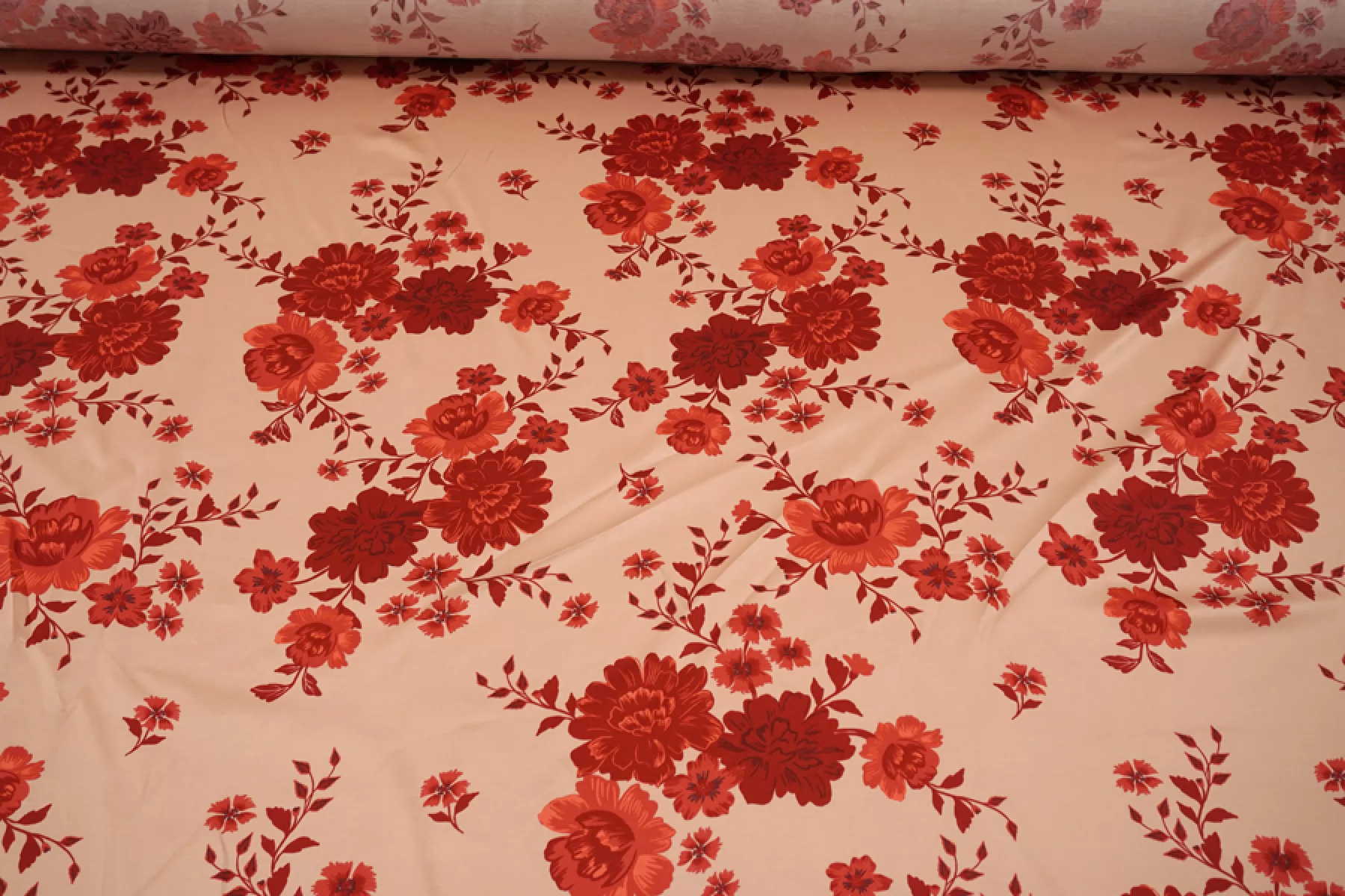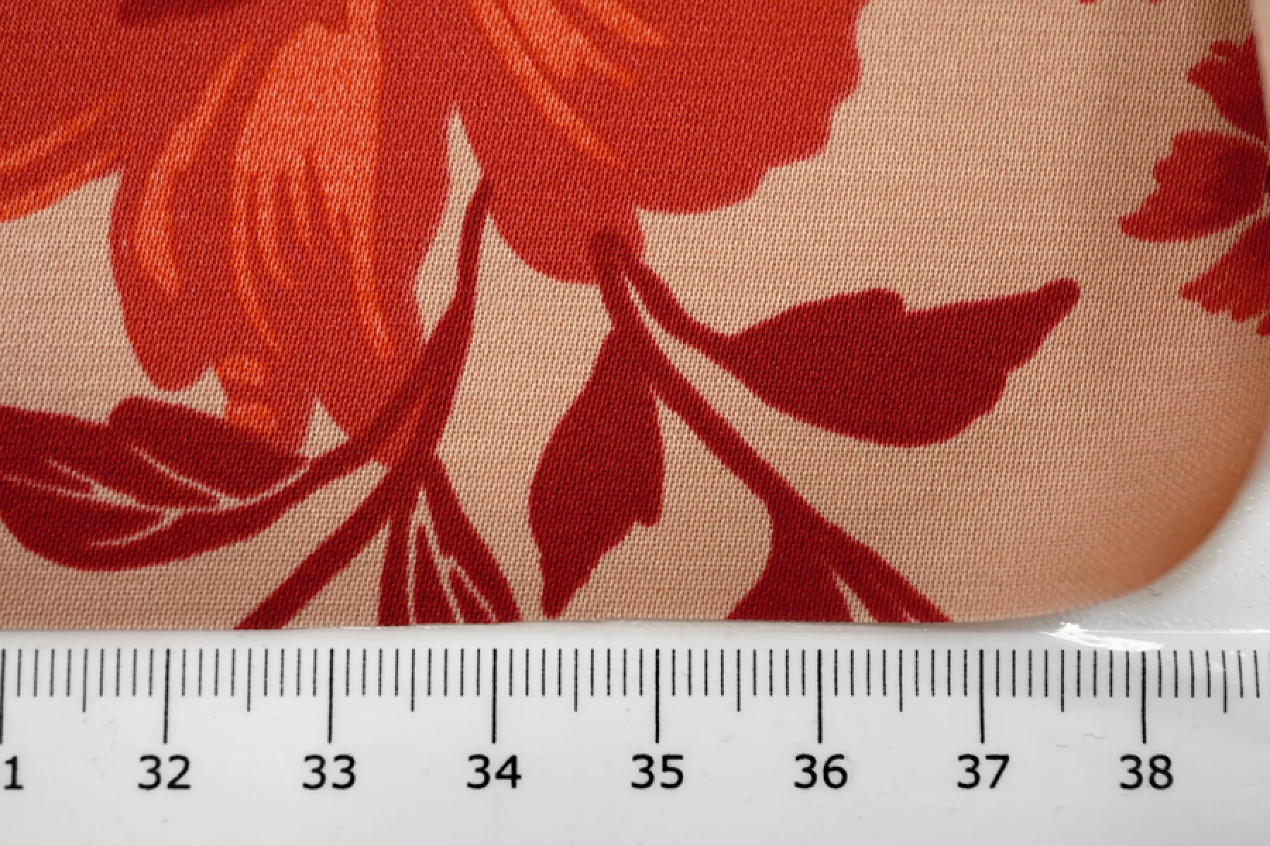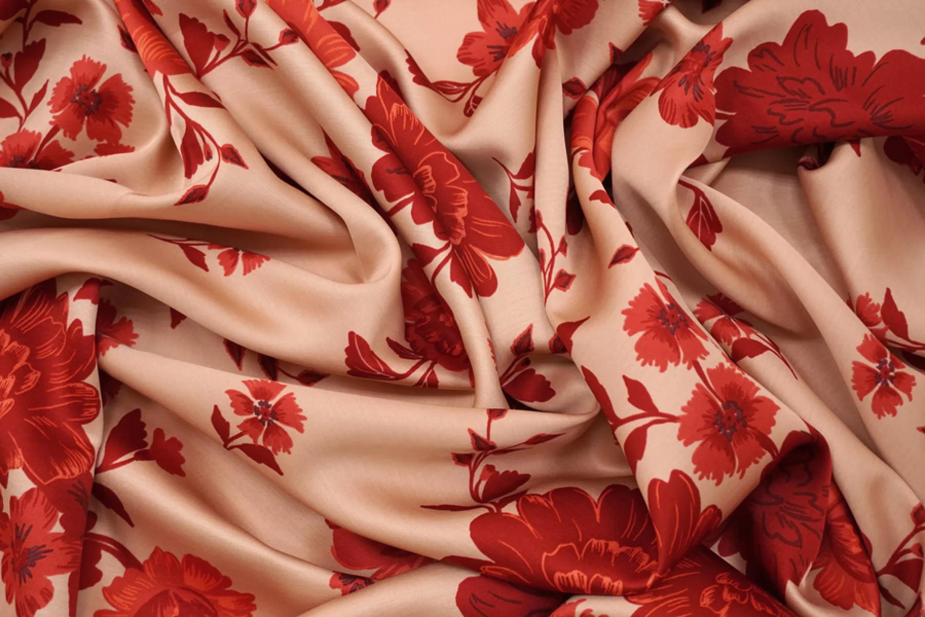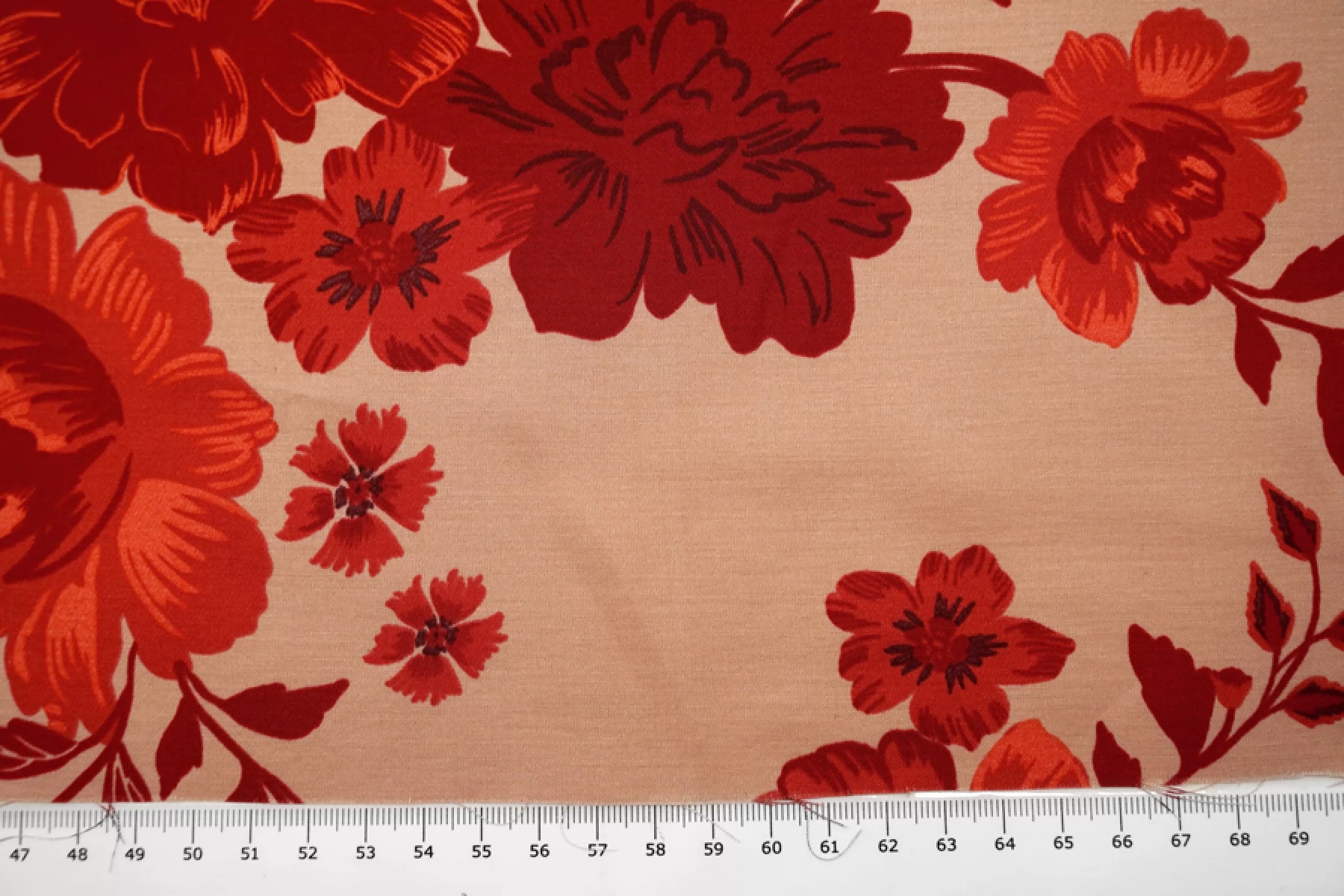 Итальянская вискоза с атласным плетением, принт цветочный в бежево-красных оттенках. Красиво струится, хорошо драпируется, имеет легкий блеск. Пластичная, не тянется. Подойдет на платье (особенно в бельевом стиле), топ, юбку, блузку.