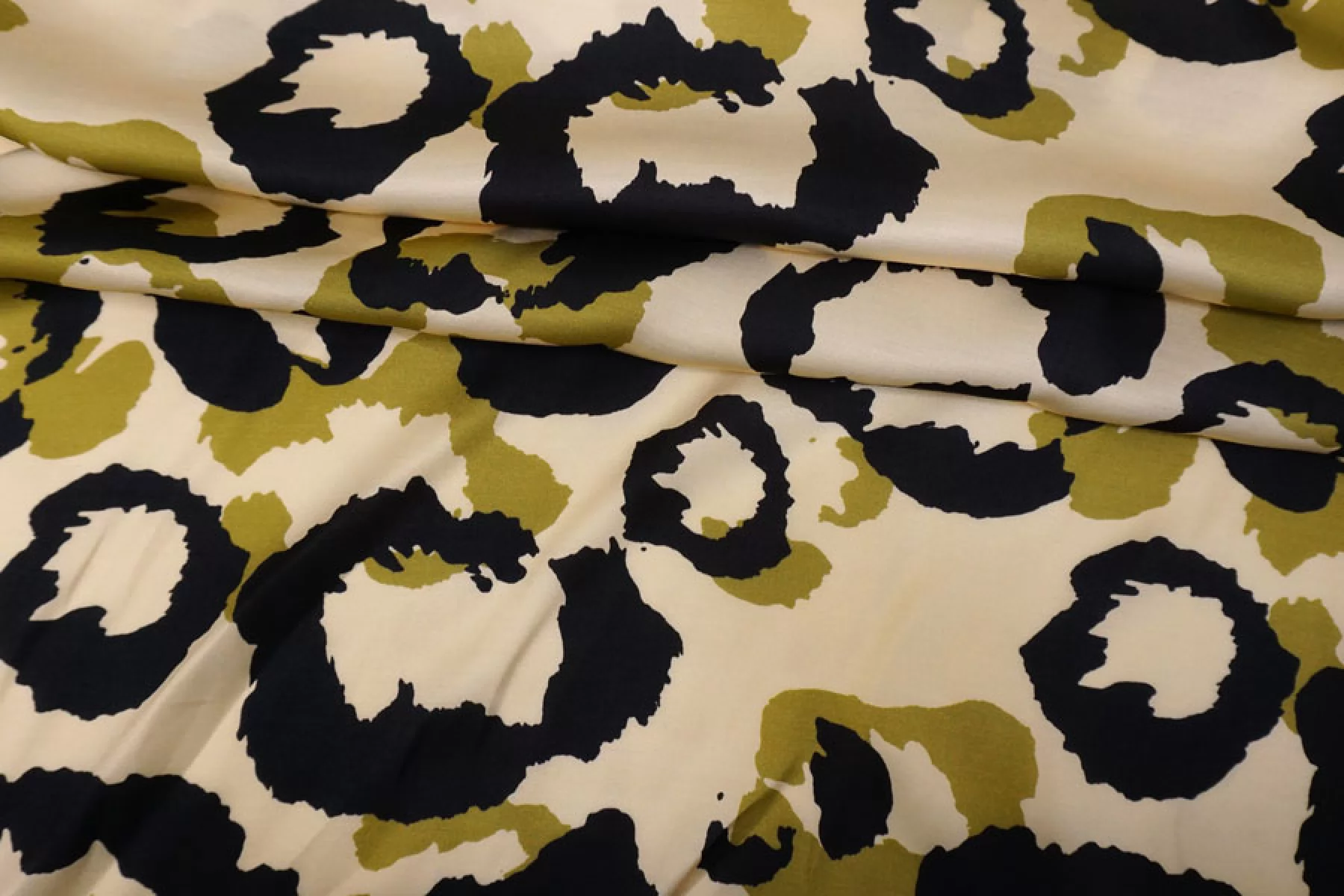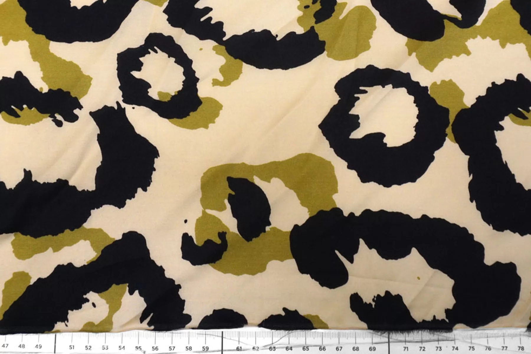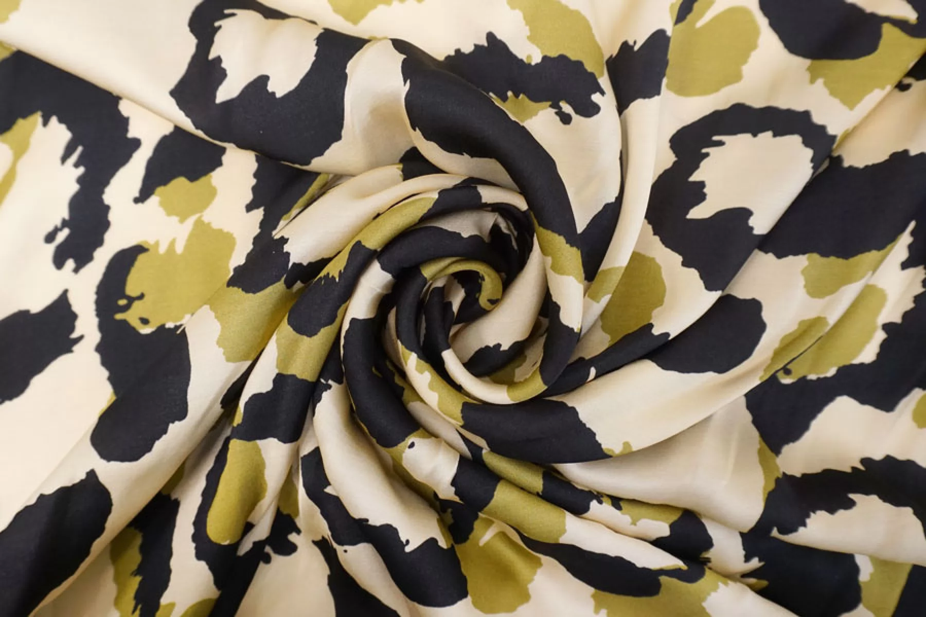 Итальянская атласная плательная вискоза с крупным стилизованным леопардовым принтом черно-зеленого цвета на светло-бежевом фоне. Плотная, но тонкая, легкая, пластичная, с атласным плетением. Слегка просвечивает силуэт. Немного сминается. Не тянется. Подойдет для пошива платья, юбки, туники, блузки, рубашки. При работе с этой тканью советуем использовать тонкие иглы и нитки. Учитывайте усадку материала.
