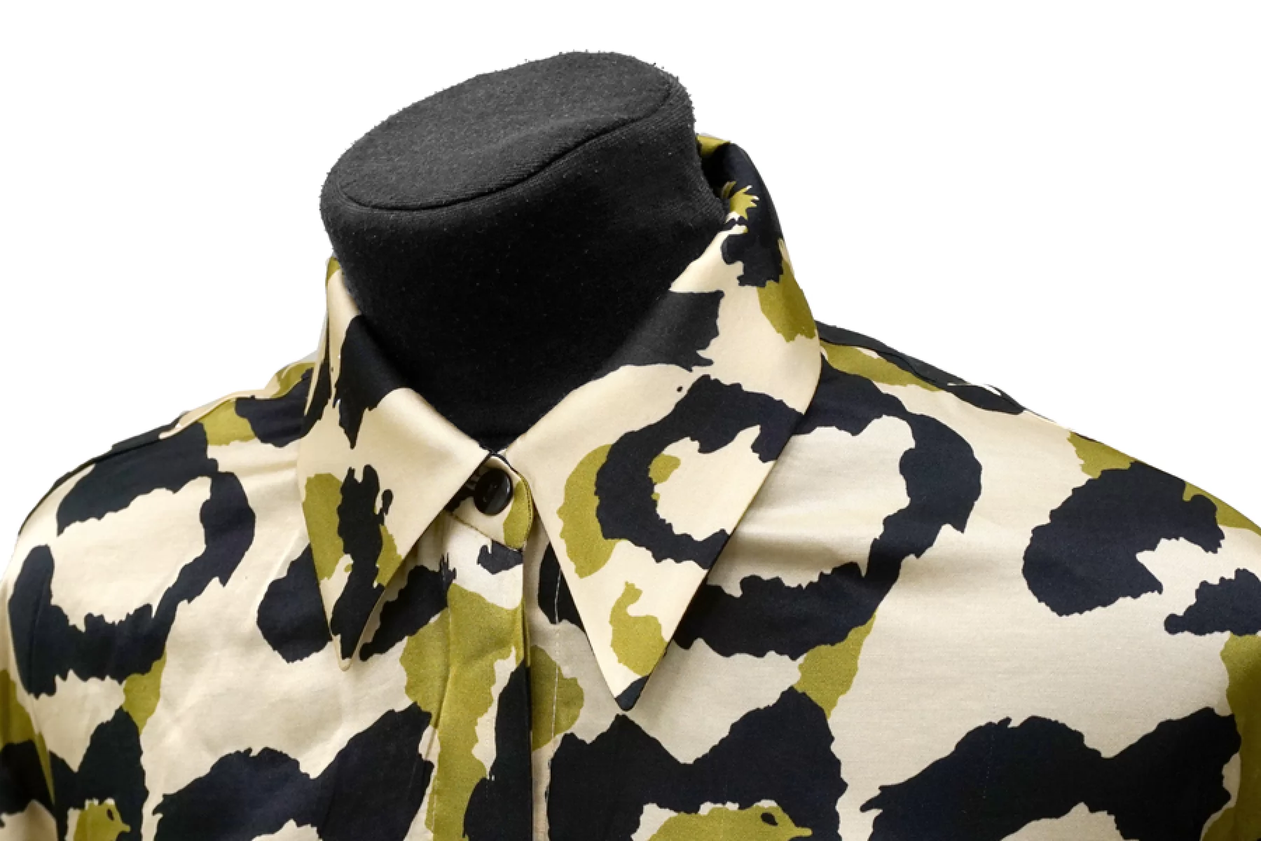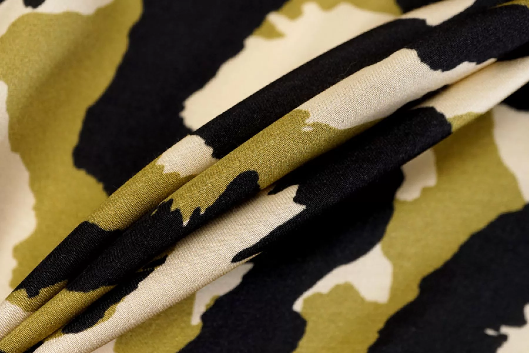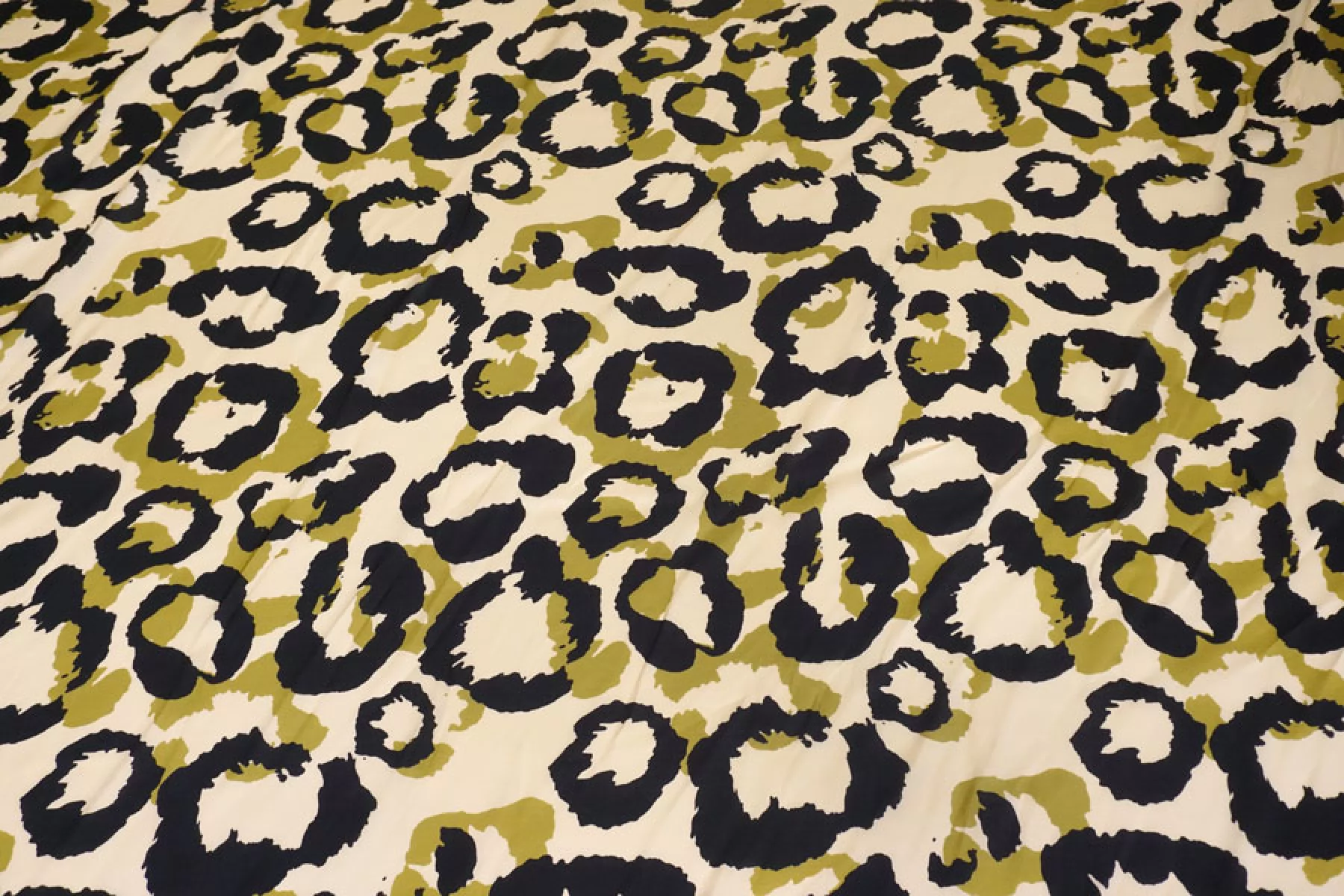 Итальянская атласная плательная вискоза с крупным стилизованным леопардовым принтом черно-зеленого цвета на светло-бежевом фоне. Плотная, но тонкая, легкая, пластичная, с атласным плетением. Слегка просвечивает силуэт. Немного сминается. Не тянется. Подойдет для пошива платья, юбки, туники, блузки, рубашки. При работе с этой тканью советуем использовать тонкие иглы и нитки. Учитывайте усадку материала.