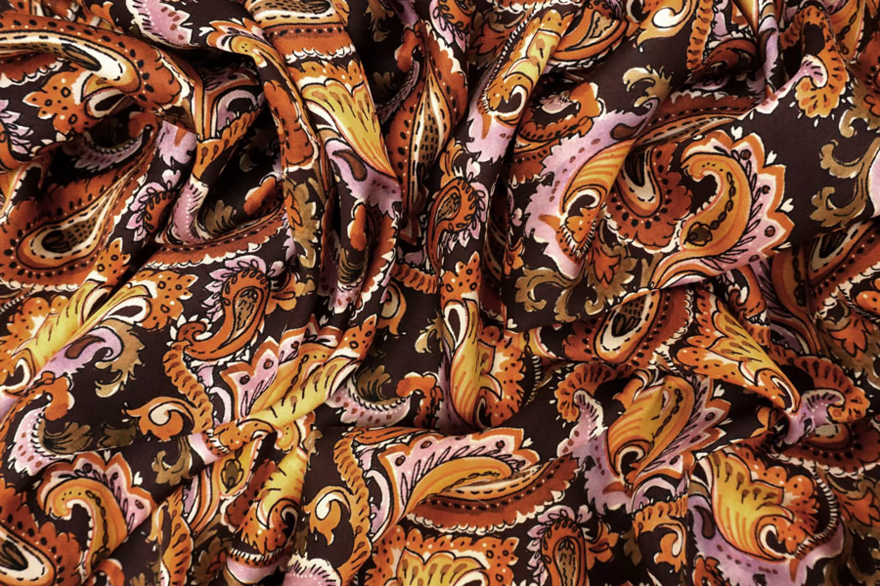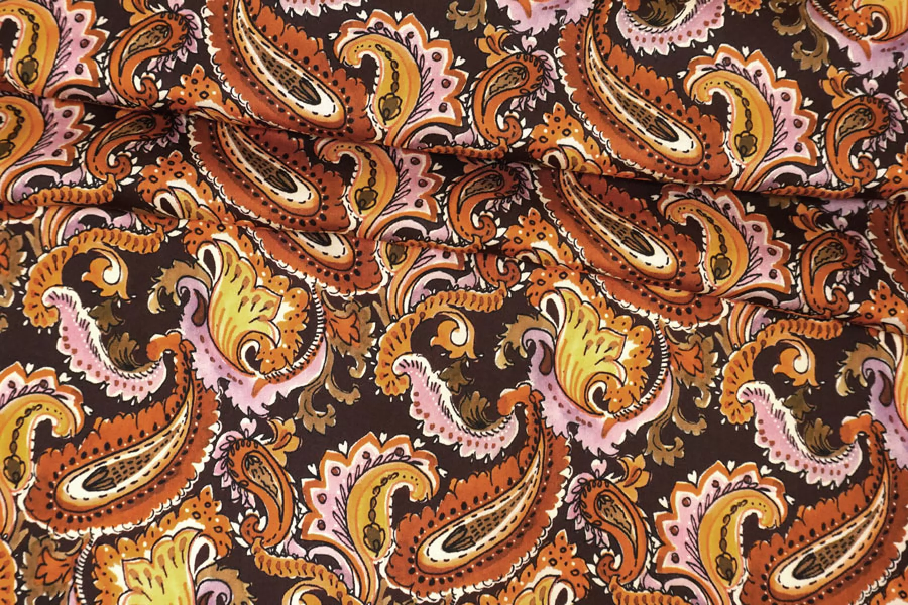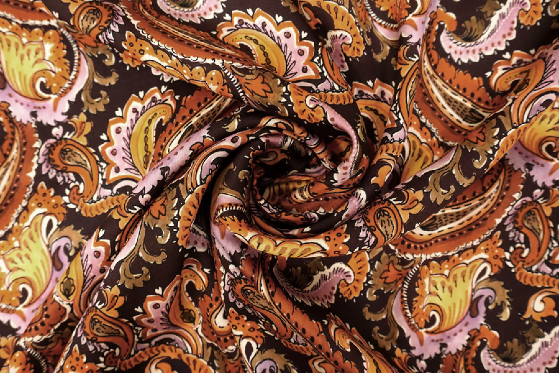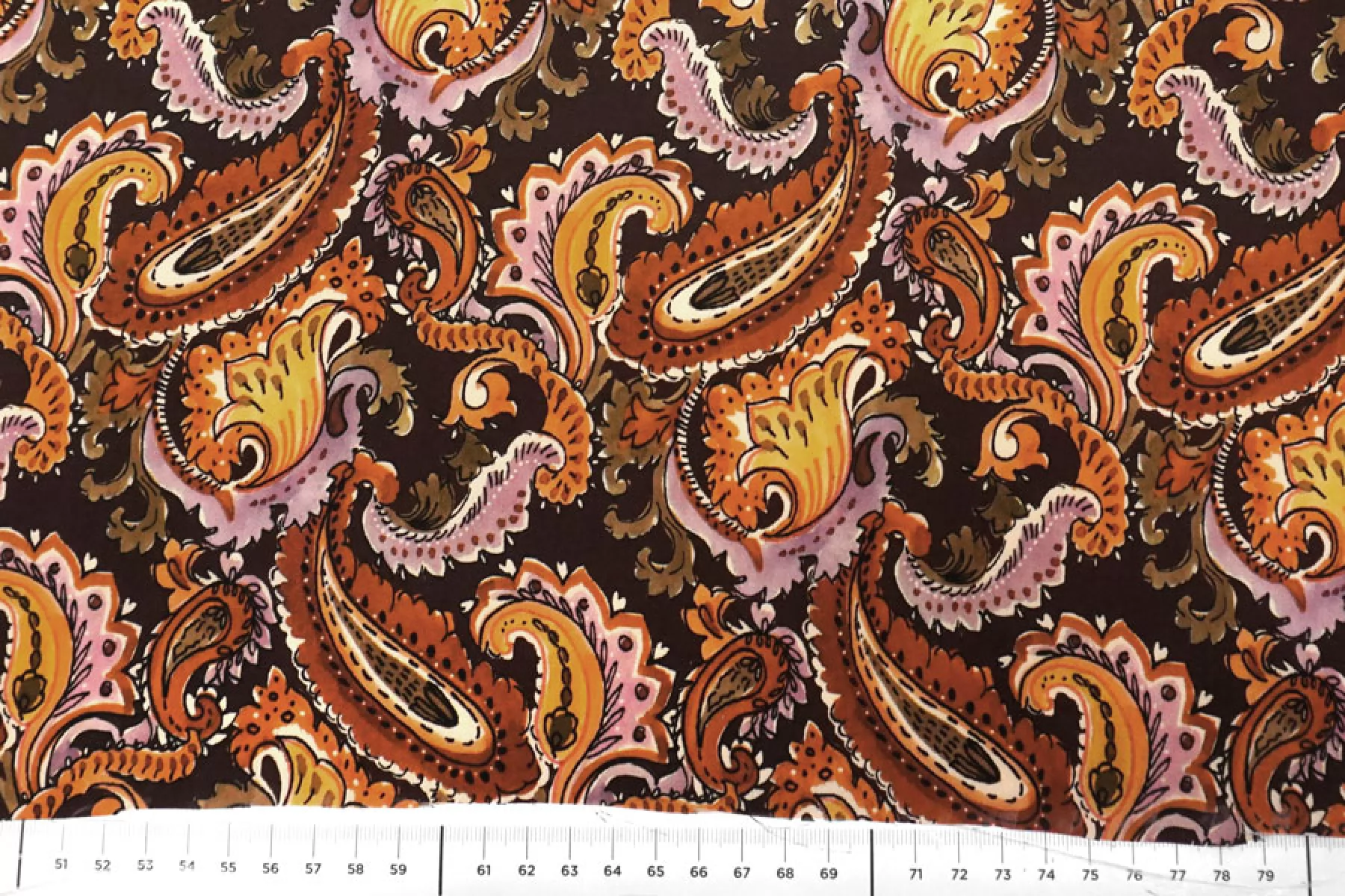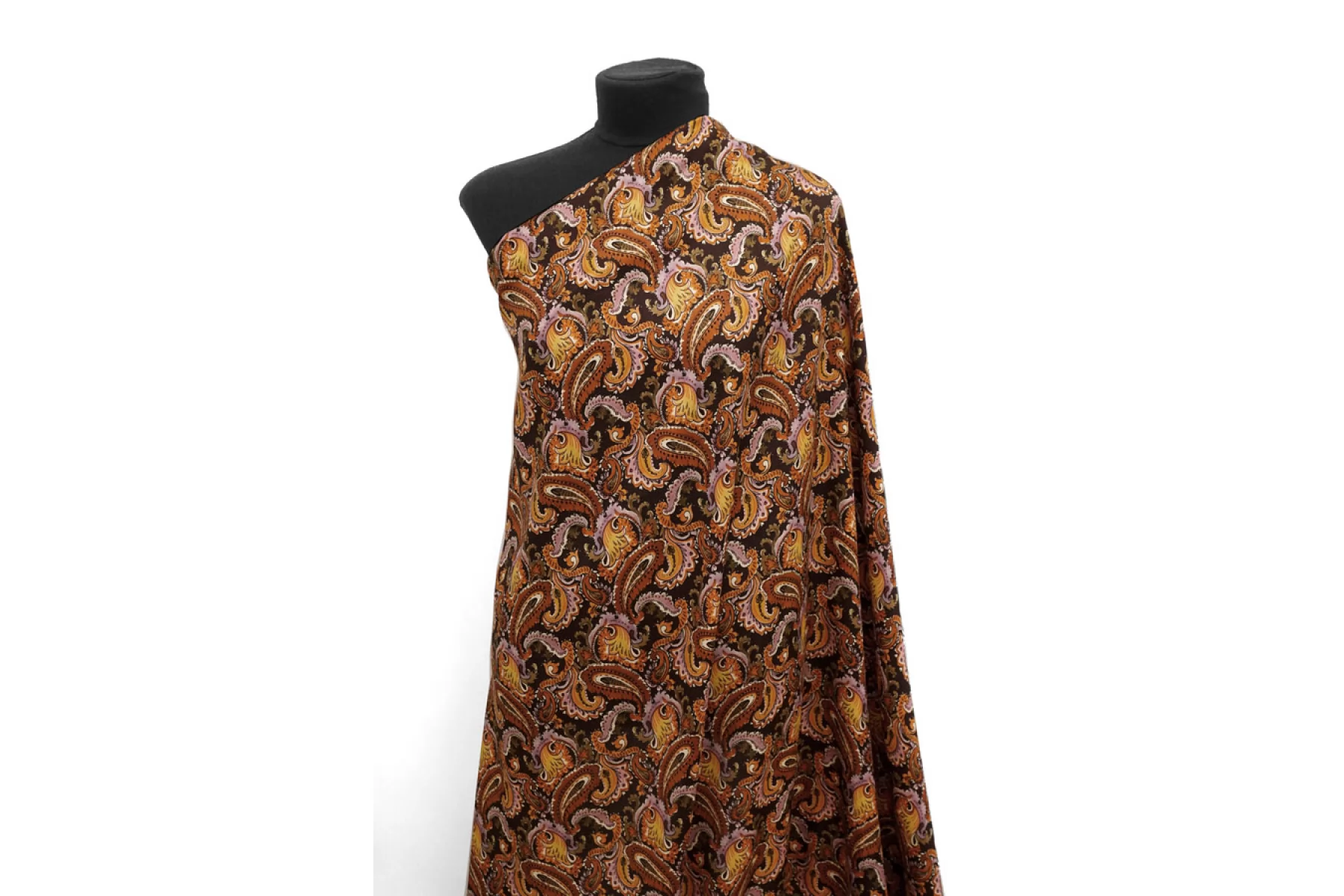 Итальянский вискозный плательно-блузочный атлас с красивым крупным огуречным принтом, фон темный бордово-коричневый. Тонкий, пластичный, гладкий, струящийся. Не тянется, немного просвечивает если смотреть насквозь через один слой. Подойдет для пошива платья, юбки, туники, блузки, топа. При работе с этой тканью советуем использовать тонкие иглы и нитки.