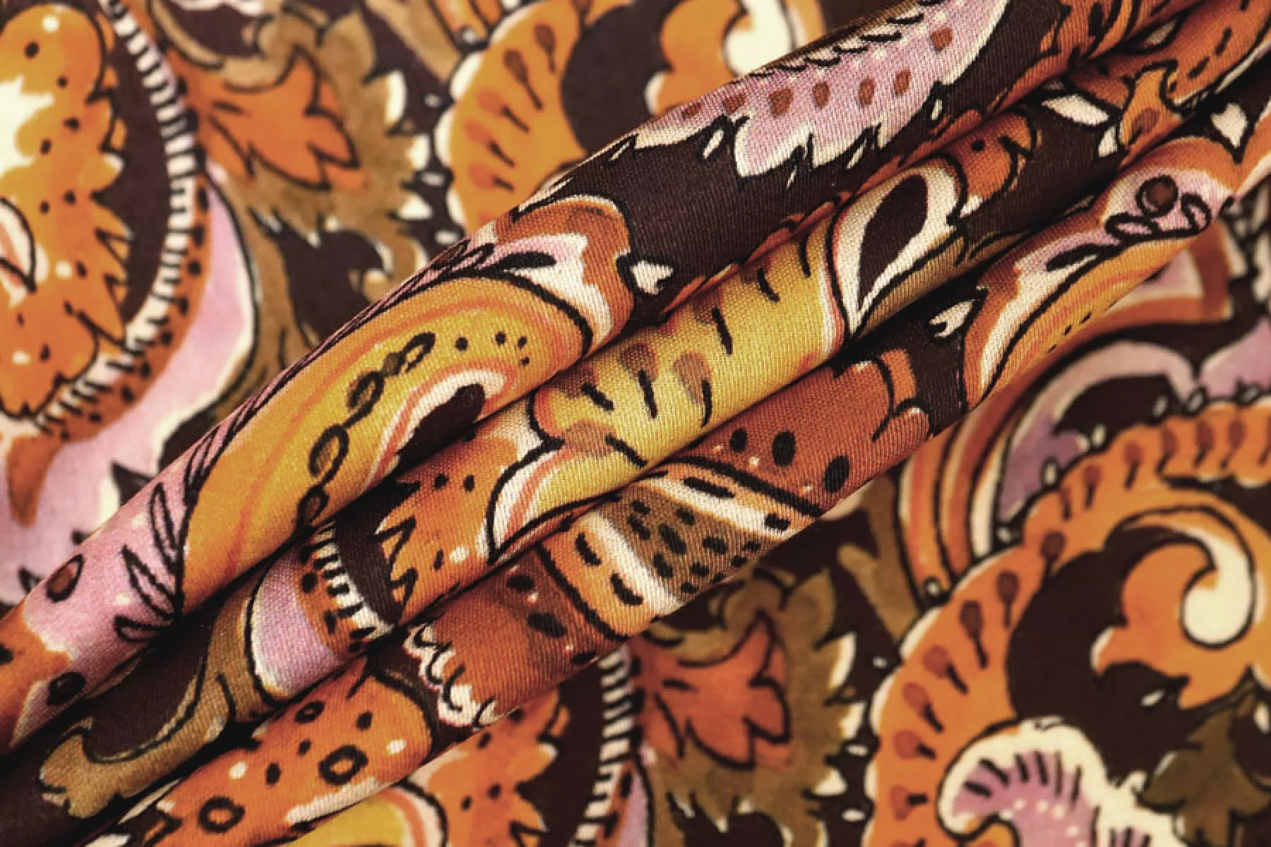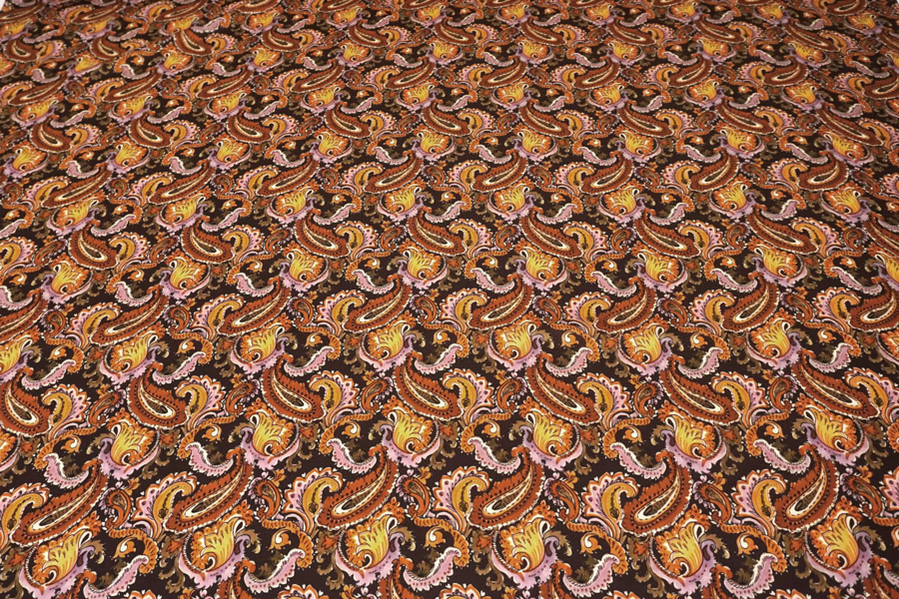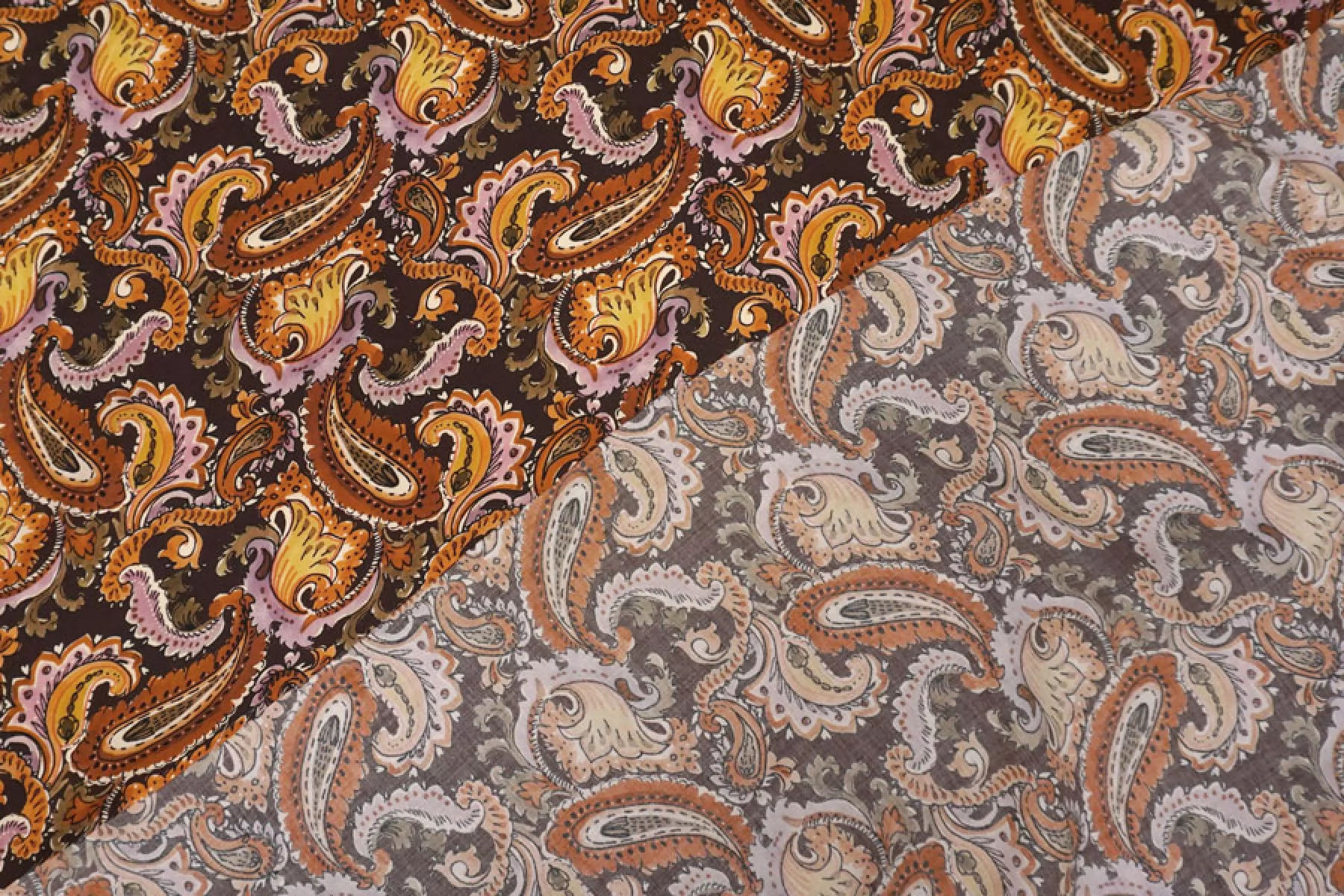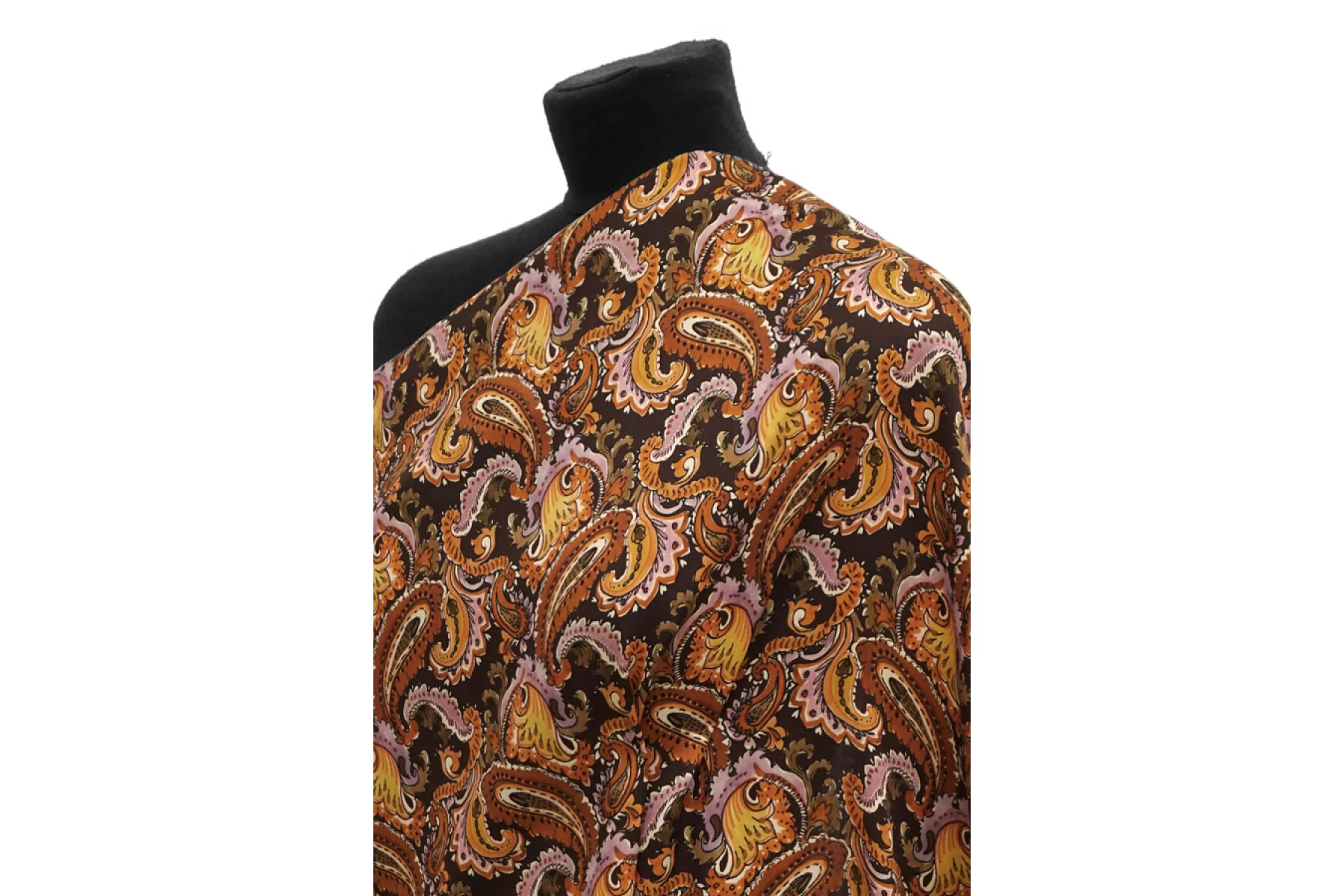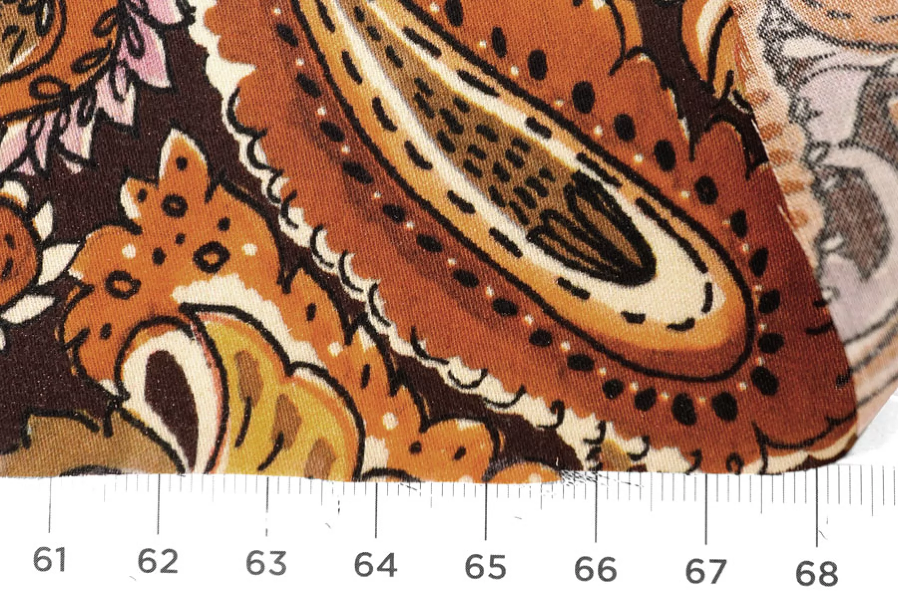 Итальянский вискозный плательно-блузочный атлас с красивым крупным огуречным принтом, фон темный бордово-коричневый. Тонкий, пластичный, гладкий, струящийся. Не тянется, немного просвечивает если смотреть насквозь через один слой. Подойдет для пошива платья, юбки, туники, блузки, топа. При работе с этой тканью советуем использовать тонкие иглы и нитки.