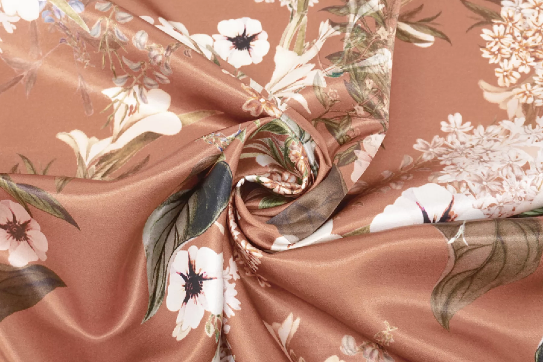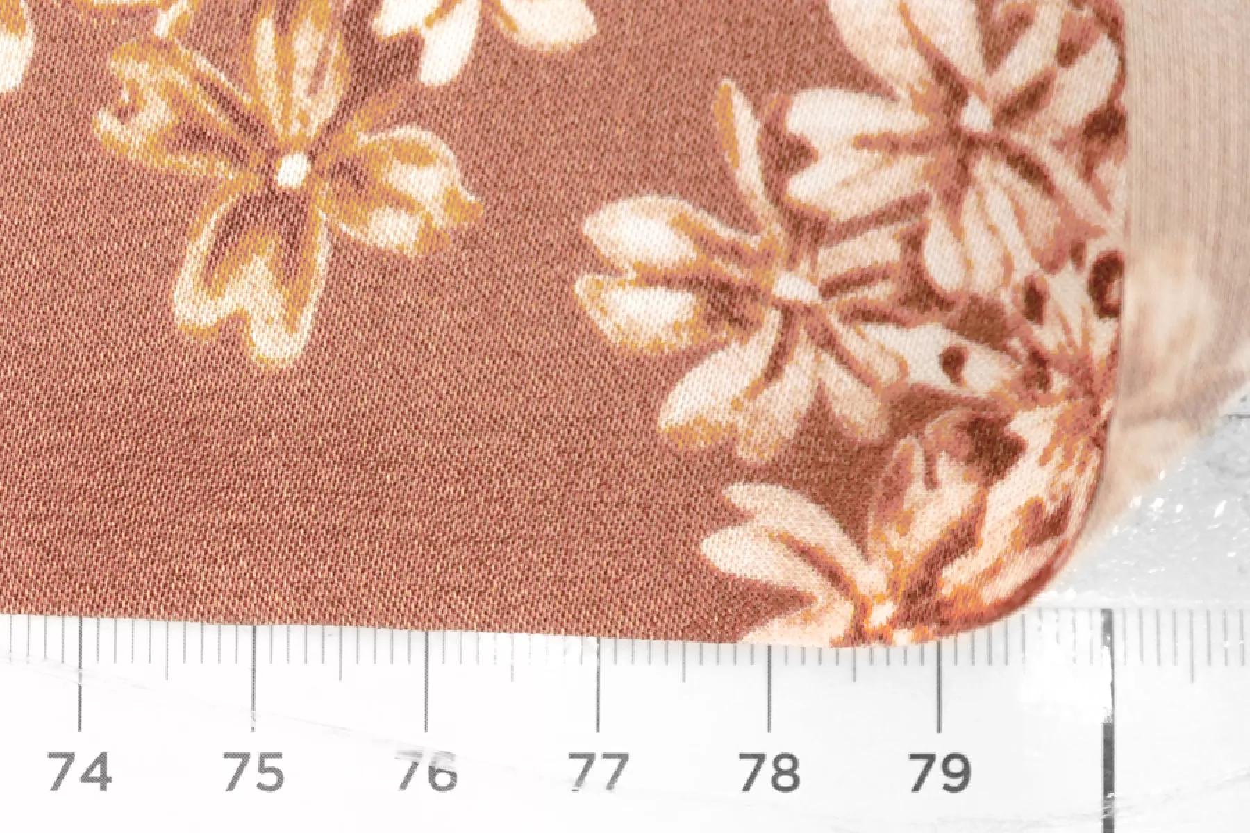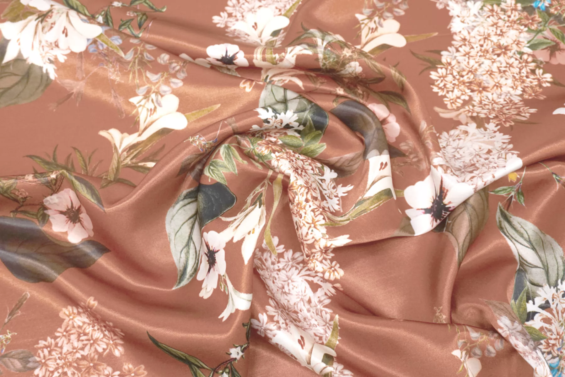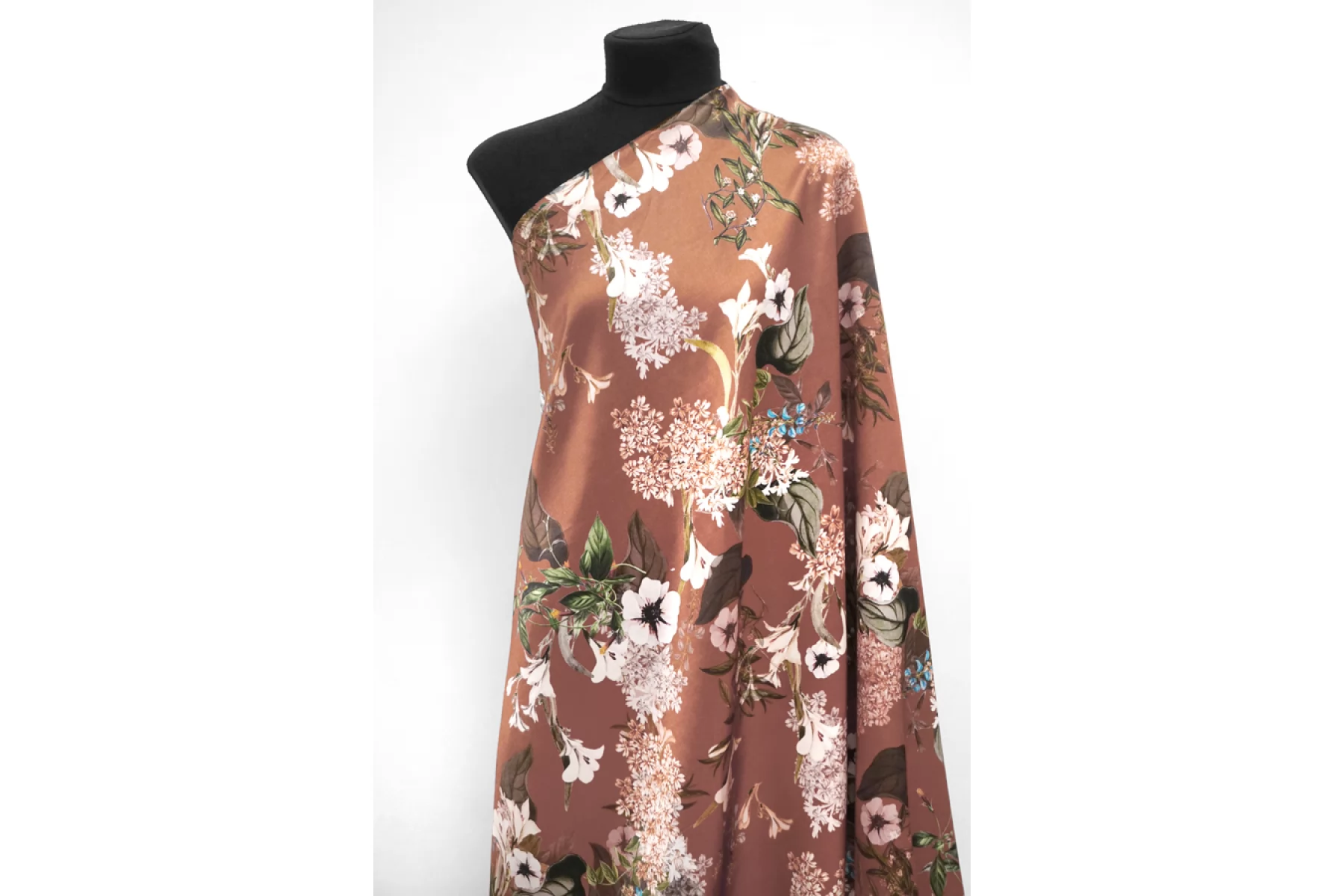 Очень красивый вискозный атлас с цветочным принтом, фон цвета какао с розовинкой. Тактильно материал плотный, гладкий, мягкий и очень приятный. Лицевая сторона с роскошным лоском. Не просвечивает. Совсем чуть-чуть тянется (пружинит) благодаря плетению. Сминается, но восстанавливается. Форму практически не держит. Отлично подойдет для пошива платья, юбки, брюк в пижамном стиле, кимоно или халата. Обязательно учитывайте усадку 5-10%.