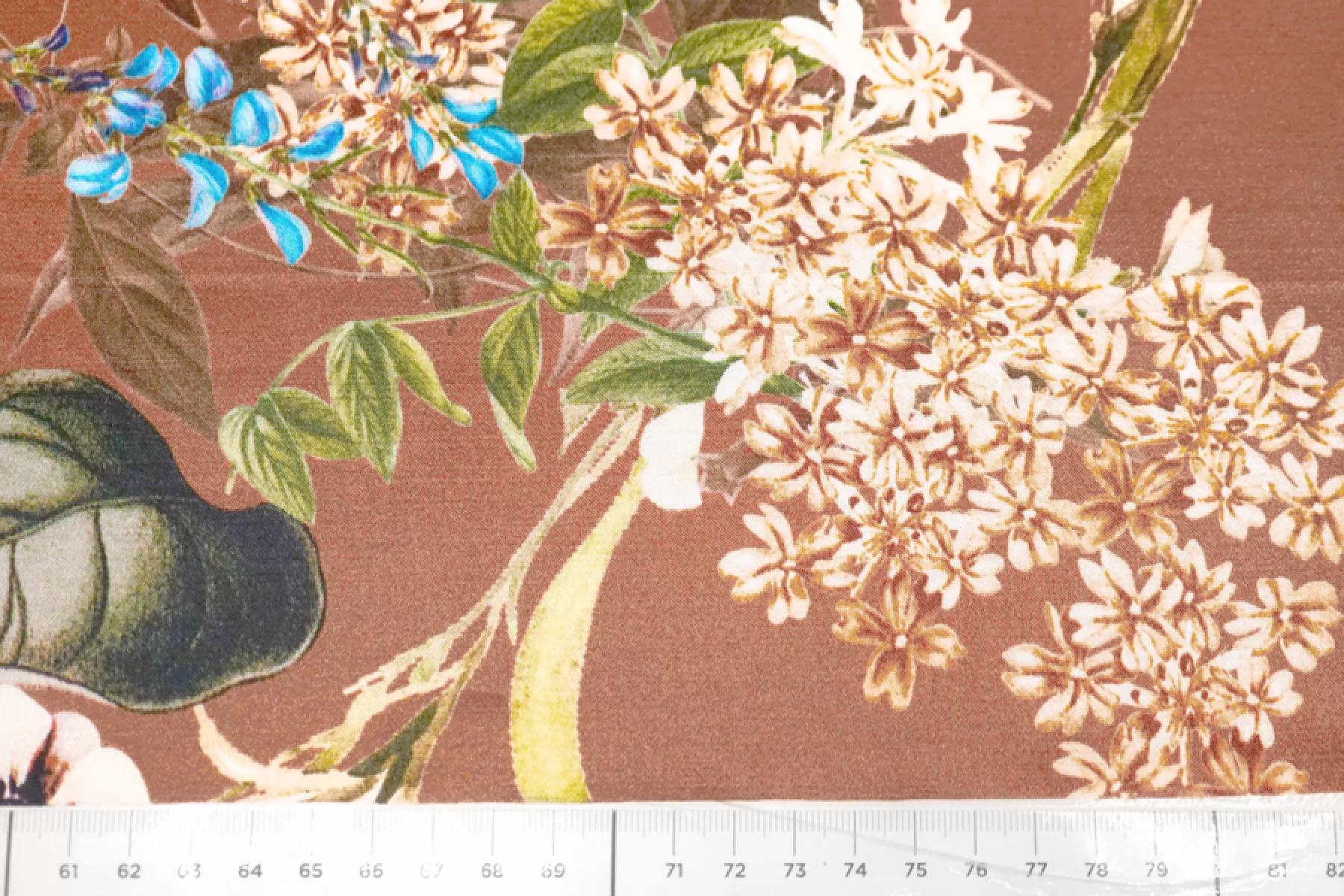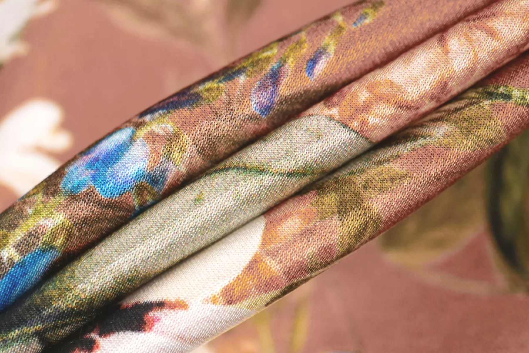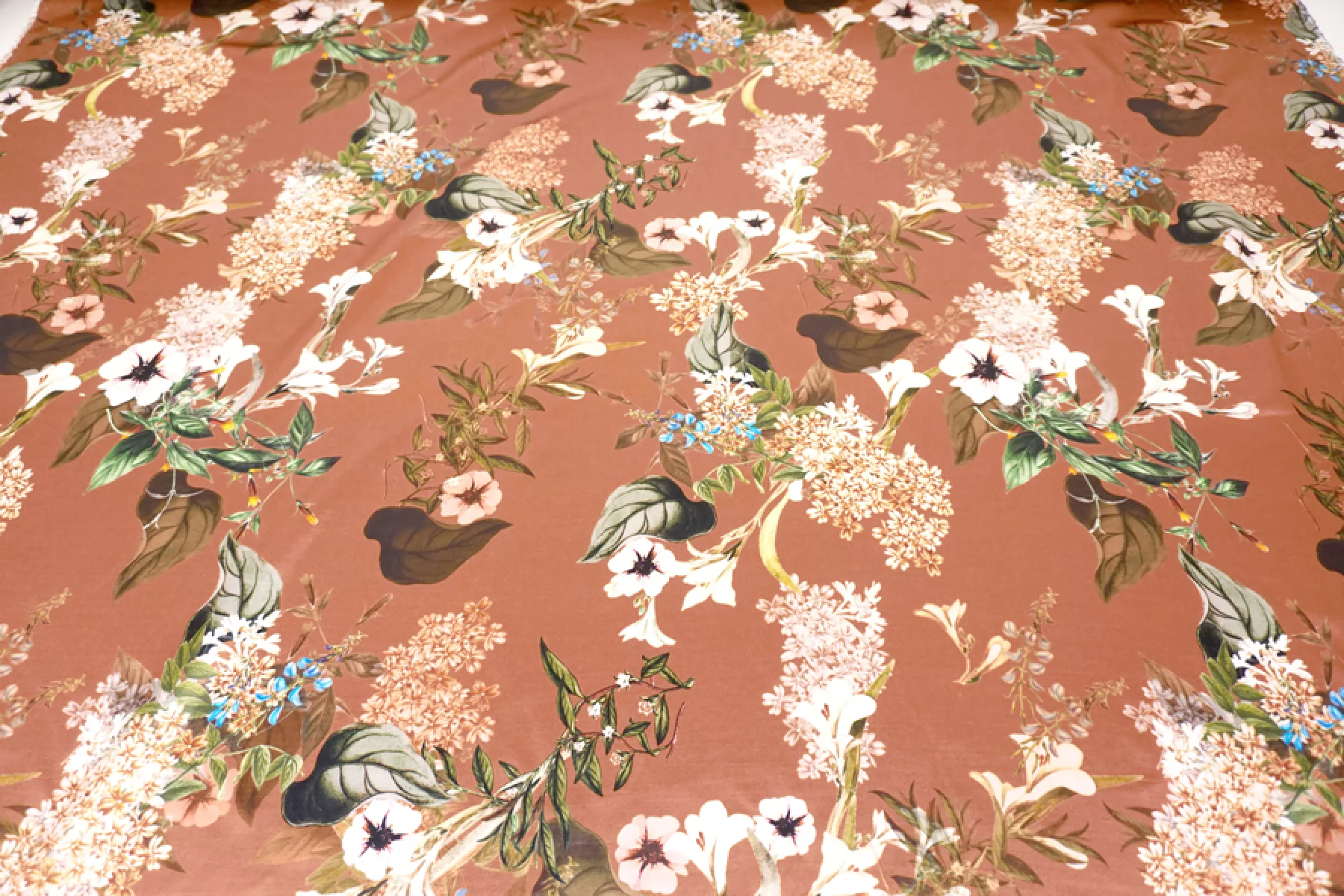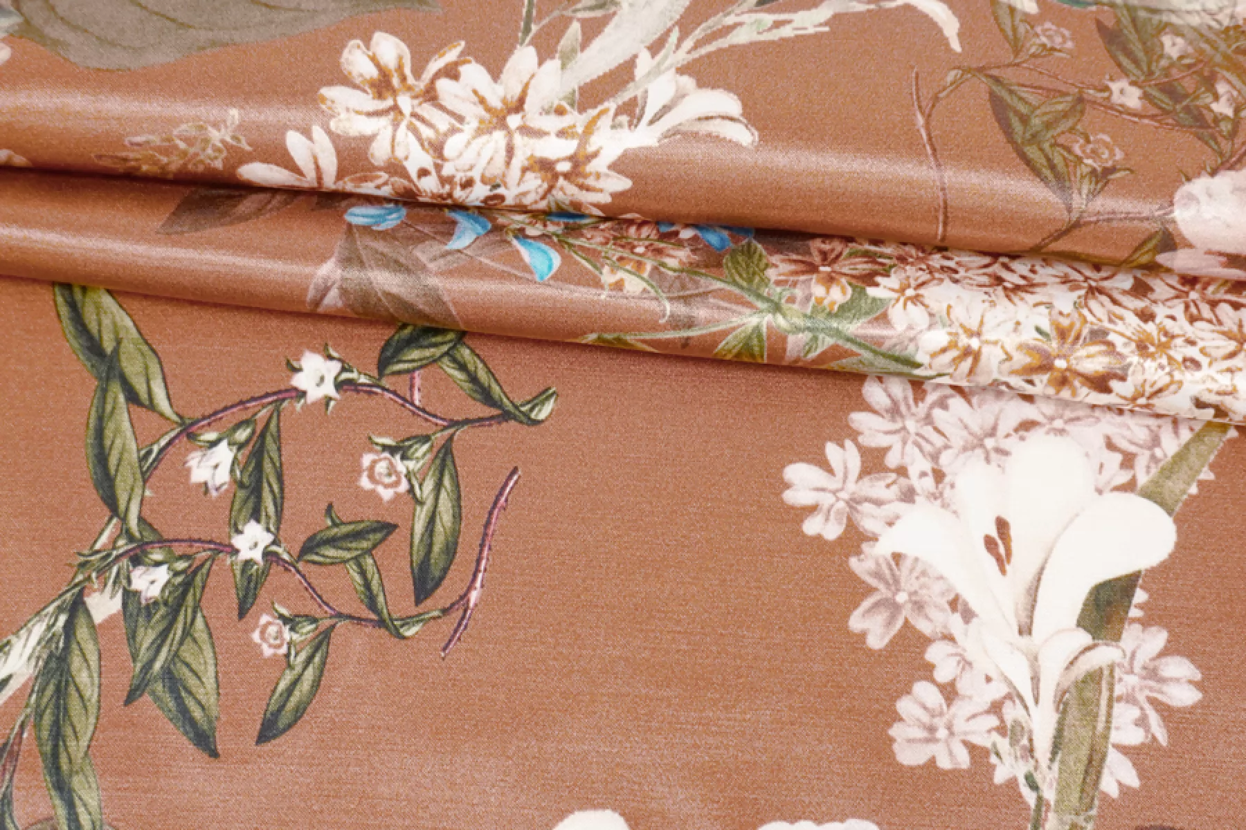 Очень красивый вискозный атлас с цветочным принтом, фон цвета какао с розовинкой. Тактильно материал плотный, гладкий, мягкий и очень приятный. Лицевая сторона с роскошным лоском. Не просвечивает. Совсем чуть-чуть тянется (пружинит) благодаря плетению. Сминается, но восстанавливается. Форму практически не держит. Отлично подойдет для пошива платья, юбки, брюк в пижамном стиле, кимоно или халата. Обязательно учитывайте усадку 5-10%.