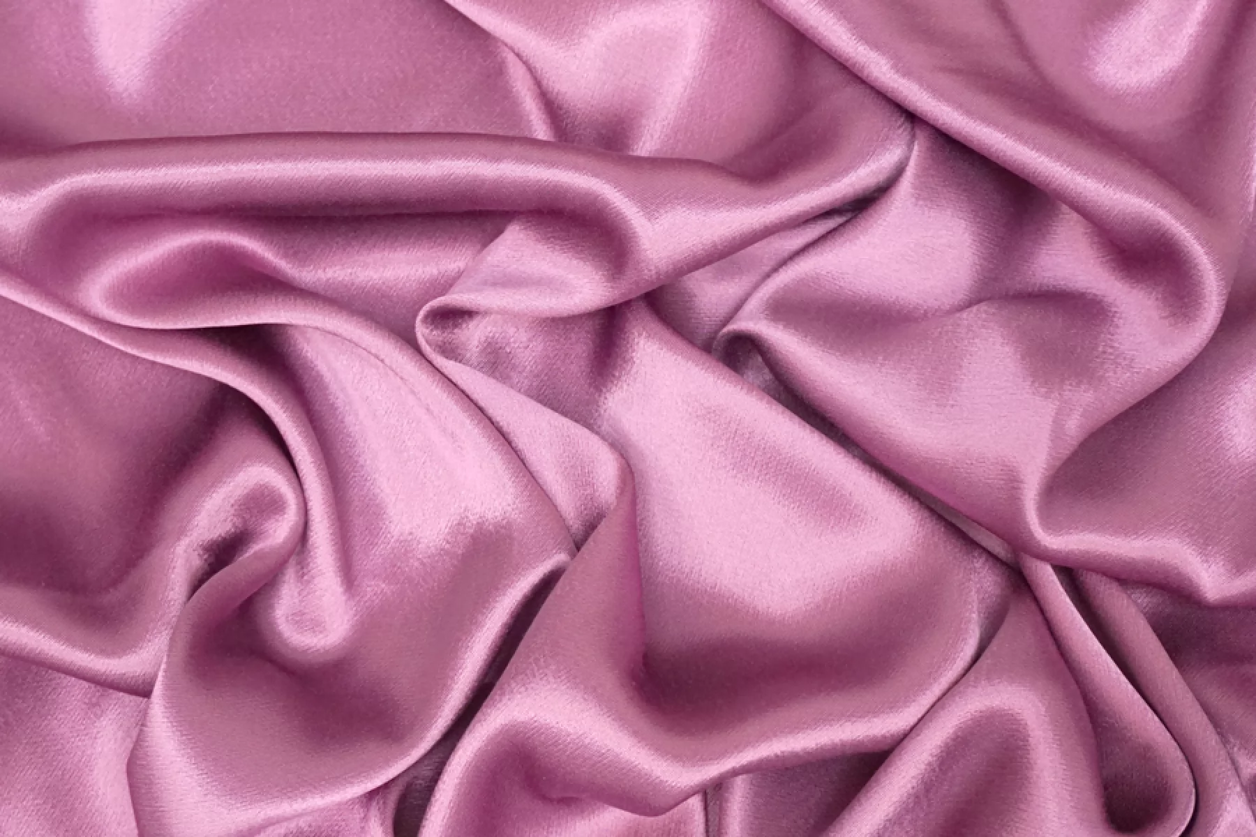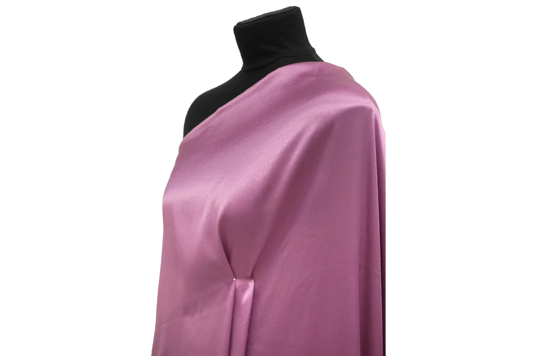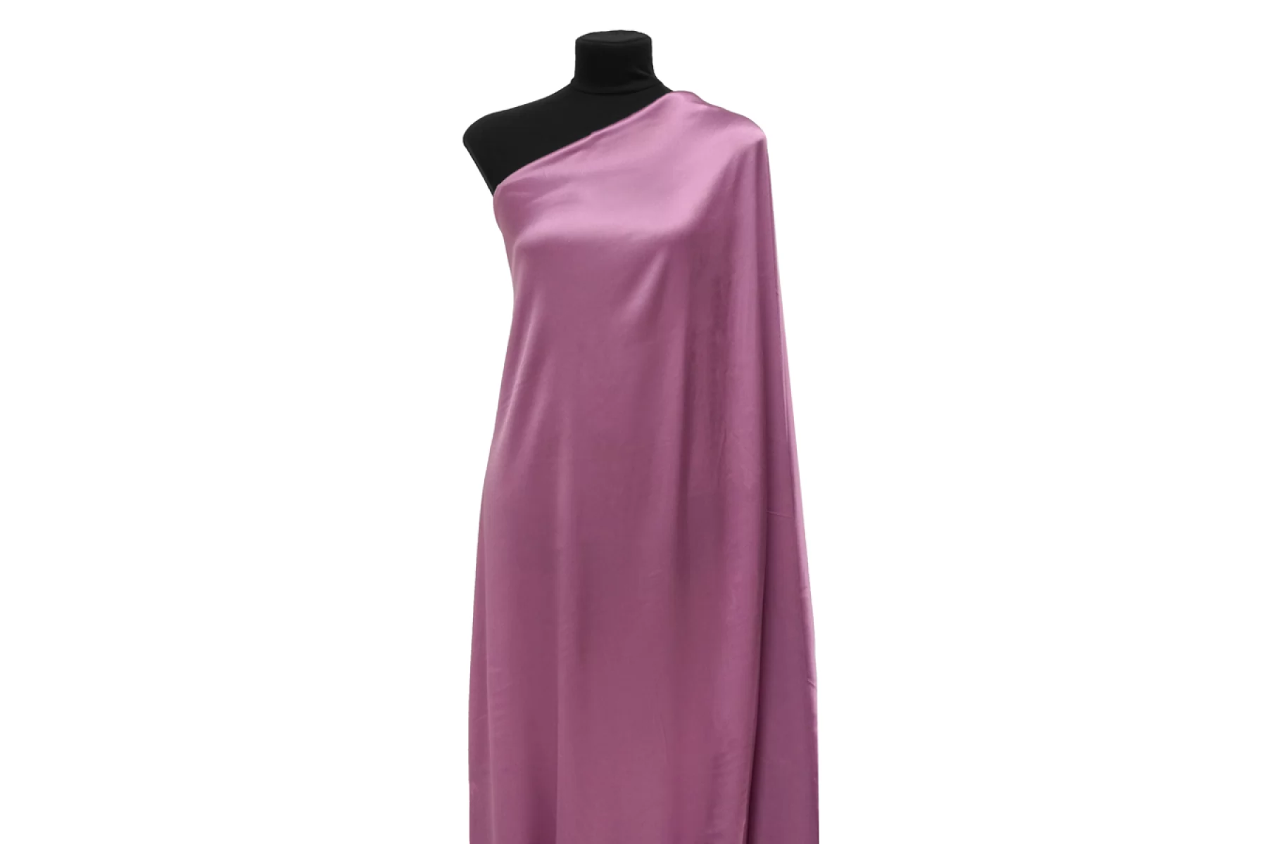 Невероятно красивый вискозный атлас в лиловом оттенке. Материал плотный, со скользящей лицевой стороной, которая шикарно переливается. Тактильно очень приятный. Не тянется. Не просвечивает. Сминается. Хорошо драпируется и немного держит форму. Восхитителен в своей пластике. Отлично подойдет не только на платья и юбки, но и на костюмы и жакеты мягкой формы, а также свободные брюки. Обязательно учитывайте усадку 5-10%.