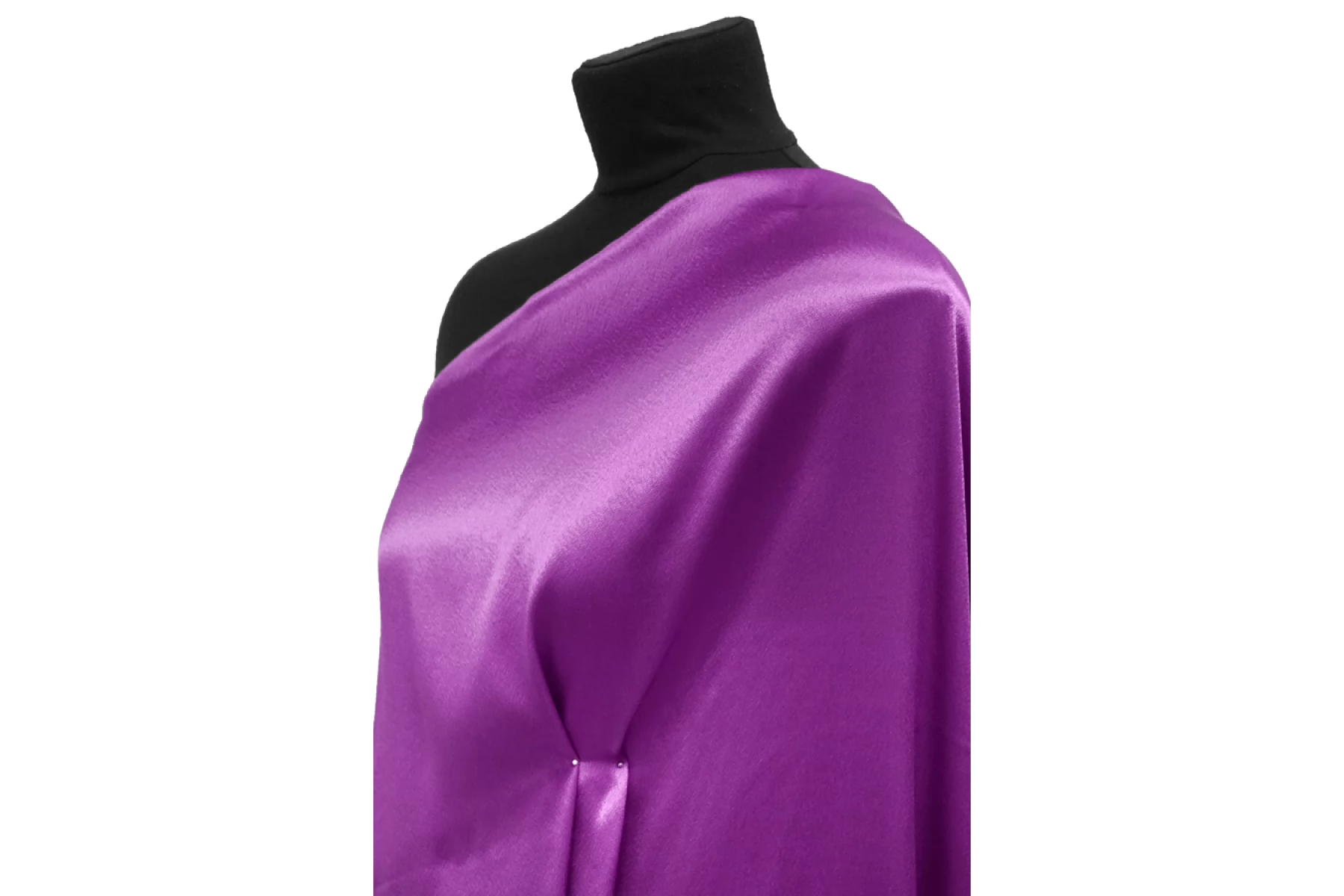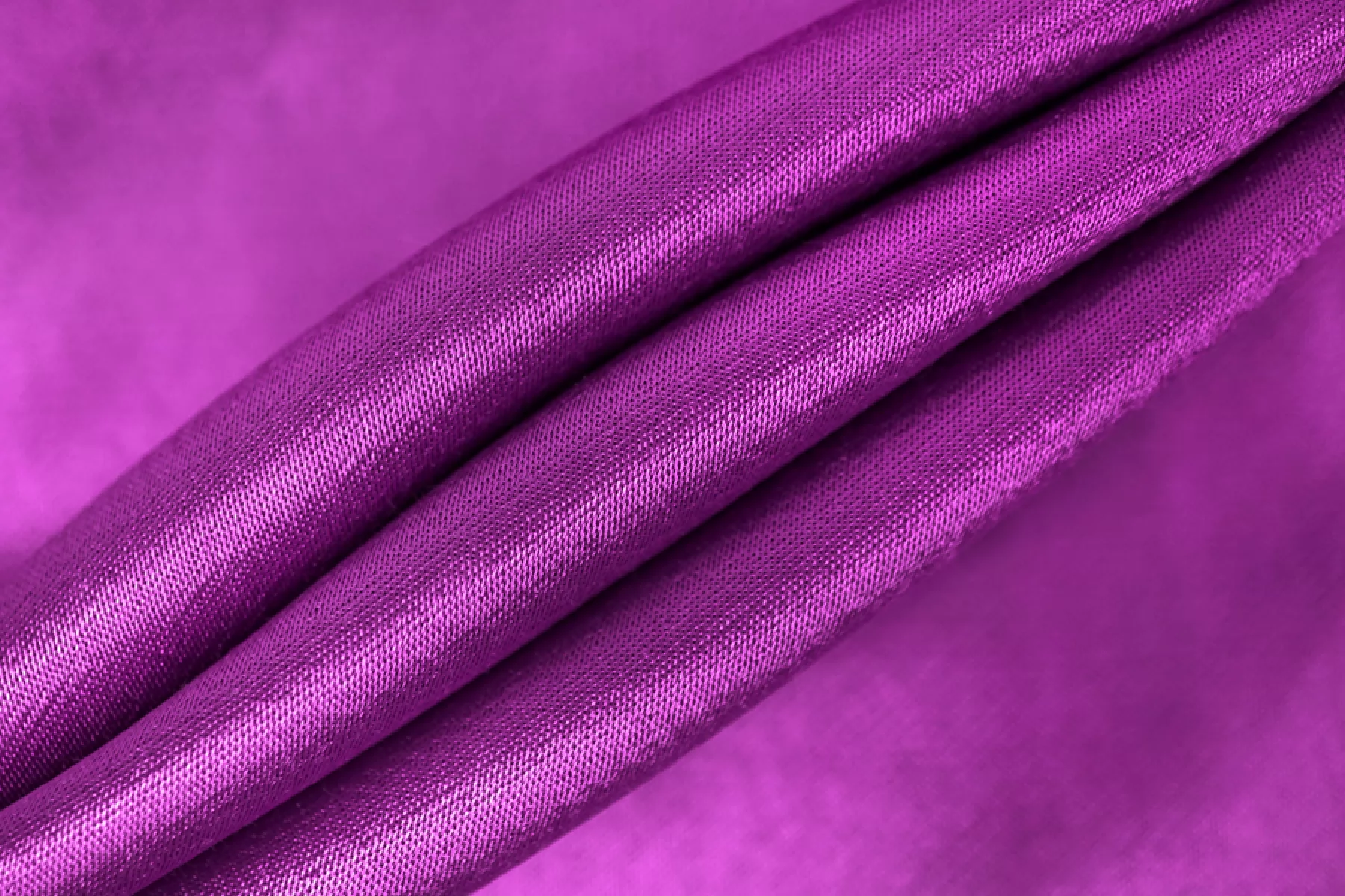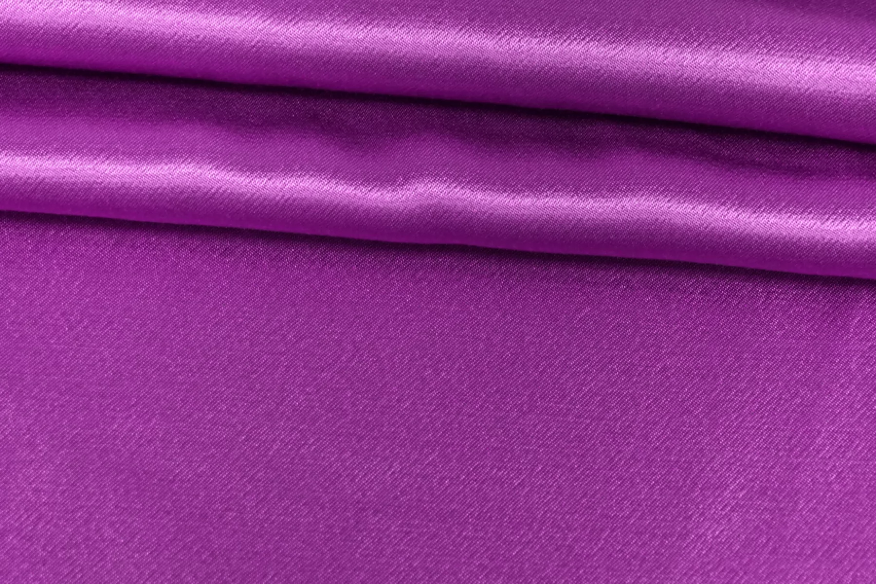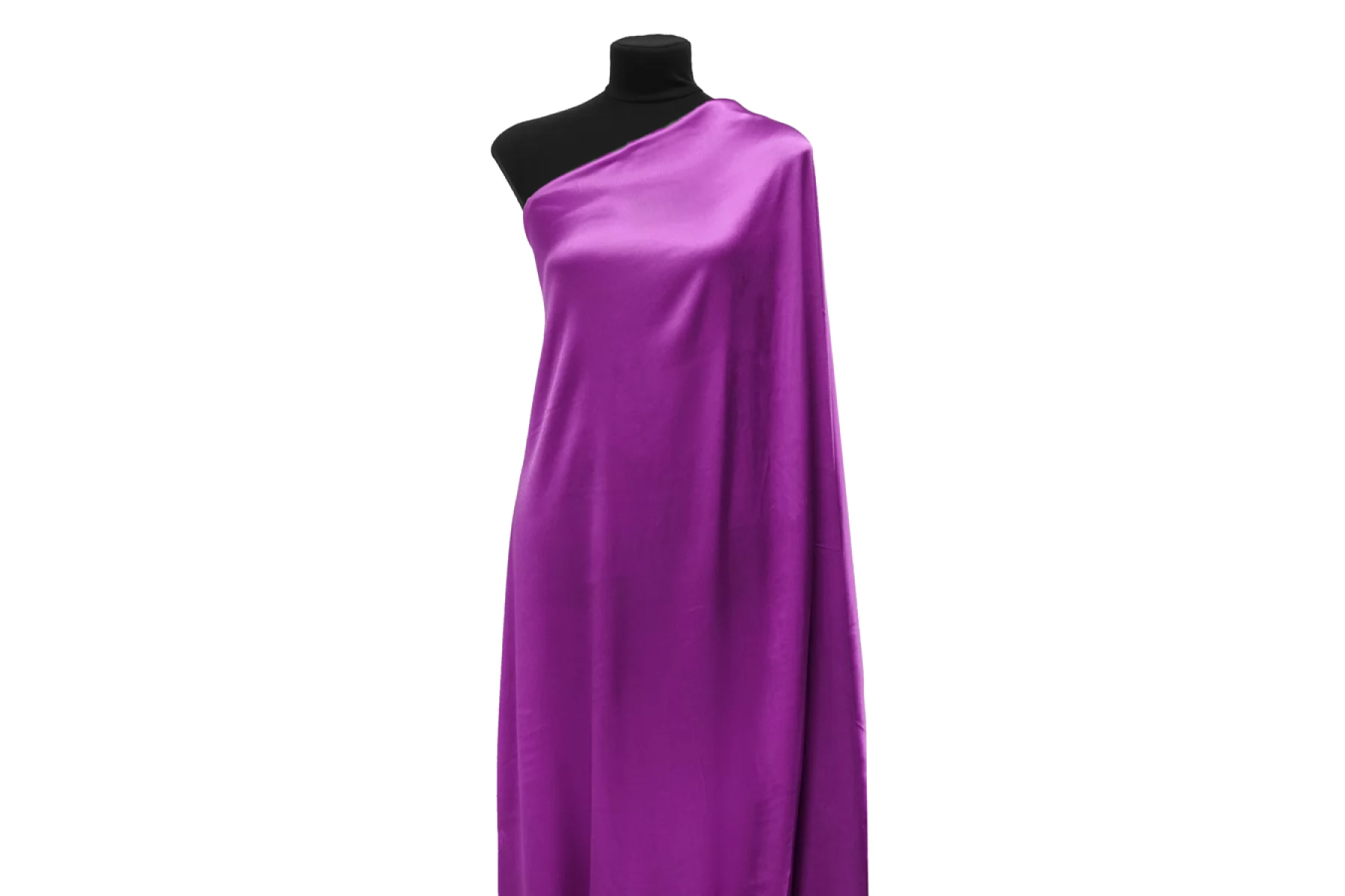 Невероятно красивый вискозный атлас в пурпурном цвете. Материал плотный, со скользящей лицевой стороной, которая шикарно переливается. Тактильно очень приятный. Не тянется. Не просвечивает. Сминается. Хорошо драпируется и немного держит форму. Восхитителен в своей пластике. Отлично подойдет не только на платья и юбки, но и на костюмы и жакеты мягкой формы, а также свободные брюки. Обязательно учитывайте усадку 5-10%.