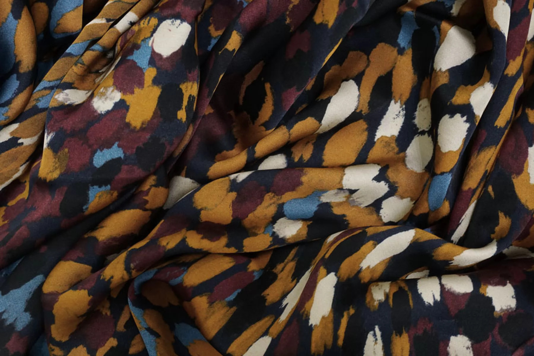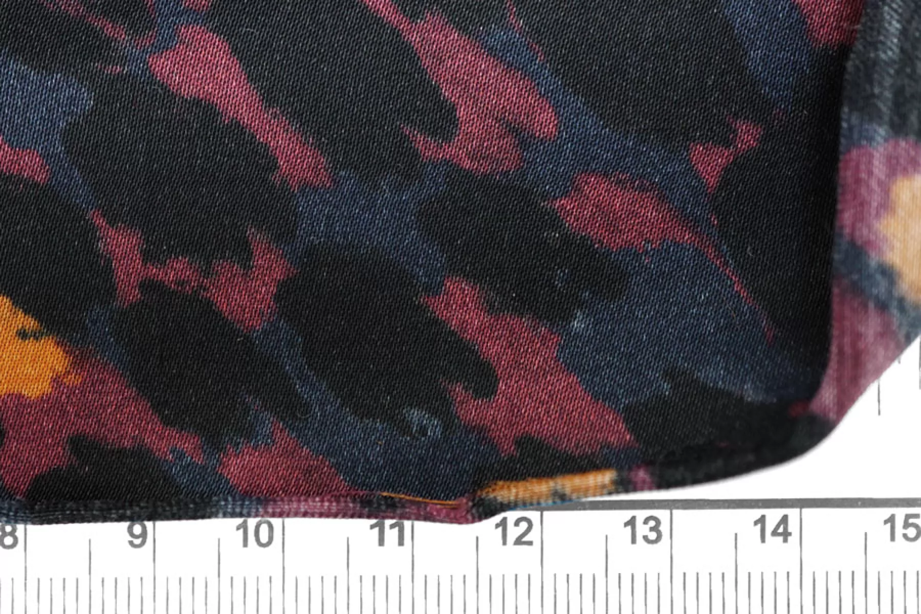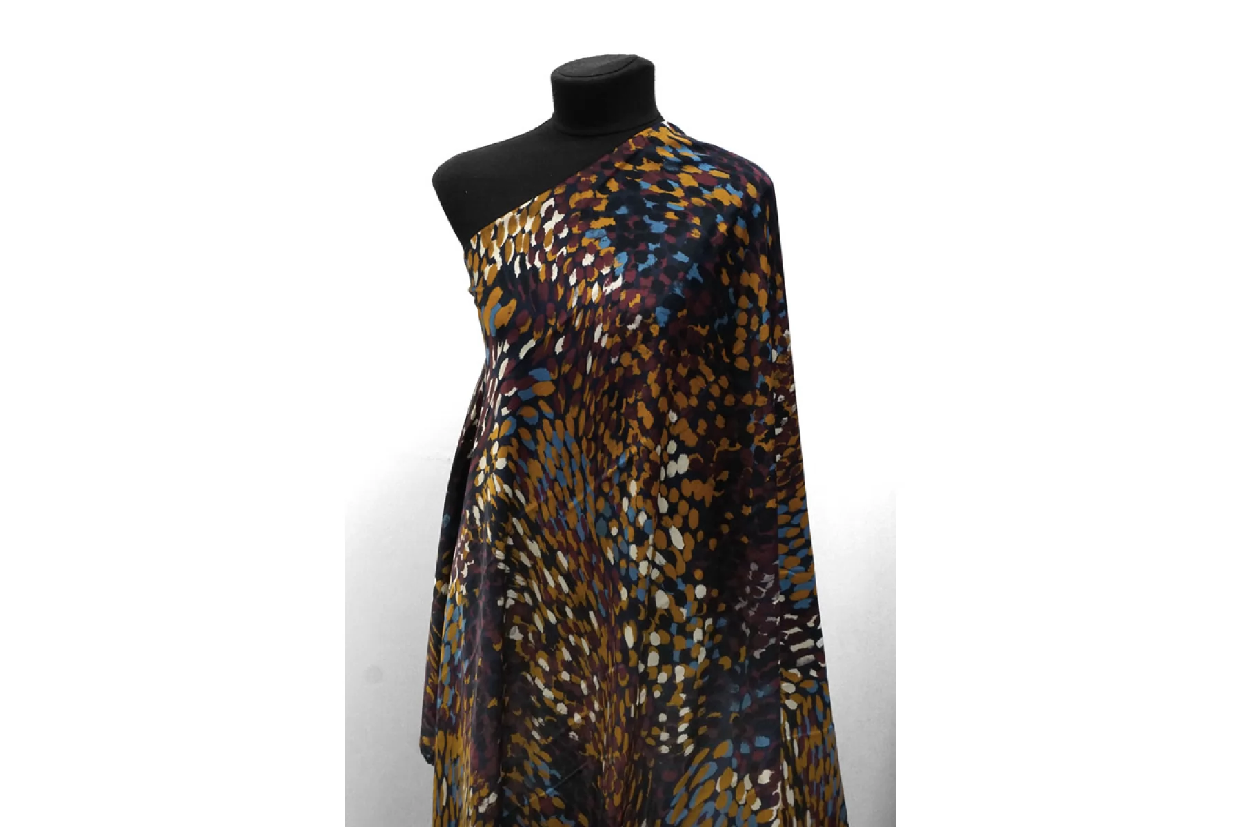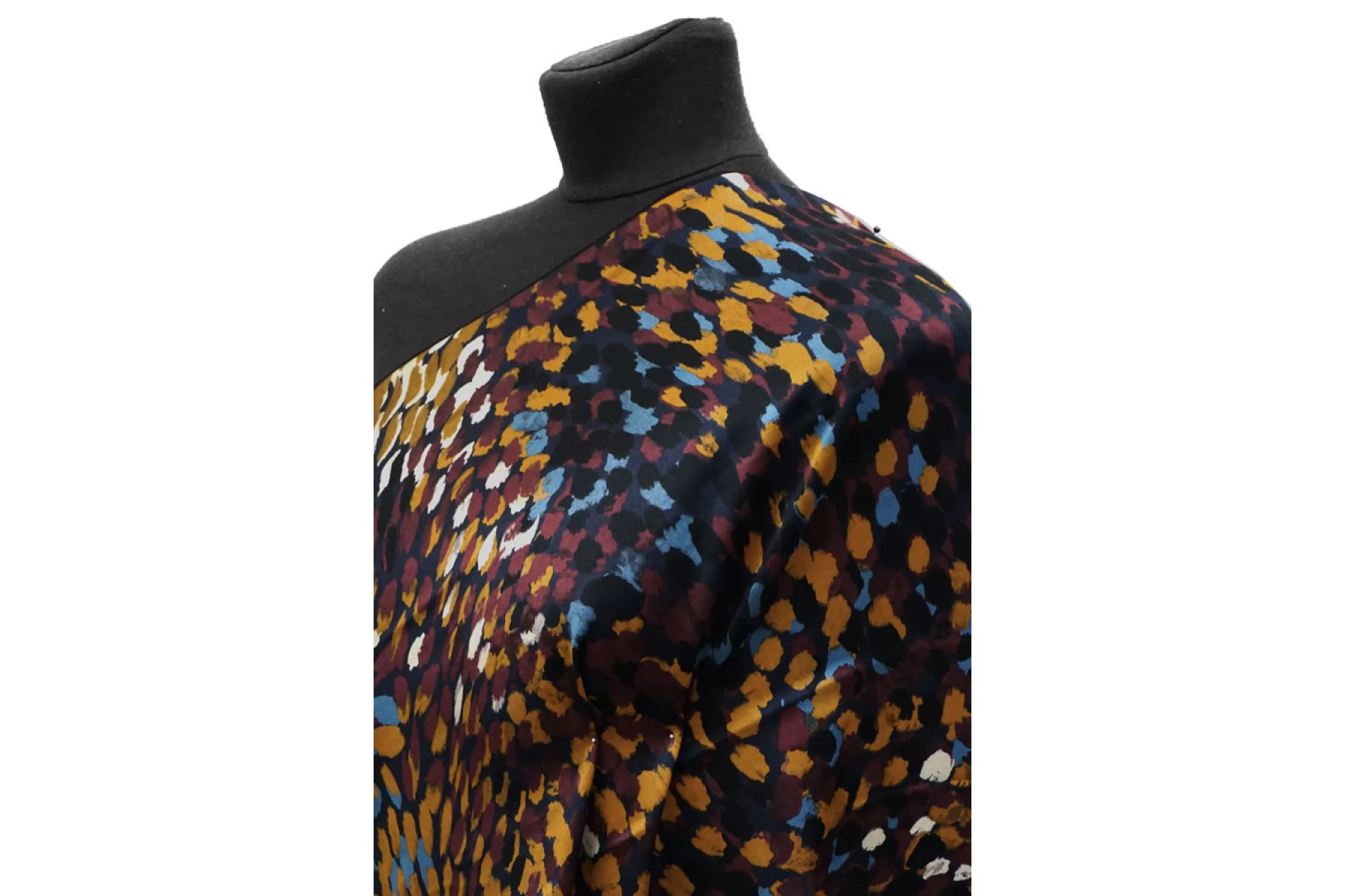Итальянская атласная плательная вискоза с абстрактным принтом виде разноцветных пятен на черном фоне. Гладкая, скользящая и нежная наощупь. С красивым легким блеском. Тонкая, пластичная, просвечивает силуэт. Немного сминается. Не тянется. Подойдет для пошива платья, юбки, туники, блузки, рубашки. При работе с этой тканью советуем использовать тонкие иглы и нитки. Учитывайте усадку материала.