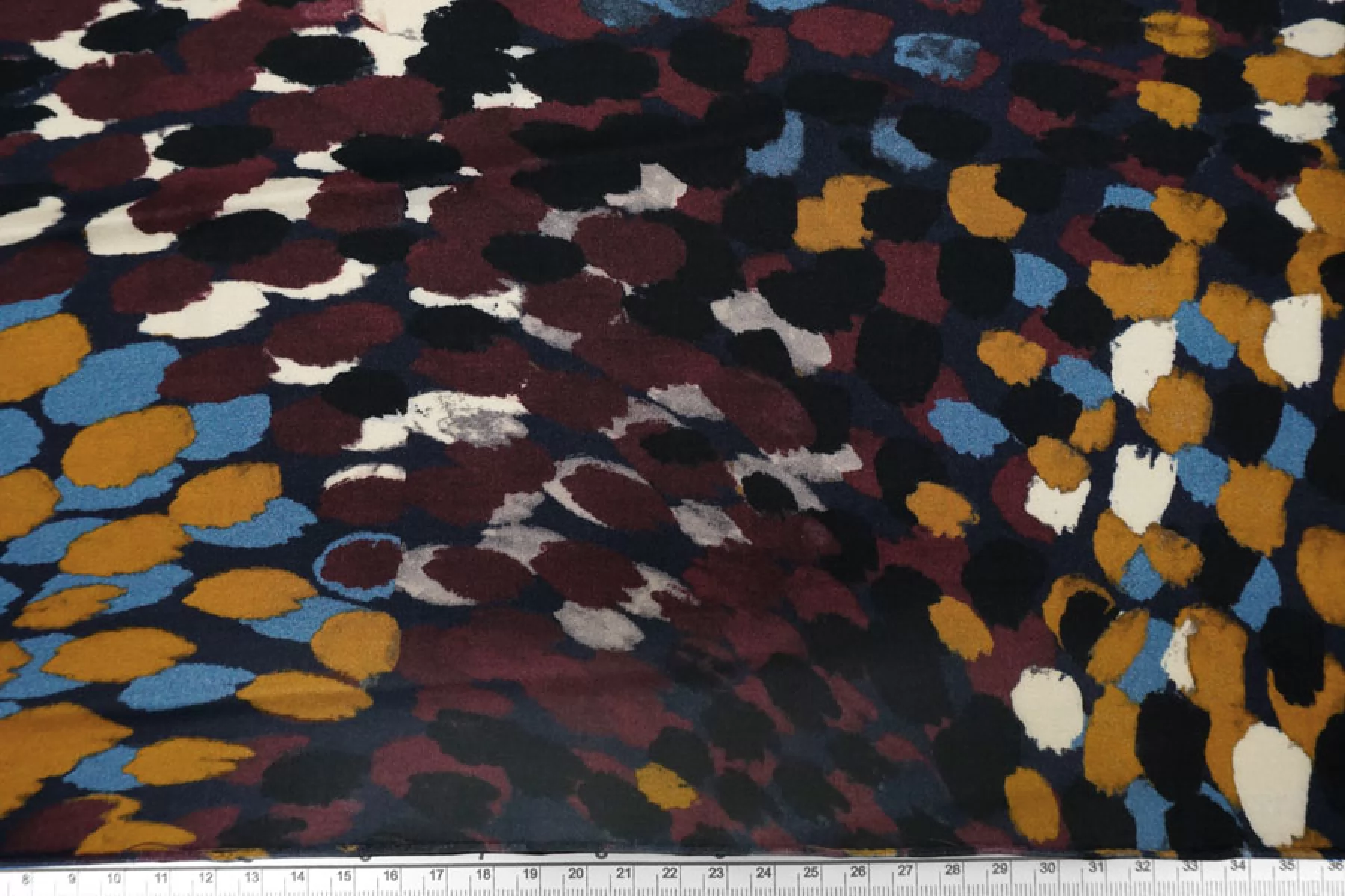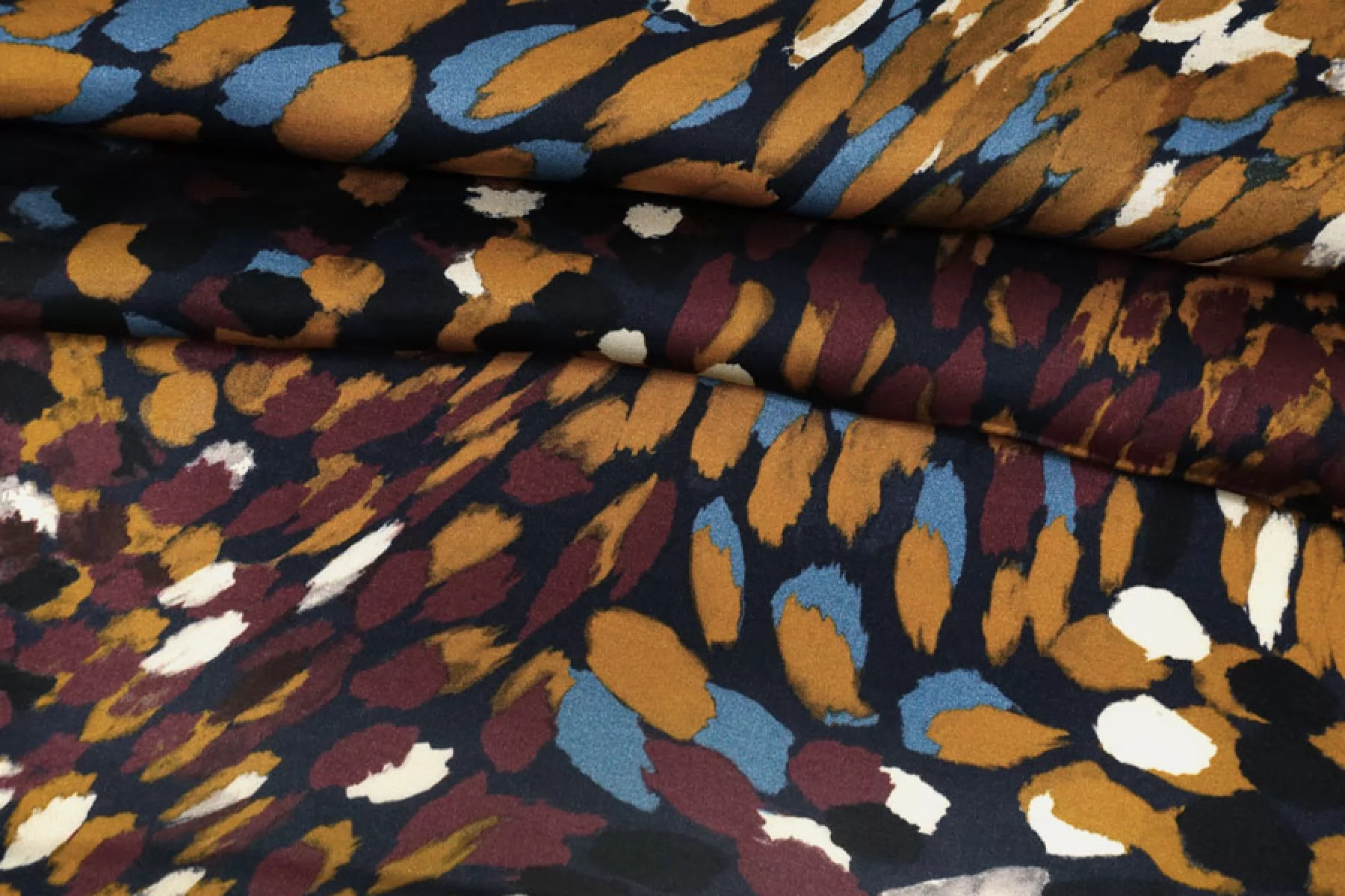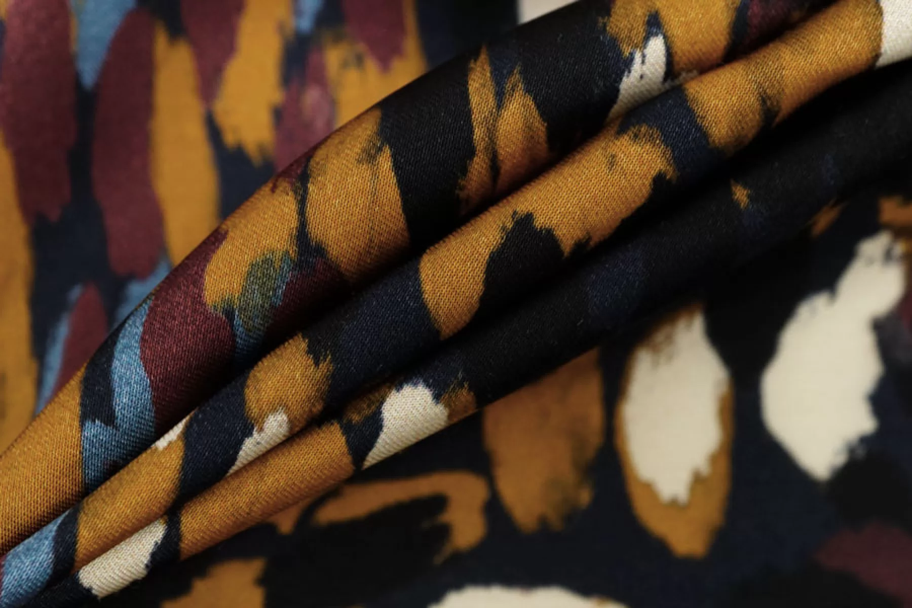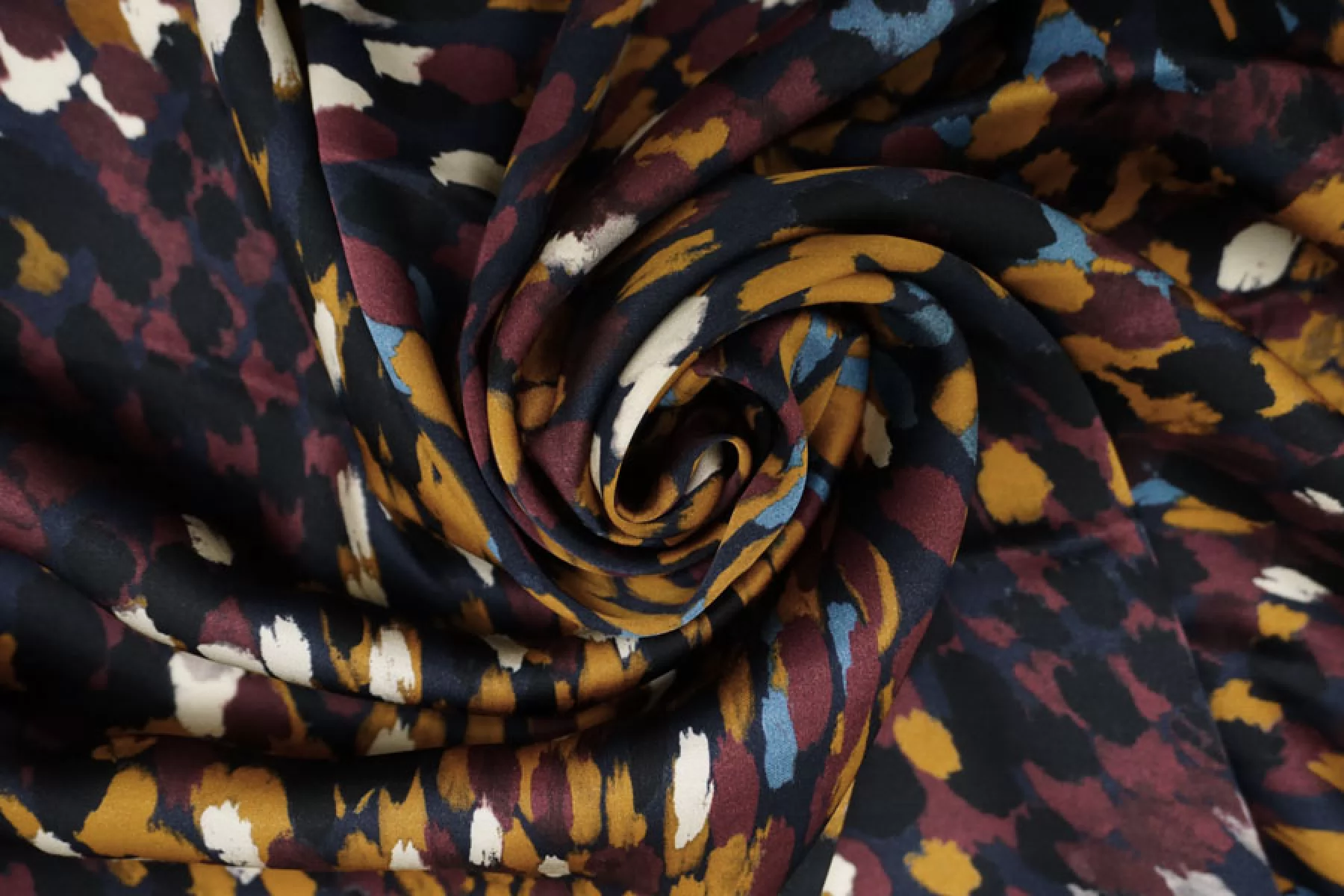 Итальянская атласная плательная вискоза с абстрактным принтом виде разноцветных пятен на черном фоне. Гладкая, скользящая и нежная наощупь. С красивым легким блеском. Тонкая, пластичная, просвечивает силуэт. Немного сминается. Не тянется. Подойдет для пошива платья, юбки, туники, блузки, рубашки. При работе с этой тканью советуем использовать тонкие иглы и нитки. Учитывайте усадку материала.