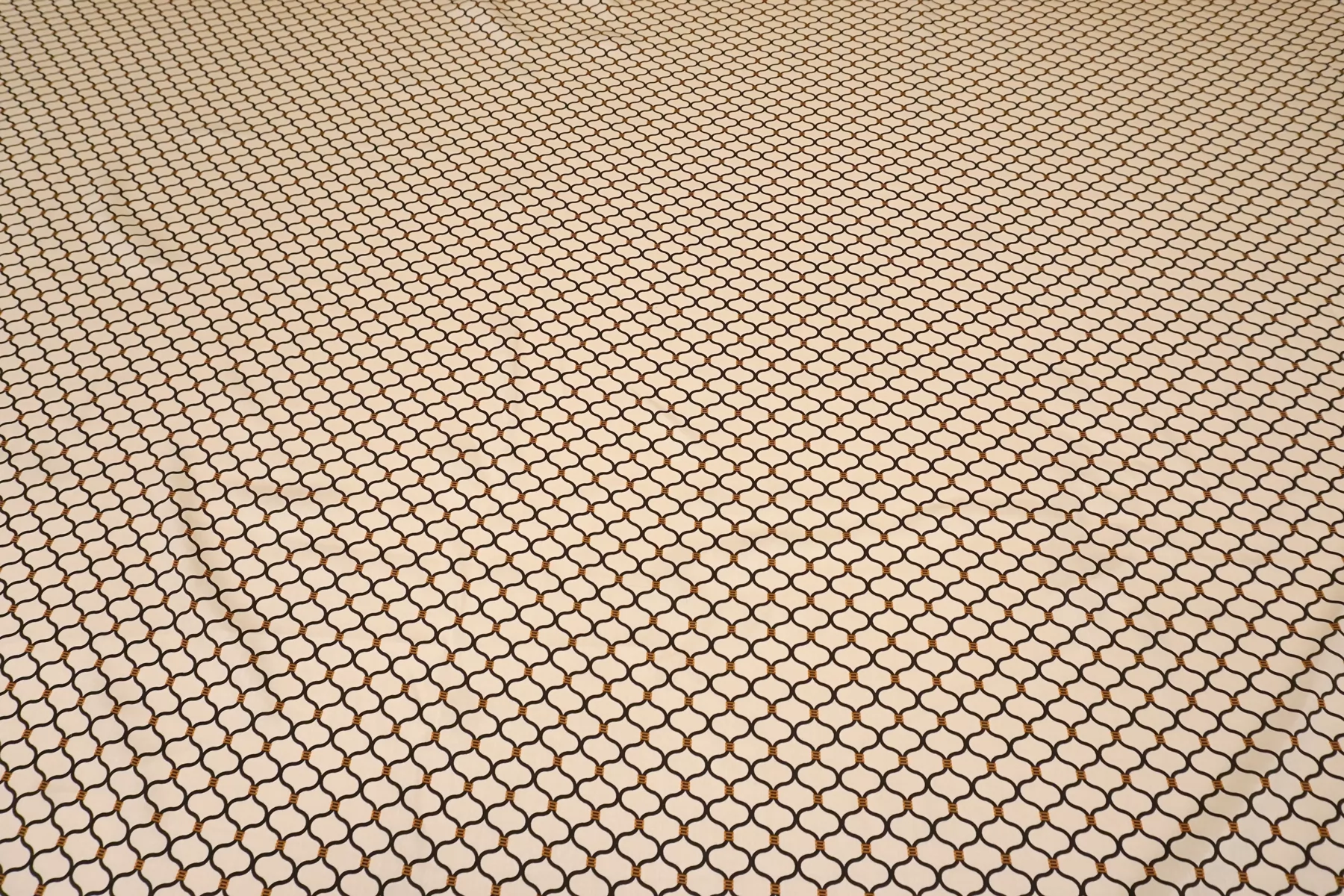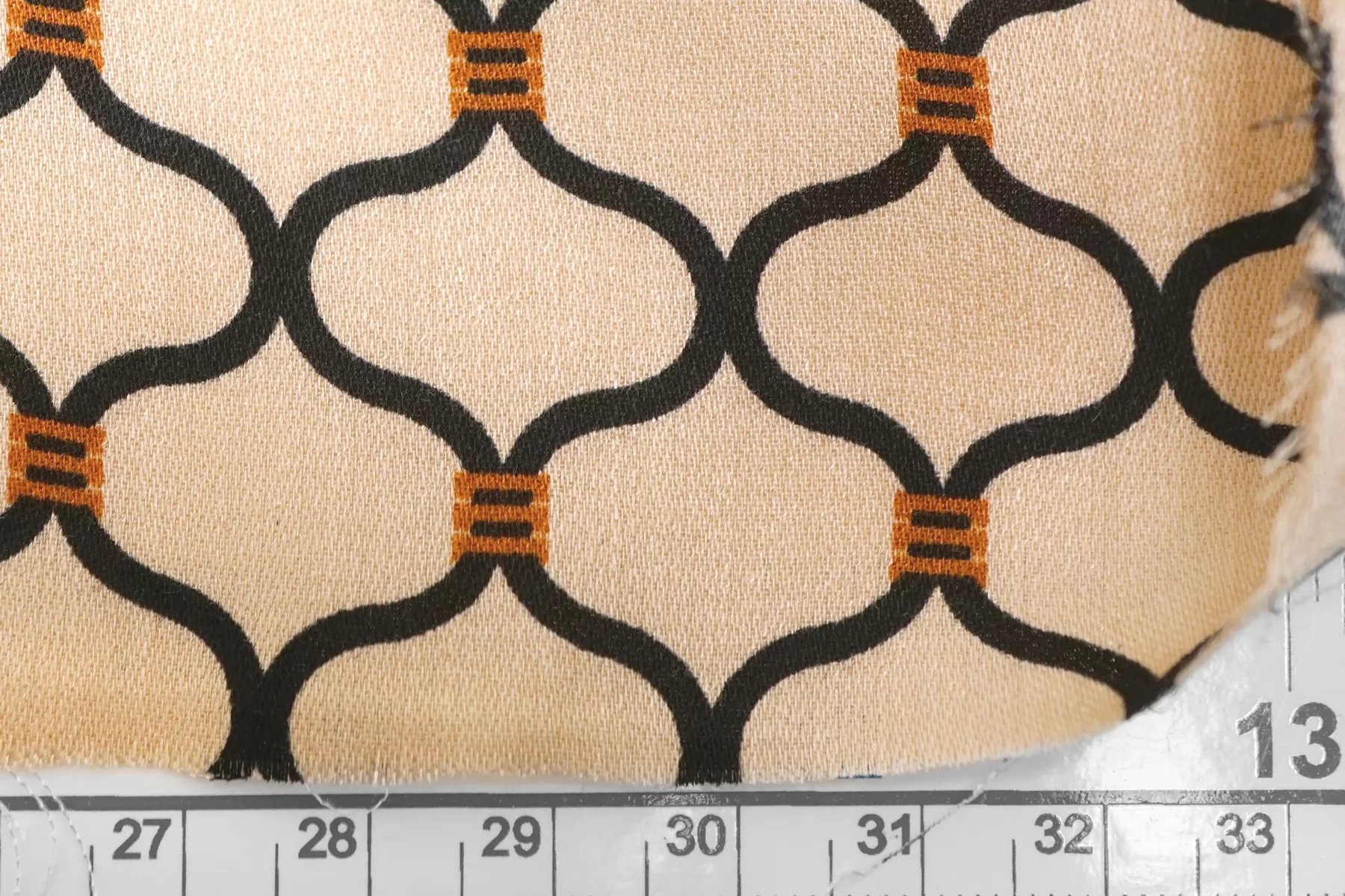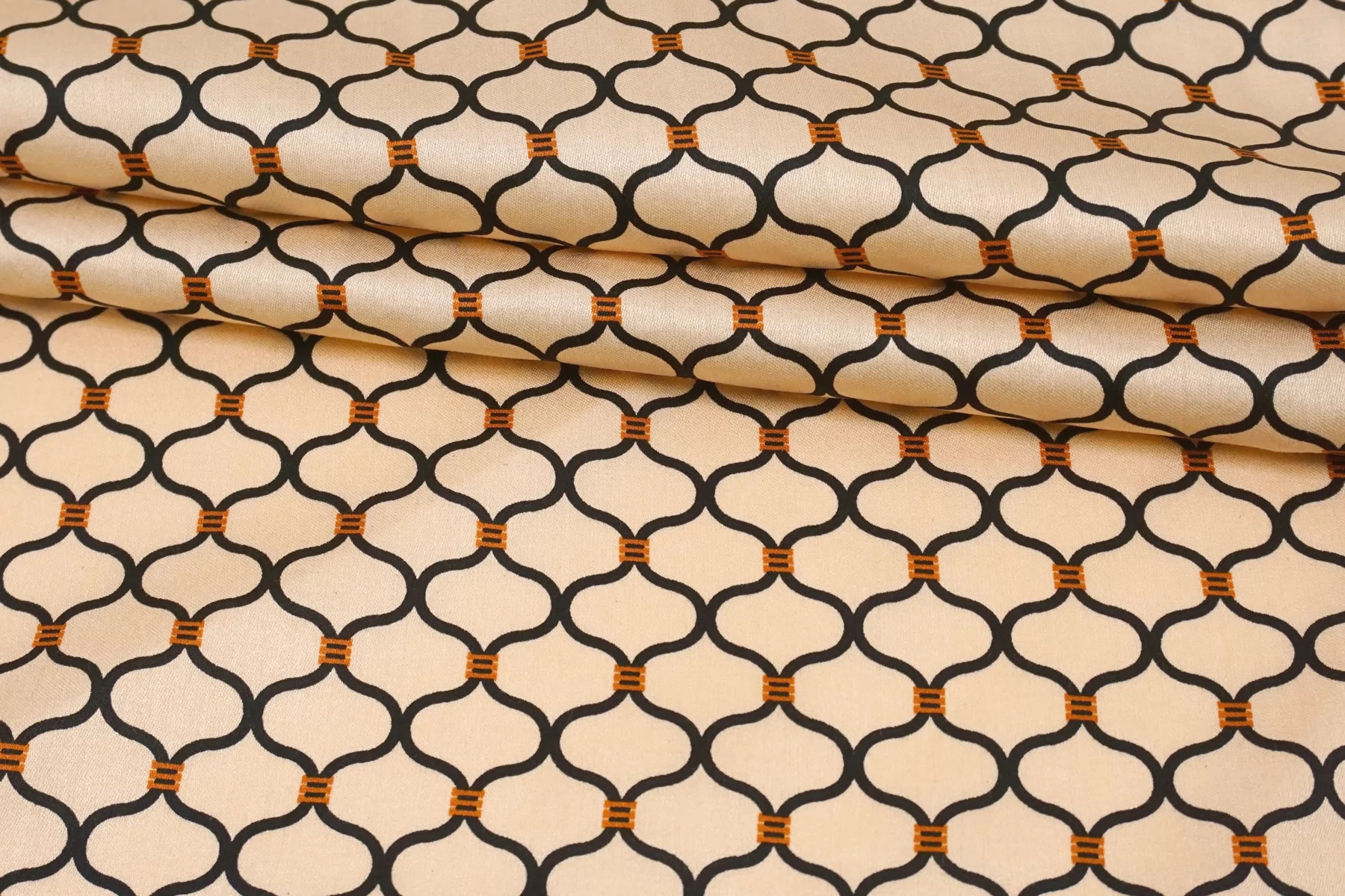 Красивая атласная вискоза, с орнаментальным чёрно-коричневым принтом на персиково-бежевом фоне. Материал тактильно очень приятный, гладкий и очень мягкий. С мягким лоском. Красив в складке и хорошо драпируется. Не тянется. Легкая и струящаяся ткань. Слегка просвечивает силуэт на просвет в один слой. Шикарный вариант на одежду в бельевом стиле, на платье, халат, кимоно, блузку или юбку. Обязательно учитывайте усадку 5-10%. Шить изделия из данного материала рекомендуем тонкой иглой.