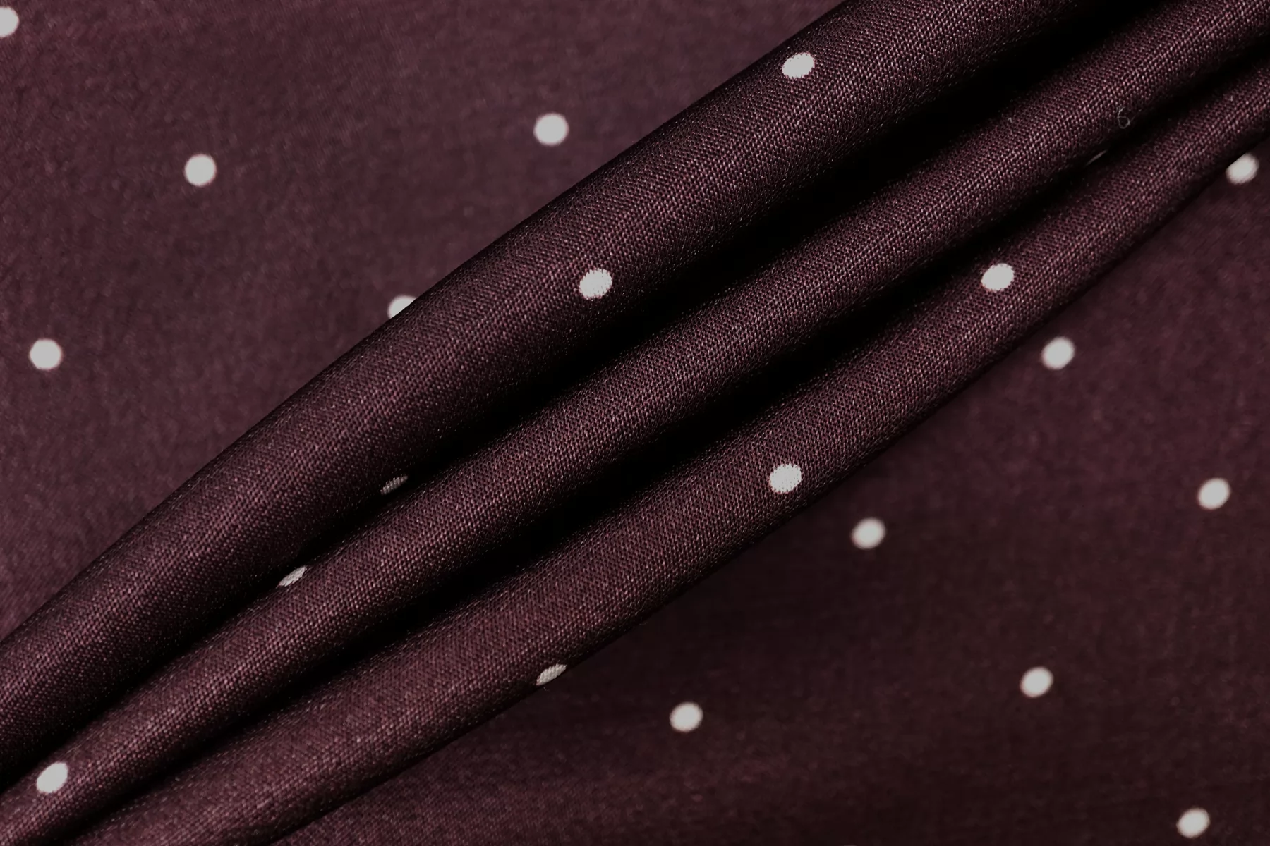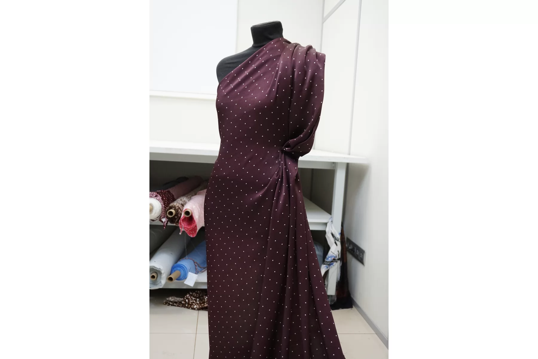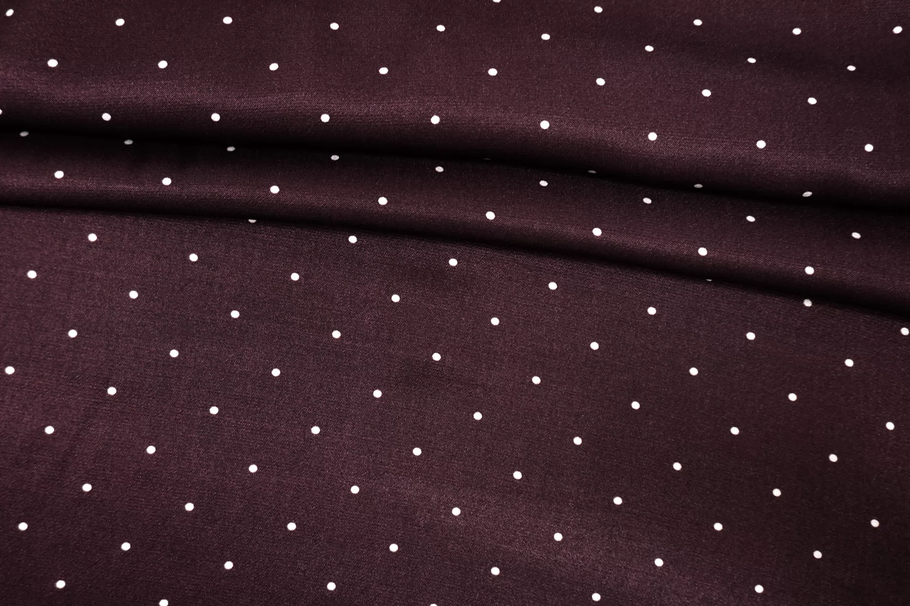Красивая атласная вискоза, насыщенного, сливового цвета, в мелкий белый горошек. Материал тактильно очень приятный, гладкий и очень мягкий. Красив в складке и хорошо драпируется. Не тянется. Ниспадающая и струящаяся ткань. Не просвечивает. Шикарный вариант на одежду в бельевом стиле, на платье, халат, кимоно, юбку, костюм в пижамном стиле. Обязательно учитывайте усадку 5-10%. Шить изделия из данного материала рекомендуем тонкой иглой.