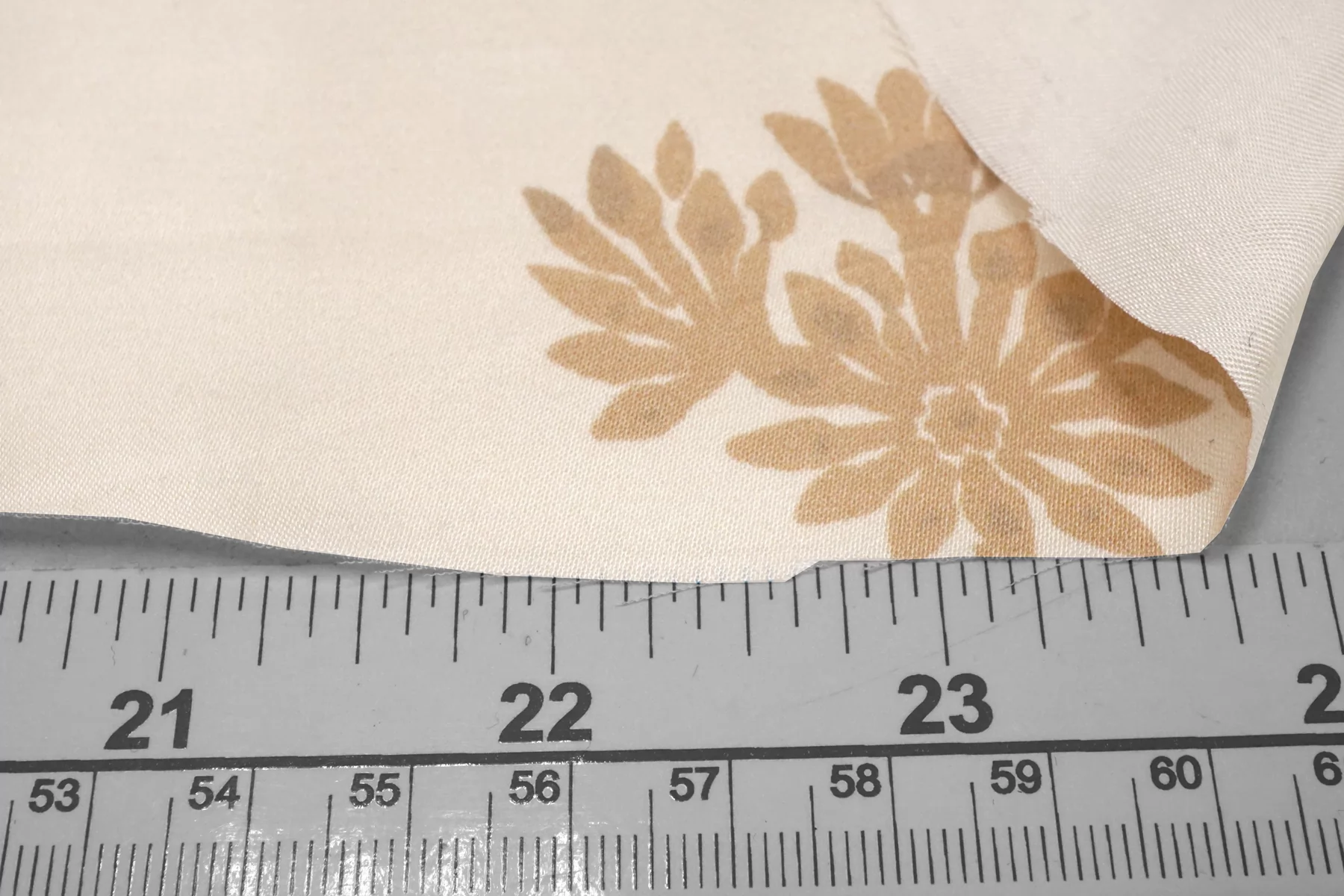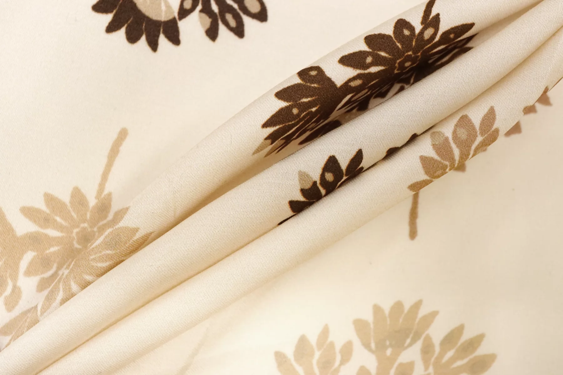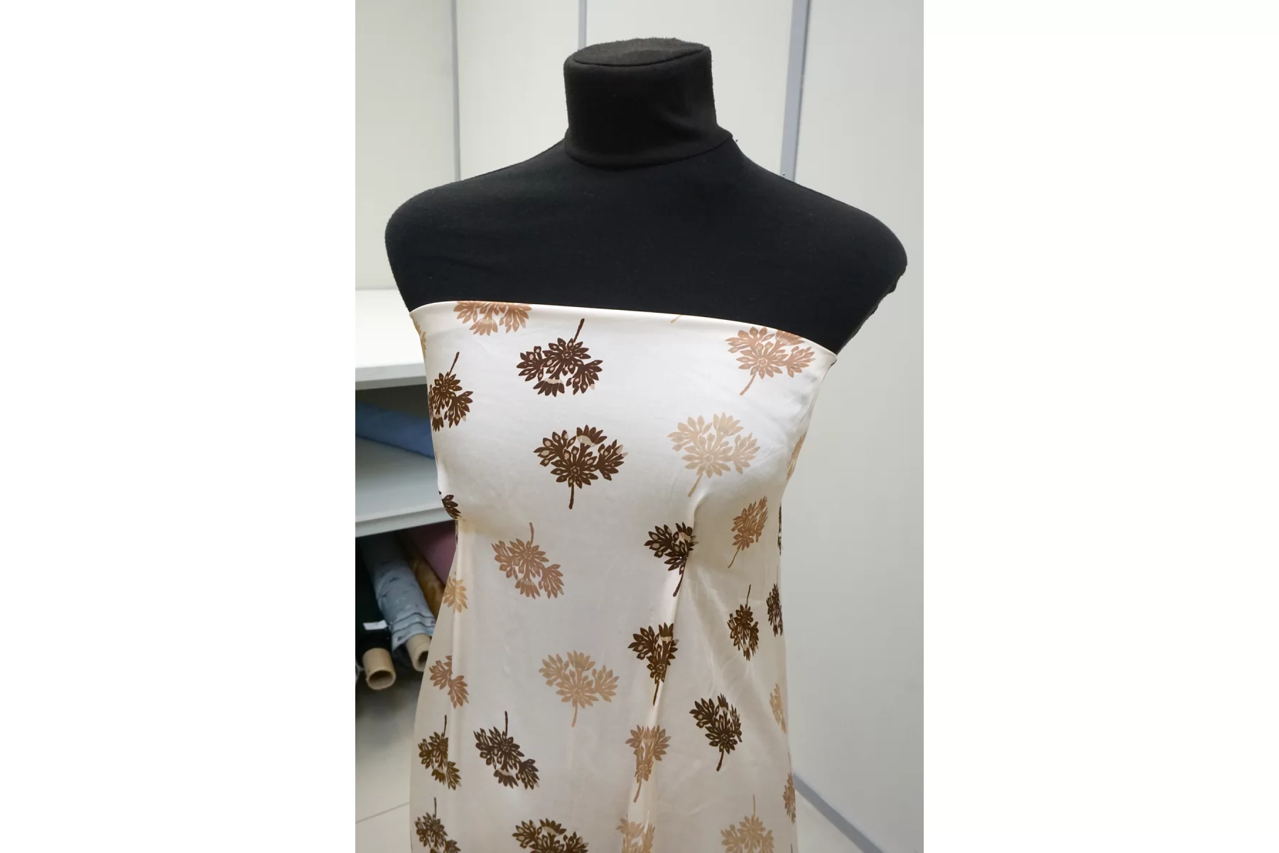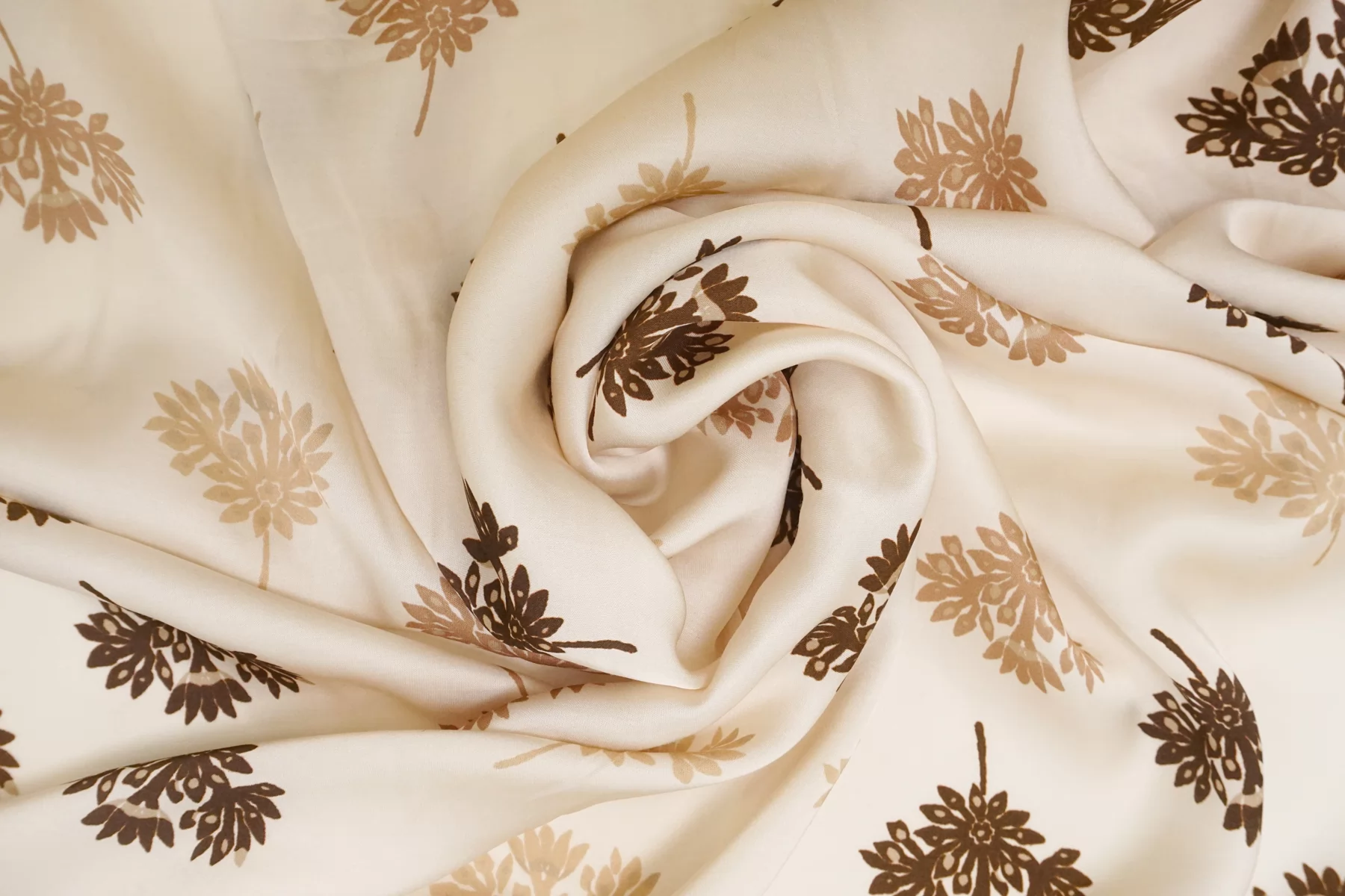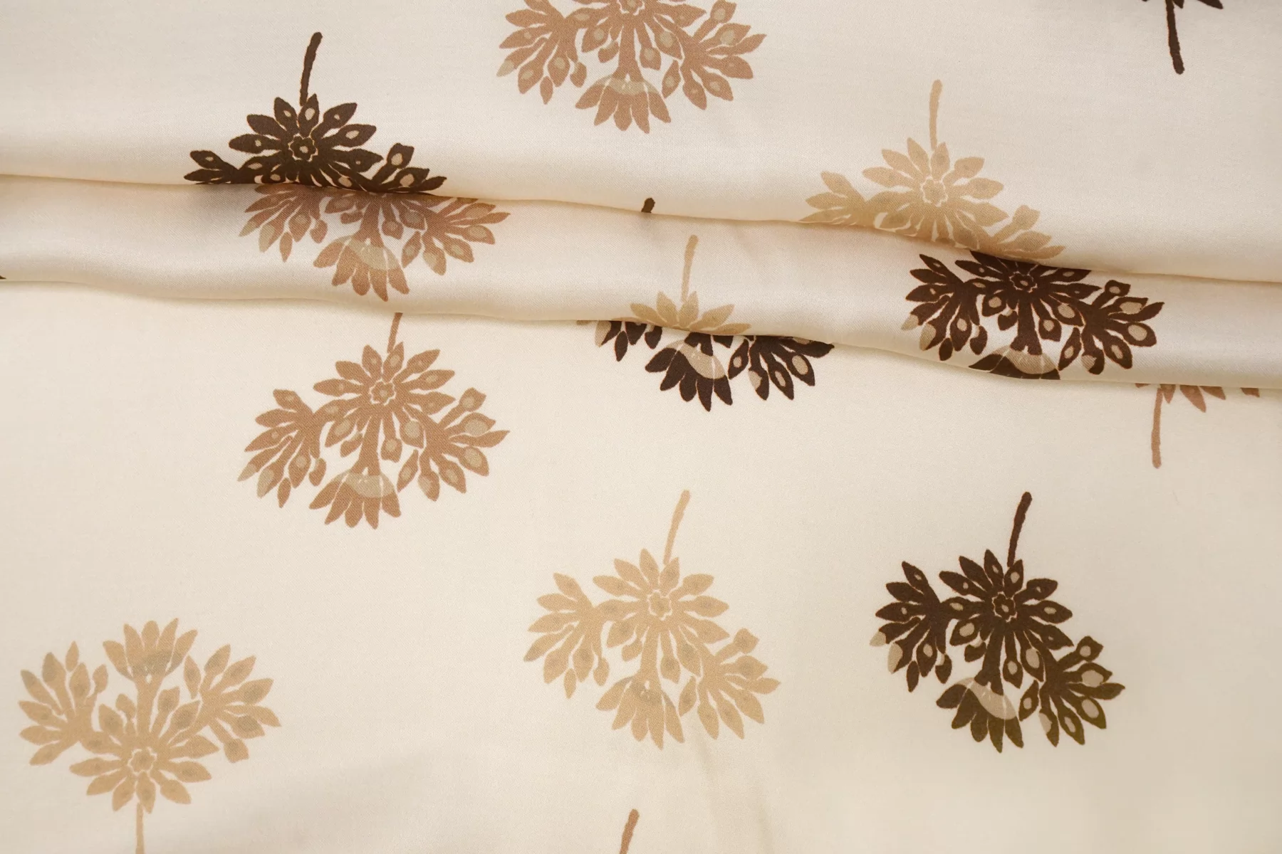 Красивая атласная вискоза, со нежным цветочным принтом на кремовом фоне (очень светлый бежевый). Материал тактильно очень приятный, гладкий и очень мягкий. Красив в складке и хорошо драпируется. Не тянется. Легкая и струящаяся ткань. Слегка просвечивает силуэт на просвет. Шикарный вариант на одежду в бельевом стиле, на платье, халат, кимоно, блузку или юбку. Обязательно учитывайте усадку 5-10%. Шить изделия из данного материала рекомендуем тонкой иглой.