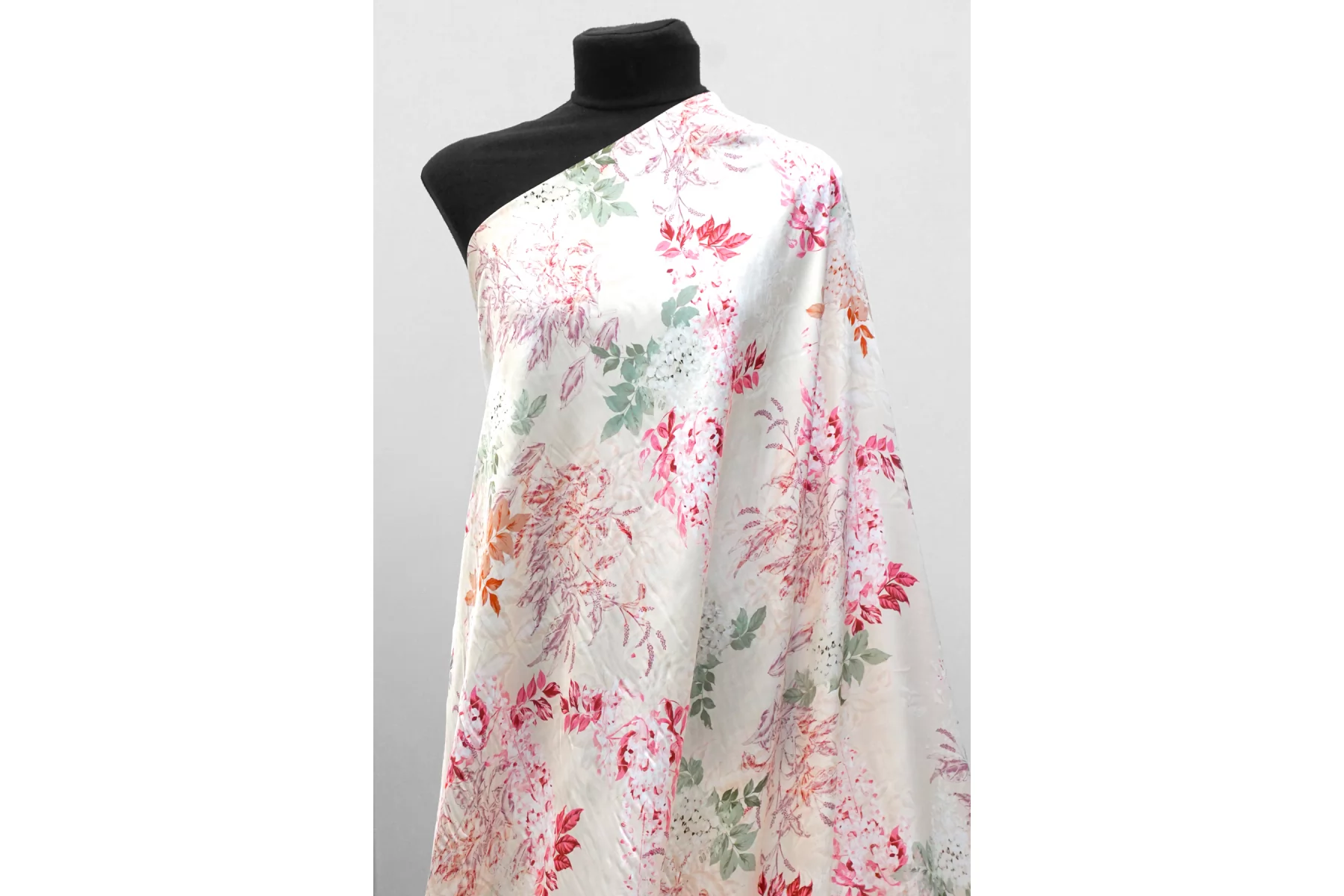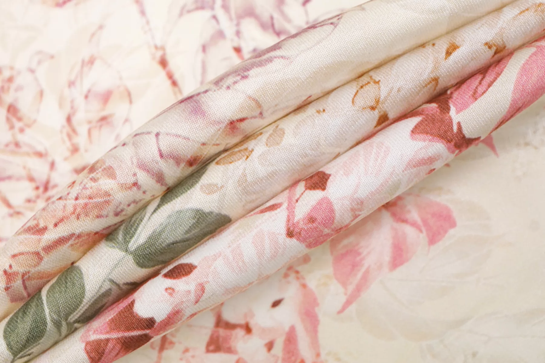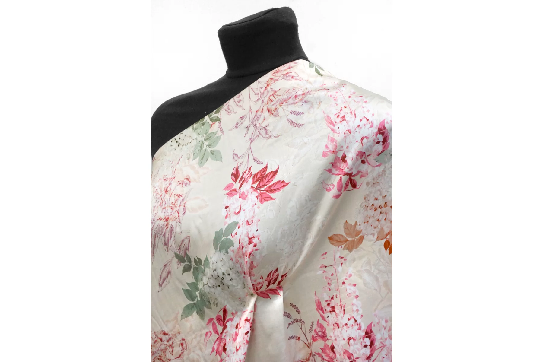 Красивая атласная вискоза, со нежным цветочным принтом на кремовом фоне (очень светлый бежевый). Материал тактильно очень приятный, гладкий и очень мягкий. Красив в складке и хорошо драпируется. Не тянется. Легкая и струящаяся ткань. Слегка просвечивает силуэт на просвет. Шикарный вариант на одежду в бельевом стиле, на платье, халат, кимоно, блузку или юбку. Обязательно учитывайте усадку 5-10%. Шить изделия из данного материала рекомендуем тонкой иглой.