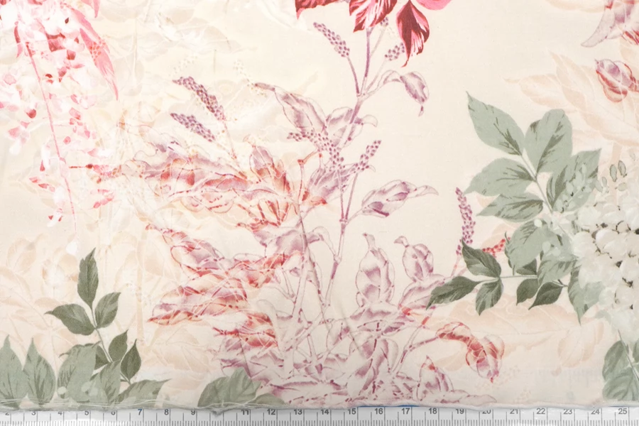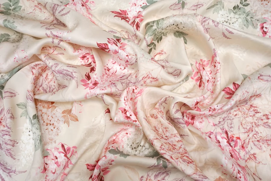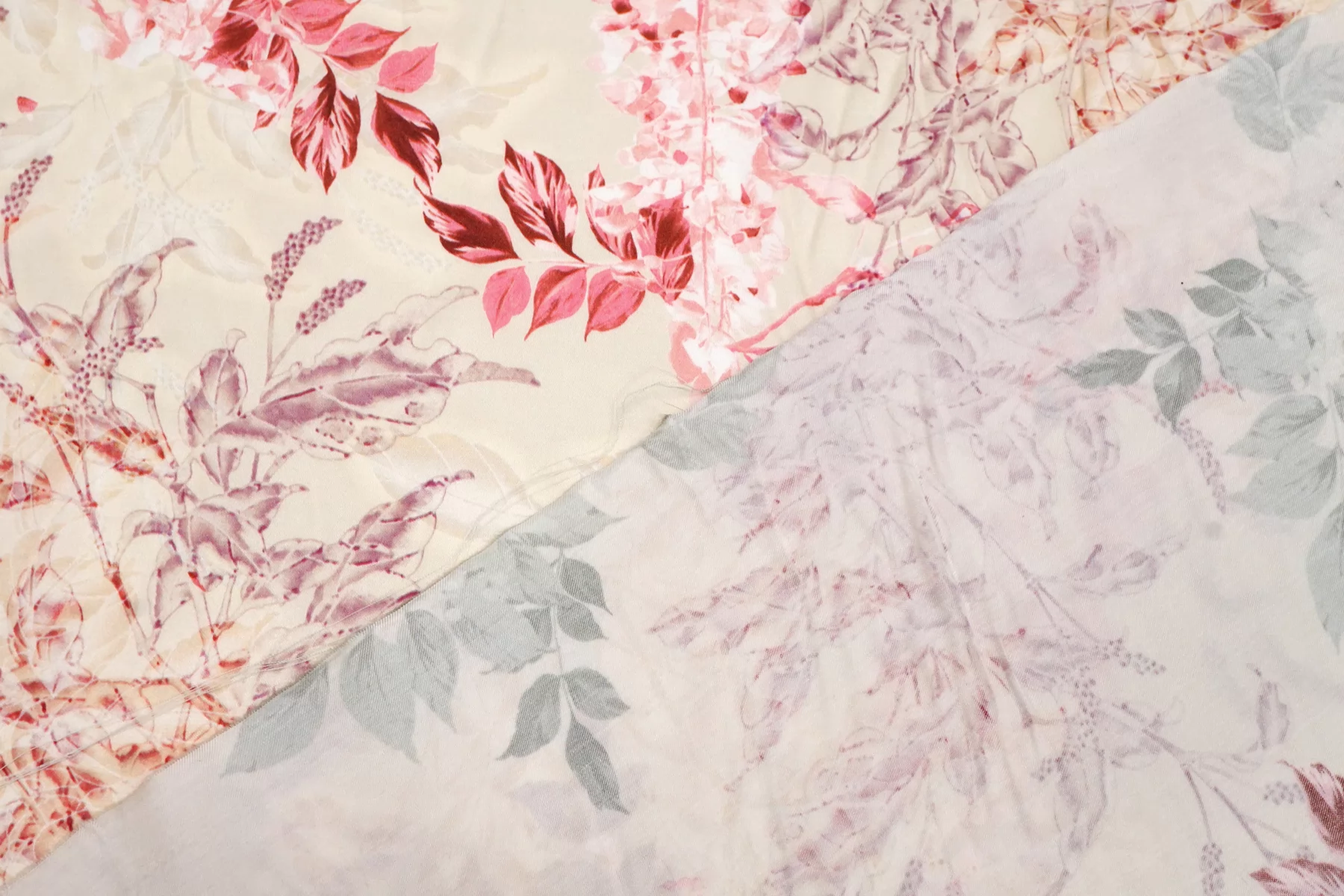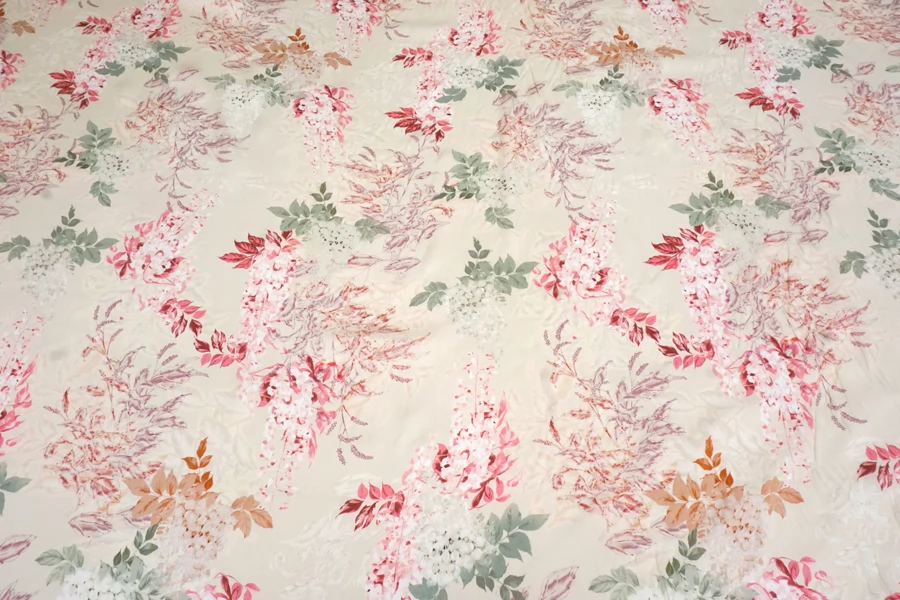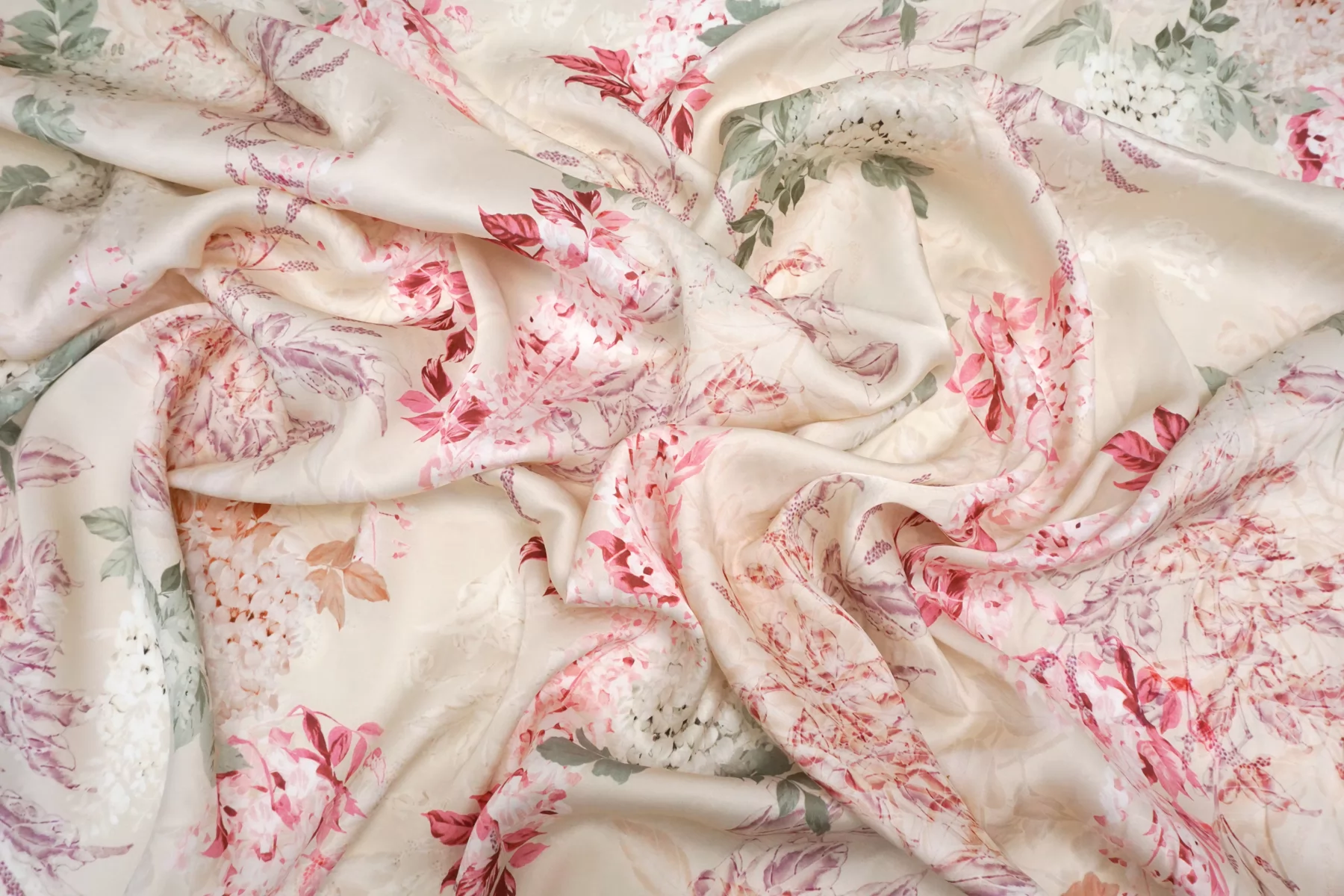 Красивая атласная вискоза, со нежным цветочным принтом на кремовом фоне (очень светлый бежевый). Материал тактильно очень приятный, гладкий и очень мягкий. Красив в складке и хорошо драпируется. Не тянется. Легкая и струящаяся ткань. Слегка просвечивает силуэт на просвет. Шикарный вариант на одежду в бельевом стиле, на платье, халат, кимоно, блузку или юбку. Обязательно учитывайте усадку 5-10%. Шить изделия из данного материала рекомендуем тонкой иглой.