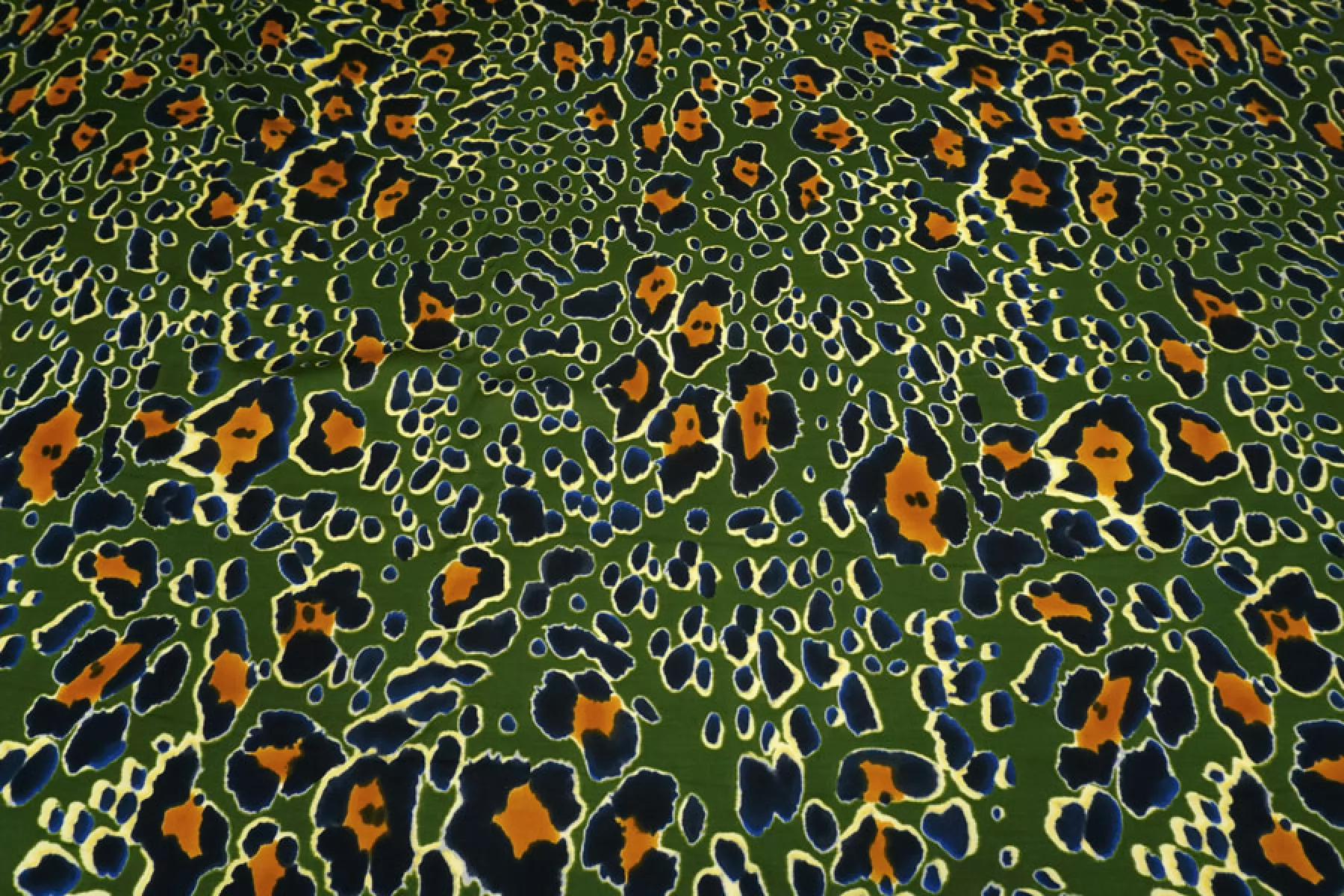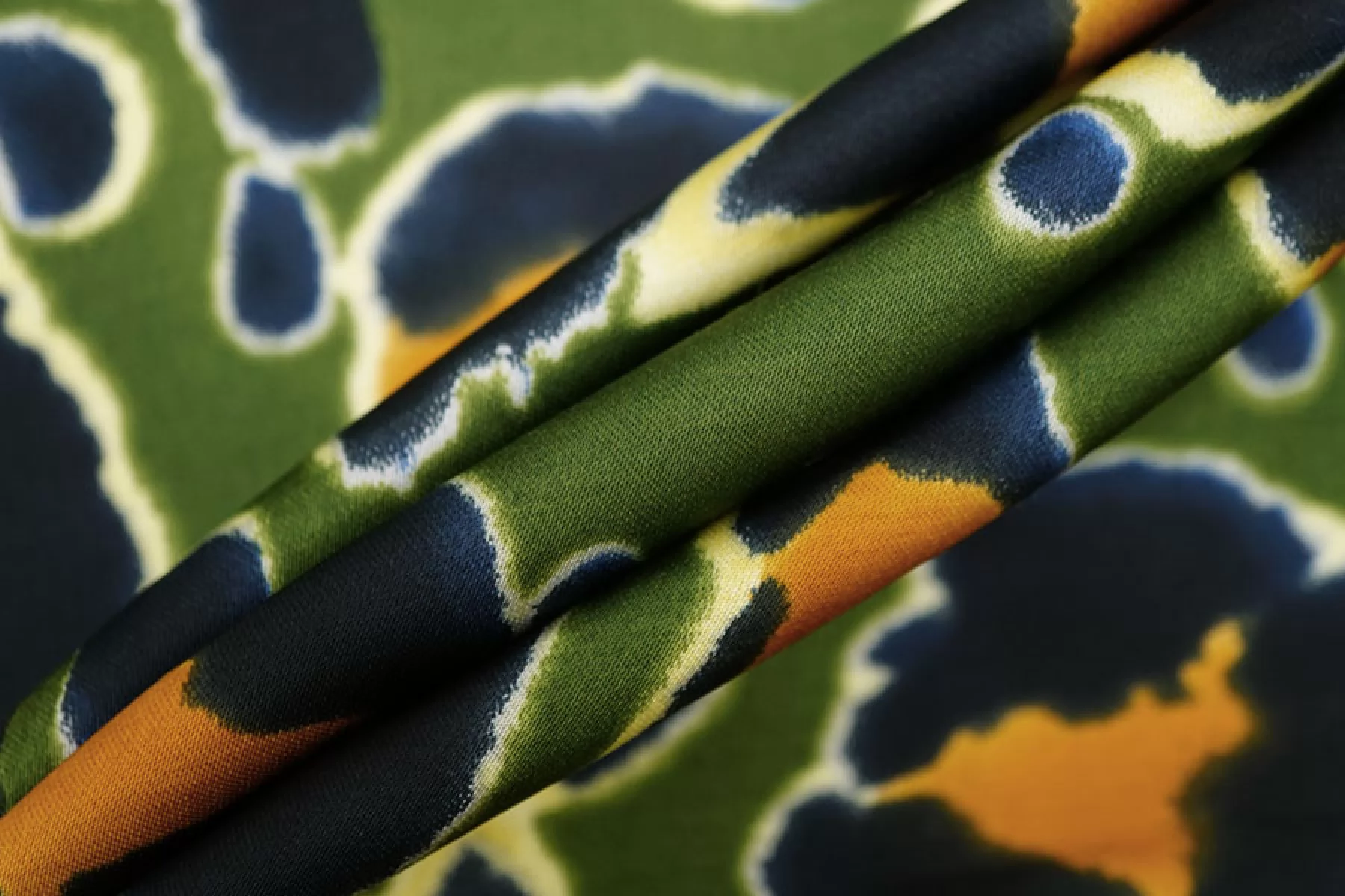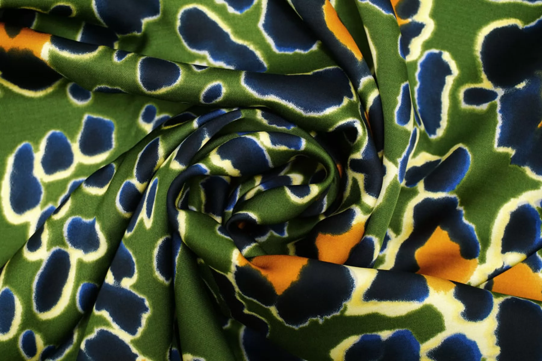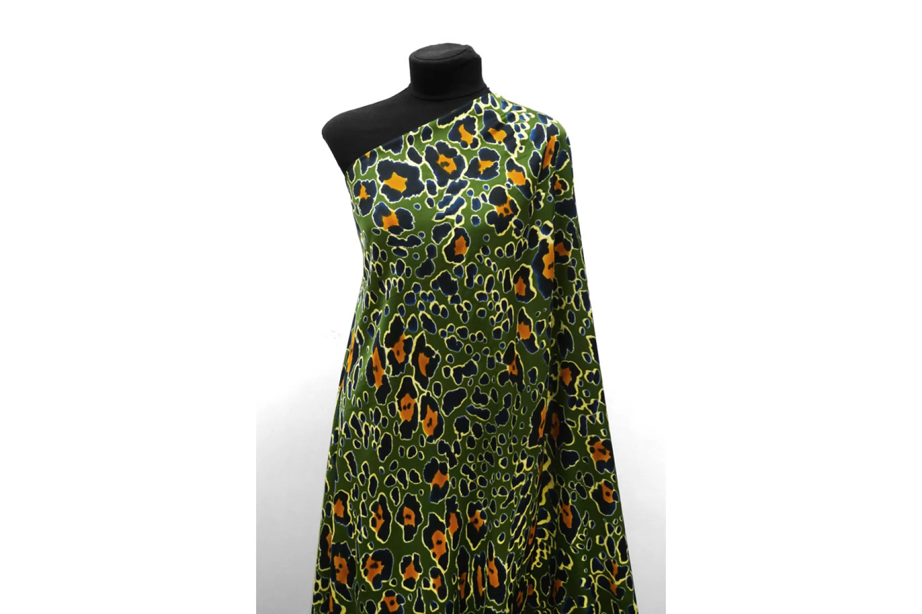 Красивая атласная вискоза от бренда Max Mara, со стилизованным леопардовым сине-охристым принтом на зелёном фоне. Материал тактильно очень приятный, гладкий и очень мягкий. Красив в складке и хорошо драпируется. Не тянется. Легкая и струящаяся. Минимально просвечивает силуэт на просвет. Шикарный вариант на одежду в бельевом стиле, на платье, халат, кимоно, блузку или юбку. Обязательно учитывайте усадку 5-10%. Шить изделия из данного материала рекомендуем тонкой иглой.