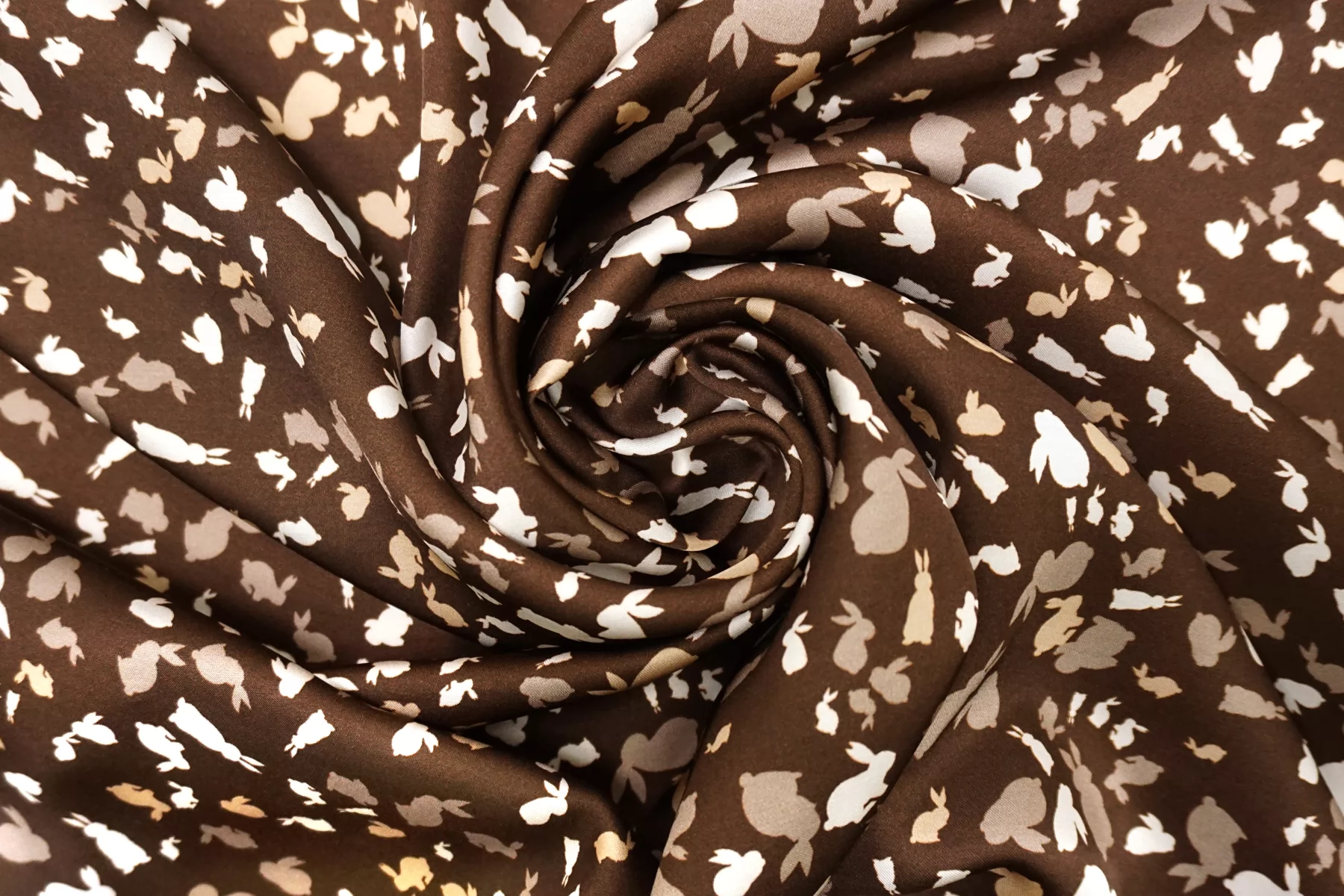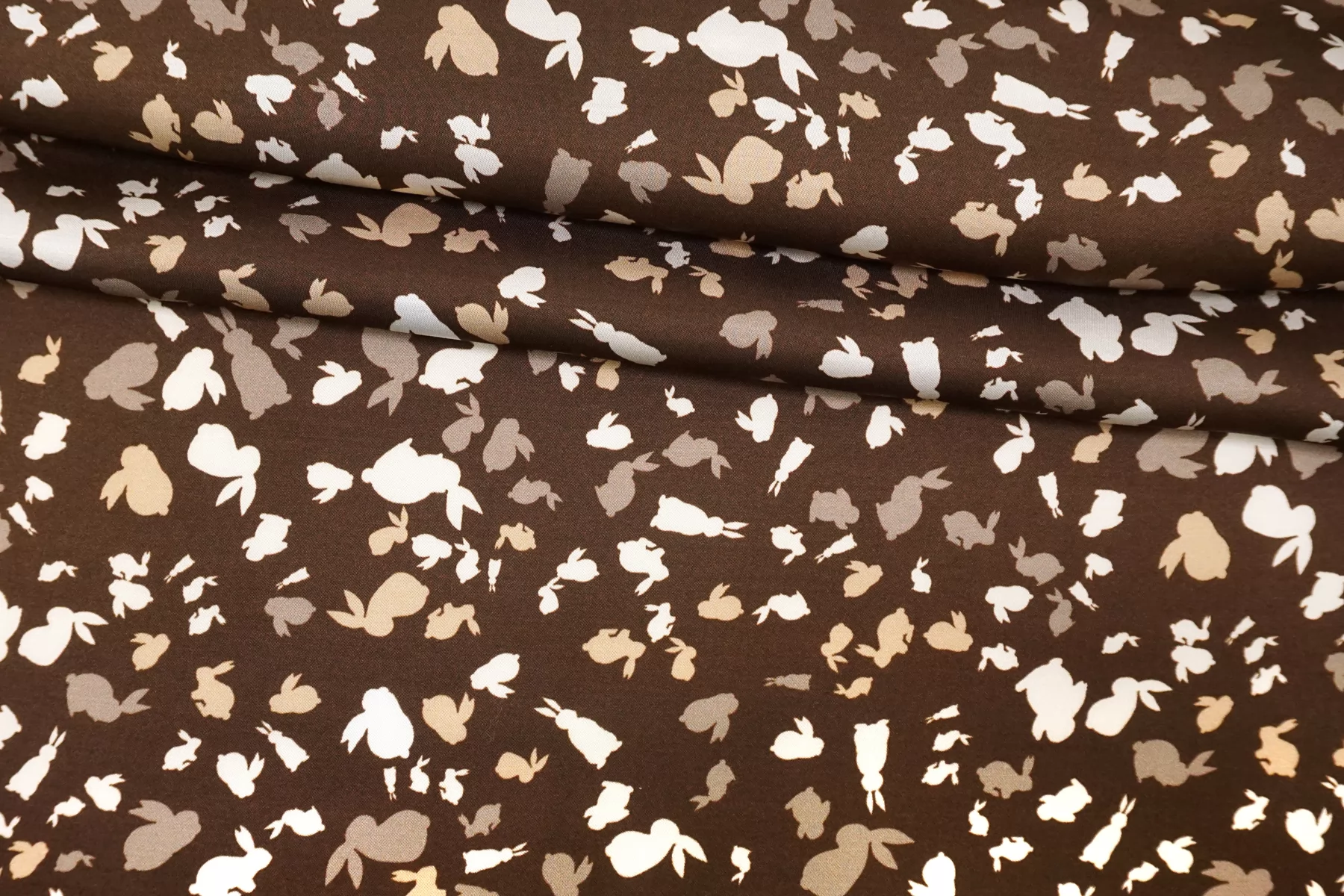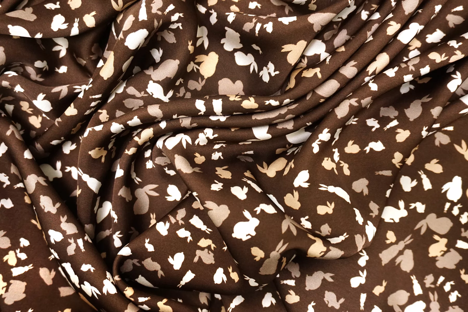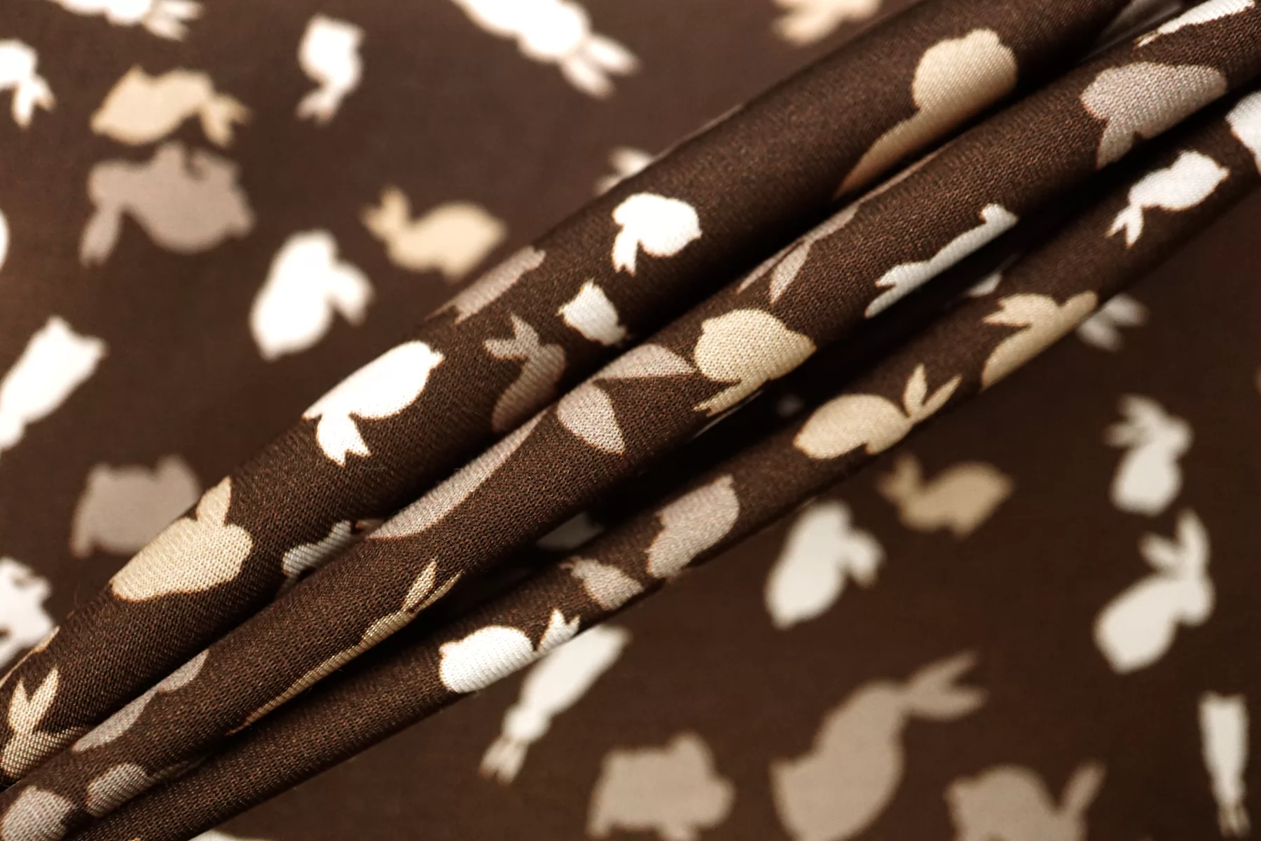 Красивая атласная вискоза, с принтом в виде силуэтов зайчиков в коричневых тонах. Материал тактильно очень приятный, гладкий и очень мягкий. Красив в складке и хорошо драпируется. Не тянется. Легкая и струящаяся ткань. Слегка просвечивает силуэт на просвет. Шикарный вариант на одежду в бельевом стиле, на платье, халат, кимоно, блузку или юбку. Обязательно учитывайте усадку 5-10%. Шить изделия из данного материала рекомендуем тонкой иглой.
