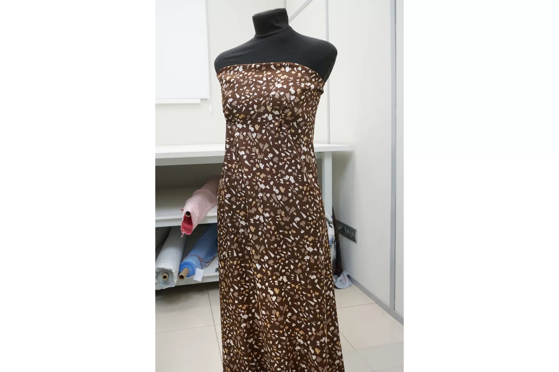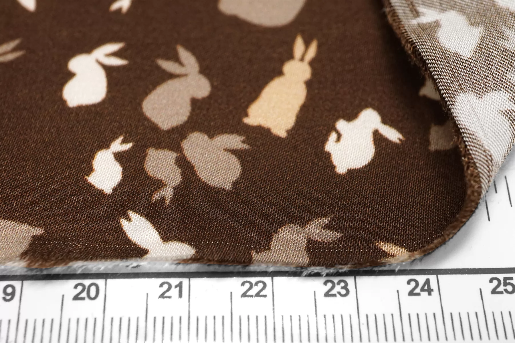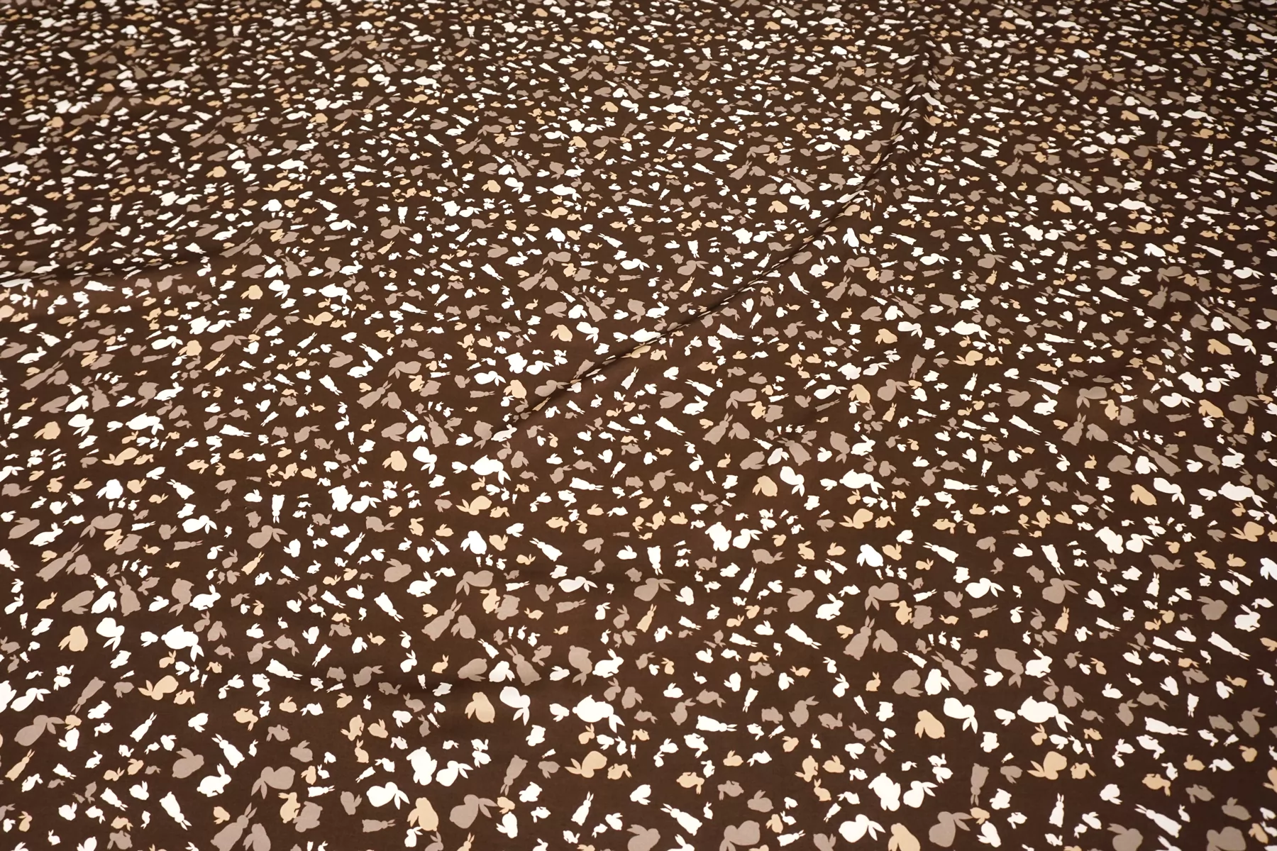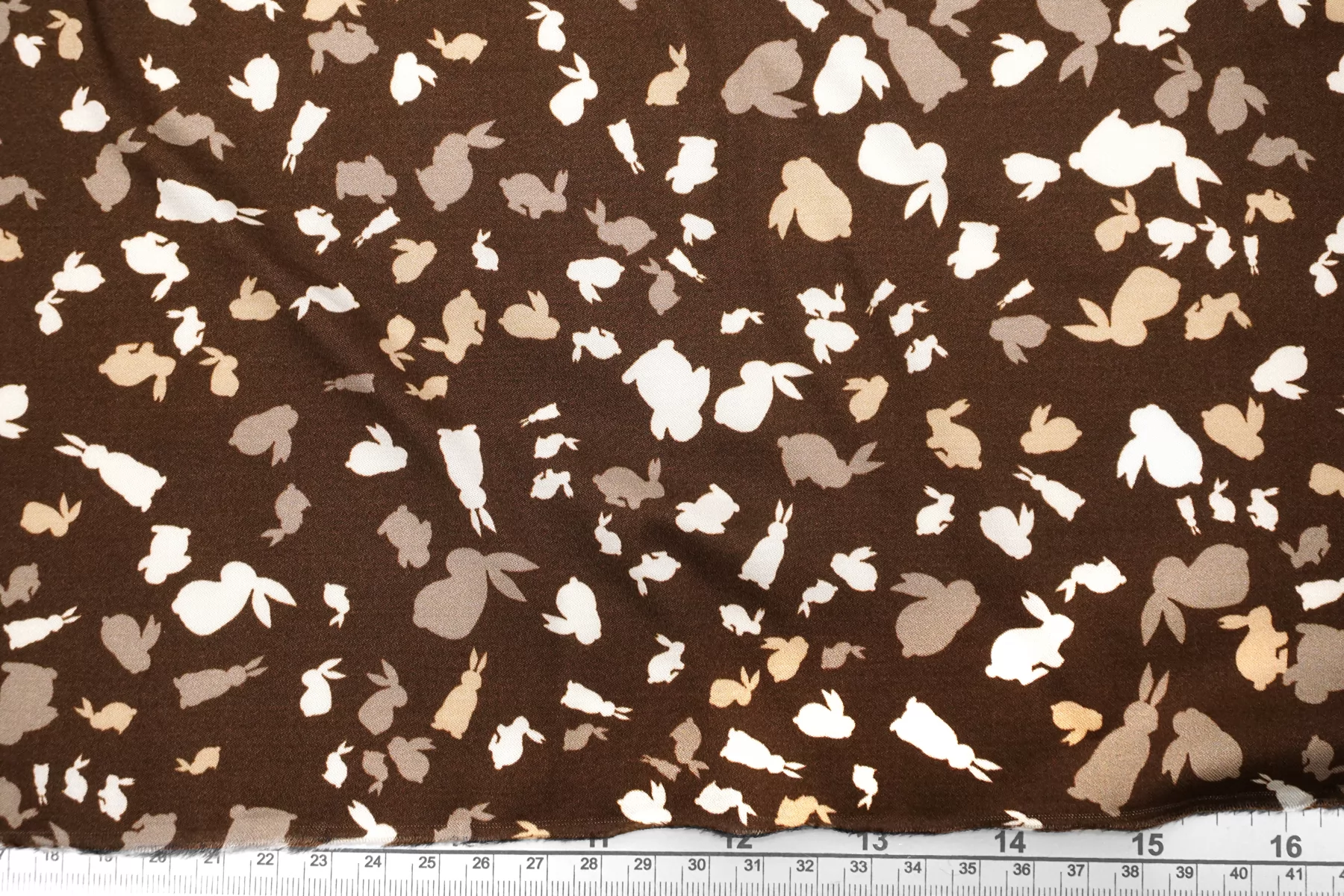 Красивая атласная вискоза, с принтом в виде силуэтов зайчиков в коричневых тонах. Материал тактильно очень приятный, гладкий и очень мягкий. Красив в складке и хорошо драпируется. Не тянется. Легкая и струящаяся ткань. Слегка просвечивает силуэт на просвет. Шикарный вариант на одежду в бельевом стиле, на платье, халат, кимоно, блузку или юбку. Обязательно учитывайте усадку 5-10%. Шить изделия из данного материала рекомендуем тонкой иглой.
