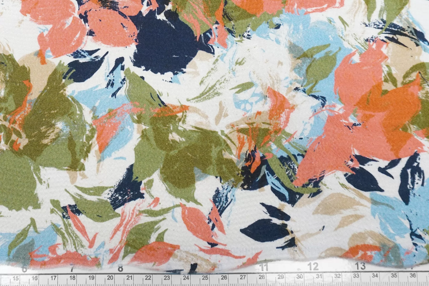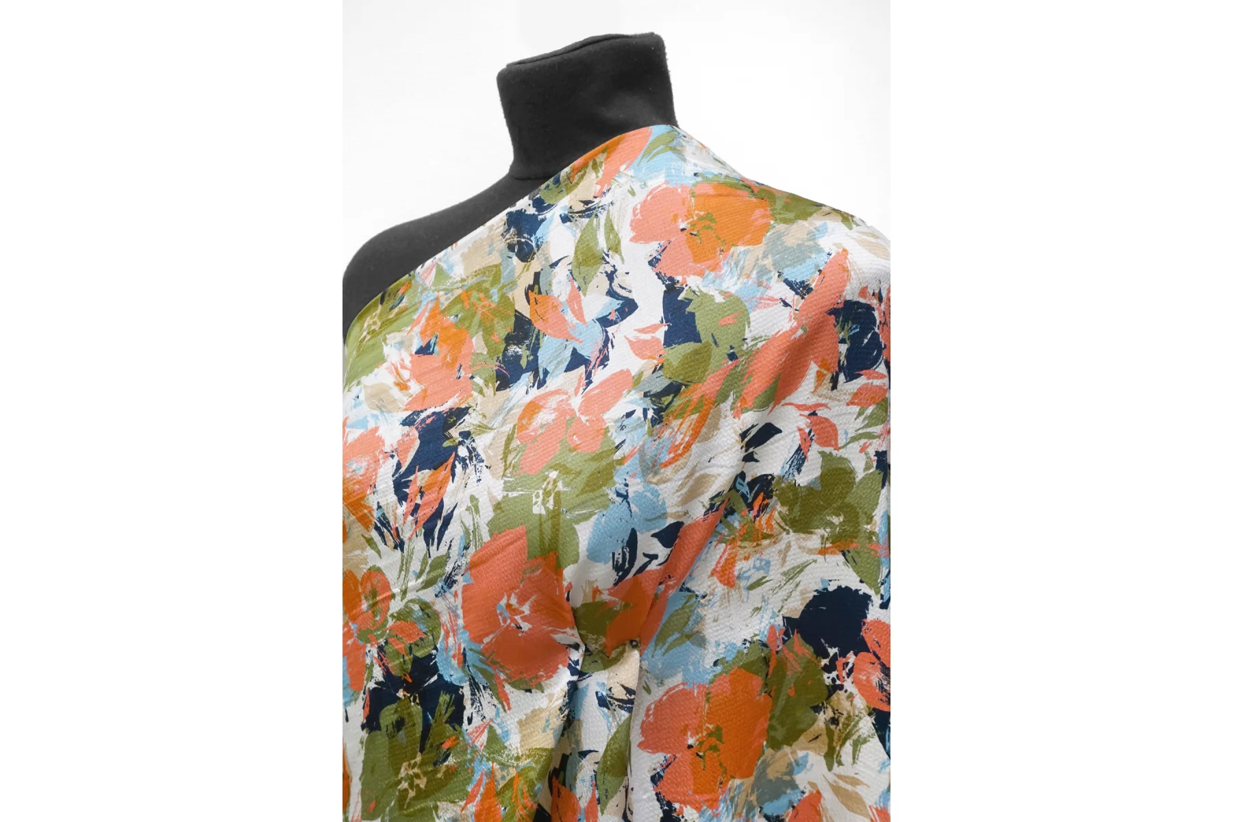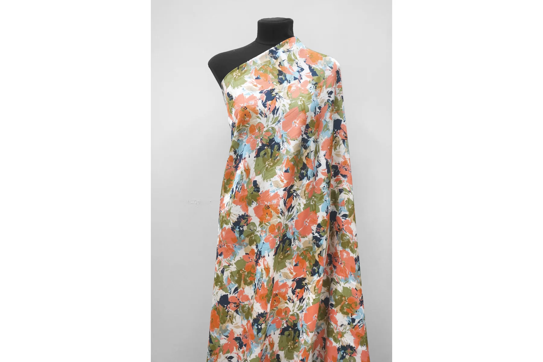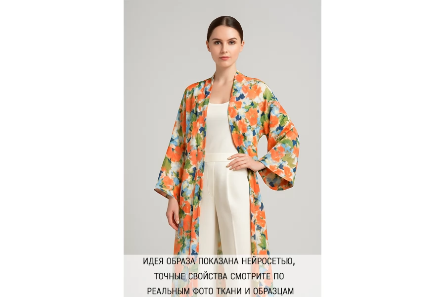 Красивая атласная вискоза от бренда Marella, с жаккардовой выработкой, и стилизованным цветочным принтом на бело-молочном фоне (цвета принта: голубой, зеленый, чёрный и розовато-персиковый). Материал тактильно очень приятный, гладкий и очень мягкий. Слегка шероховатый и холодящий. Красив в складке и хорошо драпируется. Не тянется. Образовывает упругие складки. Слегка просвечивает силуэт на просвет. Шикарный вариант на одежду в бельевом стиле, на платье, халат, кимоно, блузку или юбку. Обязательно учитывайте усадку 5-10%. Шить изделия из данного материала рекомендуем тонкой иглой.