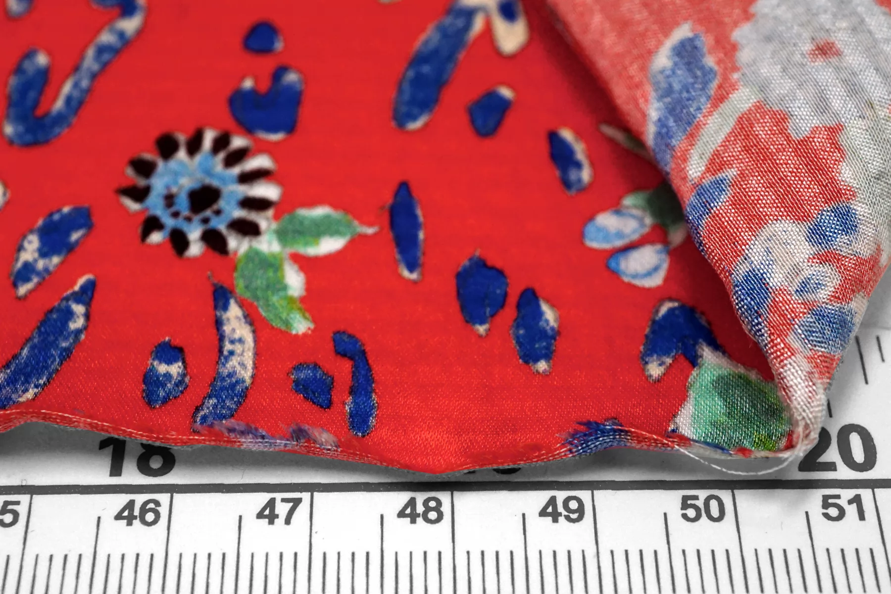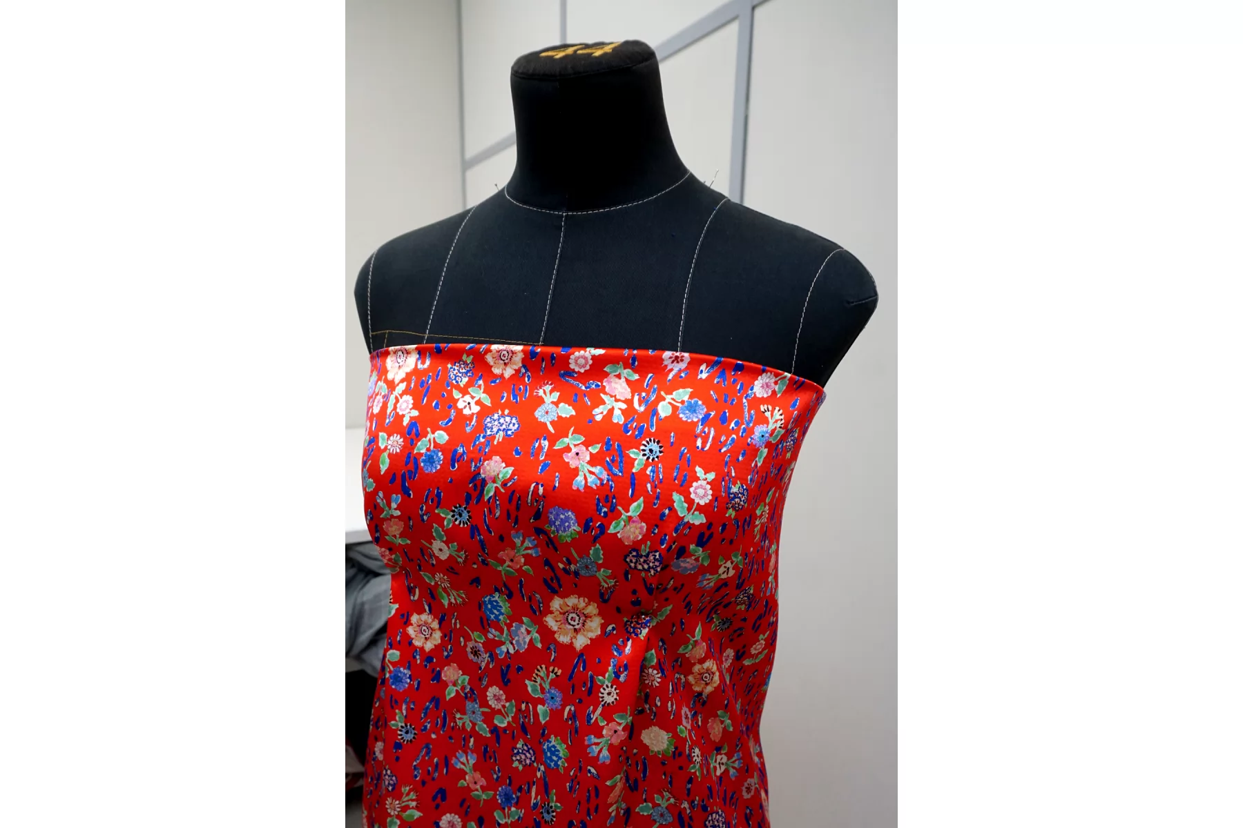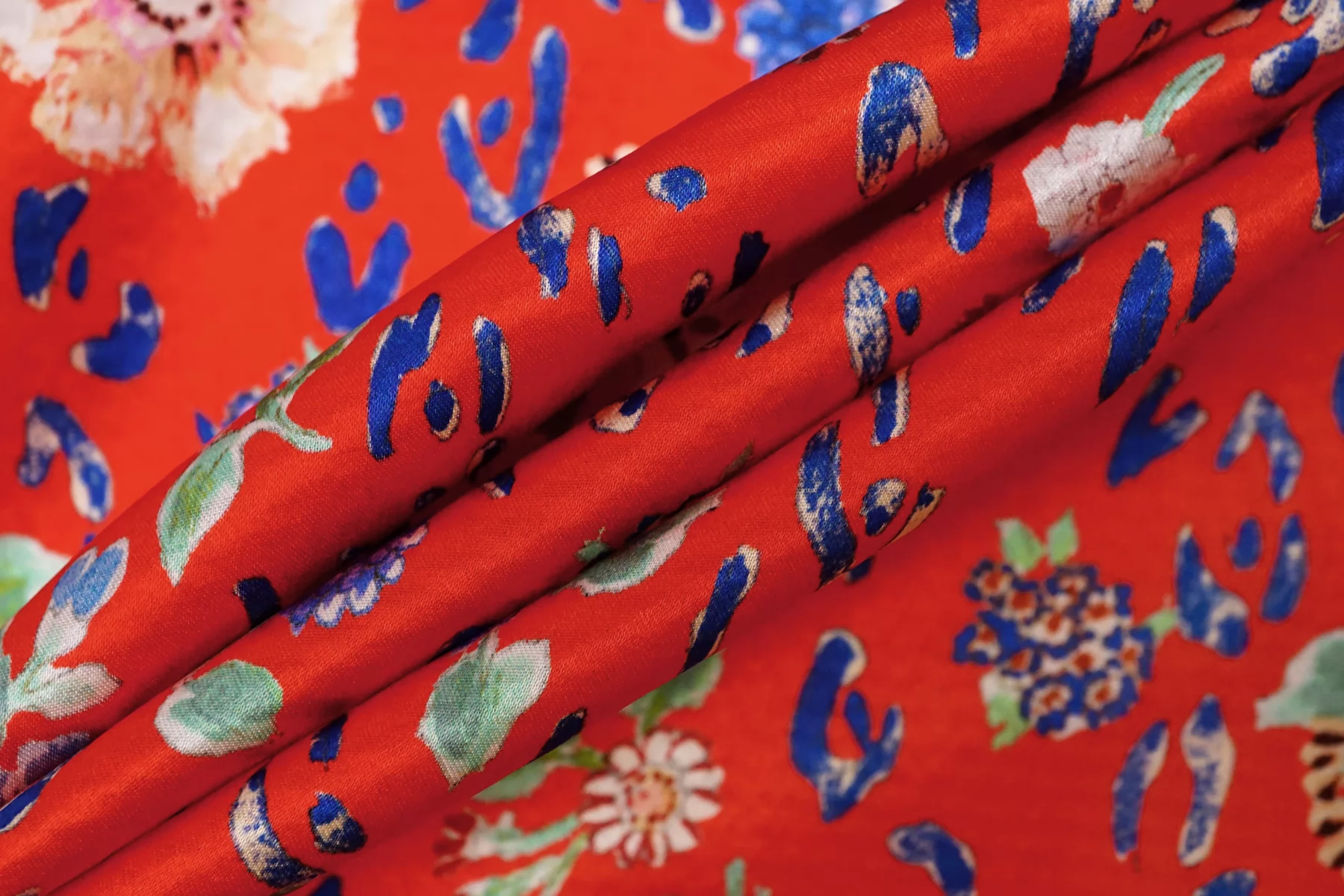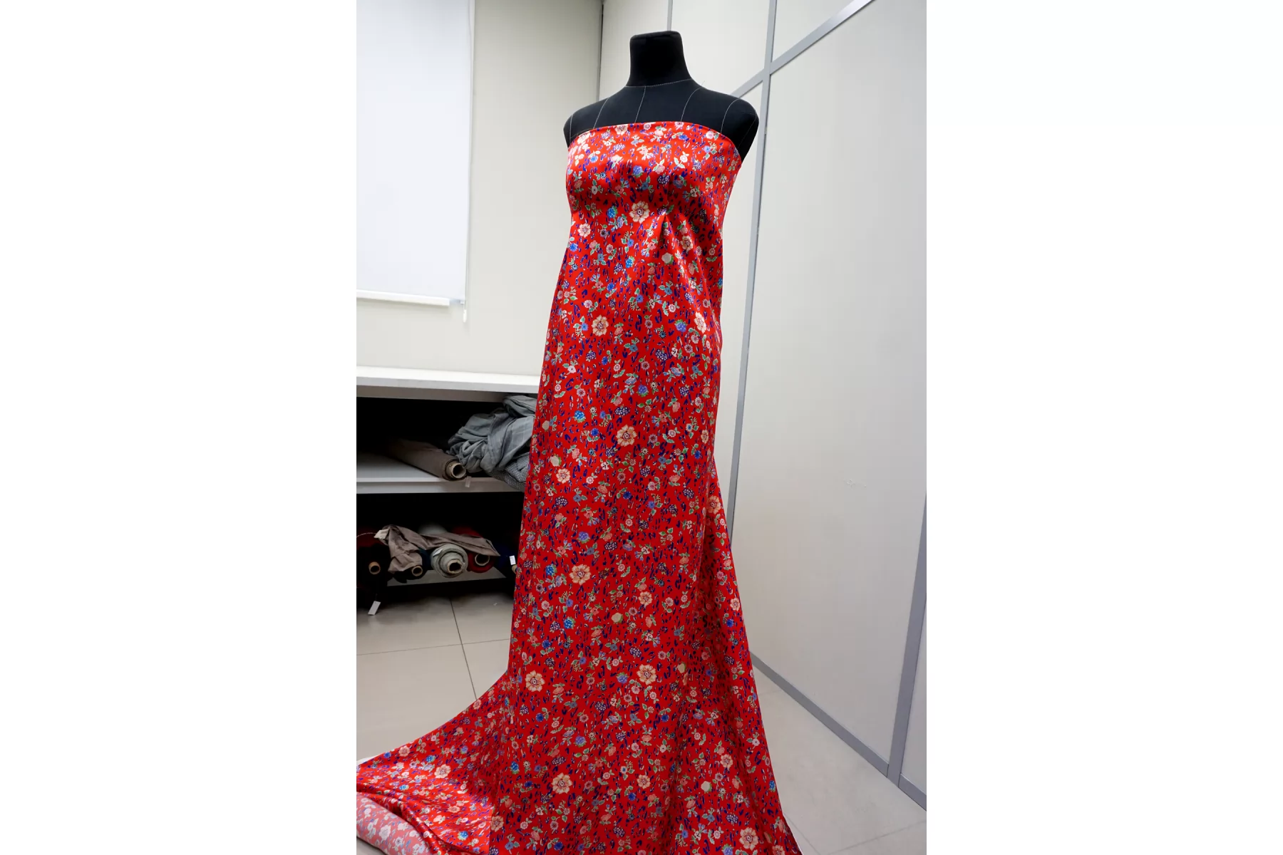 Атласный шёлк плательно-блузочной плотности, с цветочным принтом на красном фоне. Фактурность сирсакера слабо выражена, лишь лёгкая волна на поверхности. Не прозрачный, но прослеживается силуэт на просвет. Пластичный, не тянется. Немного мнется. Обладает шелковым блеском. Прекрасно подойдет на платье, блузку, тунику, юбку и одежду в бельевом стиле. Уход за материалом деликатный.