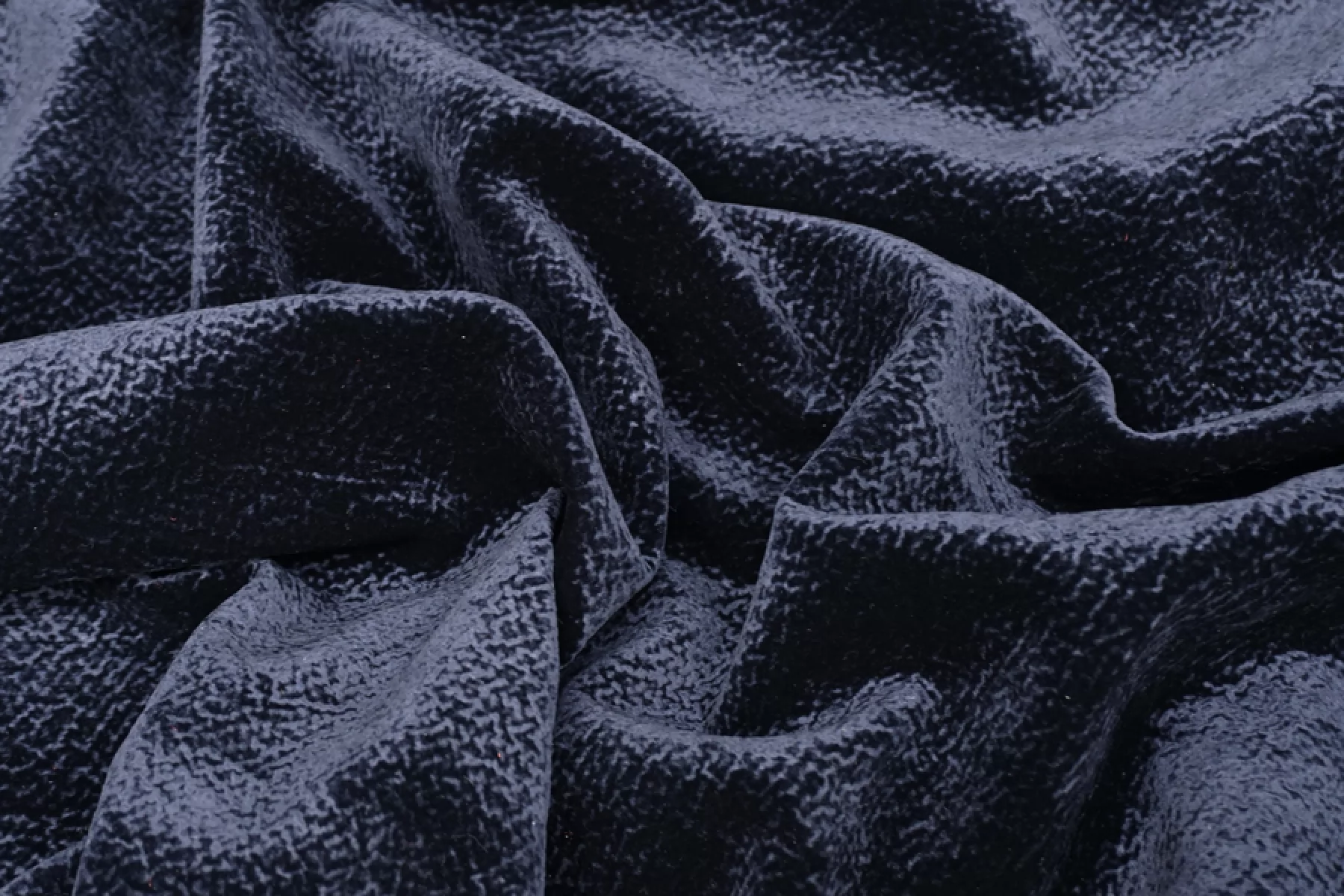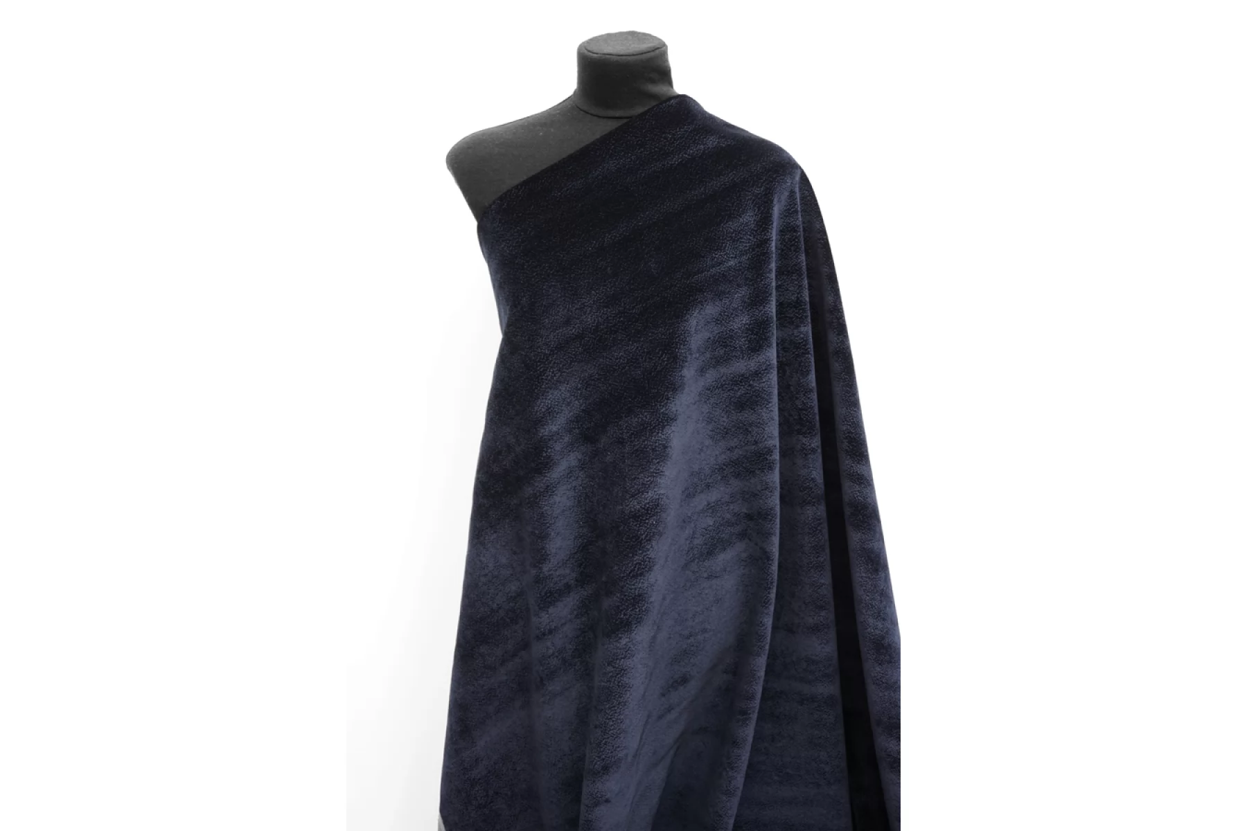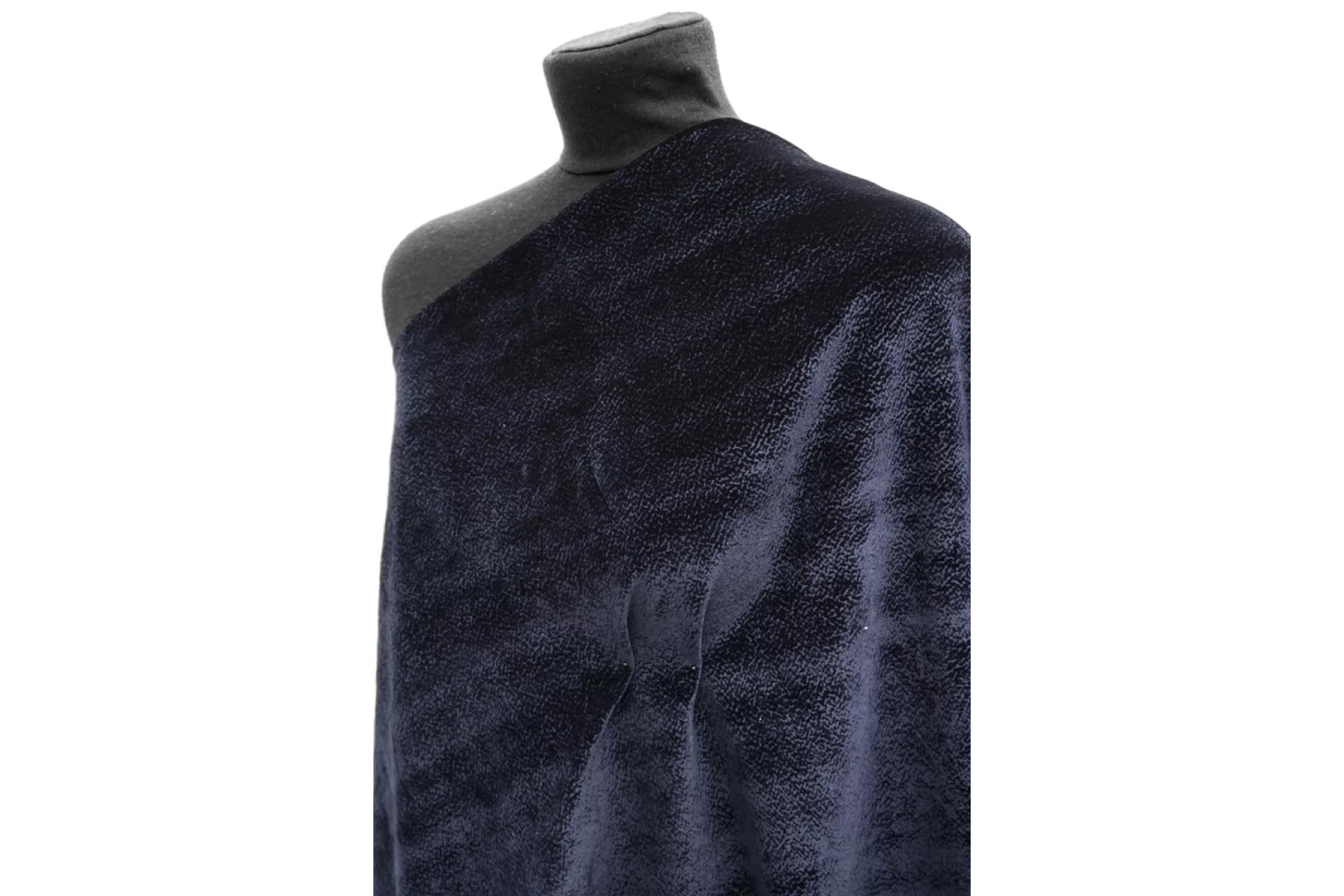 Костюмно-плательный хлопковый бархат фактурный темно-синий. Ворс короткий ненаправленный. Приятный, мягкий, нетолстый, пластичный. Около 1 мм толщиной. Не тянется, но слегка пружинит за счет плетения, не просвечивает. Обладает очень легким бархатным лоском. Отлично драпируется и неплохо держит форму. Ворс недлинный, направленный. Слегка сминается. Прекрасно подойдет на платья, мягкие жакеты, костюмные варианты, юбки и не только.