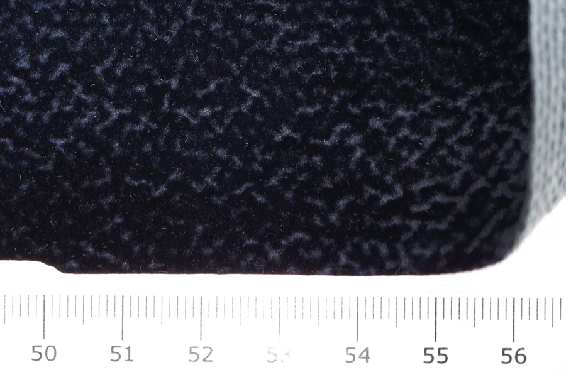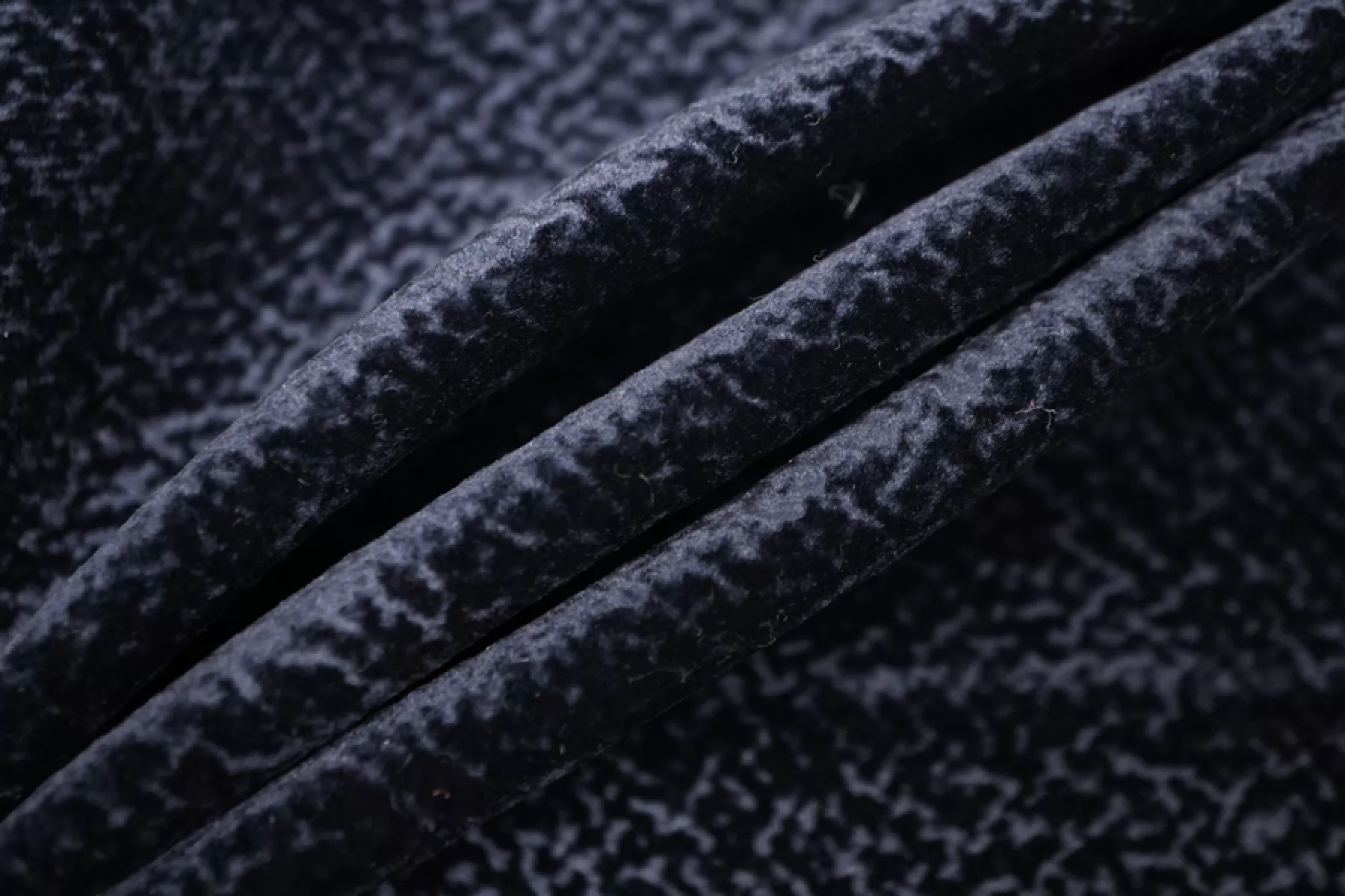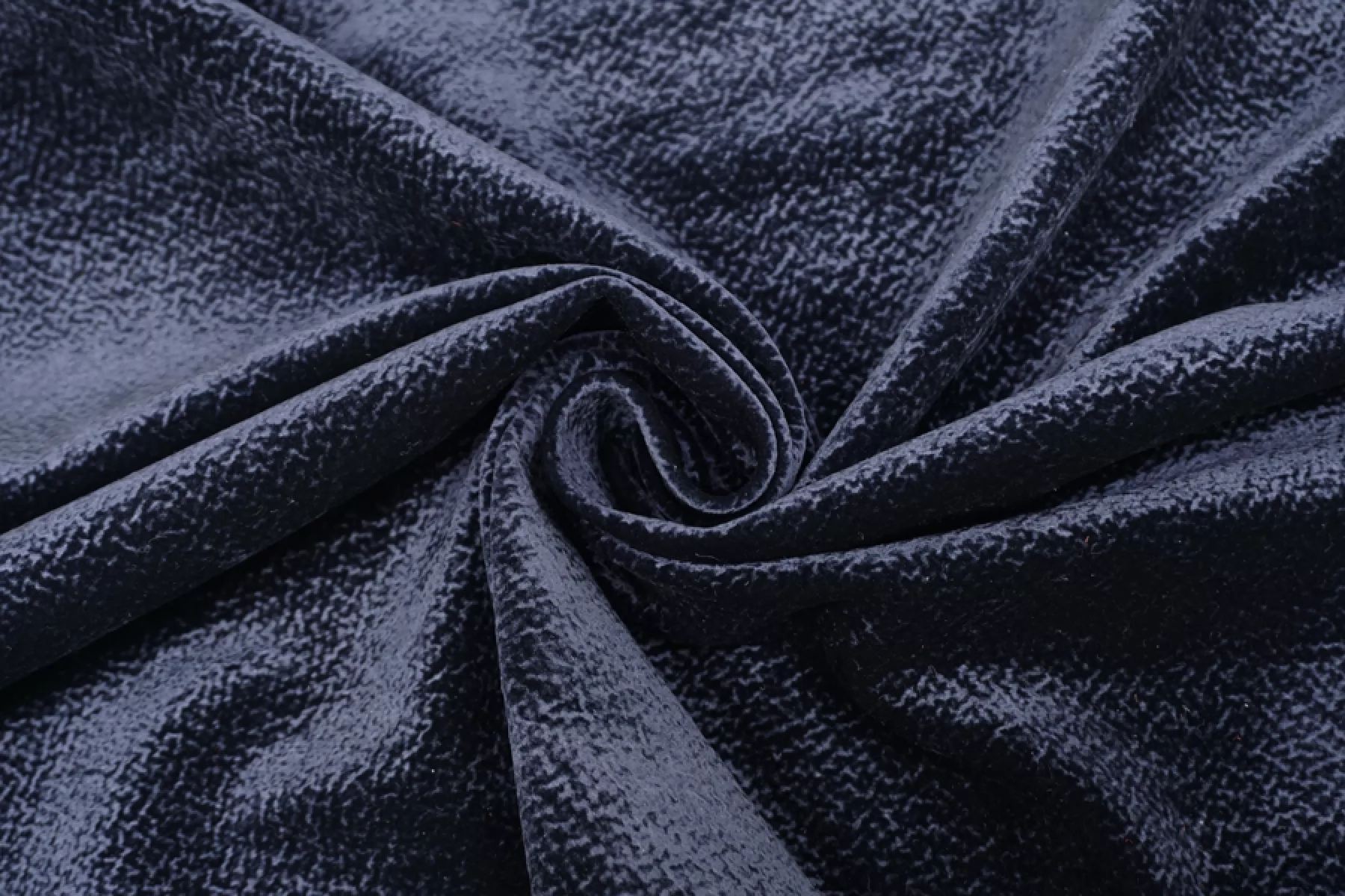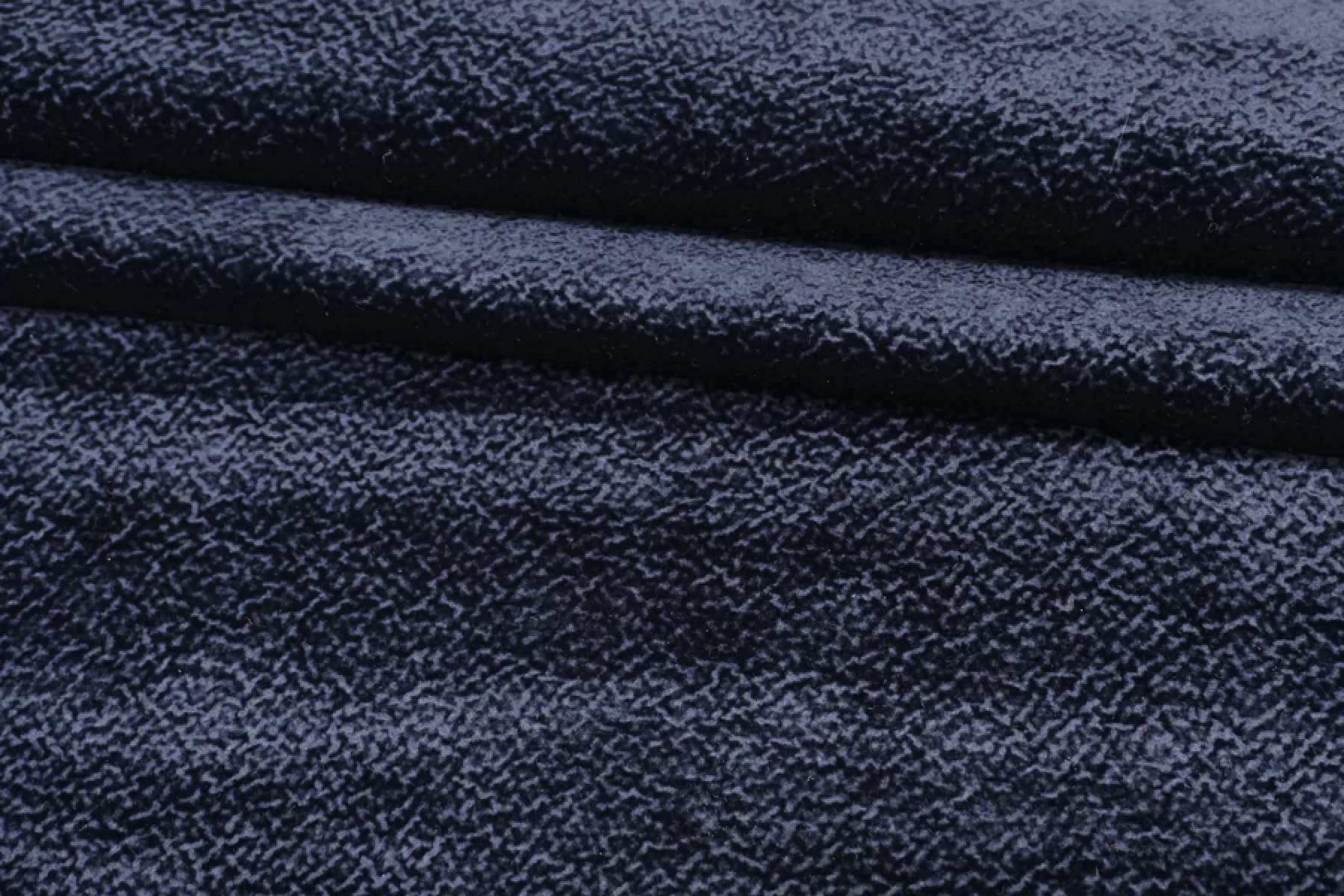 Костюмно-плательный хлопковый бархат фактурный темно-синий. Ворс короткий ненаправленный. Приятный, мягкий, нетолстый, пластичный. Около 1 мм толщиной. Не тянется, но слегка пружинит за счет плетения, не просвечивает. Обладает очень легким бархатным лоском. Отлично драпируется и неплохо держит форму. Ворс недлинный, направленный. Слегка сминается. Прекрасно подойдет на платья, мягкие жакеты, костюмные варианты, юбки и не только.
