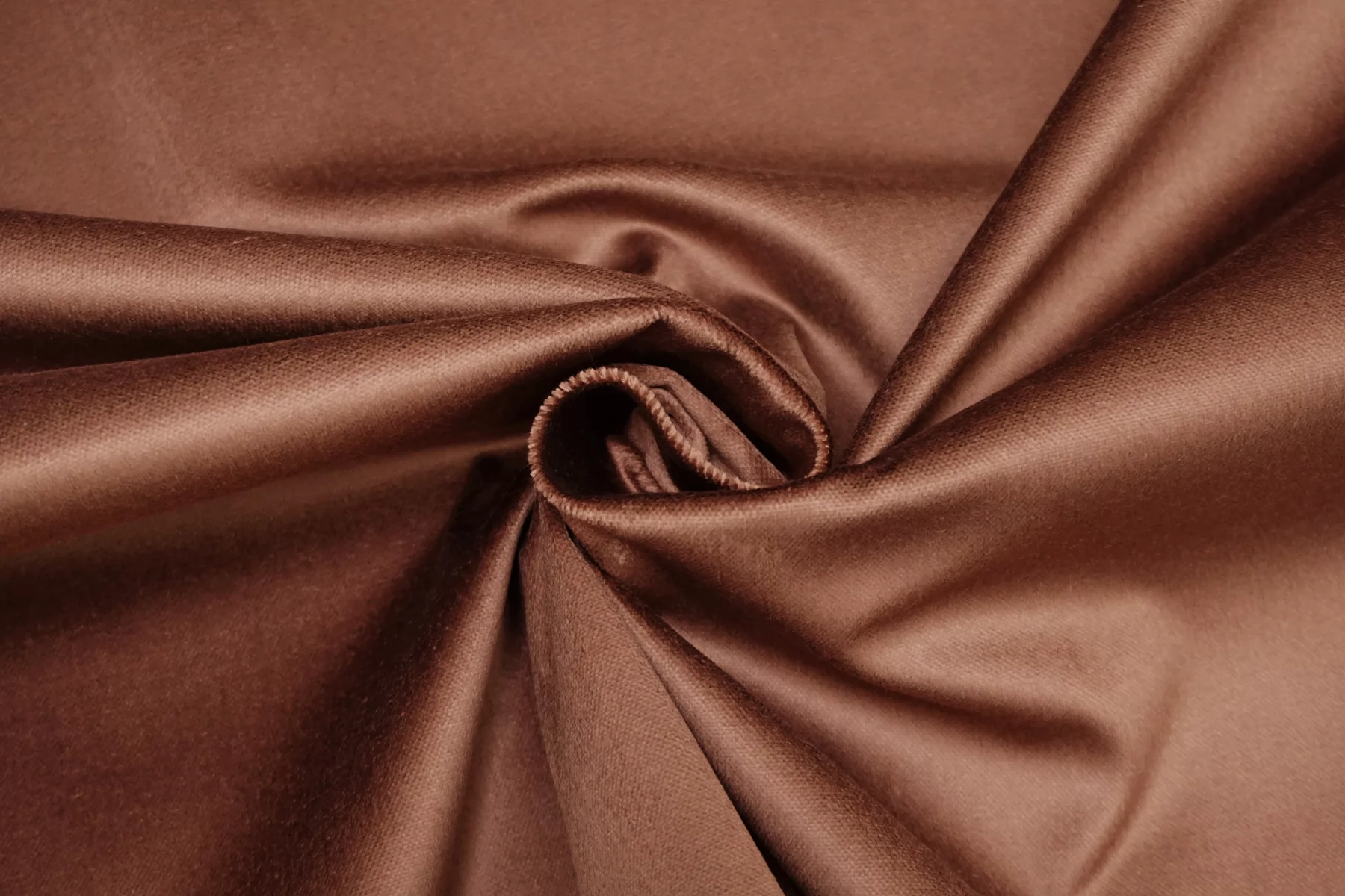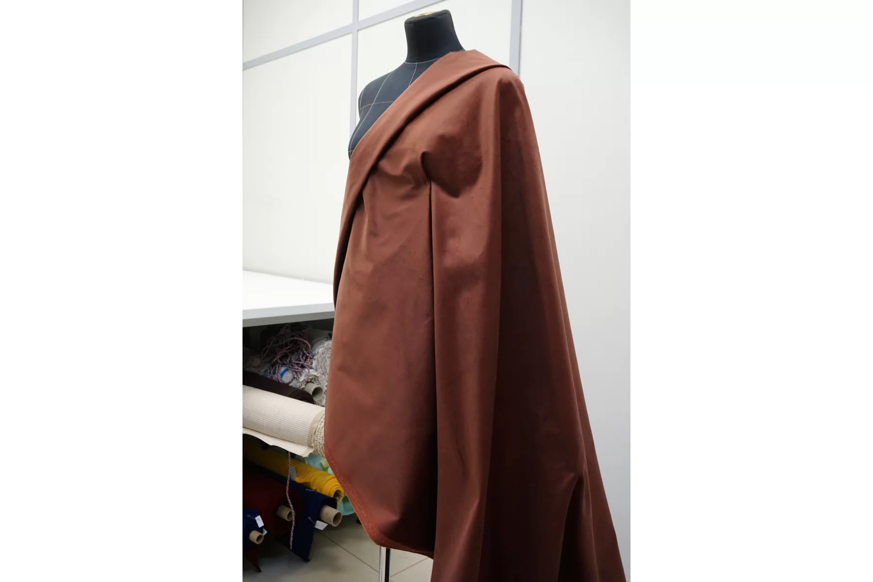 Шикарный бархат коричневого цвета, с глубоким, тёплым красновато-терракотовым подтоном. Приятный тактильно, пластичный. Ворс короткий, направленный. С красивым лоском. Не тянется. Отлично драпируется и неплохо держит форму. Слегка сминается. Не просвечивает. Шьем жакеты, костюмы, платья, юбки и не только. Уход деликатный.