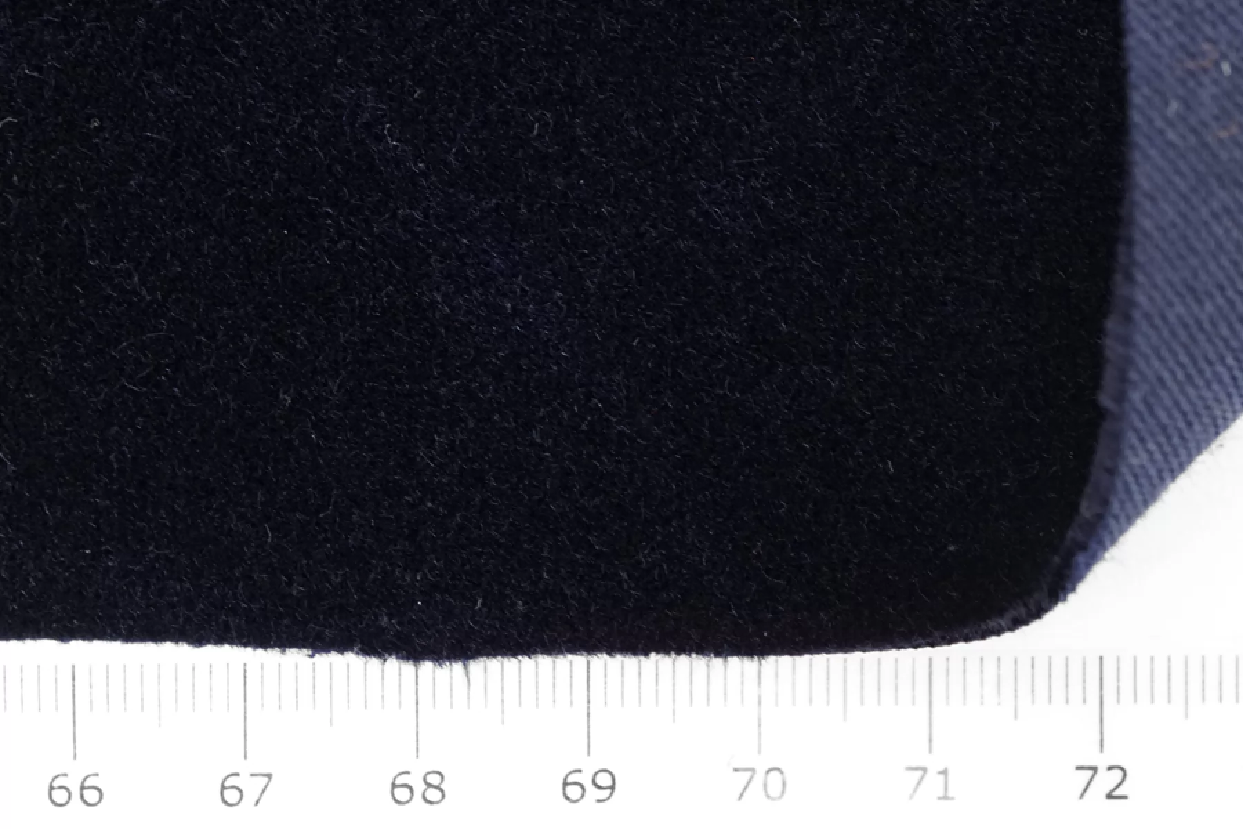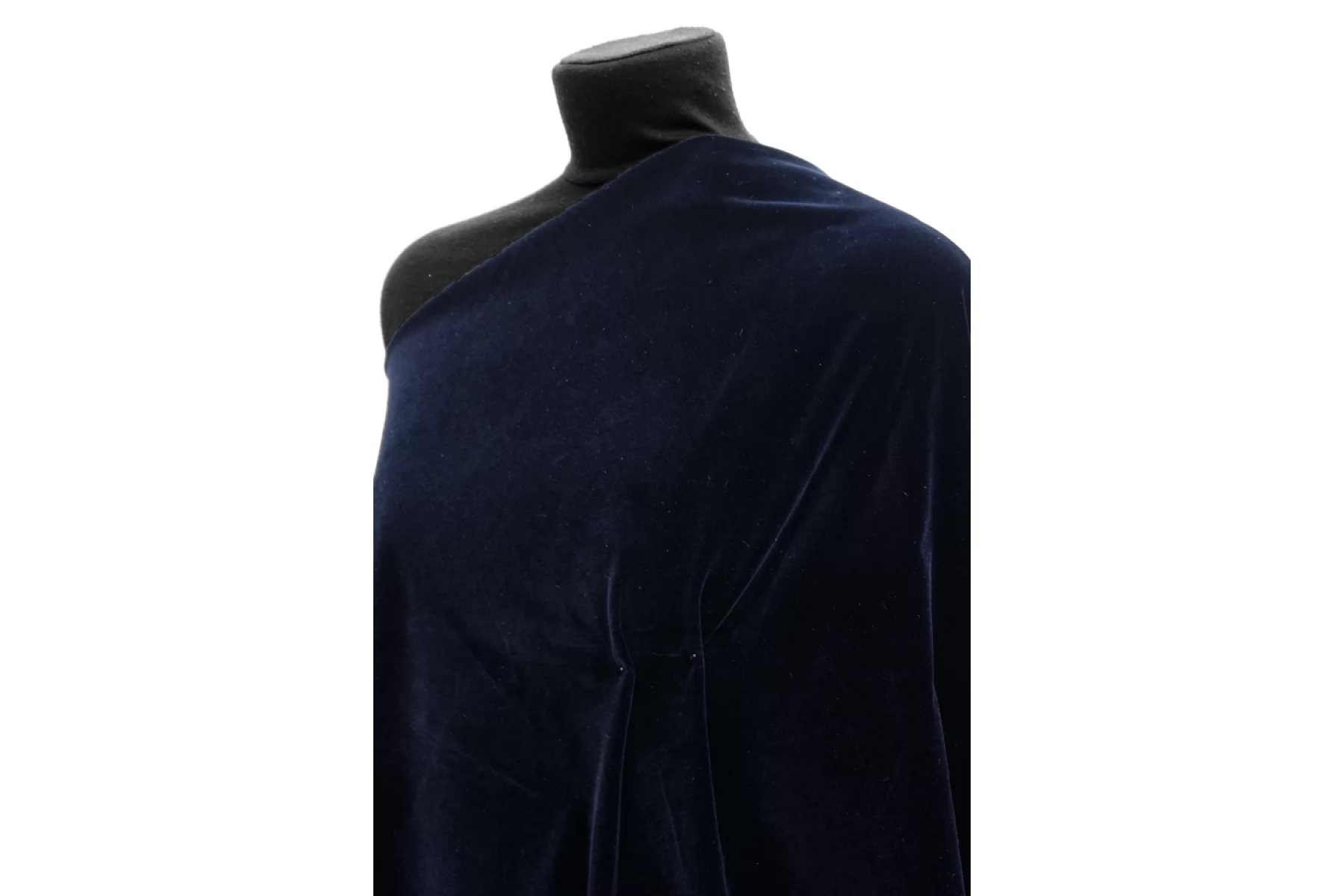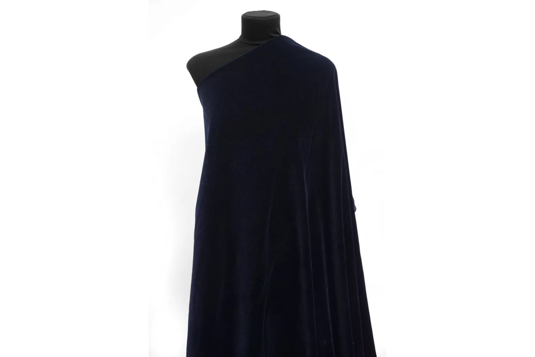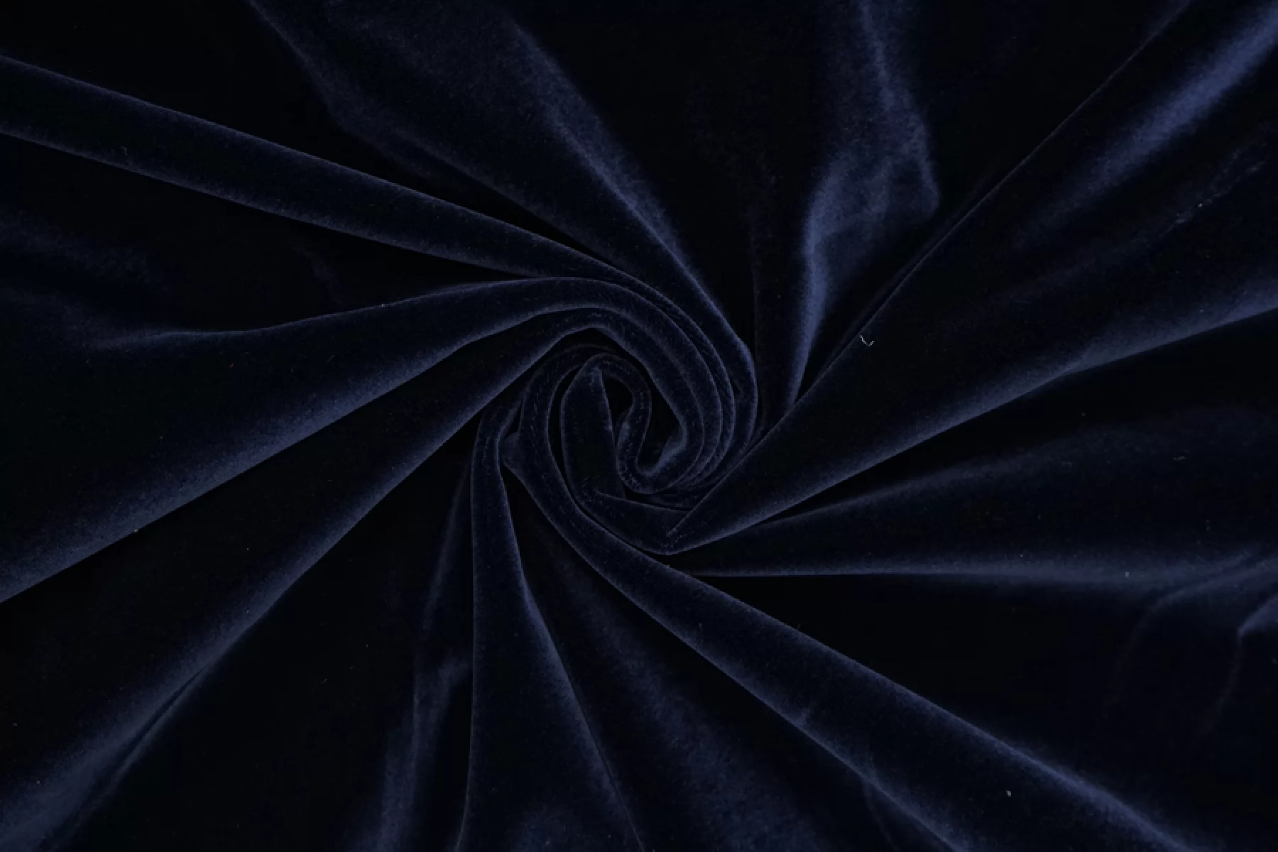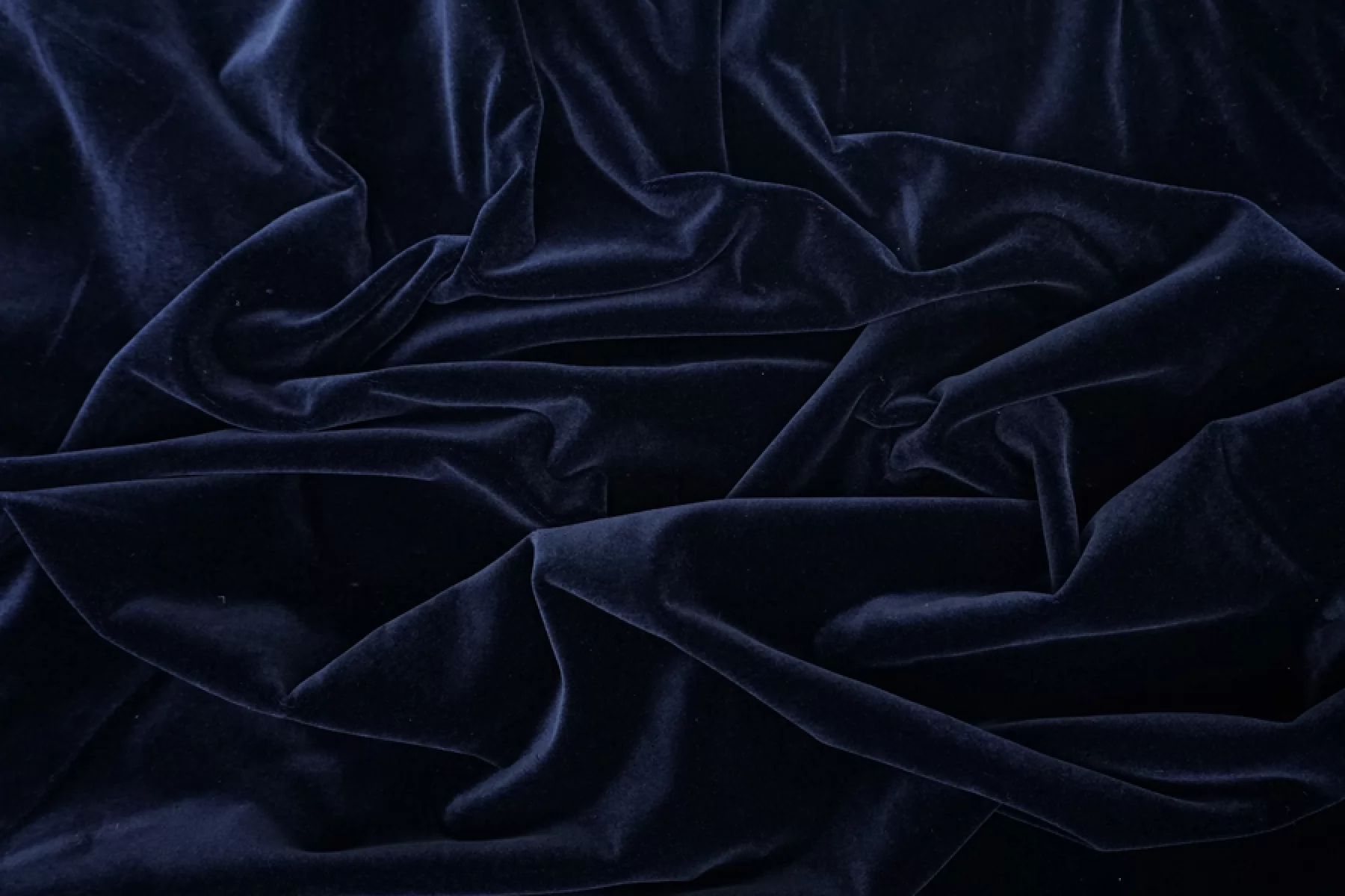 Прекрасный костюмный хлопковый бархат глубокого темно-синего оттенка. Обладает красивым лоском. Упруго, но несильно, тянется за счет содержания эластана. Приятный, мягкий, но с легкой жесткостью, что позволяет материалу держать форму. Изнаночная сторона слегка суховата. Плотненький, около 2 мм толщиной. Не просвечивает. Отлично драпируется. Сминается, но восстанавливается. Отлично подойдет на жакеты, костюмы, юбки, жилеты и не только.