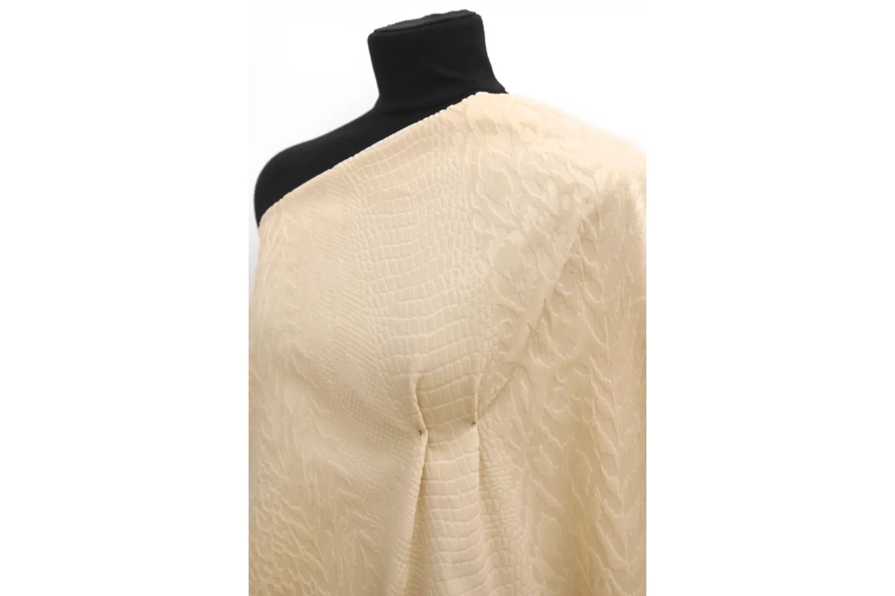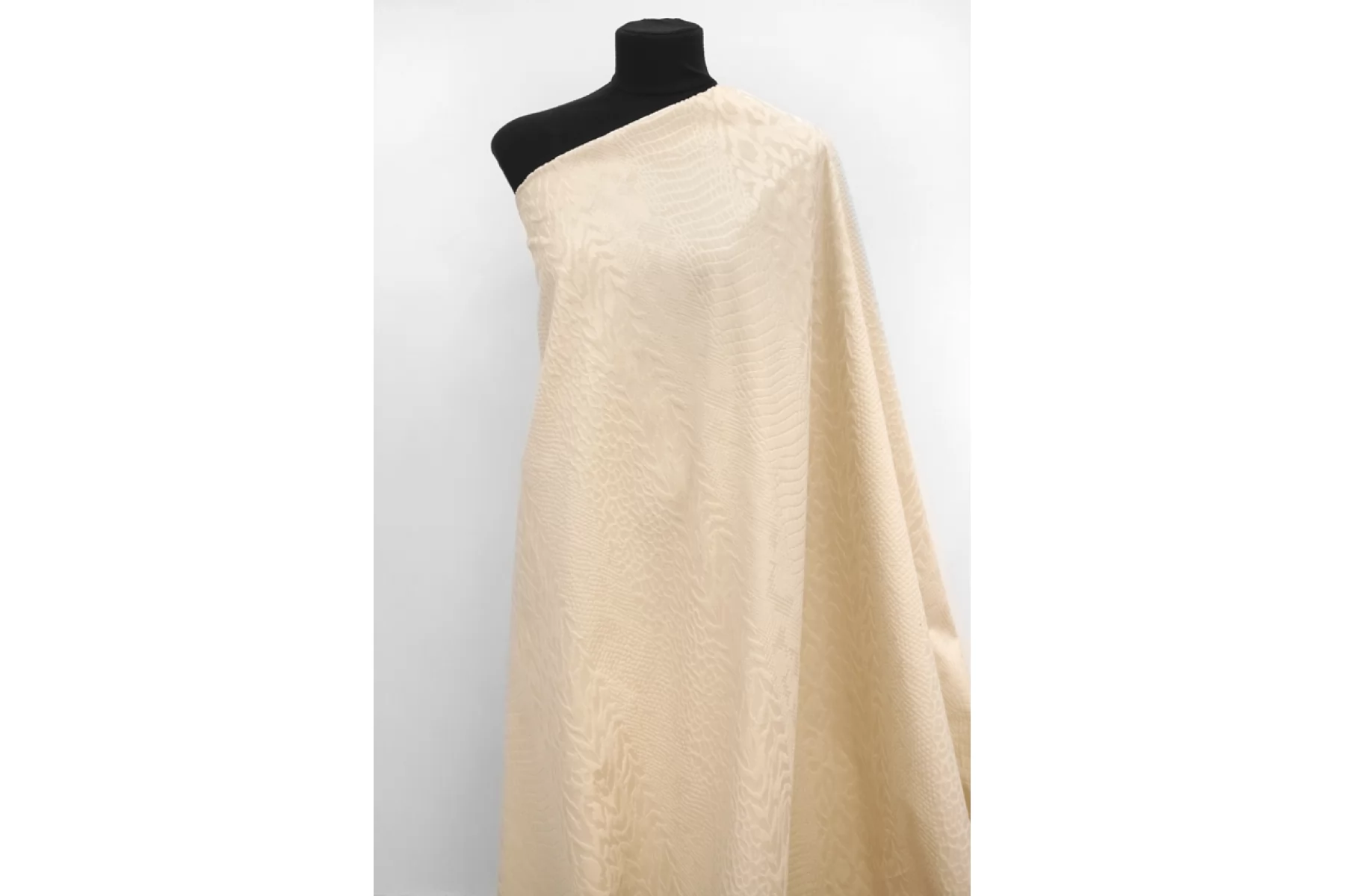 Интересная позиция - хлопковый бархат стриженный под змеиный узор - бежевого оттенка от бренда ROBERTO CAVALLI. Тактильно приятный, мягкий, формодержащий. Ворс направленный. Обладает приятным лоском. Не тянется, не просвечивает. Сминается. Шьем костюмы, жакеты, юбки и платья.