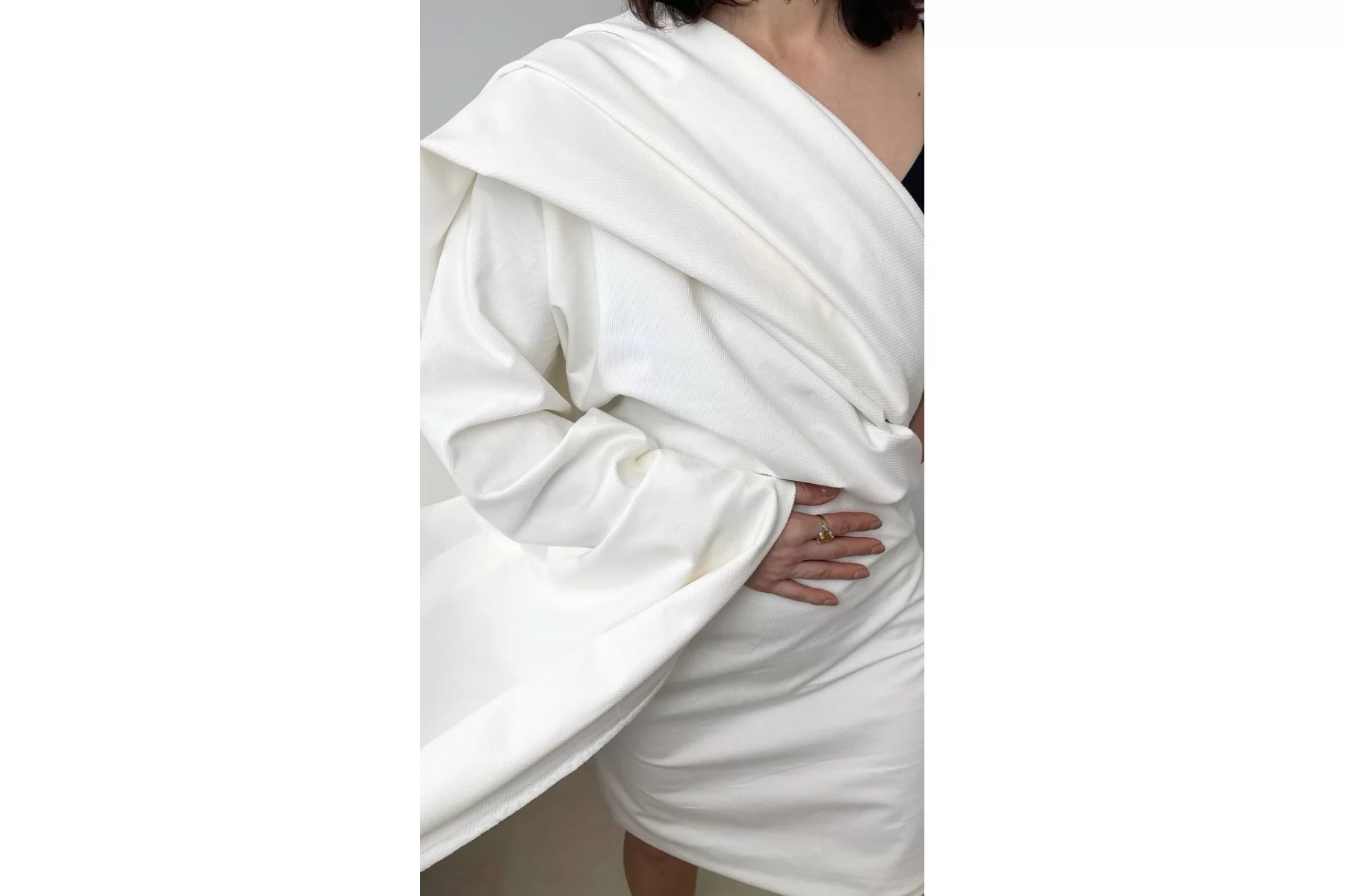 Интересная и необычная позиция - хлопковый стриженный бархат молочного оттенка от итальянского бренда Zegna. По фактуре слегка напоминает вельвет. Тактильно приятный, мягкий, формодержащий. Обладает приятным лоском. Не тянется, не просвечивает. Сминается. Слегка сыпется. Классный вариант на костюмы.